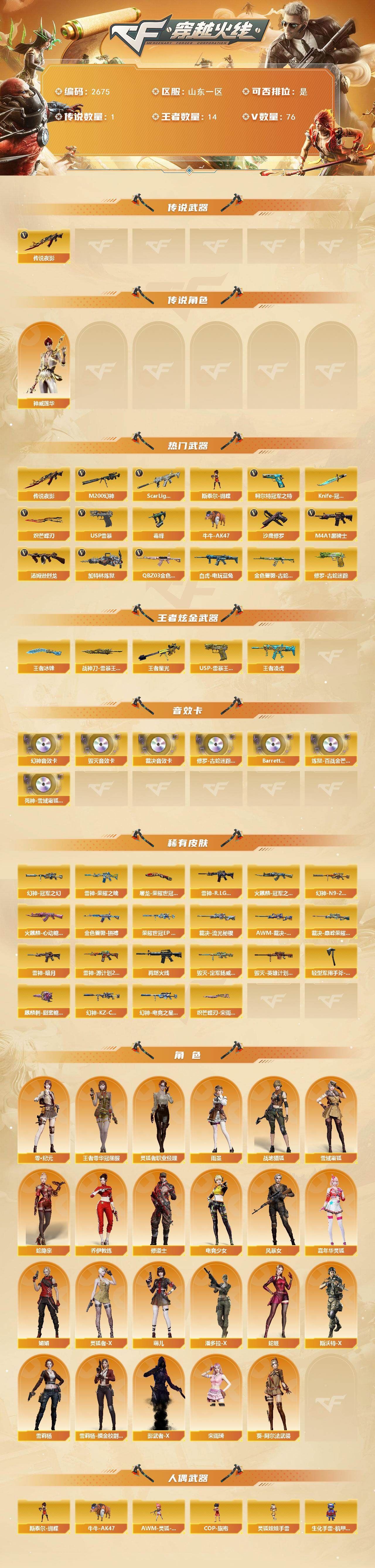 【游戏多多】【穿越火线】【编号:956785】【可二次实名】可二次可排位山东一区-76V-14王者武器数【传说武器】:传说夜影【传说角色】:神威莲华【热门武器】:传说夜影,QBZ03-金色蔷薇,Scar Light-白虎,M200-幻神,金色蔷薇-古蛇迷踪,修罗-古蛇迷踪,白虎-电玩蓝兔,柯尔特-冠军之特,毒蜂,牛牛-AK47,M4A1-黑骑士,汤姆逊-烈龙*5,加特林-炼狱*2,斯泰尔-蝴蝶,USP-雷暴,沙鹰-修罗,Knife-冠军之刃,炽芒蝶刃*2【王者炫金武器】:王者凌虎,王者星光,USP-雷暴王者*2,斩神刀-雷暴王者,王者冰锋【音效卡】:修罗-古蛇迷踪音效卡,M200-幻神音效卡,Barrett-毁灭音效卡,AWM-裁决音效卡,Barrett-碧霄极光音效卡,炼狱-百战金芒-庆典舞曲音效卡,死神-雪域霜狐-怀旧音效卡【皮肤】:幻神-冠军之幻,M200-幻神-N9-2022MVP,幻神-荣耀世冠EP 皮肤,幻神-KZ-CFPLS25冠军 皮肤,幻神-电竞之星 皮肤,QBZ03-金色蔷薇-拼搏,裁决-流光秘银,AWM-裁决-百城联赛天津皮肤,裁决-巅峰荣耀 皮肤,雷神-暗月,雷神-荣耀之魄,雷神-R.LGD-CFPLS18冠军,雷神-源计划2.0专属 皮肤,M4A1-再燃火线,火麒麟-冠军之心,火麒麟-心动糖果,毁灭-定军扬威 皮肤,毁灭-英雄计划 皮肤,屠龙-荣耀世冠AG,轻型军用手斧-再燃火线,麒麟刺-甜蜜糖果 皮肤,炽芒蝶刃-宋雨琦 皮肤【角色】:雨墨,零·纪元,战地猎狐,王者零-华冠丽服,雪域霜狐,蛇隐宗,乔伊教练,修道士,葵-阿尔法武装,宋雨琦,电竞少女,风暴女,嘉年华灵狐,娟娟,灵狐者-X,灵狐者-职业经理,萌儿,潘多拉-X,蛇姬,斯沃特-X,雪莉杨,雪莉杨-摸金校尉,影武者-X【人偶武器】:斯泰尔-蝴蝶,AWM-灵狐-15周年嘉年华,COP-旗袍,牛牛-AK47,生化手雷-机甲核心*3,灵狐娃娃手雷【暴走生化】:毒蜂,超级对讲机【挑战大师】:激光毁灭者III-白马银枪,神圣爆裂者-末日III【英雄级武器】:AK47-火麒麟,M4A1-黑龙,M4A1-雷神*2,M4A1-黑骑士,AK47-黑武士,Scar Light-白虎,QBZ03-天罚,无影-神兵利器,黑武士-锦绣游龙,金色蔷薇-古蛇迷踪,死神-雪域霜狐,QBZ03-金色蔷薇,白虎-电玩蓝兔,HK417-朱雀-电竞之星,机械迷城-穹宇,Barrett-毁灭*2,AWM-裁决,M200-幻神,加特林-炼狱*2,炼狱-百战金芒,汤姆逊-烈龙*5,烈龙-云海游龙,沙鹰-修罗,USP-雷暴,柯尔特-冠军之特,柯尔特-电竞之星,COP 357-云龙,USP-冥王*3,修罗-古蛇迷踪,屠龙,擎天*2,炽芒蝶刃*2,【道具】:BS战队炫彩背包,CFS限定背包,云山科技背包,亚洲杯纪念炫彩背包,古蛇迷踪炫彩背包,炫彩背包,百战金芒炫彩背包,雪域霜狐炫彩背包,女皇终结者-魔龙之吻,救世主-黑桃战神,黄金生化钩,绿色巨人,灵魂忍者*3,变异宝贝,迷雾幽灵*2,生化弹匣,夺命之镰,防化服*3,防弹头盔*5,防弹衣*5,C4工具钳*5,手雷包*5【特殊枪械】:蝴蝶斯泰尔+5烈龙,1白虎,1黑骑士,5烈龙,2炼狱,1蝴蝶斯泰尔,各种道具详情看截图、低价出售找回包 赔、截图展示段位不代 表实际段位,如赛季更新等不可抗拒因素发生变化、时限道具不保证所剩时间、标题未写送点劵默认不送【卖号买号首选亿梦】