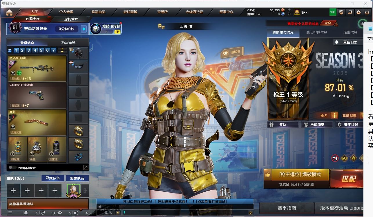 【游戏多多】 【可包人脸】hmc AK026971四川一区15v【传说灵眸】【m200幻神+冠军之幻】【qbz金色蔷薇】【武器:青龙 黑鲨 】【手枪:幻灵 】【雷套:幻灵雷*2】【小人枪:毁灭孙三炮】【四防角色:王者影豹 职业经理 】----更多炫彩背包/光效/名片/武器具体看图!截图展示段位不代实际段位,赛季更新等不可抗拒因素发生变化、时限道具不保证所剩时间、标题未写送点券默认不送】【主播担保+安全至上+性价比 买号卖号只选金牌商家一左友】