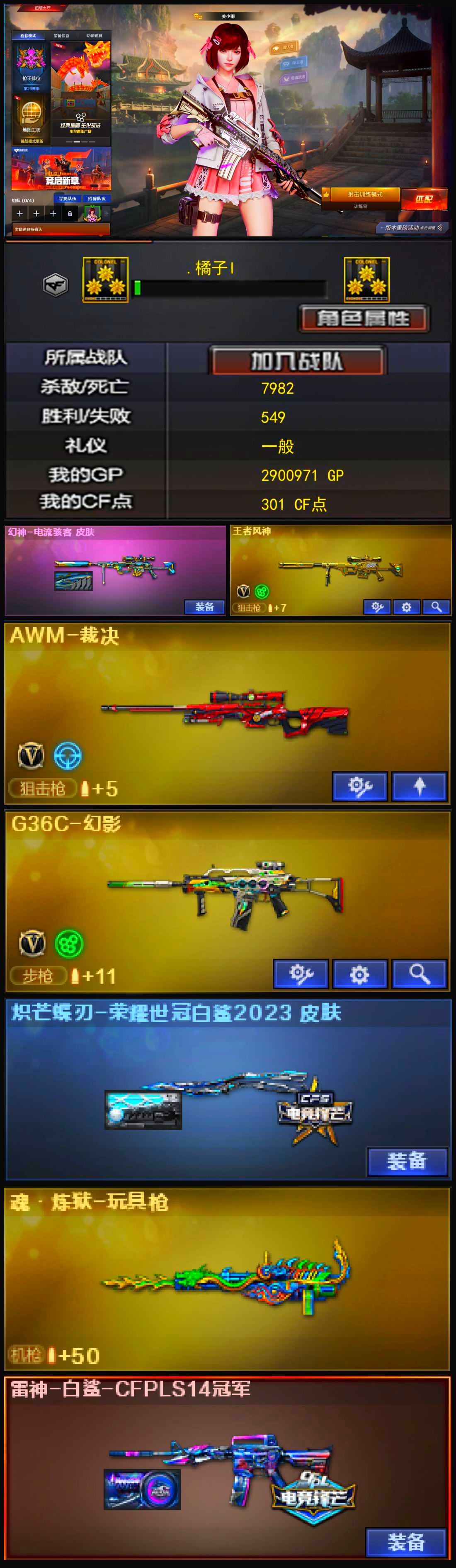 【游戏多多】 【可二次实名】王者风神+G36C幻影+裁决+屠龙+4防王者魅影+关小雨【4v】 【可否排位】可排位 【账号状态】无封号 【区服】广东一区 【VIP】 【游戏段位】宗师5 【游戏等级】Lv.69 上校2 【段位排名】453915 【CF点】301 【VVIP数量】4 【重要套装】 【重要角色】关小雨/王者-魅影/代号:翼 【传说武器】 【英雄武器】AWM-裁决/屠龙/G36C-幻影 【王者武器】王者风神 【小人枪】M4A1-雷神-精英刀锋/巴雷特-赏金猎人/COP-白鲨/COP-旗袍(2)/迷你牛牛 【其他重要武器】海浪AK47-QQ浏览器/AWM-A-彩虹/AWM-S/M82A1-夏日/M82A1-飞龙在天/M200-涂鸦/AWM-恶棍-枪王排位/AWM-Pink/末日裁决者/神圣爆裂者III-蛇姬/USP-黑大圣/COP-青帝/COP 357-青龙/虹光丛林匕首-枪王排位/生化手雷-小钢 【重要武器皮肤】幻神-电流骇客 皮肤/M4A1-雷神-白鲨皮肤/麒麟刺-荣耀世冠白鲨/黑鲨-电流骇客 皮肤/炽芒蝶刃-荣耀世冠白鲨2023 皮肤 【重要光效】M200-幻神蓝粉色光效 【重要音效卡】 【重要戒指】 【拥有重要玩偶】