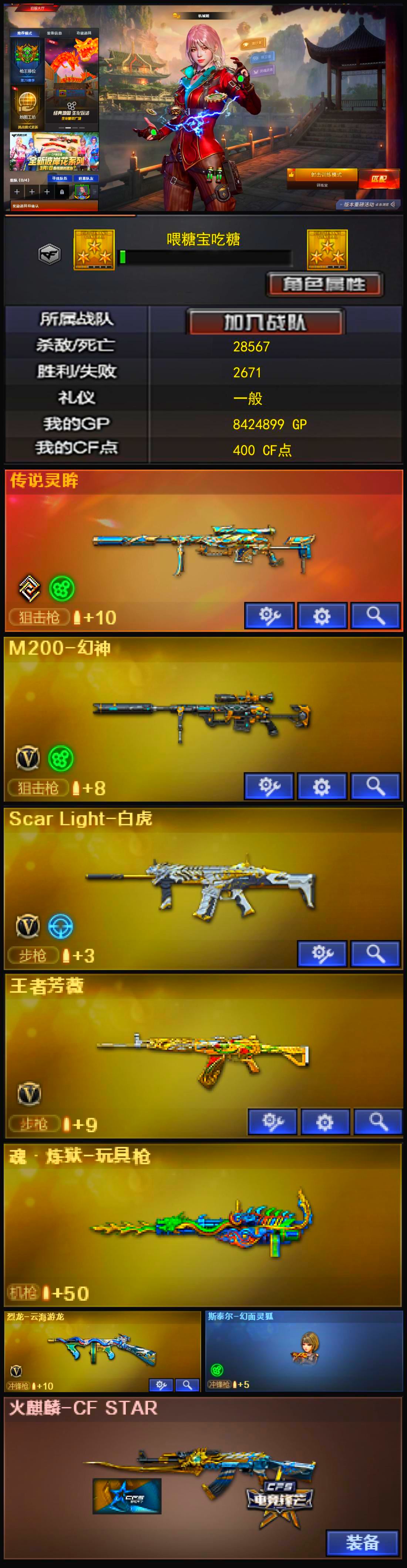 【游戏多多】 【可二次实名】传说灵眸+幻神+白虎+王者芳薇+独角之刃+1烈龙斯太尔幻面灵狐+4防王者影豹+云悠悠+机械姬【23v】 【可否排位】可排位 【账号状态】无封号 【区服】广东一区 【VIP】VIP5 【游戏段位】枪王3 【游戏等级】Lv.89 中将2 【段位排名】205202 【CF点】400 【VVIP数量】23 【重要套装】 【重要角色】电竞教官-云悠悠/机械姬/幻面灵狐/王者影豹/葵-阿尔法武装/代号:翼/铁扇公主/云海玲珑/兰-海滩派对 【传说武器】传说灵眸 【英雄武器】_M200-幻神/_Scar Light-白虎/沙鹰-修罗/幻灵之锋/高爆手雷-幻灵/烟雾弹-幻灵/闪光弹-幻灵/HK417-朱雀-电竞之星/M4A1-苍鸣雷神/QBZ03-独角-III/机械迷城-穹宇/黑武士-锦绣游龙/王者芳薇-觉醒版/烈龙-云海游龙/屠龙-电竞之星/麒麟刺-百战金芒/擎天-云海游龙/屠龙-云海游龙/手雷-云海游龙 【王者武器】独角之刃 【小人枪】火麒麟-零·纪元/M4A1-雷神-精英刀锋/牛牛-AK47/C.A.T/M82A1-水枪-不败狙神/巴雷特-赏金猎人/加特林-机械猎手/斯泰尔-幻面灵狐/猩红司令玩偶-M37/COP-旗袍/迷你钢铁终结者/迷你救赎猎手/迷你地狱终结者/迷你牛牛/魔能飞环-曼陀罗(2) 【其他重要武器】炫金毁灭/M4A1-再燃火线/M4A1-十二生肖·龙-雷神/激光毁灭者III-白马银枪/AK47-丹龙(3)/M14EBR-圣诞/QBZ03-锋芒破茧(4)/纯金AK-47(2)/AK47-轮回/海浪AK47-QQ浏览器/AK-47-二次元(3)/M14EBR-炎龙/AK-103-火线13周年/9A-91翡翠/XM8-炫彩/凤凰之魂/梦-雷神-手/M4A1-破空冰刃/M4A1-Guitar 炫彩/AK47-破空冰刃/M14EBR-情人节2020/金色小号/AK47-大帝林肯(3)/AK47-祥云苍龙(2)/M4A1-XS-耀龙/AK47-盛典-CFS 2022/AK47-苍龙(2)/AK47-SS-枪王排位/M4A1-S-能量核心/M4A1-SS-枪王排位/AN94-凤凰/AK47-SS/QBZ03-烛龙(2)/黄金AK-47/红龙AK47/9A-91-圣诞/AK-103-红色悦动/AK47-绚樱/AK103-神秘黑洞/AK47-朋克/AK47-雷蛇/AWM-A-彩虹/AWM-卡通/AWM-小故障(2)/M200-枪王排位/AWM-银月/破天狂龙(2)/Barrett-苍龙(2)/双面神/AWM-Red/M200-青花瓷(2)/98K-烛龙(2)/巴雷特-情人节2020/AWM-红色悦动/AWM-A-圣诞2021/M200-大黄蜂(2)/AWM-盛典-CFS 2022(2)/蓝色魅影/M200-萌杀(2)/AWM-恶棍-枪王排位/AWM-万圣节刀锋/M200-朋克/凤凰之力(6)/M200-涂鸦/M200-青帝/AWM-枪娘/凤凰之怒/AWM-摸金校尉/雷蛇加特林/阿梅利轻机枪-暗夜风暴(3)/KAC-小动物(3)/M240B-卡通/死亡之眼-庆典-CFS 2021(2)/EVOIII-机甲核心(2)/斯泰尔-巧克力(2)/MK5-枪王排位/EVOIII-萌杀(3)/EVOIII- 曹操(3)/EVO3A1-火线13周年/Spas-12-幻能朋克(2)/AA-12-圣龙/修罗-年鹏/沙漠之鹰-盛典-CFS 2022(2)/毛瑟-庆典-CFS 2021/Colt1911-彩蝶/真的是手枪/愤怒公牛左轮-枪王排位/Anaconda-雷电核心/MAC-10-幻能朋克(2)/沙鹰-枪王排位(2)/COP 357-平天大圣(2)/Cop357-萌杀/mac-10-蒸汽钟表/新USP-枪王排位奖励(3)/沙鹰-青龙/Cop357-赤龙/COP-金蝉子-枪王排位/USP-黑大圣/迷彩沙鹰-70KG/COP357-十二生肖·羊/沙鹰-万圣节2018/柯尔特-百城/COP357-朋克/轻型军用手斧-再燃火线/尼泊尔-庆典-CFS 2021/应援棒/斩神刀-青帝(2)/Laser Sword-夏日/招财猫-枪王排位/虹光丛林匕首-枪王排位(2)/雷神之怒-机甲核心/虹光鹰爪-枪王排位/鹰爪-枪王排位/虹光女皇利刃-枪王排位/啸天/丛林匕首-枪王排位/生化手雷-机甲核心(2)/生化手雷-小钢/迷你生化手雷(3)/胜利奖杯闪光弹-枪王排位(3)/胜利奖杯烟雾弹-枪王排位(2)/胜利奖杯手雷-枪王排位(3)/闪光弹-枪王排位(3)/烟雾弹-机甲核心/幽灵宝宝手雷 【重要武器皮肤】天龙-CFSTAR/火麒麟-CFSTAR/修罗-CFSTAR 【重要光效】M200-幻神紫橙光效/Scar Light-白虎紫色光效 【重要音效卡】 【重要戒指】8周年戒1/