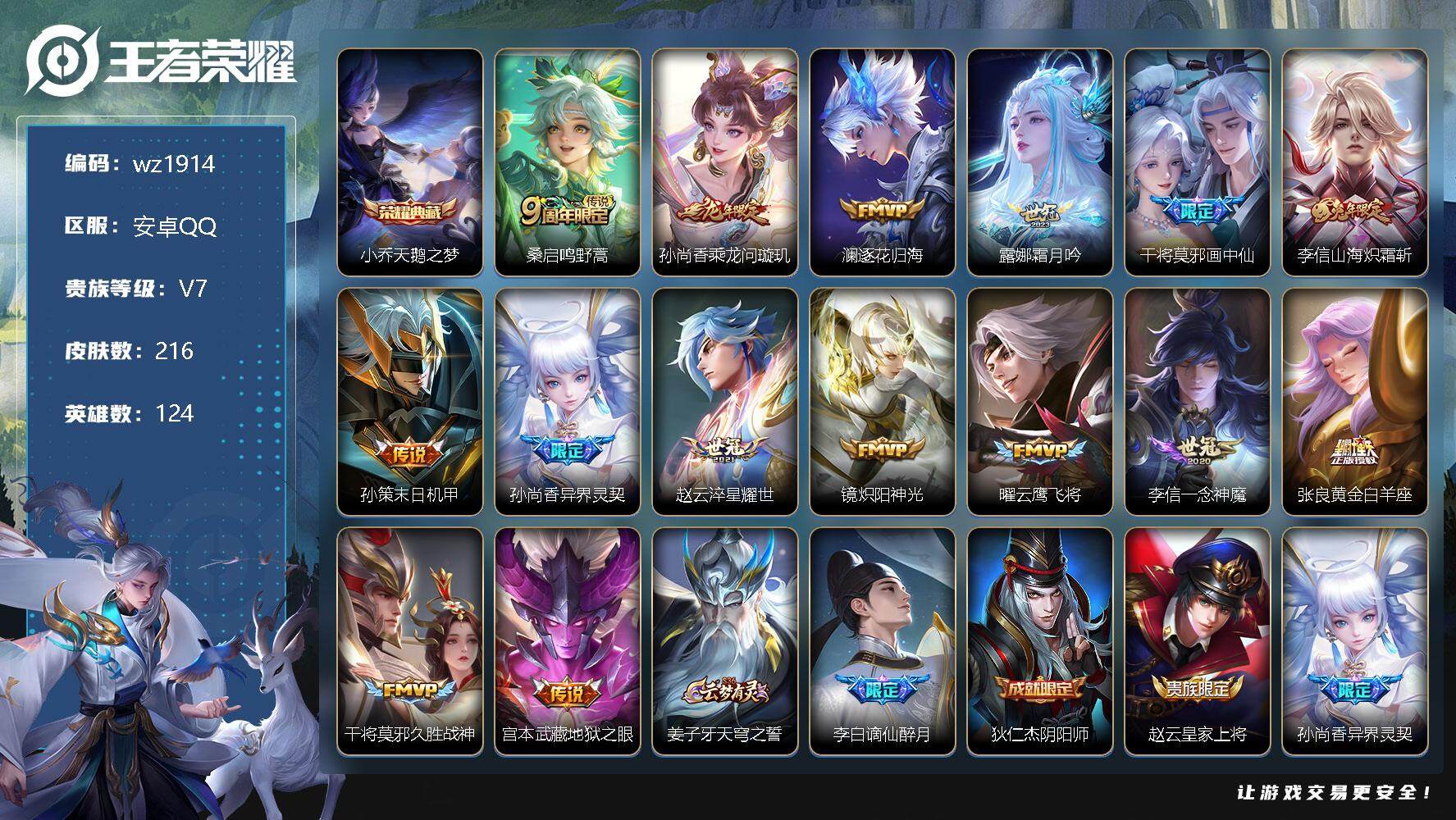 【游戏多多】 【可二次实名】【wz1914】安卓Q-V7-最强王者段位-124英雄-216皮肤-1典藏-0珍品无双-0无双-0珍品传说-15传说-60史诗 【英雄全皮】:李信全皮 【荣耀典藏】:小乔天鹅之梦 【传说皮肤】:桑启鸣野蒿,孙尚香乘龙问璇玑,澜逐花归海,露娜霜月吟,干将莫邪画中仙,李信山海炽霜斩,孙策末日机甲,孙尚香异界灵契,赵云淬星耀世,镜炽阳神光,曜云鹰飞将,李信一念神魔,张良黄金白羊座,干将莫邪久胜战神,宫本武藏地狱之眼 【限定皮肤】:姜子牙天穹之誓,李白谪仙醉月,狄仁杰阴阳师,赵云皇家上将,孙尚香异界灵契,庄周高山流水,高渐离玩趣恶龙,白起夜都怪侠,芈月幻夜卜梦,元歌云间偶戏,元歌无心,马可波罗山海玄木吟,狄仁杰魔术师,达摩沙漠行僧,项羽海滩派对,老夫子航海奇遇记,韩信傲雪梅枪,王昭君午后时光,兰陵王金庭之子,后羿如梦令,李元芳云中旅人,钟馗驱傩正仪,杨玉环遇见飞天,干将莫邪画中仙,鬼谷子五谷丰年,黄忠火炮绅士,苏烈千军破阵,百里玄策原初追逐者,梦奇顽趣,沈梦溪大漠名商,明世隐吟游魔法,裴擒虎擒涛扼浪,狂铁电玩高手,云中君纤云弄巧,云中君时之祈愿,李信山海炽霜斩,嫦娥拒霜思,嫦娥暖冬兔眠,鲁班大师探海日志,桑启海盐诗旅,暃星界游侠,阿古朵江河有灵,张良古海寻踪,鬼谷子天穹祈灯,伽罗琥珀纪元,姬小满妄想食味,孙尚香乘龙问璇玑,沈梦溪龙舞盛年,刘邦剑破天穹,刘备异域游侠 【年限皮肤】:马可波罗山海玄木吟,李信山海炽霜斩,孙尚香乘龙问璇玑 【赛季限定】:达摩沙漠行僧,兰陵王金庭之子,张良古海寻踪,李元芳云中旅人,钟馗驱傩正仪,苏烈千军破阵,百里玄策原初追逐者,梦奇顽趣,沈梦溪大漠名商,裴擒虎擒涛扼浪,鲁班大师探海日志,桑启海盐诗旅,鬼谷子天穹祈灯,刘邦剑破天穹,姜子牙天穹之誓 【战令限定】:白起夜都怪侠,芈月幻夜卜梦,元歌云间偶戏,老夫子航海奇遇记,王昭君午后时光,黄忠火炮绅士,明世隐吟游魔法,狂铁电玩高手,嫦娥暖冬兔眠,暃星界游侠 【史诗皮肤】:赵云皇家上将,赵云未来纪元,貂蝉圣诞恋歌,甄姬冰雪圆舞曲,狄仁杰魔术师,宫本武藏鬼剑武藏,孙尚香水果甜心,嬴政摇滚巨星,妲己魅力维加斯,墨子龙骑士,墨子金属风暴,曹操幽灵船长,李白千年之狐,吕布末日机甲,张飞乱世虎臣,花木兰水晶猎龙者,夏侯惇乘风破浪,兰陵王暗隐猎兽者,亚瑟心灵战警,安琪拉心灵骇客,百里守约特工魅影,铠曙光守护者,李元芳逐浪之夏,程咬金功夫厨神,杨玉环遇见飞天,狄仁杰鹰眼统帅,后羿如梦令,橘右京修罗,百里玄策原初追逐者,云中君纤云弄巧,元歌云间偶戏,老夫子航海奇遇记,杨戬天秀启明,庄周高山流水,司马懿暗渊魔法,嫦娥拒霜思,黄忠火炮绅士,韩信傲雪梅枪,哪吒雪上飞焰,云中君时之祈愿,夏洛特永昼,澜赏金猎手,明世隐吟游魔法,狂铁电玩高手,鬼谷子五谷丰年,元歌无心,梦奇顽趣,暃星界游侠,马可波罗山海玄木吟,阿古朵江河有灵,伽罗琥珀纪元,姬小满妄想食味,亚连破空之剑,李白谪仙醉月,百里守约百相守梦,狂铁龙之律动,周瑜百相守梦,黄忠百相守梦,西施织梦人,公孙离涂山容容 【其他皮肤】:项羽海滩派对,韩信教廷特使,韩信街头霸王,露娜哥特玫瑰,达摩大发明家,赵云忍炎影,白起白色死神,牛魔西部大镖客,扁鹊化身博士,宫本武藏未来纪元,安琪拉玩偶对对碰,孙膑天使之翼,妲己少女阿狸,典韦黄金武士,亚瑟死亡骑士,达摩拳王,花木兰兔女郎,甄姬花好人间,刘备万事如意,狄仁杰阴阳师,关羽龙腾万里,钟无艳海滩丽影,狂铁命运角斗场,老夫子功夫老勺,牛魔制霸全明星,孙尚香沉稳之力,诸葛亮掌控之力,鬼谷子幻乐之宴,苏烈坚韧之力,大乔守护之力,明世隐虹云星官,高渐离玩趣恶龙,沈梦溪鲨炮海盗猫,姜子牙炽热元素使,哪吒次元突破,鲁班七号黑桃队长,盾山圆桌骑士,狂铁特工战影,刘禅秘密基地,张良缤纷绘卷,钟馗驱傩正仪,鲁班大师乓乓大师,苏烈千军破阵,典韦铁甲之心,妲己紫罗兰之誓,马可波罗潮玩牛仔,达摩沙漠行僧,芈月幻夜卜梦,程咬金无双福将,刘邦虎啸剑宗,白起夜都怪侠,兰陵王金庭之子,刘禅唤灵魔甲,米莱狄契约魔法,王昭君午后时光,沈梦溪大漠名商,蒙犽胡桃狂想曲,蒙恬蔚蓝守将,李元芳云中旅人,戈娅危途狂花,桑启海盐诗旅,嫦娥暖冬兔眠,海月幻泉雾影,猪八戒潮玩探月行,牛魔牛运亨通,赵怀真太极少年,裴擒虎擒涛扼浪,太乙真人劲辣红锅,鲁班大师探海日志,李元芳妄想特派,张良古海寻踪,鬼谷子天穹祈灯,廉颇功夫炙烤,沈梦溪龙舞盛年,刘邦剑破天穹,盘古经纬探寻者,刘备异域游侠,姜子牙天穹之誓,孙悟空神迹守卫,盘古敬我三分,东皇太一噬灭天穹,亚瑟动物派对,老夫子百相守梦,干将莫邪雾都夜雨,吕布逐霄战戟,苍苍林狼骑,太乙真人谧流熔炉,典韦铁骨偃魂,姜子牙星梦巡礼,少司缘灵卦秘语,明世隐景韶洛都,戈娅玫蓝誓约,钟馗虚灵犬护,苏烈春野闲踪,小乔秘证寻踪,张