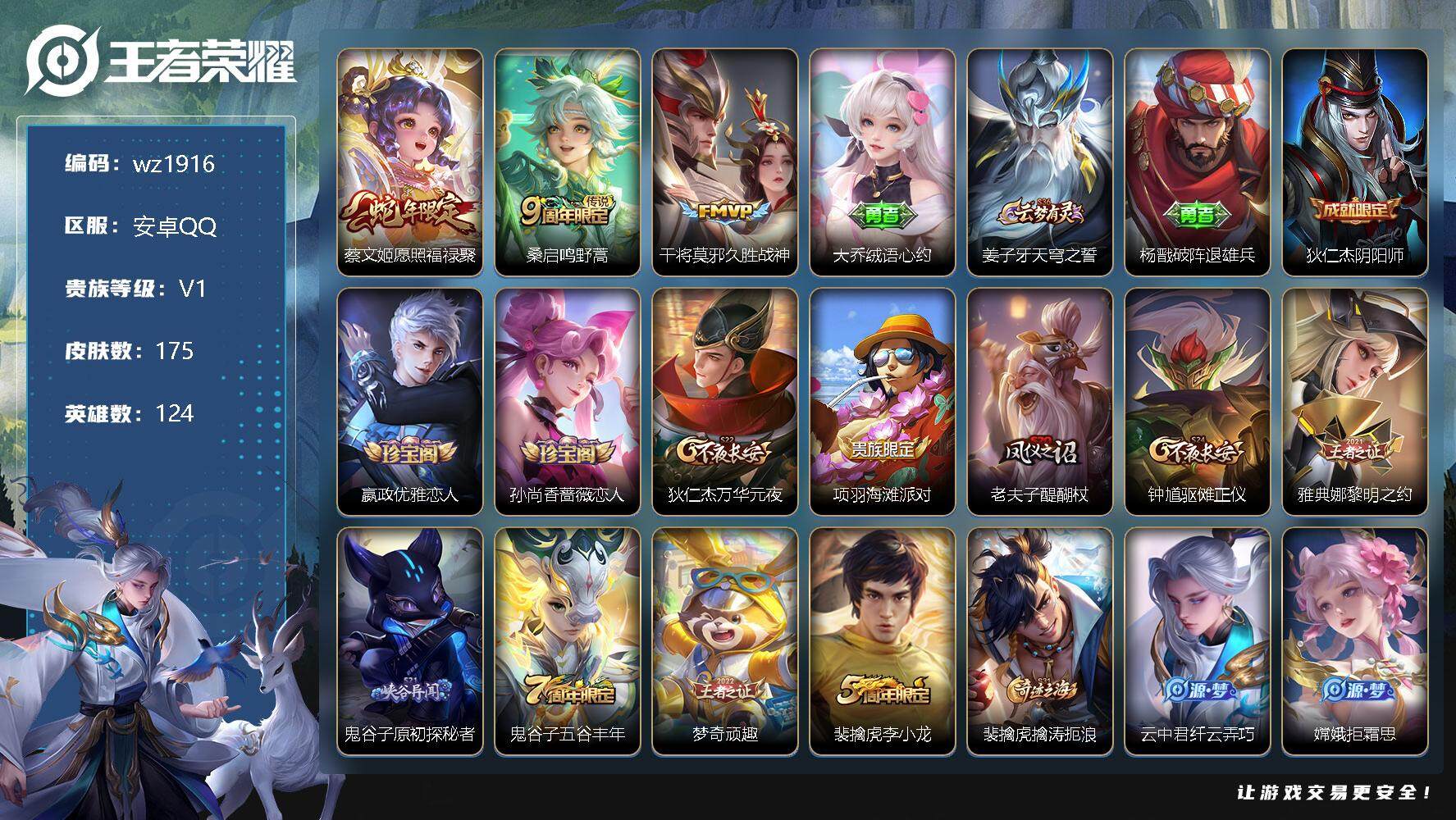 【游戏多多】 【可二次实名】【wz1916】安卓Q-V1-最强王者段位-124英雄-175皮肤-0典藏-0珍品无双-0无双-0珍品传说-3传说-39史诗 【英雄全皮】:鬼谷子全皮,影全皮 【传说皮肤】:蔡文姬愿照福禄聚,桑启鸣野蒿,干将莫邪久胜战神 【限定皮肤】:大乔绒语心约,姜子牙天穹之誓,杨戬破阵退雄兵,狄仁杰阴阳师,嬴政优雅恋人,孙尚香蔷薇恋人,狄仁杰万华元夜,项羽海滩派对,老夫子醍醐杖,钟馗驱傩正仪,雅典娜黎明之约,鬼谷子原初探秘者,鬼谷子五谷丰年,梦奇顽趣,裴擒虎李小龙,裴擒虎擒涛扼浪,云中君纤云弄巧,嫦娥拒霜思,鲁班大师探海日志,桑启海盐诗旅,阿古朵江河有灵,张良古海寻踪,蒙恬荣光圣徽,鬼谷子天穹祈灯,沈梦溪龙舞盛年,刘邦剑破天穹,程咬金群星魔术团,周瑜熔金海岸 【赛季限定】:狄仁杰万华元夜,老夫子醍醐杖,张良古海寻踪,钟馗驱傩正仪,雅典娜黎明之约,鬼谷子原初探秘者,梦奇顽趣,裴擒虎擒涛扼浪,鲁班大师探海日志,桑启海盐诗旅,鬼谷子天穹祈灯,蒙恬荣光圣徽,刘邦剑破天穹,姜子牙天穹之誓 【史诗皮肤】:赵云未来纪元,甄姬冰雪圆舞曲,王昭君偶像歌手,廉颇地狱岩魂,宫本武藏鬼剑武藏,孙尚香蔷薇恋人,孙尚香水果甜心,嬴政优雅恋人,妲己女仆咖啡,墨子金属风暴,吕布圣诞狂欢,刘禅绅士熊喵,吕布末日机甲,花木兰水晶猎龙者,夏侯惇乘风破浪,小乔缤纷独角兽,兰陵王暗隐猎兽者,安琪拉心灵骇客,蔡文姬舞动绿茵,李元芳逐浪之夏,阿轲节奏热浪,孙策猫狗日记,大乔猫狗日记,狄仁杰鹰眼统帅,瑶遇见神鹿,裴擒虎李小龙,云中君纤云弄巧,嫦娥拒霜思,雅典娜黎明之约,鬼谷子五谷丰年,梦奇顽趣,刘禅电玩爆裂旋风,阿古朵江河有灵,蒙恬荣光圣徽,牛魔星界战将,赵怀真器灵浮梦炉,阿轲化蝶舞,狂铁龙之律动,黄忠百相守梦 【其他皮肤】:项羽海滩派对,韩信教廷特使,韩信街头霸王,赵云白执事,赵云忍炎影,芈月红桃皇后,白起白色死神,牛魔西部大镖客,扁鹊化身博士,扁鹊救世之瞳,宫本武藏未来纪元,安琪拉玩偶对对碰,孙膑天使之翼,姜子牙时尚教父,妲己少女阿狸,典韦黄金武士,达摩拳王,花木兰兔女郎,张飞五福同心,甄姬花好人间,刘备万事如意,狄仁杰阴阳师,刘备汉昭烈帝,关羽龙腾万里,钟无艳海滩丽影,狂铁命运角斗场,老夫子功夫老勺,鬼谷子幻乐之宴,苏烈坚韧之力,大乔守护之力,明世隐虹云星官,小乔丁香结,孙膑归虚梦演,沈梦溪鲨炮海盗猫,哪吒次元突破,盾山圆桌骑士,老夫子醍醐杖,狂铁特工战影,鬼谷子原初探秘者,狄仁杰万华元夜,刘禅秘密基地,杨戬次元傲视,钟馗驱傩正仪,鲁班大师乓乓大师,程咬金无双福将,刘禅唤灵魔甲,蒙恬蔚蓝守将,桑启海盐诗旅,猪八戒潮玩探月行,裴擒虎擒涛扼浪,太乙真人劲辣红锅,莱西奥西部游侠,鲁班大师探海日志,李元芳妄想特派,张良古海寻踪,后羿完美运算,鬼谷子天穹祈灯,嫦娥漠中幻影,朵莉亚金色潮汐,廉颇功夫炙烤,沈梦溪龙舞盛年,钟无艳春野之旅,刘邦剑破天穹,程咬金群星魔术团,大司命暗都幽影,杨戬破阵退雄兵,姜子牙天穹之誓,周瑜熔金海岸,大乔绒语心约,盘古敬我三分,东皇太一噬灭天穹,亚瑟动物派对,干将莫邪雾都夜雨,吕布逐霄战戟,苍苍林狼骑,太乙真人谧流熔炉,典韦铁骨偃魂,影魅影绮裳,西施雪境奇遇,姜子牙星梦巡礼,东皇太一金福满堂,达摩爆裂喵拳,少司缘灵卦秘语,明世隐景韶洛都,戈娅玫蓝誓约,刘备浪漫序章,钟馗虚灵犬护,苏烈春野闲踪,张良灵野札记,阿古朵布丁狗之约,露娜命运加冕,姬小满小满鸭,白起死霸装,甄姬逆浪荇歌,庄周锦麟游梦,莱西奥踏浪烽翎,鬼谷子克喵,鲁班七号福禄兄弟,鲁班七号木偶奇遇记,高渐离金属狂潮,貂蝉异域舞娘,王昭君精灵公主,狄仁杰锦衣卫,小乔万圣前夜,孙膑未来旅行,后羿精灵王,刘禅英喵野望,钟馗地府判官,刘邦圣殿之光,虞姬加勒比小姐,关羽天启骑士,蔡文姬蔷薇王座,马可波罗激情绿茵,苍维京掠夺者,杨戬埃及法老,诸葛亮星航指挥官,大乔伊势巫女,东皇太一东海龙王,鬼谷子阿摩司公爵,铠龙域领主,苏烈爱与和平,女娲尼罗河女神,明世隐占星师,弈星踏雪寻梅,盾山极冰防御线,李信灼热之刃,盘古创世神祝,瑶森,阿古朵熊喵少女,澜孤猎,云缨赤焰之缨,金蝉前尘,桑启画中游 【内测皮肤】:孙尚香蔷薇恋人,嬴政优雅恋人,狂铁特工战影 【营地ID】:1882535189