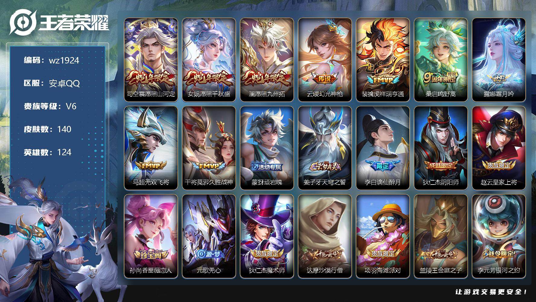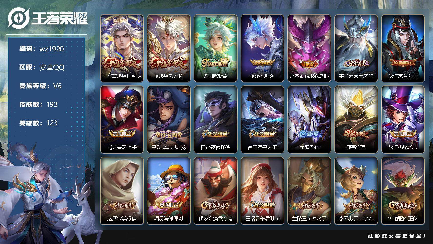 【游戏多多】 【可二次实名】【wz1920】安卓Q-V6-至尊星耀V段位-123英雄-193皮肤-0典藏-0珍品无双-0无双-0珍品传说-5传说-45史诗 【英雄全皮】:蒙恬全皮,司空震全皮,空空儿全皮 【传说皮肤】:司空震愿照山河定,澜愿照九州拓,桑启鸣野蒿,澜逐花归海,宫本武藏地狱之眼 【限定皮肤】:姜子牙天穹之誓,狄仁杰阴阳师,赵云皇家上将,高渐离玩趣恶龙,白起夜都怪侠,吕布猎兽之王,元歌无心,典韦岱宗,狄仁杰魔术师,达摩沙漠行僧,项羽海滩派对,程咬金演武夺筹,王昭君午后时光,兰陵王金庭之子,李元芳云中旅人,钟馗驱傩正仪,鬼谷子五谷丰年,苏烈千军破阵,百里玄策原初追逐者,沈梦溪大漠名商,裴擒虎李小龙,裴擒虎擒涛扼浪,狂铁电玩高手,上官婉儿梁祝,嫦娥拒霜思,鲁班大师探海日志,桑启海盐诗旅,艾琳流音漫舞,司空震地狱燃心,阿古朵江河有灵,张良古海寻踪,蒙犽百解令,蒙恬荣光圣徽,高渐离燃音魔法,妲己灵卜魔法,鬼谷子天穹祈灯,姬小满妄想食味,沈梦溪龙舞盛年,刘邦剑破天穹,芈月浮光幕影,周瑜熔金海岸 【年限皮肤】:典韦岱宗 【赛季限定】:达摩沙漠行僧,程咬金演武夺筹,兰陵王金庭之子,张良古海寻踪,李元芳云中旅人,钟馗驱傩正仪,苏烈千军破阵,百里玄策原初追逐者,沈梦溪大漠名商,裴擒虎擒涛扼浪,鲁班大师探海日志,桑启海盐诗旅,鬼谷子天穹祈灯,蒙恬荣光圣徽,刘邦剑破天穹,姜子牙天穹之誓 【战令限定】:白起夜都怪侠,吕布猎兽之王,王昭君午后时光,艾琳流音漫舞,狂铁电玩高手,司空震地狱燃心,高渐离燃音魔法,妲己灵卜魔法 【史诗皮肤】:露娜紫霞仙子,赵云皇家上将,貂蝉圣诞恋歌,甄姬冰雪圆舞曲,王昭君偶像歌手,狄仁杰魔术师,宫本武藏鬼剑武藏,孙尚香水果甜心,妲己魅力维加斯,墨子金属风暴,曹操幽灵船长,张飞乱世虎臣,花木兰水晶猎龙者,刘邦德古拉伯爵,兰陵王暗隐猎兽者,诸葛亮黄金分割率,百里守约特工魅影,铠曙光守护者,刘禅天才门将,李元芳逐浪之夏,白起星夜王子,阿轲节奏热浪,狄仁杰鹰眼统帅,上官婉儿梁祝,典韦岱宗,百里玄策原初追逐者,裴擒虎李小龙,嫦娥拒霜思,澜赏金猎手,狂铁电玩高手,鬼谷子五谷丰年,元歌无心,刘禅电玩爆裂旋风,司空震地狱燃心,阿古朵江河有灵,蒙犽百解令,周瑜雪夜绮愿,妲己灵卜魔法,高渐离燃音魔法,蒙恬荣光圣徽,姬小满妄想食味,芈月浮光幕影,孙膑茶境仙,赵怀真器灵浮梦炉,阿轲化蝶舞,黄忠百相守梦 【其他皮肤】:项羽海滩派对,韩信教廷特使,韩信街头霸王,露娜哥特玫瑰,达摩大发明家,赵云忍炎影,芈月红桃皇后,白起白色死神,牛魔西部大镖客,扁鹊化身博士,宫本武藏未来纪元,安琪拉玩偶对对碰,孙膑天使之翼,姜子牙时尚教父,妲己少女阿狸,典韦黄金武士,亚瑟死亡骑士,达摩拳王,花木兰兔女郎,甄姬花好人间,刘备万事如意,宫本武藏万象初新,狄仁杰阴阳师,刘备纽约教父,刘备汉昭烈帝,关羽龙腾万里,墨子进击墨子号,钟无艳海滩丽影,宫本武藏霸王丸,王昭君幻想奇妙夜,老夫子功夫老勺,孙尚香沉稳之力,诸葛亮掌控之力,鬼谷子幻乐之宴,苏烈坚韧之力,大乔守护之力,吕布猎兽之王,明世隐虹云星官,吕布野性能量,孙膑归虚梦演,高渐离玩趣恶龙,沈梦溪鲨炮海盗猫,姜子牙炽热元素使,哪吒次元突破,盾山圆桌骑士,狂铁特工战影,刘禅秘密基地,露娜瓷语鉴心,程咬金演武夺筹,张良缤纷绘卷,钟馗驱傩正仪,鲁班大师乓乓大师,苏烈千军破阵,达摩沙漠行僧,程咬金无双福将,白起夜都怪侠,兰陵王金庭之子,刘禅唤灵魔甲,米莱狄契约魔法,王昭君午后时光,沈梦溪大漠名商,蒙恬蔚蓝守将,李元芳云中旅人,戈娅危途狂花,刘备潮玩造梦师,桑启海盐诗旅,猪八戒潮玩探月行,牛魔牛运亨通,白起乐园追猎者,赵怀真太极少年,裴擒虎擒涛扼浪,太乙真人劲辣红锅,莱西奥西部游侠,鲁班大师探海日志,姬小满零食大作战,李元芳妄想特派,艾琳流音漫舞,张良古海寻踪,钟无艳聚星闪耀,亚连破局者,曹操决胜大满贯,后羿完美运算,程咬金暖冬絮语,鬼谷子天穹祈灯,妲己灵卜魔法,嫦娥漠中幻影,廉颇功夫炙烤,沈梦溪龙舞盛年,刘邦剑破天穹,大司命暗都幽影,姜子牙天穹之誓,周瑜熔金海岸,东皇太一噬灭天穹,苍苍林狼骑,太乙真人谧流熔炉,典韦铁骨偃魂,马超访茗客,姜子牙星梦巡礼,戈娅玫蓝誓约,刘备浪漫序章,钟馗虚灵犬护,张良灵野札记,露娜命运加冕,姬小满小满鸭,白起死霸装,甄姬逆浪荇歌,庄周锦麟游梦,空空儿戏梦巡演,莱西奥踏浪烽翎,鲁班七号福禄兄弟,高渐离金属狂潮,项羽帝国元帅,花木兰剑舞者,王昭君精灵公主,小乔万圣前夜,孙悟空西部大镖客,后羿精灵王,兰陵王隐刃,李白范海辛,钟馗地府判官,马可波罗激情绿茵,杨戬埃及法老,诸葛亮星航指挥官,铠龙域领主,百里守约绝影神枪,百里玄策威尼斯狂欢,女娲尼罗河女神,弈星踏雪寻梅,元歌午夜歌剧院,李信灼热之刃,上官婉儿修竹墨客,嫦娥露花倒影,曜