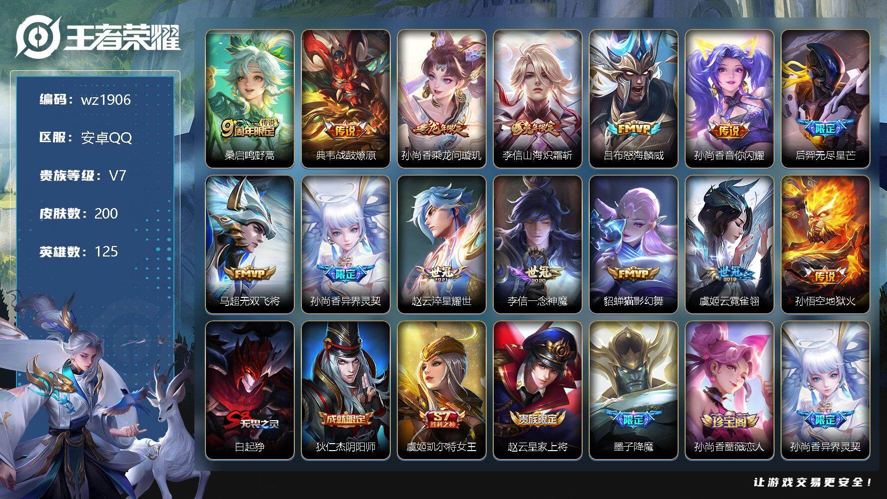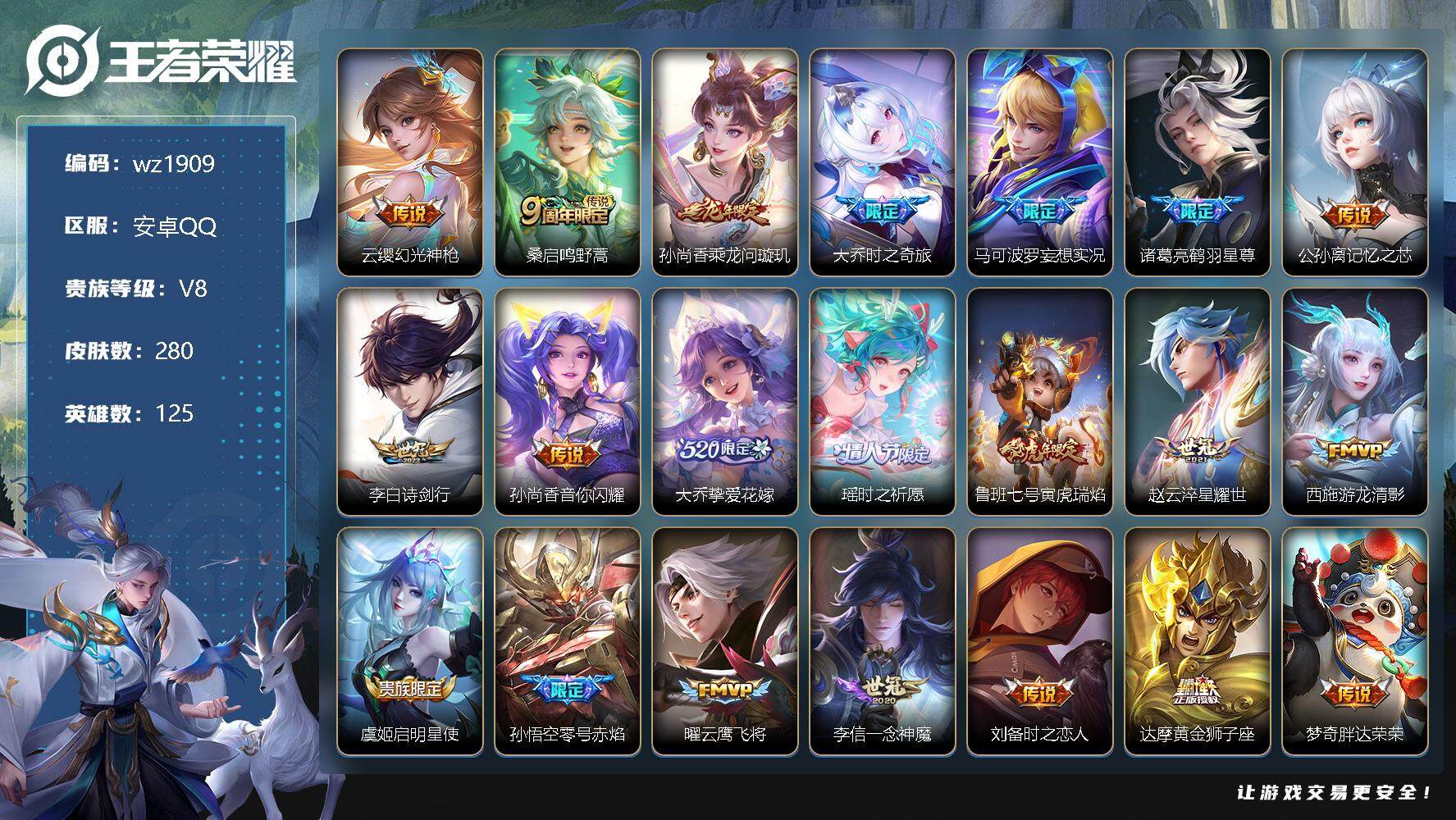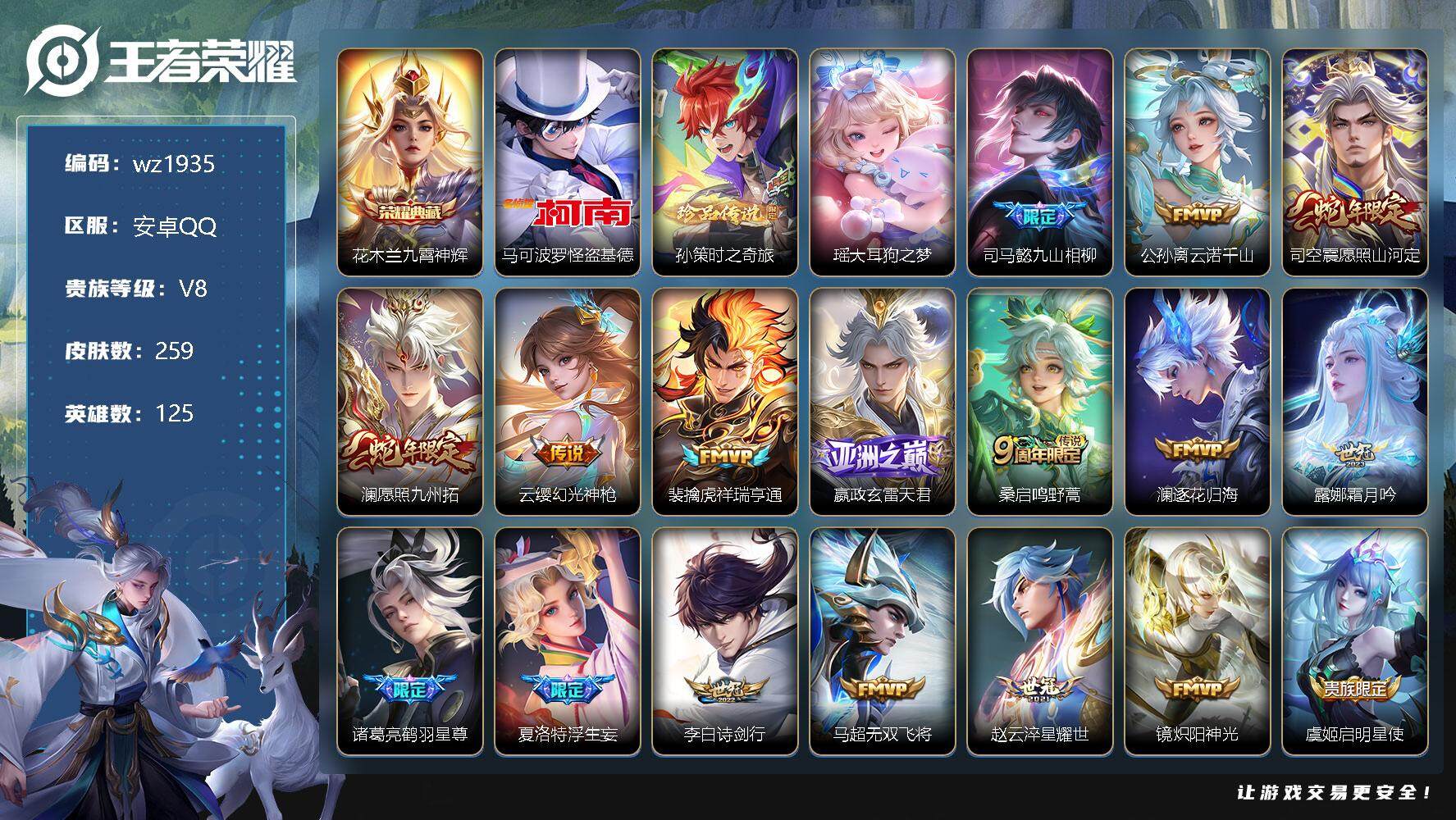 【游戏多多】 【可二次实名】【wz1935】安卓Q-V8-最强王者段位-125英雄-259皮肤-1典藏-0珍品无双-0无双-3珍品传说-26传说-77史诗 【英雄全皮】:司空震全皮,戈娅全皮,空空儿全皮,影全皮 【荣耀典藏】:花木兰九霄神辉 【珍品传说】:马可波罗怪盗基德,孙策时之奇旅,瑶大耳狗之梦 【传说皮肤】:司马懿九山相柳,公孙离云诺千山,司空震愿照山河定,澜愿照九州拓,云缨幻光神枪,裴擒虎祥瑞亨通,嬴政玄雷天君,桑启鸣野蒿,澜逐花归海,露娜霜月吟,诸葛亮鹤羽星尊,夏洛特浮生妄,李白诗剑行,马超无双飞将,赵云淬星耀世,镜炽阳神光,虞姬启明星使,曜云鹰飞将,李信一念神魔,貂蝉猫影幻舞,张良黄金白羊座,干将莫邪久胜战神,达摩黄金狮子座,梦奇胖达荣荣,后羿黄金射手座,宫本武藏地狱之眼 【限定皮肤】:姜子牙天穹之誓,狄仁杰阴阳师,赵云皇家上将,赵云百木心枪,孙尚香蔷薇恋人,庄周高山流水,高渐离玩趣恶龙,阿轲迷踪丽影,元歌云间偶戏,元歌无心,马可波罗暗影游猎,狄仁杰魔术师,狄仁杰万华元夜,达摩沙漠行僧,项羽海滩派对,老夫子醍醐杖,程咬金演武夺筹,刘邦夺宝奇兵,韩信傲雪梅枪,兰陵王金庭之子,刘备百相守梦,李元芳银河之约,李元芳云中旅人,虞姬启明星使,杨玉环遇见飞天,鬼谷子原初探秘者,鬼谷子五谷丰年,诸葛亮鹤羽星尊,苏烈千军破阵,百里玄策原初追逐者,沈梦溪大漠名商,明世隐疑决卦,裴擒虎李小龙,裴擒虎擒涛扼浪,云中君纤云弄巧,猪八戒西部大镖客,上官婉儿梁祝,嫦娥拒霜思,西施玲珑珍味,鲁班大师探海日志,桑启海盐诗旅,夏洛特浮生妄,戈娅驭风魔法,艾琳流音漫舞,司空震地狱燃心,阿古朵江河有灵,张良古海寻踪,蒙犽百解令,鬼谷子天穹祈灯,沈梦溪龙舞盛年,鲁班七号蔬乡物语,刘邦剑破天穹,镜青焰无极,周瑜熔金海岸 【赛季限定】:狄仁杰万华元夜,达摩沙漠行僧,老夫子醍醐杖,程咬金演武夺筹,兰陵王金庭之子,张良古海寻踪,李元芳云中旅人,鬼谷子原初探秘者,苏烈千军破阵,百里玄策原初追逐者,沈梦溪大漠名商,明世隐疑决卦,裴擒虎擒涛扼浪,鲁班大师探海日志,桑启海盐诗旅,鬼谷子天穹祈灯,刘邦剑破天穹,姜子牙天穹之誓 【战令限定】:阿轲迷踪丽影,元歌云间偶戏,马可波罗暗影游猎,刘邦夺宝奇兵,艾琳流音漫舞,李元芳银河之约,猪八戒西部大镖客,西施玲珑珍味,司空震地狱燃心,戈娅驭风魔法,鲁班七号蔬乡物语,镜青焰无极 【史诗皮肤】:鲁班七号电玩小子,露娜紫霞仙子,赵云皇家上将,赵云未来纪元,貂蝉圣诞恋歌,甄姬冰雪圆舞曲,王昭君偶像歌手,狄仁杰魔术师,宫本武藏鬼剑武藏,孙尚香蔷薇恋人,孙尚香水果甜心,嬴政摇滚巨星,妲己魅力维加斯,妲己女仆咖啡,墨子金属风暴,吕布圣诞狂欢,曹操幽灵船长,李白千年之狐,吕布末日机甲,张飞乱世虎臣,花木兰水晶猎龙者,刘邦德古拉伯爵,夏侯惇乘风破浪,小乔缤纷独角兽,兰陵王暗隐猎兽者,雅典娜冰冠公主,百里守约特工魅影,铠曙光守护者,蔡文姬舞动绿茵,李元芳逐浪之夏,白起星夜王子,阿轲节奏热浪,杨玉环遇见飞天,孙策猫狗日记,伽罗箭羽风息,狄仁杰鹰眼统帅,公孙离无限星赏官,上官婉儿梁祝,李元芳银河之约,大乔白蛇,阿轲迷踪丽影,橘右京修罗,马可波罗暗影游猎,百里玄策原初追逐者,裴擒虎李小龙,云中君纤云弄巧,元歌云间偶戏,百里玄策热力回旋,杨戬天秀启明,钟馗乐园奇幻夜,庄周高山流水,嫦娥拒霜思,韩信傲雪梅枪,赵云百木心枪,鬼谷子五谷丰年,元歌无心,刘备百相守梦,戈娅驭风魔法,司空震地狱燃心,阿古朵江河有灵,蒙犽百解令,鲁班七号蔬乡物语,镜青焰无极,亚连破空之剑,百里守约百相守梦,牛魔星界战将,孙膑茶境仙,姬小满飞车小橘子,狄仁杰绮世丹青,阿轲化蝶舞,刘禅鸭鸭历险记,狂铁龙之律动,百里守约雪豹霜爪,牛魔小牛鸭,周瑜百相守梦,黄忠百相守梦,公孙离涂山容容 【其他皮肤】:项羽海滩派对,韩信教廷特使,韩信街头霸王,露娜哥特玫瑰,达摩大发明家,赵云白执事,赵云忍炎影,白起白色死神,牛魔西部大镖客,扁鹊化身博士,扁鹊救世之瞳,宫本武藏未来纪元,安琪拉玩偶对对碰,孙膑天使之翼,姜子牙时尚教父,妲己少女阿狸,典韦黄金武士,亚瑟死亡骑士,达摩拳王,花木兰兔女郎,甄姬花好人间,刘备万事如意,后羿阿尔法小队,狄仁杰阴阳师,刘备纽约教父,刘备汉昭烈帝,关羽龙腾万里,钟无艳海滩丽影,王昭君幻想奇妙夜,老夫子功夫老勺,孙尚香沉稳之力,诸葛亮掌控之力,李白敏锐之力,鬼谷子幻乐之宴,苏烈坚韧之力,大乔守护之力,明世隐虹云星官,小乔丁香结,吕布野性能量,孙膑归虚梦演,高渐离玩趣恶龙,沈梦溪鲨炮海盗猫,姜子牙炽热元素使,哪吒次元突破,明世隐疑决卦,刘邦夺宝奇兵,盾山圆桌骑士,老夫子醍醐杖,猪八戒西部大镖客,狂铁特工战影,鬼谷子原初探秘者,狄仁杰万华元夜,刘禅秘密基地,杨戬次元傲视,露娜瓷语鉴心,程咬金演武夺筹,鲁班大师