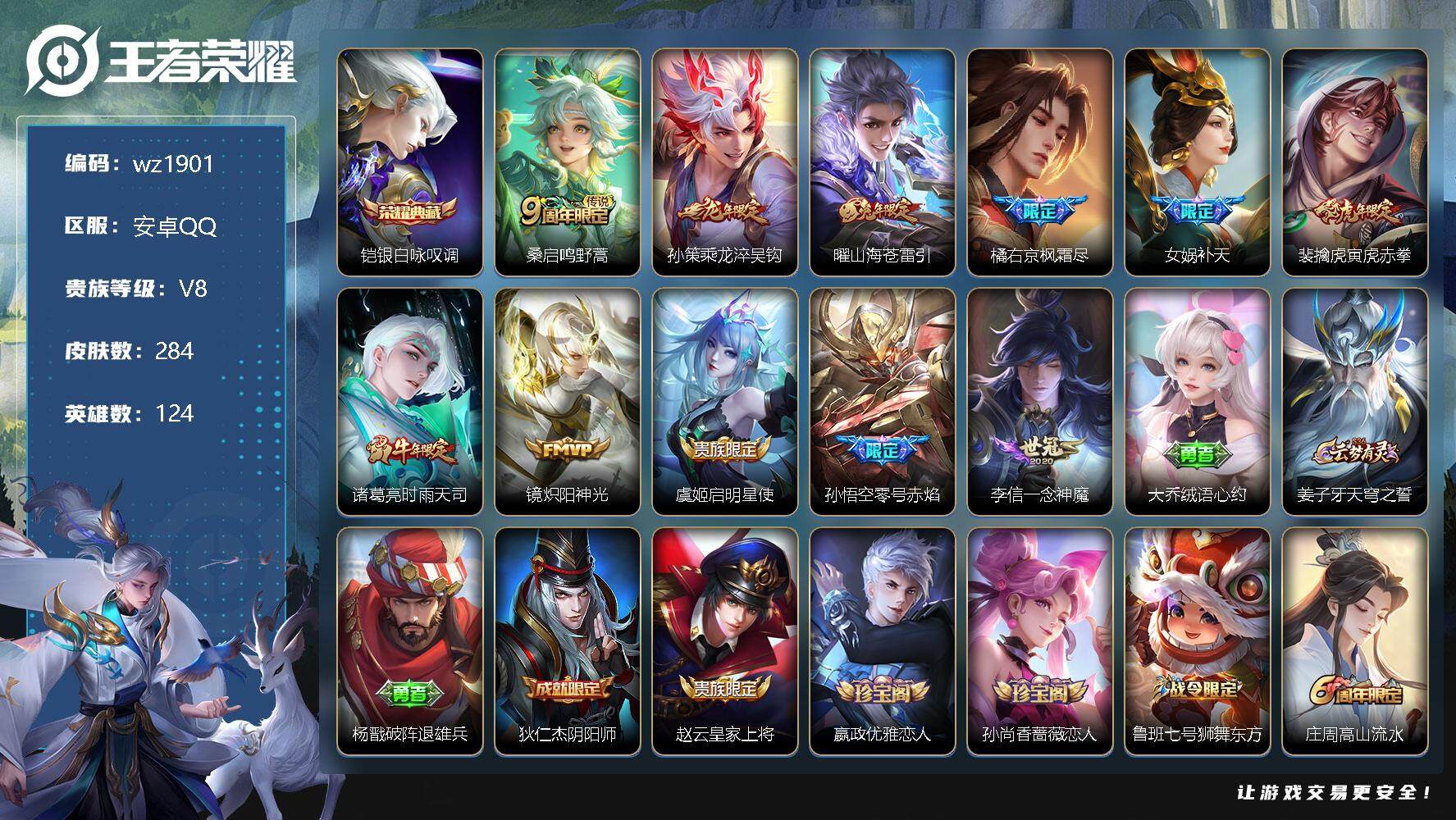 【游戏多多】 【可二次实名】【wz1901】安卓Q-V8-最强王者段位-124英雄-284皮肤-1典藏-0珍品无双-0无双-0珍品传说-11传说-85史诗 【英雄全皮】:橘右京全皮,钟馗全皮,鬼谷子全皮,空空儿全皮 【荣耀典藏】:铠银白咏叹调 【传说皮肤】:桑启鸣野蒿,孙策乘龙淬吴钩,曜山海苍雷引,橘右京枫霜尽,女娲补天,裴擒虎寅虎赤拳,诸葛亮时雨天司,镜炽阳神光,虞姬启明星使,孙悟空零号赤焰,李信一念神魔 【限定皮肤】:大乔绒语心约,姜子牙天穹之誓,杨戬破阵退雄兵,狄仁杰阴阳师,赵云皇家上将,嬴政优雅恋人,孙尚香蔷薇恋人,鲁班七号狮舞东方,庄周高山流水,高渐离玩趣恶龙,钟无艳超时空战士,芈月幻夜卜梦,周瑜赤莲之焰,元歌云间偶戏,元歌无心,夏侯惇朔风刀,甄姬游园惊梦,甄姬落雪兰心,典韦蓝屏警告,马可波罗逐梦之星,马可波罗暗影游猎,狄仁杰魔术师,狄仁杰万华元夜,达摩沙漠行僧,项羽海滩派对,老夫子醍醐杖,程咬金演武夺筹,韩信傲雪梅枪,王昭君午后时光,兰陵王驯魔猎人,兰陵王金庭之子,花木兰青春决赛季,橘右京枫霜尽,亚瑟潮玩骑士王,孙悟空至尊宝,孙悟空大圣娶亲,孙悟空零号赤焰,后羿圣弓游侠,李元芳银河之约,李元芳云中旅人,虞姬启明星使,钟馗神迹守卫,钟馗驱傩正仪,杨玉环遇见飞天,女娲朔望之晖,女娲补天,干将莫邪真爱魔法,雅典娜单词大作战,雅典娜黎明之约,鬼谷子原初探秘者,鬼谷子五谷丰年,诸葛亮时雨天司,黄忠火炮绅士,苏烈千军破阵,百里玄策原初追逐者,弈星混沌棋,梦奇顽趣,沈梦溪星空之诺,沈梦溪大漠名商,明世隐疑决卦,裴擒虎李小龙,裴擒虎寅虎赤拳,裴擒虎擒涛扼浪,狂铁电玩高手,米莱狄御霄,云中君纤云弄巧,盾山御銮,猪八戒西部大镖客,上官婉儿梁祝,嫦娥拒霜思,曜山海苍雷引,蒙犽狂想玩偶喵,鲁班大师探海日志,桑启海盐诗旅,艾琳流音漫舞,司空震地狱燃心,阿古朵江河有灵,张良古海寻踪,蒙犽百解令,鬼谷子天穹祈灯,孙策乘龙淬吴钩,百里玄策超元猎域,刘邦剑破天穹,程咬金群星魔术团,关羽决胜骁骑,周瑜熔金海岸 【年限皮肤】:裴擒虎寅虎赤拳,诸葛亮时雨天司,曜山海苍雷引,孙策乘龙淬吴钩 【赛季限定】:夏侯惇朔风刀,狄仁杰万华元夜,达摩沙漠行僧,老夫子醍醐杖,程咬金演武夺筹,兰陵王金庭之子,张良古海寻踪,李元芳云中旅人,钟馗驱傩正仪,雅典娜黎明之约,鬼谷子原初探秘者,苏烈千军破阵,百里玄策原初追逐者,弈星混沌棋,梦奇顽趣,沈梦溪大漠名商,明世隐疑决卦,裴擒虎擒涛扼浪,米莱狄御霄,盾山御銮,鲁班大师探海日志,桑启海盐诗旅,鬼谷子天穹祈灯,刘邦剑破天穹,姜子牙天穹之誓 【战令限定】:鲁班七号狮舞东方,钟无艳超时空战士,芈月幻夜卜梦,周瑜赤莲之焰,元歌云间偶戏,甄姬落雪兰心,典韦蓝屏警告,马可波罗暗影游猎,王昭君午后时光,兰陵王驯魔猎人,艾琳流音漫舞,亚瑟潮玩骑士王,后羿圣弓游侠,李元芳银河之约,钟馗神迹守卫,女娲朔望之晖,干将莫邪真爱魔法,雅典娜单词大作战,黄忠火炮绅士,沈梦溪星空之诺,狂铁电玩高手,猪八戒西部大镖客,蒙犽狂想玩偶喵,司空震地狱燃心 【史诗皮肤】:露娜紫霞仙子,阿轲暗夜猫娘,赵云皇家上将,赵云未来纪元,貂蝉圣诞恋歌,甄姬冰雪圆舞曲,王昭君偶像歌手,狄仁杰魔术师,廉颇地狱岩魂,宫本武藏鬼剑武藏,孙尚香蔷薇恋人,孙尚香水果甜心,嬴政优雅恋人,嬴政暗夜贵公子,妲己魅力维加斯,妲己女仆咖啡,墨子龙骑士,墨子金属风暴,吕布圣诞狂欢,刘禅绅士熊喵,曹操幽灵船长,李白千年之狐,吕布末日机甲,张飞乱世虎臣,孙悟空至尊宝,花木兰水晶猎龙者,刘邦德古拉伯爵,夏侯惇乘风破浪,小乔缤纷独角兽,兰陵王暗隐猎兽者,诸葛亮黄金分割率,甄姬游园惊梦,马可波罗逐梦之星,亚瑟心灵战警,雅典娜冰冠公主,花木兰青春决赛季,百里守约特工魅影,蔡文姬舞动绿茵,刘禅天才门将,李元芳逐浪之夏,程咬金功夫厨神,白起星夜王子,阿轲节奏热浪,杨玉环遇见飞天,大乔猫狗日记,孙悟空大圣娶亲,典韦蓝屏警告,鲁班七号狮舞东方,狄仁杰鹰眼统帅,兰陵王驯魔猎人,上官婉儿梁祝,李元芳银河之约,娜可露露晚萤,橘右京修罗,马可波罗暗影游猎,蒙犽狂想玩偶喵,百里玄策原初追逐者,裴擒虎李小龙,云中君纤云弄巧,元歌云间偶戏,杨戬天秀启明,干将莫邪真爱魔法,钟馗乐园奇幻夜,庄周高山流水,司马懿暗渊魔法,嫦娥拒霜思,黄忠火炮绅士,雅典娜黎明之约,韩信傲雪梅枪,狂铁电玩高手,钟无艳超时空战士,鬼谷子五谷丰年,元歌无心,梦奇顽趣,刘禅电玩爆裂旋风,司空震地狱燃心,阿古朵江河有灵,蒙犽百解令,百里玄策超元猎域,关羽决胜骁骑,大司命东方月初,狂铁龙之律动,后羿石田雨龙,黄忠百相守梦,公孙离涂山容容 【其他皮肤】:项羽海滩派对,韩信教廷特使,韩信街头霸王,露娜哥特玫瑰,阿轲爱心护理,达摩大发明家,赵云白执事,赵云忍炎影,芈月红桃皇后,程咬金星际陆战队,白起