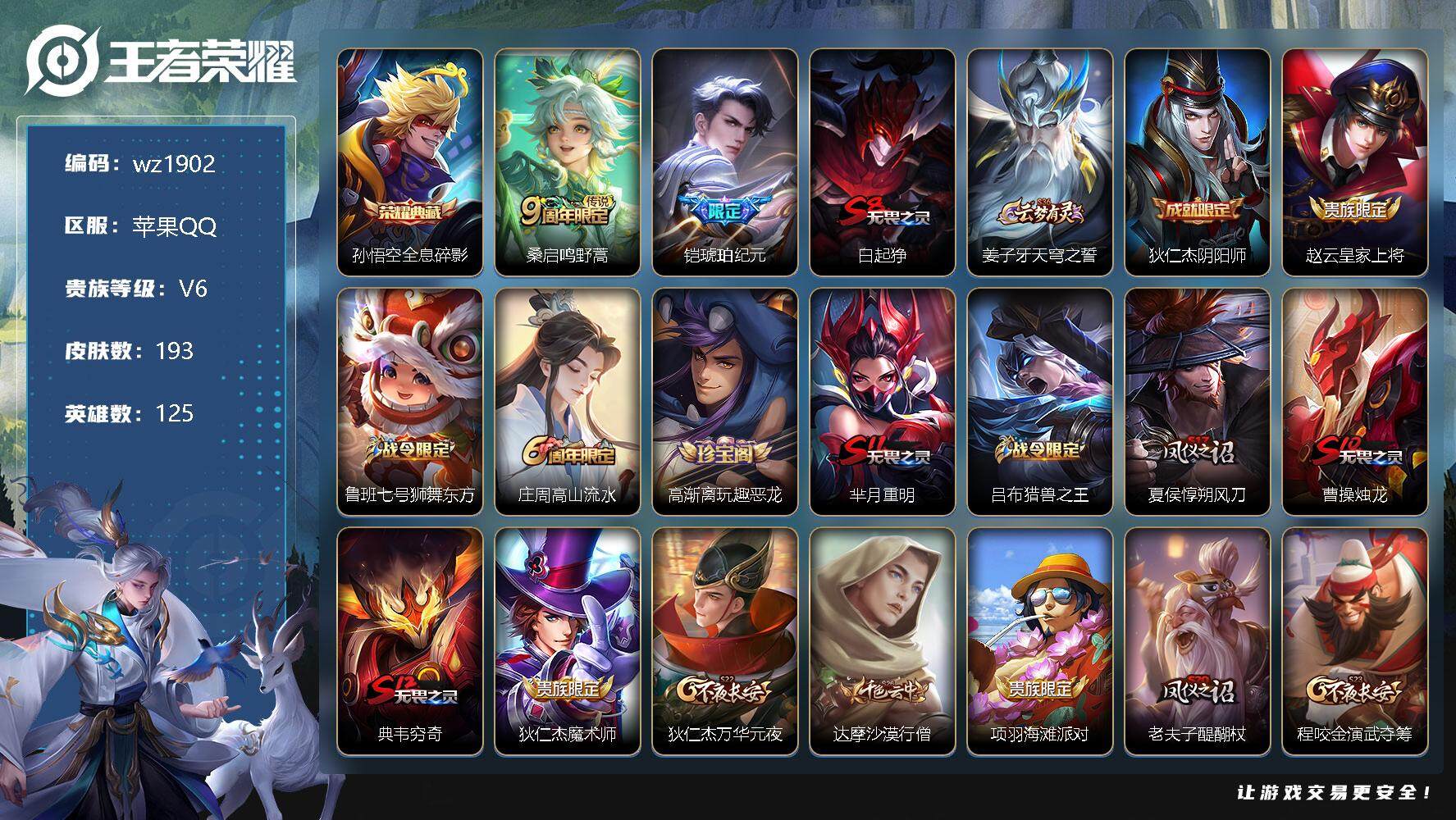 【游戏多多】 【可二次实名】【wz1902】苹果Q-V6-至尊星耀III段位-125英雄-193皮肤-1典藏-0珍品无双-0无双-0珍品传说-2传说-37史诗 【英雄全皮】:影全皮 【荣耀典藏】:孙悟空全息碎影 【传说皮肤】:桑启鸣野蒿,铠琥珀纪元 【限定皮肤】:白起狰,姜子牙天穹之誓,狄仁杰阴阳师,赵云皇家上将,鲁班七号狮舞东方,庄周高山流水,高渐离玩趣恶龙,芈月重明,吕布猎兽之王,夏侯惇朔风刀,曹操烛龙,典韦穷奇,狄仁杰魔术师,狄仁杰万华元夜,达摩沙漠行僧,项羽海滩派对,老夫子醍醐杖,程咬金演武夺筹,牛魔御旌,李元芳云中旅人,钟馗神迹守卫,钟馗驱傩正仪,干将莫邪胡桃夹子,雅典娜黎明之约,太乙真人饕餮,鬼谷子原初探秘者,鬼谷子五谷丰年,苏烈千军破阵,弈星混沌棋,沈梦溪大漠名商,明世隐疑决卦,裴擒虎擒涛扼浪,米莱狄御霄,云中君纤云弄巧,盾山御銮,猪八戒西部大镖客,鲁班大师探海日志,桑启海盐诗旅,张良古海寻踪,高渐离燃音魔法,妲己灵卜魔法,鬼谷子天穹祈灯,铠琥珀纪元,沈梦溪龙舞盛年,刘邦剑破天穹,程咬金群星魔术团 【赛季限定】:白起狰,芈月重明,夏侯惇朔风刀,曹操烛龙,典韦穷奇,狄仁杰万华元夜,达摩沙漠行僧,老夫子醍醐杖,程咬金演武夺筹,张良古海寻踪,牛魔御旌,李元芳云中旅人,钟馗驱傩正仪,雅典娜黎明之约,太乙真人饕餮,鬼谷子原初探秘者,苏烈千军破阵,弈星混沌棋,沈梦溪大漠名商,明世隐疑决卦,裴擒虎擒涛扼浪,米莱狄御霄,盾山御銮,鲁班大师探海日志,桑启海盐诗旅,鬼谷子天穹祈灯,刘邦剑破天穹,姜子牙天穹之誓 【战令限定】:鲁班七号狮舞东方,吕布猎兽之王,钟馗神迹守卫,猪八戒西部大镖客,高渐离燃音魔法,妲己灵卜魔法 【史诗皮肤】:露娜紫霞仙子,阿轲暗夜猫娘,赵云皇家上将,狄仁杰魔术师,宫本武藏鬼剑武藏,孙尚香水果甜心,嬴政摇滚巨星,妲己魅力维加斯,墨子金属风暴,吕布圣诞狂欢,李白千年之狐,张飞乱世虎臣,花木兰水晶猎龙者,夏侯惇乘风破浪,兰陵王暗隐猎兽者,诸葛亮黄金分割率,亚瑟心灵战警,安琪拉心灵骇客,百里守约特工魅影,铠曙光守护者,李元芳逐浪之夏,白起星夜王子,阿轲节奏热浪,孙策猫狗日记,鲁班七号狮舞东方,狄仁杰鹰眼统帅,橘右京修罗,云中君纤云弄巧,庄周高山流水,雅典娜黎明之约,鬼谷子五谷丰年,妲己灵卜魔法,高渐离燃音魔法,牛魔星界战将,孙膑茶境仙,阿轲化蝶舞,刘禅鸭鸭历险记,狂铁龙之律动 【其他皮肤】:项羽海滩派对,韩信教廷特使,韩信街头霸王,露娜哥特玫瑰,达摩大发明家,赵云忍炎影,芈月红桃皇后,武则天东方不败,扁鹊化身博士,扁鹊救世之瞳,宫本武藏未来纪元,安琪拉玩偶对对碰,姜子牙时尚教父,妲己少女阿狸,典韦黄金武士,亚瑟死亡骑士,达摩拳王,花木兰兔女郎,张飞五福同心,宫本武藏万象初新,后羿阿尔法小队,狄仁杰阴阳师,刘备纽约教父,刘备汉昭烈帝,白起狰,钟无艳海滩丽影,太乙真人饕餮,曹操烛龙,王昭君幻想奇妙夜,芈月重明,狂铁命运角斗场,老夫子功夫老勺,孙尚香沉稳之力,典韦穷奇,鬼谷子幻乐之宴,大乔守护之力,项羽科学大爆炸,米莱狄御霄,吕布猎兽之王,明世隐虹云星官,牛魔御旌,小乔丁香结,吕布野性能量,钟馗神迹守卫,盾山御銮,孙膑归虚梦演,高渐离玩趣恶龙,沈梦溪鲨炮海盗猫,夏侯惇朔风刀,弈星混沌棋,哪吒次元突破,明世隐疑决卦,老夫子醍醐杖,猪八戒西部大镖客,狂铁特工战影,鬼谷子原初探秘者,狄仁杰万华元夜,刘禅秘密基地,露娜瓷语鉴心,程咬金演武夺筹,张良缤纷绘卷,钟馗驱傩正仪,鲁班大师乓乓大师,苏烈千军破阵,干将莫邪胡桃夹子,马可波罗潮玩牛仔,达摩沙漠行僧,程咬金无双福将,刘禅唤灵魔甲,米莱狄契约魔法,沈梦溪大漠名商,蒙恬蔚蓝守将,李元芳云中旅人,戈娅危途狂花,刘备潮玩造梦师,桑启海盐诗旅,猪八戒潮玩探月行,赵怀真太极少年,裴擒虎擒涛扼浪,太乙真人劲辣红锅,鲁班大师探海日志,张良古海寻踪,鬼谷子天穹祈灯,妲己灵卜魔法,廉颇功夫炙烤,沈梦溪龙舞盛年,刘邦剑破天穹,盘古经纬探寻者,程咬金群星魔术团,大司命暗都幽影,姜子牙天穹之誓,盘古敬我三分,苍苍林狼骑,太乙真人谧流熔炉,典韦铁骨偃魂,马超访茗客,影魅影绮裳,西施雪境奇遇,姜子牙星梦巡礼,明世隐景韶洛都,戈娅玫蓝誓约,刘备浪漫序章,钟馗虚灵犬护,沈梦溪鸭鸭历险记,张良灵野札记,阿古朵布丁狗之约,白起死霸装,鲁班七号福禄兄弟,鲁班七号木偶奇遇记,高渐离金属狂潮,露娜绯红之刃,貂蝉异域舞娘,狄仁杰锦衣卫,小乔万圣前夜,孙悟空西部大镖客,后羿精灵王,兰陵王隐刃,钟馗地府判官,李元芳特种部队,虞姬加勒比小姐,关羽天启骑士,马可波罗激情绿茵,苍维京掠夺者,杨戬埃及法老,哪吒三太子,诸葛亮星航指挥官,黄忠芝加哥教父,东皇太一东海龙王,鬼谷子阿摩司公爵,铠龙域领主,百里守约绝影神枪,百里玄策威尼斯狂欢,女娲尼罗河女神,公孙离花间
