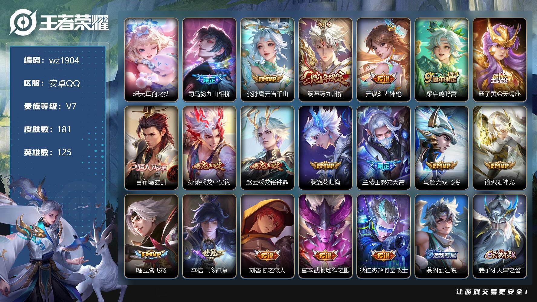 【游戏多多】 【可二次实名】【wz1904】安卓Q-V7-最强王者段位-125英雄-181皮肤-0典藏-0珍品无双-0无双-1珍品传说-18传说-54史诗 【英雄全皮】:司马懿全皮,刘备全皮 【珍品传说】:瑶大耳狗之梦 【传说皮肤】:司马懿九山相柳,公孙离云诺千山,澜愿照九州拓,云缨幻光神枪,桑启鸣野蒿,墨子黄金天蝎座,吕布曦玄引,孙策乘龙淬吴钩,赵云乘龙铭钟鼎,澜逐花归海,兰陵王影龙天霄,马超无双飞将,镜炽阳神光,曜云鹰飞将,李信一念神魔,刘备时之恋人,宫本武藏地狱之眼,狄仁杰超时空战士 【限定皮肤】:蒙犽顽岩魄,姜子牙天穹之誓,李白谪仙醉月,狄仁杰阴阳师,赵云皇家上将,狄仁杰魔术师,项羽海滩派对,韩信傲雪梅枪,兰陵王影龙天霄,孙悟空至尊宝,孙悟空孙行者,后羿如梦令,刘备百相守梦,李元芳银河之约,太乙真人华丽摇滚,裴擒虎李小龙,裴擒虎擒涛扼浪,云中君纤云弄巧,鲁班大师探海日志,桑启海盐诗旅,阿古朵江河有灵,张良古海寻踪,蒙犽百解令,蒙恬荣光圣徽,鬼谷子天穹祈灯,伽罗琥珀纪元,姬小满妄想食味,孙策乘龙淬吴钩,赵云乘龙铭钟鼎,吕布曦玄引,沈梦溪龙舞盛年,鲁班七号蔬乡物语,李元芳蔬乡物语,刘邦剑破天穹,程咬金群星魔术团,镜青焰无极,项羽苍威无极,刘备异域游侠,周瑜熔金海岸 【年限皮肤】:孙策乘龙淬吴钩,赵云乘龙铭钟鼎 【赛季限定】:张良古海寻踪,裴擒虎擒涛扼浪,鲁班大师探海日志,桑启海盐诗旅,鬼谷子天穹祈灯,蒙恬荣光圣徽,刘邦剑破天穹,姜子牙天穹之誓 【战令限定】:李元芳银河之约,鲁班七号蔬乡物语,李元芳蔬乡物语,镜青焰无极,项羽苍威无极 【史诗皮肤】:露娜紫霞仙子,赵云皇家上将,甄姬冰雪圆舞曲,狄仁杰魔术师,廉颇地狱岩魂,宫本武藏鬼剑武藏,孙尚香水果甜心,嬴政摇滚巨星,妲己女仆咖啡,墨子金属风暴,刘禅绅士熊喵,李白千年之狐,孙悟空至尊宝,夏侯惇乘风破浪,小乔缤纷独角兽,兰陵王暗隐猎兽者,诸葛亮黄金分割率,雅典娜冰冠公主,百里守约特工魅影,铠曙光守护者,李元芳逐浪之夏,程咬金功夫厨神,阿轲节奏热浪,狄仁杰鹰眼统帅,李元芳银河之约,后羿如梦令,橘右京修罗,裴擒虎李小龙,云中君纤云弄巧,西施诗语江南,百里玄策热力回旋,孙悟空孙行者,司马懿暗渊魔法,韩信傲雪梅枪,高渐离天秀音浪,刘备百相守梦,阿古朵江河有灵,蒙犽百解令,蒙恬荣光圣徽,伽罗琥珀纪元,姬小满妄想食味,鲁班七号蔬乡物语,镜青焰无极,蒙犽顽岩魄,亚连破空之剑,马可波罗星界特工,李白谪仙醉月,赵怀真器灵浮梦炉,阿轲化蝶舞,狂铁龙之律动,后羿石田雨龙,周瑜百相守梦,黄忠百相守梦,公孙离涂山容容 【其他皮肤】:项羽海滩派对,韩信教廷特使,韩信街头霸王,阿轲爱心护理,赵云白执事,赵云忍炎影,白起白色死神,牛魔西部大镖客,扁鹊化身博士,孙膑天使之翼,典韦黄金武士,亚瑟死亡骑士,花木兰兔女郎,刘备万事如意,宫本武藏万象初新,狄仁杰阴阳师,刘备纽约教父,刘备汉昭烈帝,关羽龙腾万里,钟无艳海滩丽影,王昭君幻想奇妙夜,狂铁命运角斗场,老夫子功夫老勺,诸葛亮掌控之力,李白敏锐之力,鬼谷子幻乐之宴,太乙真人华丽摇滚,大乔守护之力,明世隐虹云星官,沈梦溪鲨炮海盗猫,狂铁特工战影,张良缤纷绘卷,鲁班大师乓乓大师,马可波罗潮玩牛仔,蒙恬蔚蓝守将,刘备潮玩造梦师,桑启海盐诗旅,猪八戒潮玩探月行,裴擒虎擒涛扼浪,太乙真人劲辣红锅,鲁班大师探海日志,李元芳妄想特派,哪吒热血海滩,张良古海寻踪,钟无艳聚星闪耀,海月王牌新星,亚连破局者,后羿完美运算,鬼谷子天穹祈灯,海诺时空谍影,嫦娥漠中幻影,朵莉亚金色潮汐,廉颇功夫炙烤,亚瑟鸿运当头,沈梦溪龙舞盛年,钟无艳春野之旅,李元芳蔬乡物语,扁鹊无尽旅途,刘邦剑破天穹,盘古经纬探寻者,程咬金群星魔术团,项羽苍威无极,刘备异域游侠,姜子牙天穹之誓,周瑜熔金海岸,孙悟空神迹守卫,盘古敬我三分,东皇太一噬灭天穹,干将莫邪雾都夜雨,苍苍林狼骑,太乙真人谧流熔炉,典韦铁骨偃魂,西施雪境奇遇,姜子牙星梦巡礼,明世隐景韶洛都,戈娅玫蓝誓约,刘备浪漫序章,钟馗虚灵犬护,苏烈春野闲踪,张良灵野札记,阿古朵布丁狗之约,露娜命运加冕,姬小满小满鸭,白起死霸装,甄姬逆浪荇歌,孙策百相守梦,庄周锦麟游梦,莱西奥踏浪烽翎,鬼谷子克喵,王昭君精灵公主,张良一千零一夜,后羿精灵王,马可波罗激情绿茵,苍维京掠夺者,百里守约绝影神枪,女娲尼罗河女神,公孙离花间舞,米莱狄精准探案法,元歌午夜歌剧院,司马懿魇语军师,李信灼热之刃,盘古创世神祝,瑶森,阿古朵熊喵少女,司空震启蛰,云缨赤焰之缨,金蝉前尘,暃碧珀绯影 【内测皮肤】:狂铁特工战影 【营地ID】:1782420028