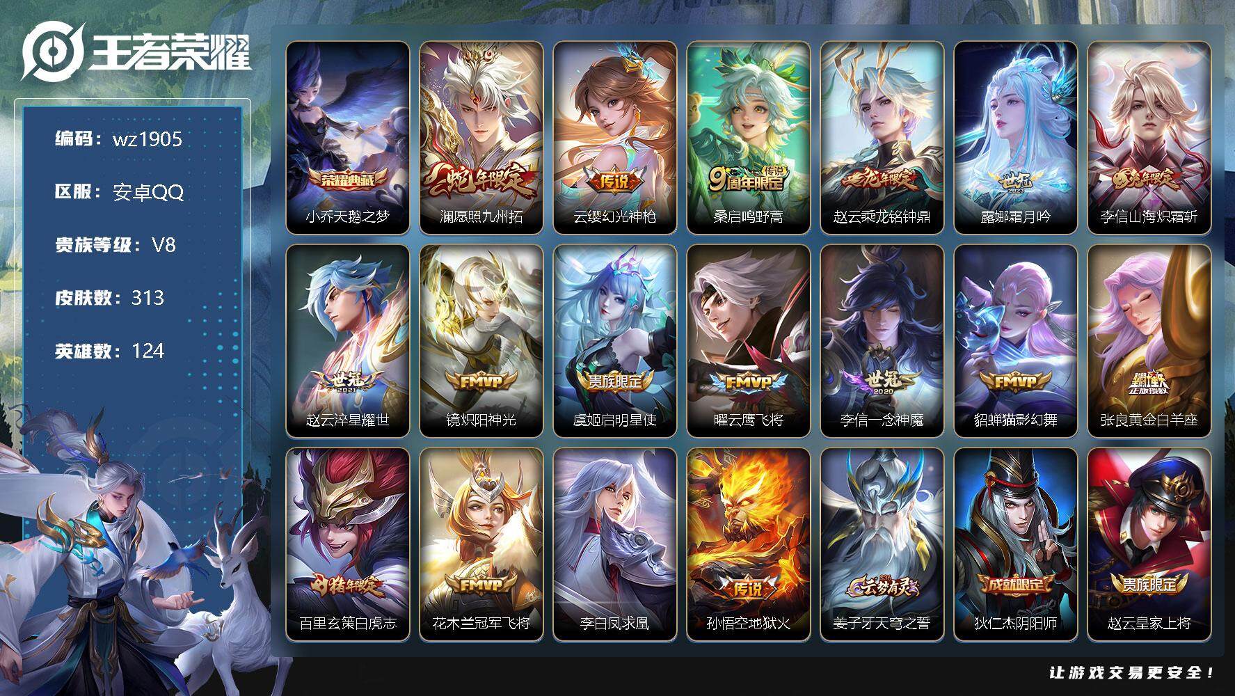 【游戏多多】 【可二次实名】【wz1905】安卓Q-V8-至尊星耀IV段位-124英雄-313皮肤-1典藏-0珍品无双-0无双-0珍品传说-17传说-89史诗 【英雄全皮】:鬼谷子全皮,李信全皮,蒙恬全皮 【荣耀典藏】:小乔天鹅之梦 【传说皮肤】:澜愿照九州拓,云缨幻光神枪,桑启鸣野蒿,赵云乘龙铭钟鼎,露娜霜月吟,李信山海炽霜斩,赵云淬星耀世,镜炽阳神光,虞姬启明星使,曜云鹰飞将,李信一念神魔,貂蝉猫影幻舞,张良黄金白羊座,百里玄策白虎志,花木兰冠军飞将,李白凤求凰,孙悟空地狱火 【限定皮肤】:姜子牙天穹之誓,狄仁杰阴阳师,赵云皇家上将,墨子神迹守卫,嬴政白昼王子,孙尚香蔷薇恋人,鲁班七号狮舞东方,庄周高山流水,阿轲迷踪丽影,钟无艳王者之锤,吕布猎兽之王,吕布御风骁将,周瑜赤莲之焰,元歌云间偶戏,元歌无心,夏侯惇朔风刀,甄姬游园惊梦,典韦蓝屏警告,马可波罗暗影游猎,马可波罗山海玄木吟,狄仁杰魔术师,狄仁杰万华元夜,达摩星际陆战队,达摩沙漠行僧,项羽海滩派对,老夫子醍醐杖,老夫子航海奇遇记,关羽冰锋战神,程咬金演武夺筹,露娜一生所爱,刘邦夺宝奇兵,韩信逐梦之影,韩信飞衡,兰陵王驯魔猎人,兰陵王金庭之子,花木兰青春决赛季,花木兰默契交锋,亚瑟潮玩骑士王,孙悟空至尊宝,孙悟空大圣娶亲,孙悟空孙行者,牛魔御旌,李元芳银河之约,李元芳云中旅人,虞姬启明星使,钟馗神迹守卫,钟馗驱傩正仪,杨玉环寅虎心曲,女娲朔望之晖,雅典娜单词大作战,雅典娜黎明之约,蔡文姬繁星吟游,鬼谷子原初探秘者,鬼谷子五谷丰年,苏烈千军破阵,百里玄策白虎志,百里玄策原初追逐者,百里守约朱雀志,弈星混沌棋,梦奇顽趣,沈梦溪星空之诺,沈梦溪大漠名商,明世隐疑决卦,裴擒虎天狼狩猎者,裴擒虎李小龙,裴擒虎擒涛扼浪,米莱狄御霄,米莱狄胡桃异想国,云中君纤云弄巧,李信山海炽霜斩,盾山御銮,猪八戒西部大镖客,上官婉儿梁祝,上官婉儿天狼绘梦者,蒙犽狂想玩偶喵,鲁班大师探海日志,桑启海盐诗旅,艾琳女武神,阿古朵江河有灵,张良古海寻踪,蒙恬荣光圣徽,鬼谷子天穹祈灯,姬小满妄想食味,赵云乘龙铭钟鼎,沈梦溪龙舞盛年,刘邦剑破天穹,程咬金群星魔术团,周瑜熔金海岸 【年限皮肤】:百里玄策白虎志,百里守约朱雀志,杨玉环寅虎心曲,李白凤求凰,吕布御风骁将,韩信飞衡,马超神威,马可波罗山海玄木吟,李信山海炽霜斩,赵云乘龙铭钟鼎 【赛季限定】:夏侯惇朔风刀,狄仁杰万华元夜,达摩沙漠行僧,老夫子醍醐杖,程咬金演武夺筹,兰陵王金庭之子,张良古海寻踪,牛魔御旌,李元芳云中旅人,钟馗驱傩正仪,雅典娜黎明之约,鬼谷子原初探秘者,苏烈千军破阵,百里玄策原初追逐者,弈星混沌棋,梦奇顽趣,沈梦溪大漠名商,明世隐疑决卦,裴擒虎擒涛扼浪,米莱狄御霄,盾山御銮,鲁班大师探海日志,桑启海盐诗旅,鬼谷子天穹祈灯,蒙恬荣光圣徽,刘邦剑破天穹,姜子牙天穹之誓 【战令限定】:墨子神迹守卫,嬴政白昼王子,鲁班七号狮舞东方,阿轲迷踪丽影,吕布猎兽之王,周瑜赤莲之焰,元歌云间偶戏,典韦蓝屏警告,马可波罗暗影游猎,达摩星际陆战队,老夫子航海奇遇记,刘邦夺宝奇兵,兰陵王驯魔猎人,亚瑟潮玩骑士王,李元芳银河之约,钟馗神迹守卫,女娲朔望之晖,雅典娜单词大作战,沈梦溪星空之诺,米莱狄胡桃异想国,猪八戒西部大镖客,蒙犽狂想玩偶喵 【史诗皮肤】:露娜紫霞仙子,阿轲暗夜猫娘,钟无艳王者之锤,赵云皇家上将,赵云未来纪元,貂蝉圣诞恋歌,甄姬冰雪圆舞曲,王昭君偶像歌手,狄仁杰魔术师,宫本武藏鬼剑武藏,孙尚香蔷薇恋人,孙尚香水果甜心,嬴政暗夜贵公子,嬴政摇滚巨星,妲己女仆咖啡,墨子金属风暴,吕布圣诞狂欢,曹操幽灵船长,李白千年之狐,吕布末日机甲,张飞乱世虎臣,关羽冰锋战神,孙悟空至尊宝,花木兰水晶猎龙者,刘邦德古拉伯爵,韩信逐梦之影,小乔缤纷独角兽,兰陵王暗隐猎兽者,诸葛亮黄金分割率,甄姬游园惊梦,亚瑟心灵战警,雅典娜冰冠公主,安琪拉心灵骇客,花木兰青春决赛季,百里守约特工魅影,铠曙光守护者,程咬金功夫厨神,白起星夜王子,阿轲节奏热浪,嬴政白昼王子,孙策猫狗日记,百里守约朱雀志,露娜一生所爱,孙悟空大圣娶亲,典韦蓝屏警告,伽罗箭羽风息,裴擒虎天狼狩猎者,鲁班七号狮舞东方,狄仁杰鹰眼统帅,兰陵王驯魔猎人,上官婉儿梁祝,蔡文姬繁星吟游,李元芳银河之约,娜可露露晚萤,韩信飞衡,阿轲迷踪丽影,橘右京修罗,马超神威,孙尚香时之恋人,上官婉儿天狼绘梦者,马可波罗暗影游猎,蒙犽狂想玩偶喵,百里玄策原初追逐者,裴擒虎李小龙,云中君纤云弄巧,元歌云间偶戏,吕布御风骁将,花木兰默契交锋,米莱狄胡桃异想国,老夫子航海奇遇记,孙悟空孙行者,庄周高山流水,雅典娜黎明之约,杨玉环寅虎心曲,鬼谷子五谷丰年,元歌无心,梦奇顽趣,马可波罗山海玄木吟,阿古朵江河有灵,蒙恬荣光圣徽,姬小满妄想食味,艾琳陌上桑,百里守约百相守