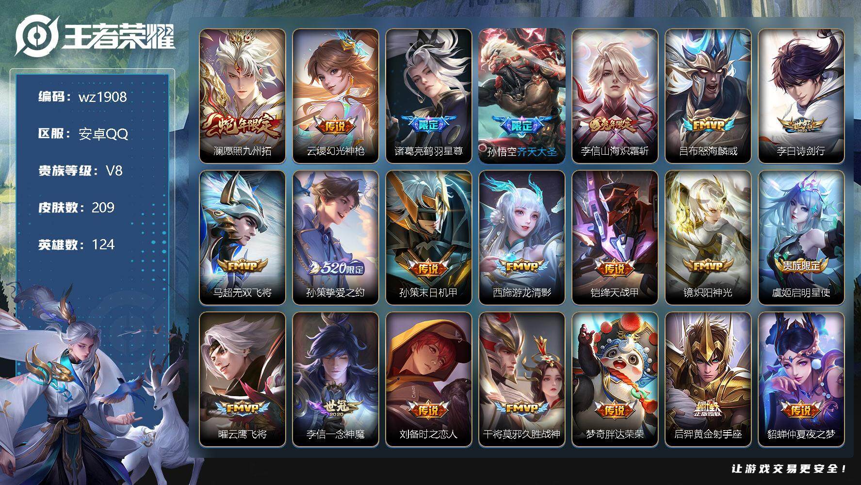 【游戏多多】 【可二次实名】【wz1908】安卓Q-V8-至尊星耀IV段位-124英雄-209皮肤-0典藏-0珍品无双-0无双-0珍品传说-24传说-58史诗 【英雄全皮】:李信全皮,戈娅全皮 【传说皮肤】:澜愿照九州拓,云缨幻光神枪,诸葛亮鹤羽星尊,孙悟空齐天大圣,李信山海炽霜斩,吕布怒海麟威,李白诗剑行,马超无双飞将,孙策挚爱之约,孙策末日机甲,西施游龙清影,铠绛天战甲,镜炽阳神光,虞姬启明星使,曜云鹰飞将,李信一念神魔,刘备时之恋人,干将莫邪久胜战神,梦奇胖达荣荣,后羿黄金射手座,貂蝉仲夏夜之梦,孙尚香末日机甲,宫本武藏地狱之眼,狄仁杰超时空战士 【限定皮肤】:狄仁杰阴阳师,赵云皇家上将,孙尚香蔷薇恋人,扁鹊奇幻香踪,白起夜都怪侠,元歌无心,夏侯惇匿光决锋者,马可波罗暗影游猎,马可波罗山海玄木吟,狄仁杰魔术师,项羽海滩派对,关羽百相守梦,王昭君午后时光,兰陵王金庭之子,孙悟空至尊宝,孙悟空齐天大圣,刘备百相守梦,李元芳云中旅人,虞姬启明星使,杨戬潮玩骑兵,鬼谷子五谷丰年,诸葛亮鹤羽星尊,沈梦溪大漠名商,明世隐吟游魔法,裴擒虎擒涛扼浪,狂铁电玩高手,李信山海炽霜斩,孙策挚爱之约,嫦娥暖冬兔眠,西施玲珑珍味,鲁班大师探海日志,桑启海盐诗旅,暃星界游侠,戈娅驭风魔法,张良古海寻踪,鬼谷子天穹祈灯,刘邦剑破天穹 【年限皮肤】:马可波罗山海玄木吟,李信山海炽霜斩 【赛季限定】:兰陵王金庭之子,张良古海寻踪,李元芳云中旅人,沈梦溪大漠名商,裴擒虎擒涛扼浪,鲁班大师探海日志,桑启海盐诗旅,鬼谷子天穹祈灯,刘邦剑破天穹 【战令限定】:扁鹊奇幻香踪,白起夜都怪侠,马可波罗暗影游猎,王昭君午后时光,杨戬潮玩骑兵,明世隐吟游魔法,狂铁电玩高手,嫦娥暖冬兔眠,西施玲珑珍味,暃星界游侠,戈娅驭风魔法 【史诗皮肤】:露娜紫霞仙子,赵云皇家上将,赵云未来纪元,貂蝉圣诞恋歌,甄姬冰雪圆舞曲,王昭君偶像歌手,狄仁杰魔术师,廉颇地狱岩魂,宫本武藏鬼剑武藏,孙尚香蔷薇恋人,孙尚香水果甜心,嬴政摇滚巨星,妲己女仆咖啡,墨子龙骑士,墨子金属风暴,刘禅绅士熊喵,曹操幽灵船长,李白千年之狐,吕布末日机甲,张飞乱世虎臣,孙悟空至尊宝,花木兰水晶猎龙者,夏侯惇乘风破浪,小乔缤纷独角兽,兰陵王暗隐猎兽者,诸葛亮黄金分割率,雅典娜冰冠公主,百里守约特工魅影,铠曙光守护者,程咬金功夫厨神,阿轲节奏热浪,孙策猫狗日记,大乔猫狗日记,狄仁杰鹰眼统帅,橘右京修罗,马可波罗暗影游猎,百里玄策热力回旋,蒙犽龙鼓争鸣,钟馗乐园奇幻夜,司马懿暗渊魔法,夏洛特永昼,澜赏金猎手,明世隐吟游魔法,夏侯惇匿光决锋者,貂蝉唤灵魅影,狂铁电玩高手,鬼谷子五谷丰年,元歌无心,暃星界游侠,马可波罗山海玄木吟,扁鹊奇幻香踪,刘备百相守梦,关羽百相守梦,刘禅电玩爆裂旋风,戈娅驭风魔法,孙膑茶境仙,阿轲化蝶舞,狂铁龙之律动 【其他皮肤】:项羽海滩派对,韩信教廷特使,韩信街头霸王,达摩大发明家,赵云忍炎影,白起白色死神,牛魔西部大镖客,扁鹊救世之瞳,姜子牙时尚教父,妲己少女阿狸,达摩拳王,花木兰兔女郎,张飞五福同心,刘备万事如意,后羿阿尔法小队,狄仁杰阴阳师,刘备纽约教父,刘备汉昭烈帝,关羽龙腾万里,墨子进击墨子号,钟无艳海滩丽影,王昭君幻想奇妙夜,老夫子功夫老勺,孙尚香沉稳之力,李白敏锐之力,苏烈坚韧之力,小乔丁香结,姜子牙炽热元素使,哪吒次元突破,狂铁特工战影,刘禅秘密基地,露娜瓷语鉴心,鲁班大师乓乓大师,白起夜都怪侠,兰陵王金庭之子,刘禅唤灵魔甲,王昭君午后时光,沈梦溪大漠名商,蒙恬蔚蓝守将,李元芳云中旅人,戈娅危途狂花,桑启海盐诗旅,嫦娥暖冬兔眠,海月幻泉雾影,猪八戒潮玩探月行,赵怀真太极少年,裴擒虎擒涛扼浪,杨戬潮玩骑兵,太乙真人劲辣红锅,莱西奥西部游侠,鲁班大师探海日志,西施玲珑珍味,姬小满零食大作战,李元芳妄想特派,张良古海寻踪,后羿完美运算,鬼谷子天穹祈灯,廉颇功夫炙烤,刘邦剑破天穹,苍苍林狼骑,太乙真人谧流熔炉,典韦铁骨偃魂,马超访茗客,西施雪境奇遇,姜子牙星梦巡礼,东皇太一金福满堂,明世隐景韶洛都,戈娅玫蓝誓约,刘备浪漫序章,钟馗虚灵犬护,苏烈春野闲踪,小乔秘证寻踪,张良灵野札记,阿古朵布丁狗之约,露娜命运加冕,姬小满小满鸭,白起死霸装,甄姬逆浪荇歌,庄周锦麟游梦,高渐离金属狂潮,钟无艳生化警戒,貂蝉异域舞娘,老夫子潮流仙人,王昭君精灵公主,曹操超能战警,小乔万圣前夜,孙悟空西部大镖客,后羿精灵王,刘禅英喵野望,李白范海辛,李元芳特种部队,虞姬加勒比小姐,关羽天启骑士,蔡文姬蔷薇王座,马可波罗激情绿茵,苍维京掠夺者,哪吒三太子,干将莫邪第七人偶,铠龙域领主,百里守约绝影神枪,百里玄策威尼斯狂欢,苏烈爱与和平,女娲尼罗河女神,公孙离花间舞,杨玉环霓裳曲,裴擒虎街头旋风,弈星踏雪寻梅,元歌午夜歌剧院,司马懿魇语军师,盾山