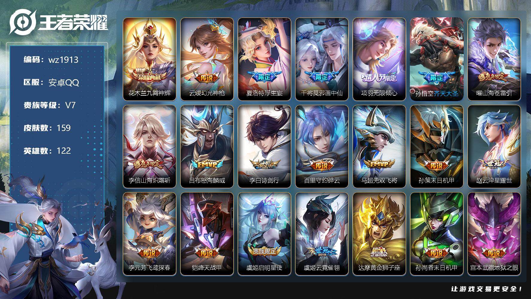【游戏多多】 【可二次实名】【wz1913】安卓Q-V7-最强王者段位-122英雄-159皮肤-1典藏-0珍品无双-0无双-0珍品传说-20传说-49史诗 【荣耀典藏】:花木兰九霄神辉 【传说皮肤】:云缨幻光神枪,夏洛特浮生妄,干将莫邪画中仙,项羽无限倾心,孙悟空齐天大圣,曜山海苍雷引,李信山海炽霜斩,吕布怒海麟威,李白诗剑行,百里守约碎云,马超无双飞将,孙策末日机甲,赵云淬星耀世,李元芳飞鸢探春,铠绛天战甲,虞姬启明星使,虞姬云霓雀翎,达摩黄金狮子座,孙尚香末日机甲,宫本武藏地狱之眼 【限定皮肤】:姜子牙天穹之誓,狄仁杰阴阳师,赵云皇家上将,赵云龙胆,庄周高山流水,孙膑天狼运算者,扁鹊奇幻香踪,吕布御风骁将,马可波罗山海玄木吟,狄仁杰魔术师,达摩沙漠行僧,项羽海滩派对,项羽无限倾心,兰陵王金庭之子,孙悟空齐天大圣,李元芳云中旅人,虞姬启明星使,杨戬潮玩骑兵,干将莫邪画中仙,黄忠烈魂,百里玄策原初追逐者,梦奇顽趣,沈梦溪大漠名商,沈梦溪匿光破解者,裴擒虎擒涛扼浪,李信山海炽霜斩,嫦娥暖冬兔眠,曜山海苍雷引,西施玲珑珍味,鲁班大师探海日志,桑启海盐诗旅,夏洛特浮生妄,暃星界游侠,戈娅驭风魔法,艾琳流音漫舞,司空震地狱燃心,阿古朵江河有灵,张良古海寻踪,蒙犽百解令,蒙恬荣光圣徽,鬼谷子天穹祈灯,姬小满妄想食味 【年限皮肤】:吕布御风骁将,黄忠烈魂,赵云龙胆,马可波罗山海玄木吟,李信山海炽霜斩,曜山海苍雷引 【赛季限定】:达摩沙漠行僧,兰陵王金庭之子,张良古海寻踪,李元芳云中旅人,百里玄策原初追逐者,梦奇顽趣,沈梦溪大漠名商,裴擒虎擒涛扼浪,鲁班大师探海日志,桑启海盐诗旅,鬼谷子天穹祈灯,蒙恬荣光圣徽,姜子牙天穹之誓 【战令限定】:扁鹊奇幻香踪,艾琳流音漫舞,杨戬潮玩骑兵,嫦娥暖冬兔眠,西施玲珑珍味,司空震地狱燃心,暃星界游侠,戈娅驭风魔法 【史诗皮肤】:鲁班七号电玩小子,赵云皇家上将,貂蝉圣诞恋歌,甄姬冰雪圆舞曲,王昭君偶像歌手,狄仁杰魔术师,廉颇地狱岩魂,宫本武藏鬼剑武藏,孙尚香水果甜心,妲己女仆咖啡,墨子龙骑士,墨子金属风暴,吕布圣诞狂欢,吕布末日机甲,张飞乱世虎臣,花木兰水晶猎龙者,刘邦德古拉伯爵,夏侯惇乘风破浪,小乔缤纷独角兽,兰陵王暗隐猎兽者,诸葛亮黄金分割率,铠曙光守护者,刘禅天才门将,白起星夜王子,阿轲节奏热浪,大乔猫狗日记,狄仁杰鹰眼统帅,小乔青蛇,赵云龙胆,黄忠烈魂,百里玄策原初追逐者,孙膑天狼运算者,吕布御风骁将,钟馗乐园奇幻夜,庄周高山流水,梦奇顽趣,暃星界游侠,马可波罗山海玄木吟,扁鹊奇幻香踪,沈梦溪匿光破解者,戈娅驭风魔法,司空震地狱燃心,阿古朵江河有灵,蒙犽百解令,蒙恬荣光圣徽,姬小满妄想食味,牛魔星界战将,狂铁龙之律动,黄忠百相守梦 【其他皮肤】:项羽海滩派对,韩信街头霸王,露娜哥特玫瑰,达摩大发明家,赵云白执事,赵云忍炎影,宫本武藏未来纪元,安琪拉玩偶对对碰,姜子牙时尚教父,妲己少女阿狸,典韦黄金武士,达摩拳王,花木兰兔女郎,后羿阿尔法小队,狄仁杰阴阳师,刘备汉昭烈帝,关羽龙腾万里,钟无艳海滩丽影,王昭君幻想奇妙夜,狂铁命运角斗场,诸葛亮掌控之力,李白敏锐之力,苏烈坚韧之力,小乔丁香结,吕布野性能量,刘禅秘密基地,鲁班大师乓乓大师,达摩沙漠行僧,程咬金无双福将,兰陵王金庭之子,米莱狄契约魔法,沈梦溪大漠名商,蒙犽胡桃狂想曲,李元芳云中旅人,桑启海盐诗旅,嫦娥暖冬兔眠,猪八戒潮玩探月行,牛魔牛运亨通,白起乐园追猎者,赵怀真太极少年,裴擒虎擒涛扼浪,杨戬潮玩骑兵,太乙真人劲辣红锅,鲁班大师探海日志,西施玲珑珍味,姬小满零食大作战,李元芳妄想特派,哪吒热血海滩,艾琳流音漫舞,张良古海寻踪,钟无艳聚星闪耀,兰陵王幻夜行动,曹操决胜大满贯,后羿完美运算,鬼谷子天穹祈灯,海诺时空谍影,朵莉亚金色潮汐,亚瑟鸿运当头,姜子牙天穹之誓,苍苍林狼骑,太乙真人谧流熔炉,典韦铁骨偃魂,西施雪境奇遇,姜子牙星梦巡礼,钟馗虚灵犬护,白起死霸装,甄姬逆浪荇歌,庄周锦麟游梦,莱西奥踏浪烽翎,鲁班七号福禄兄弟,钟无艳生化警戒,孙悟空西部大镖客,后羿精灵王,李元芳特种部队,刘邦圣殿之光,马可波罗激情绿茵,黄忠芝加哥教父,干将莫邪第七人偶,百里守约绝影神枪,米莱狄精准探案法,孙策海之征途,伽罗花见巫女,李信灼热之刃,瑶森,曜归虚梦演,司空震启蛰,金蝉前尘,暃碧珀绯影,桑启画中游 【营地ID】:1822733196