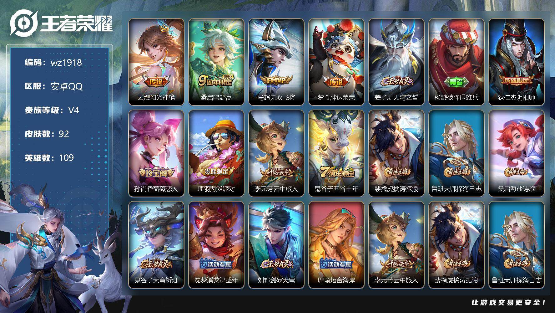 【游戏多多】 【可二次实名】【wz1918】安卓Q-V4-至尊星耀IV段位-109英雄-92皮肤-0典藏-0珍品无双-0无双-0珍品传说-4传说-19史诗 【传说皮肤】:云缨幻光神枪,桑启鸣野蒿,马超无双飞将,梦奇胖达荣荣 【限定皮肤】:姜子牙天穹之誓,杨戬破阵退雄兵,狄仁杰阴阳师,孙尚香蔷薇恋人,项羽海滩派对,李元芳云中旅人,鬼谷子五谷丰年,裴擒虎擒涛扼浪,鲁班大师探海日志,桑启海盐诗旅,鬼谷子天穹祈灯,沈梦溪龙舞盛年,刘邦剑破天穹,周瑜熔金海岸 【赛季限定】:李元芳云中旅人,裴擒虎擒涛扼浪,鲁班大师探海日志,桑启海盐诗旅,鬼谷子天穹祈灯,刘邦剑破天穹,姜子牙天穹之誓 【史诗皮肤】:赵云未来纪元,王昭君偶像歌手,宫本武藏鬼剑武藏,孙尚香蔷薇恋人,孙尚香水果甜心,妲己魅力维加斯,花木兰水晶猎龙者,小乔缤纷独角兽,雅典娜冰冠公主,百里守约特工魅影,孙策猫狗日记,大乔猫狗日记,狄仁杰鹰眼统帅,鬼谷子五谷丰年,马可波罗星界特工,阿轲化蝶舞,狂铁龙之律动,黄忠百相守梦,西施织梦人 【其他皮肤】:项羽海滩派对,韩信教廷特使,韩信街头霸王,露娜哥特玫瑰,赵云忍炎影,白起白色死神,妲己少女阿狸,典韦黄金武士,亚瑟死亡骑士,甄姬花好人间,刘备万事如意,狄仁杰阴阳师,关羽龙腾万里,孙尚香沉稳之力,诸葛亮掌控之力,李白敏锐之力,苏烈坚韧之力,明世隐虹云星官,小乔丁香结,吕布野性能量,哪吒次元突破,刘禅秘密基地,鲁班大师乓乓大师,李元芳云中旅人,桑启海盐诗旅,裴擒虎擒涛扼浪,莱西奥西部游侠,鲁班大师探海日志,姬小满零食大作战,鬼谷子天穹祈灯,朵莉亚金色潮汐,沈梦溪龙舞盛年,刘邦剑破天穹,杨戬破阵退雄兵,姜子牙天穹之誓,周瑜熔金海岸,东皇太一噬灭天穹,干将莫邪雾都夜雨,苍苍林狼骑,太乙真人谧流熔炉,典韦铁骨偃魂,西施雪境奇遇,明世隐景韶洛都,戈娅玫蓝誓约,刘备浪漫序章,钟馗虚灵犬护,苏烈春野闲踪,张良灵野札记,阿古朵布丁狗之约,露娜命运加冕,甄姬逆浪荇歌,鬼谷子克喵,狄仁杰锦衣卫,曹操超能战警,孙悟空西部大镖客,后羿精灵王,虞姬加勒比小姐,马可波罗激情绿茵,苍维京掠夺者,公孙离花间舞,裴擒虎街头旋风,李信灼热之刃,盘古创世神祝,马超幸存者,镜冰刃幻境,澜孤猎,司空震启蛰,云缨赤焰之缨,暃碧珀绯影 【内测皮肤】:孙尚香蔷薇恋人 【营地ID】:1687548173