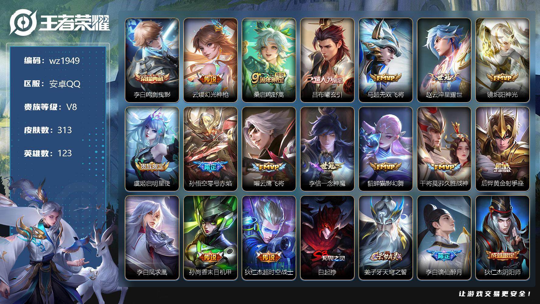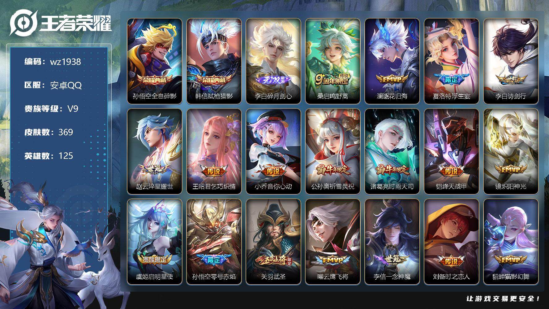 【游戏多多】 【可二次实名】【wz1938】安卓Q-V9-最强王者段位-125英雄-369皮肤-2典藏-0珍品无双-1无双-0珍品传说-27传说-115史诗 【英雄全皮】:阿轲全皮,钟馗全皮,鬼谷子全皮,猪八戒全皮,蒙恬全皮,戈娅全皮,空空儿全皮 【荣耀典藏】:孙悟空全息碎影,韩信弑枪猎影 【无双皮肤】:李白碎月剑心 【传说皮肤】:桑启鸣野蒿,澜逐花归海,夏洛特浮生妄,李白诗剑行,赵云淬星耀世,王昭君乞巧织情,小乔音你心动,公孙离祈雪灵祝,诸葛亮时雨天司,铠绛天战甲,镜炽阳神光,虞姬启明星使,孙悟空零号赤焰,关羽武圣,曜云鹰飞将,李信一念神魔,刘备时之恋人,貂蝉猫影幻舞,干将莫邪久胜战神,虞姬云霓雀翎,达摩黄金狮子座,百里玄策白虎志,花木兰冠军飞将,诸葛亮武陵仙君,宫本武藏地狱之眼,孙悟空地狱火,狄仁杰超时空战士 【限定皮肤】:白起狰,姜子牙天穹之誓,狄仁杰阴阳师,赵云皇家上将,赵云龙胆,妲己时之彼端,嬴政白昼王子,鲁班七号狮舞东方,庄周蜃楼王,庄周玄嵩,庄周高山流水,高渐离玩趣恶龙,阿轲迷踪丽影,孙膑妖精王,扁鹊炼金王,扁鹊奇幻香踪,芈月重明,芈月白晶晶,芈月幻夜卜梦,吕布猎兽之王,吕布御风骁将,周瑜赤莲之焰,元歌云间偶戏,元歌无心,夏侯惇朔风刀,甄姬幽恒,曹操烛龙,典韦穷奇,典韦蓝屏警告,马可波罗逐梦之星,马可波罗暗影游猎,狄仁杰魔术师,狄仁杰万华元夜,达摩星际陆战队,达摩沙漠行僧,项羽海滩派对,项羽霸王别姬,老夫子圣诞老人,老夫子醍醐杖,关羽冰锋战神,关羽武圣,程咬金演武夺筹,露娜一生所爱,刘邦夺宝奇兵,韩信飞衡,兰陵王驯魔猎人,兰陵王金庭之子,亚瑟潮玩骑士王,孙悟空至尊宝,孙悟空大圣娶亲,孙悟空零号赤焰,牛魔御旌,牛魔奔雷神使,后羿辉光之辰,李元芳银河之约,李元芳云中旅人,虞姬霸王别姬,虞姬启明星使,钟馗神迹守卫,钟馗驱傩正仪,杨玉环遇见飞天,杨戬潮玩骑兵,女娲朔望之晖,干将莫邪冰霜恋舞曲,雅典娜单词大作战,雅典娜黎明之约,蔡文姬繁星吟游,太乙真人饕餮,东皇太一逐梦之光,鬼谷子原初探秘者,鬼谷子五谷丰年,诸葛亮武陵仙君,诸葛亮时雨天司,黄忠烈魂,黄忠火炮绅士,苏烈千军破阵,百里玄策白虎志,百里玄策原初追逐者,百里守约朱雀志,弈星混沌棋,梦奇顽趣,公孙离祈雪灵祝,沈梦溪星空之诺,沈梦溪大漠名商,明世隐疑决卦,裴擒虎天狼狩猎者,裴擒虎李小龙,裴擒虎擒涛扼浪,狂铁御狮,米莱狄御霄,云中君纤云弄巧,云中君时之祈愿,盾山御銮,猪八戒西部大镖客,猪八戒猪悟能,上官婉儿梁祝,上官婉儿天狼绘梦者,西施玲珑珍味,蒙犽狂想玩偶喵,鲁班大师探海日志,桑启海盐诗旅,夏洛特浮生妄,戈娅驭风魔法,艾琳流音漫舞,司空震地狱燃心,阿古朵江河有灵,张良古海寻踪,蒙犽百解令,蒙恬荣光圣徽,高渐离燃音魔法,妲己灵卜魔法,鬼谷子天穹祈灯,李白碎月剑心,姬小满妄想食味,沈梦溪龙舞盛年,刘邦剑破天穹,周瑜熔金海岸 【年限皮肤】:百里玄策白虎志,百里守约朱雀志,后羿辉光之辰,公孙离祈雪灵祝,吕布御风骁将,牛魔奔雷神使,诸葛亮时雨天司,甄姬幽恒,韩信飞衡,庄周玄嵩,关羽武圣,黄忠烈魂,赵云龙胆 【赛季限定】:庄周蜃楼王,孙膑妖精王,扁鹊炼金王,白起狰,芈月重明,夏侯惇朔风刀,曹操烛龙,典韦穷奇,狄仁杰万华元夜,达摩沙漠行僧,老夫子醍醐杖,程咬金演武夺筹,兰陵王金庭之子,张良古海寻踪,牛魔御旌,李元芳云中旅人,钟馗驱傩正仪,雅典娜黎明之约,太乙真人饕餮,鬼谷子原初探秘者,苏烈千军破阵,百里玄策原初追逐者,弈星混沌棋,梦奇顽趣,沈梦溪大漠名商,明世隐疑决卦,裴擒虎擒涛扼浪,狂铁御狮,米莱狄御霄,盾山御銮,鲁班大师探海日志,桑启海盐诗旅,鬼谷子天穹祈灯,蒙恬荣光圣徽,刘邦剑破天穹,姜子牙天穹之誓 【战令限定】:嬴政白昼王子,鲁班七号狮舞东方,阿轲迷踪丽影,扁鹊奇幻香踪,芈月幻夜卜梦,吕布猎兽之王,周瑜赤莲之焰,元歌云间偶戏,典韦蓝屏警告,马可波罗暗影游猎,达摩星际陆战队,刘邦夺宝奇兵,兰陵王驯魔猎人,艾琳流音漫舞,亚瑟潮玩骑士王,李元芳银河之约,钟馗神迹守卫,杨戬潮玩骑兵,女娲朔望之晖,雅典娜单词大作战,黄忠火炮绅士,沈梦溪星空之诺,猪八戒西部大镖客,西施玲珑珍味,蒙犽狂想玩偶喵,司空震地狱燃心,戈娅驭风魔法,高渐离燃音魔法,妲己灵卜魔法 【史诗皮肤】:鲁班七号电玩小子,露娜紫霞仙子,阿轲暗夜猫娘,赵云皇家上将,赵云未来纪元,貂蝉圣诞恋歌,老夫子圣诞老人,甄姬冰雪圆舞曲,王昭君偶像歌手,狄仁杰魔术师,廉颇地狱岩魂,宫本武藏鬼剑武藏,孙尚香水果甜心,嬴政暗夜贵公子,嬴政摇滚巨星,妲己魅力维加斯,妲己女仆咖啡,墨子龙骑士,墨子金属风暴,吕布圣诞狂欢,曹操幽灵船长,李白千年之狐,吕布末日机甲,张飞乱世虎臣,项羽霸王别姬,虞姬霸王别姬,关羽冰锋战神,孙悟空至尊宝,花木兰水晶猎龙者,刘邦德古拉伯爵,夏侯惇