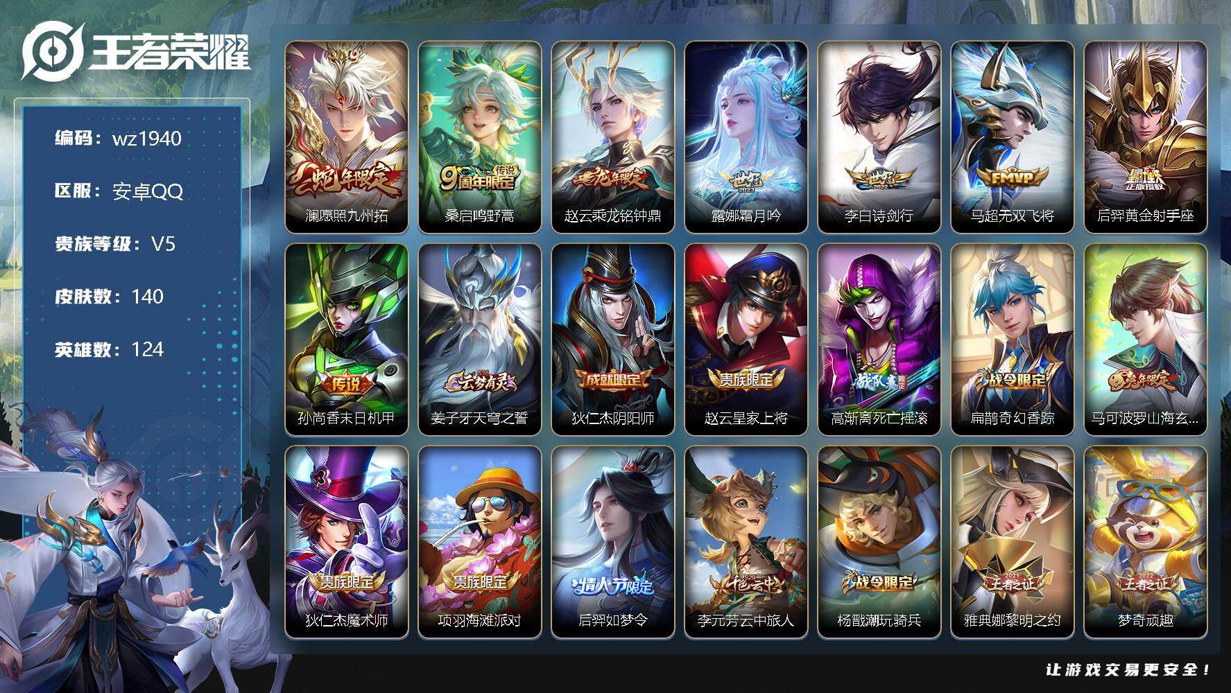 【游戏多多】 【可二次实名】【wz1940】安卓Q-V5-最强王者段位-124英雄-140皮肤-0典藏-0珍品无双-0无双-0珍品传说-8传说-39史诗 【英雄全皮】:影全皮 【传说皮肤】:澜愿照九州拓,桑启鸣野蒿,赵云乘龙铭钟鼎,露娜霜月吟,李白诗剑行,马超无双飞将,后羿黄金射手座,孙尚香末日机甲 【限定皮肤】:姜子牙天穹之誓,狄仁杰阴阳师,赵云皇家上将,高渐离死亡摇滚,扁鹊奇幻香踪,马可波罗山海玄木吟,狄仁杰魔术师,项羽海滩派对,后羿如梦令,李元芳云中旅人,杨戬潮玩骑兵,雅典娜黎明之约,梦奇顽趣,沈梦溪大漠名商,裴擒虎擒涛扼浪,嫦娥暖冬兔眠,西施玲珑珍味,鲁班大师探海日志,桑启海盐诗旅,暃星界游侠,戈娅驭风魔法,张良古海寻踪,蒙恬荣光圣徽,高渐离燃音魔法,妲己灵卜魔法,鬼谷子天穹祈灯,赵云乘龙铭钟鼎,沈梦溪龙舞盛年,李元芳蔬乡物语,刘邦剑破天穹 【年限皮肤】:马可波罗山海玄木吟,赵云乘龙铭钟鼎 【赛季限定】:张良古海寻踪,李元芳云中旅人,雅典娜黎明之约,梦奇顽趣,沈梦溪大漠名商,裴擒虎擒涛扼浪,鲁班大师探海日志,桑启海盐诗旅,鬼谷子天穹祈灯,蒙恬荣光圣徽,刘邦剑破天穹,姜子牙天穹之誓 【战令限定】:扁鹊奇幻香踪,杨戬潮玩骑兵,嫦娥暖冬兔眠,西施玲珑珍味,暃星界游侠,戈娅驭风魔法,高渐离燃音魔法,妲己灵卜魔法,李元芳蔬乡物语 【史诗皮肤】:鲁班七号电玩小子,赵云皇家上将,赵云未来纪元,貂蝉圣诞恋歌,甄姬冰雪圆舞曲,王昭君偶像歌手,狄仁杰魔术师,宫本武藏鬼剑武藏,孙尚香水果甜心,嬴政摇滚巨星,妲己魅力维加斯,妲己女仆咖啡,墨子金属风暴,吕布圣诞狂欢,张飞乱世虎臣,刘邦德古拉伯爵,小乔缤纷独角兽,兰陵王暗隐猎兽者,雅典娜冰冠公主,百里守约特工魅影,铠曙光守护者,白起星夜王子,阿轲节奏热浪,伽罗箭羽风息,狄仁杰鹰眼统帅,后羿如梦令,不知火舞魅语,雅典娜黎明之约,梦奇顽趣,暃星界游侠,马可波罗山海玄木吟,扁鹊奇幻香踪,刘禅电玩爆裂旋风,戈娅驭风魔法,妲己灵卜魔法,高渐离燃音魔法,蒙恬荣光圣徽,百里守约百相守梦,孙膑茶境仙,弈星万物之道 【其他皮肤】:项羽海滩派对,韩信教廷特使,韩信街头霸王,达摩大发明家,赵云忍炎影,白起白色死神,武则天东方不败,安琪拉玩偶对对碰,孙膑天使之翼,典韦黄金武士,亚瑟死亡骑士,达摩拳王,花木兰兔女郎,张飞五福同心,甄姬花好人间,后羿阿尔法小队,狄仁杰阴阳师,刘备纽约教父,高渐离死亡摇滚,关羽龙腾万里,钟无艳海滩丽影,老夫子功夫老勺,孙尚香沉稳之力,明世隐虹云星官,沈梦溪鲨炮海盗猫,哪吒次元突破,狂铁特工战影,露娜瓷语鉴心,鲁班大师乓乓大师,沈梦溪大漠名商,蒙恬蔚蓝守将,李元芳云中旅人,桑启海盐诗旅,嫦娥暖冬兔眠,海月幻泉雾影,猪八戒潮玩探月行,牛魔牛运亨通,裴擒虎擒涛扼浪,杨戬潮玩骑兵,太乙真人劲辣红锅,莱西奥西部游侠,鲁班大师探海日志,西施玲珑珍味,姬小满零食大作战,李元芳妄想特派,张良古海寻踪,亚连破局者,后羿完美运算,鬼谷子天穹祈灯,妲己灵卜魔法,廉颇功夫炙烤,沈梦溪龙舞盛年,钟无艳春野之旅,李元芳蔬乡物语,刘邦剑破天穹,姜子牙天穹之誓,东皇太一噬灭天穹,老夫子百相守梦,干将莫邪雾都夜雨,苍苍林狼骑,太乙真人谧流熔炉,典韦铁骨偃魂,马超访茗客,影魅影绮裳,西施雪境奇遇,姜子牙星梦巡礼,钟馗虚灵犬护,阿古朵布丁狗之约,露娜命运加冕,白起死霸装,甄姬逆浪荇歌,庄周锦麟游梦,莱西奥踏浪烽翎,鲁班七号木偶奇遇记,钟无艳生化警戒,狄仁杰锦衣卫,虞姬加勒比小姐,马可波罗激情绿茵,黄忠芝加哥教父,大乔伊势巫女,百里守约绝影神枪,女娲尼罗河女神,弈星踏雪寻梅,司马懿魇语军师,上官婉儿修竹墨客,嫦娥露花倒影,瑶森,西施归虚梦演,鲁班大师归虚梦演,蒙犽归虚梦演,阿古朵熊喵少女,澜孤猎,云缨赤焰之缨 【内测皮肤】:狂铁特工战影 【营地ID】:1700618588
