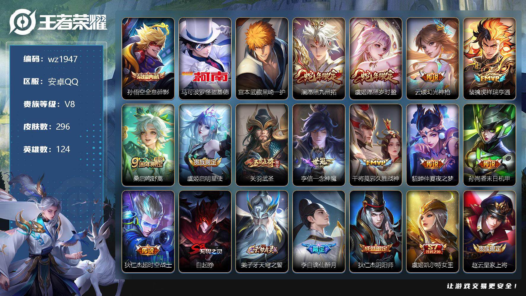 【游戏多多】 【可二次实名】【wz1947】安卓Q-V8-永恒钻石III段位-124英雄-296皮肤-1典藏-0珍品无双-0无双-2珍品传说-12传说-78史诗 【英雄全皮】:空空儿全皮,影全皮 【荣耀典藏】:孙悟空全息碎影 【珍品传说】:马可波罗怪盗基德,宫本武藏黑崎一护 【传说皮肤】:澜愿照九州拓,虞姬愿照岁时盈,云缨幻光神枪,裴擒虎祥瑞亨通,桑启鸣野蒿,虞姬启明星使,关羽武圣,李信一念神魔,干将莫邪久胜战神,貂蝉仲夏夜之梦,孙尚香末日机甲,狄仁杰超时空战士 【限定皮肤】:白起狰,姜子牙天穹之誓,李白谪仙醉月,狄仁杰阴阳师,虞姬凯尔特女王,赵云皇家上将,赵云龙胆,墨子降魔,嬴政白昼王子,孙尚香蔷薇恋人,鲁班七号狮舞东方,庄周蜃楼王,阿轲迷踪丽影,孙膑妖精王,扁鹊奇幻香踪,芈月重明,吕布猎兽之王,甄姬游园惊梦,曹操烛龙,典韦穷奇,马可波罗暗影游猎,马可波罗山海玄木吟,狄仁杰魔术师,达摩星际陆战队,达摩沙漠行僧,项羽海滩派对,老夫子醍醐杖,关羽武圣,程咬金演武夺筹,刘邦夺宝奇兵,韩信傲雪梅枪,兰陵王金庭之子,孙悟空至尊宝,牛魔御旌,李元芳银河之约,虞姬启明星使,钟馗神迹守卫,钟馗驱傩正仪,杨戬潮玩骑兵,太乙真人饕餮,鬼谷子原初探秘者,黄忠烈魂,铠青龙志,苏烈千军破阵,百里玄策原初追逐者,百里守约朱雀志,弈星混沌棋,沈梦溪大漠名商,明世隐疑决卦,裴擒虎李小龙,裴擒虎擒涛扼浪,狂铁御狮,米莱狄御霄,盾山御銮,猪八戒西部大镖客,嫦娥暖冬兔眠,鲁班大师探海日志,鬼谷子天穹祈灯 【年限皮肤】:百里守约朱雀志,铠青龙志,关羽武圣,黄忠烈魂,赵云龙胆,马可波罗山海玄木吟 【赛季限定】:庄周蜃楼王,孙膑妖精王,白起狰,芈月重明,曹操烛龙,典韦穷奇,达摩沙漠行僧,老夫子醍醐杖,程咬金演武夺筹,兰陵王金庭之子,牛魔御旌,虞姬凯尔特女王,钟馗驱傩正仪,太乙真人饕餮,鬼谷子原初探秘者,苏烈千军破阵,百里玄策原初追逐者,弈星混沌棋,沈梦溪大漠名商,明世隐疑决卦,裴擒虎擒涛扼浪,狂铁御狮,米莱狄御霄,盾山御銮,鲁班大师探海日志,鬼谷子天穹祈灯,姜子牙天穹之誓 【战令限定】:嬴政白昼王子,鲁班七号狮舞东方,阿轲迷踪丽影,扁鹊奇幻香踪,吕布猎兽之王,马可波罗暗影游猎,达摩星际陆战队,刘邦夺宝奇兵,李元芳银河之约,钟馗神迹守卫,杨戬潮玩骑兵,猪八戒西部大镖客,嫦娥暖冬兔眠 【史诗皮肤】:鲁班七号电玩小子,露娜紫霞仙子,赵云皇家上将,赵云未来纪元,貂蝉圣诞恋歌,甄姬冰雪圆舞曲,王昭君偶像歌手,狄仁杰魔术师,廉颇地狱岩魂,宫本武藏鬼剑武藏,孙尚香蔷薇恋人,孙尚香水果甜心,嬴政暗夜贵公子,嬴政摇滚巨星,妲己魅力维加斯,墨子龙骑士,墨子金属风暴,吕布圣诞狂欢,刘禅绅士熊喵,曹操幽灵船长,李白千年之狐,吕布末日机甲,张飞乱世虎臣,韩信白龙吟,孙悟空至尊宝,花木兰水晶猎龙者,夏侯惇乘风破浪,小乔缤纷独角兽,兰陵王暗隐猎兽者,诸葛亮黄金分割率,甄姬游园惊梦,亚瑟心灵战警,安琪拉心灵骇客,百里守约特工魅影,铠曙光守护者,李元芳逐浪之夏,程咬金功夫厨神,白起星夜王子,阿轲节奏热浪,嬴政白昼王子,孙策猫狗日记,铠青龙志,百里守约朱雀志,伽罗箭羽风息,鲁班七号狮舞东方,狄仁杰鹰眼统帅,公孙离无限星赏官,李元芳银河之约,娜可露露晚萤,不知火舞魅语,阿轲迷踪丽影,橘右京修罗,赵云龙胆,黄忠烈魂,孙尚香时之恋人,马可波罗暗影游猎,百里玄策原初追逐者,裴擒虎李小龙,杨戬天秀启明,韩信傲雪梅枪,澜赏金猎手,艾琳奇遇舞章,墨子降魔,马可波罗山海玄木吟,扁鹊奇幻香踪,亚连破空之剑,李白谪仙醉月,百里守约百相守梦,孙膑茶境仙,白起苍鳞隐世,赵怀真器灵浮梦炉,亚连糖绘人间,阿轲化蝶舞,刘禅鸭鸭历险记,狂铁龙之律动,扁鹊灵蛊蚀心,周瑜百相守梦,黄忠百相守梦 【其他皮肤】:项羽海滩派对,韩信教廷特使,韩信街头霸王,露娜哥特玫瑰,阿轲致命风华,赵云白执事,赵云忍炎影,芈月红桃皇后,白起白色死神,扁鹊化身博士,宫本武藏未来纪元,安琪拉玩偶对对碰,孙膑天使之翼,姜子牙时尚教父,妲己少女阿狸,典韦黄金武士,亚瑟死亡骑士,花木兰兔女郎,张飞五福同心,甄姬花好人间,刘备万事如意,宫本武藏万象初新,狄仁杰阴阳师,庄周蜃楼王,刘备纽约教父,孙膑妖精王,刘备汉昭烈帝,李元芳黑猫爱糖果,关羽龙腾万里,虞姬凯尔特女王,墨子进击墨子号,白起狰,钟无艳海滩丽影,太乙真人饕餮,宫本武藏霸王丸,曹操烛龙,王昭君幻想奇妙夜,芈月重明,狂铁命运角斗场,老夫子功夫老勺,孙尚香沉稳之力,典韦穷奇,李白敏锐之力,鬼谷子幻乐之宴,狂铁御狮,安琪拉如懿,苏烈坚韧之力,项羽科学大爆炸,米莱狄御霄,吕布猎兽之王,明世隐虹云星官,牛魔御旌,小乔丁香结,吕布野性能量,钟馗神迹守卫,盾山御銮,孙膑归虚梦演,沈梦溪鲨炮海盗猫,弈星混沌棋,哪吒次元突破,明世隐疑决卦,刘邦夺宝奇兵,盾