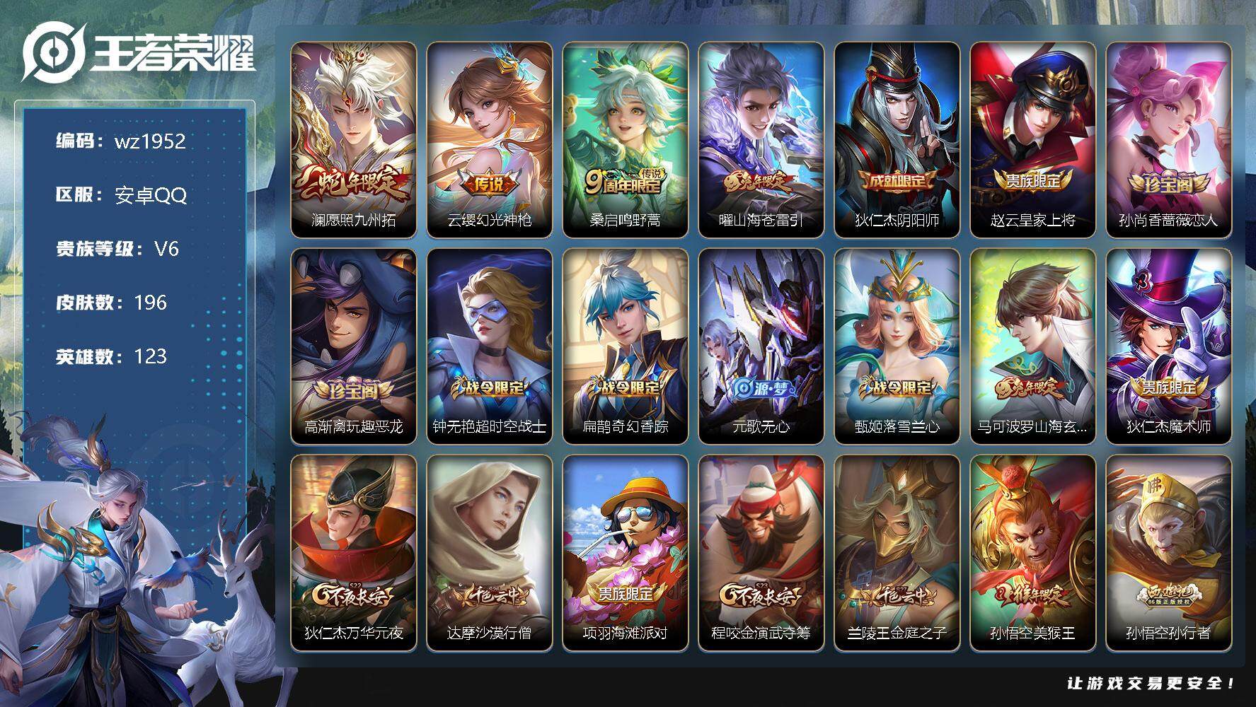 【游戏多多】 【可二次实名】【wz1952】安卓Q-V6-永恒钻石II段位-123英雄-196皮肤-0典藏-0珍品无双-0无双-0珍品传说-4传说-43史诗 【英雄全皮】:蒙恬全皮 【传说皮肤】:澜愿照九州拓,云缨幻光神枪,桑启鸣野蒿,曜山海苍雷引 【限定皮肤】:狄仁杰阴阳师,赵云皇家上将,孙尚香蔷薇恋人,高渐离玩趣恶龙,钟无艳超时空战士,扁鹊奇幻香踪,元歌无心,甄姬落雪兰心,马可波罗山海玄木吟,狄仁杰魔术师,狄仁杰万华元夜,达摩沙漠行僧,项羽海滩派对,程咬金演武夺筹,兰陵王金庭之子,孙悟空美猴王,孙悟空孙行者,李元芳云中旅人,钟馗驱傩正仪,杨戬潮玩骑兵,太乙真人华丽摇滚,鬼谷子五谷丰年,苏烈千军破阵,百里玄策原初追逐者,梦奇顽趣,沈梦溪大漠名商,裴擒虎擒涛扼浪,上官婉儿梁祝,嫦娥拒霜思,嫦娥暖冬兔眠,曜山海苍雷引,西施玲珑珍味,鲁班大师探海日志,桑启海盐诗旅,暃星界游侠,戈娅驭风魔法,阿古朵江河有灵,张良古海寻踪,蒙恬荣光圣徽,鬼谷子天穹祈灯,刘邦剑破天穹,程咬金群星魔术团 【年限皮肤】:孙悟空美猴王,马可波罗山海玄木吟,曜山海苍雷引 【赛季限定】:狄仁杰万华元夜,达摩沙漠行僧,程咬金演武夺筹,兰陵王金庭之子,张良古海寻踪,李元芳云中旅人,钟馗驱傩正仪,苏烈千军破阵,百里玄策原初追逐者,梦奇顽趣,沈梦溪大漠名商,裴擒虎擒涛扼浪,鲁班大师探海日志,桑启海盐诗旅,鬼谷子天穹祈灯,蒙恬荣光圣徽,刘邦剑破天穹 【战令限定】:钟无艳超时空战士,扁鹊奇幻香踪,甄姬落雪兰心,杨戬潮玩骑兵,嫦娥暖冬兔眠,西施玲珑珍味,暃星界游侠,戈娅驭风魔法 【史诗皮肤】:露娜紫霞仙子,赵云皇家上将,甄姬冰雪圆舞曲,王昭君偶像歌手,狄仁杰魔术师,宫本武藏鬼剑武藏,孙尚香蔷薇恋人,孙尚香水果甜心,嬴政暗夜贵公子,嬴政摇滚巨星,妲己女仆咖啡,墨子金属风暴,刘禅绅士熊喵,曹操幽灵船长,李白千年之狐,吕布末日机甲,花木兰水晶猎龙者,刘邦德古拉伯爵,小乔缤纷独角兽,雅典娜冰冠公主,安琪拉心灵骇客,李元芳逐浪之夏,白起星夜王子,阿轲节奏热浪,狄仁杰鹰眼统帅,上官婉儿梁祝,百里玄策原初追逐者,孙悟空孙行者,嫦娥拒霜思,钟无艳超时空战士,鬼谷子五谷丰年,元歌无心,梦奇顽趣,暃星界游侠,马可波罗山海玄木吟,扁鹊奇幻香踪,刘禅电玩爆裂旋风,戈娅驭风魔法,阿古朵江河有灵,蒙恬荣光圣徽,孙膑茶境仙,狂铁龙之律动,黄忠百相守梦 【其他皮肤】:项羽海滩派对,韩信教廷特使,韩信街头霸王,阿轲致命风华,阿轲爱心护理,赵云白执事,赵云忍炎影,芈月红桃皇后,白起白色死神,牛魔西部大镖客,扁鹊化身博士,宫本武藏未来纪元,安琪拉玩偶对对碰,孙膑天使之翼,妲己少女阿狸,典韦黄金武士,亚瑟死亡骑士,达摩拳王,孙悟空美猴王,花木兰兔女郎,张飞五福同心,刘备万事如意,狄仁杰阴阳师,刘备纽约教父,刘备汉昭烈帝,关羽龙腾万里,墨子进击墨子号,钟无艳海滩丽影,宫本武藏霸王丸,老夫子功夫老勺,孙尚香沉稳之力,诸葛亮掌控之力,李白敏锐之力,鬼谷子幻乐之宴,太乙真人华丽摇滚,苏烈坚韧之力,大乔守护之力,明世隐虹云星官,小乔丁香结,孙膑归虚梦演,高渐离玩趣恶龙,沈梦溪鲨炮海盗猫,姜子牙炽热元素使,哪吒次元突破,盾山圆桌骑士,狂铁特工战影,狄仁杰万华元夜,刘禅秘密基地,程咬金演武夺筹,张良缤纷绘卷,钟馗驱傩正仪,鲁班大师乓乓大师,苏烈千军破阵,典韦铁甲之心,马可波罗潮玩牛仔,达摩沙漠行僧,程咬金无双福将,兰陵王金庭之子,沈梦溪大漠名商,蒙恬蔚蓝守将,甄姬落雪兰心,李元芳云中旅人,刘备潮玩造梦师,桑启海盐诗旅,嫦娥暖冬兔眠,猪八戒潮玩探月行,白起乐园追猎者,赵怀真太极少年,裴擒虎擒涛扼浪,杨戬潮玩骑兵,太乙真人劲辣红锅,鲁班大师探海日志,西施玲珑珍味,姬小满零食大作战,李元芳妄想特派,哪吒热血海滩,张良古海寻踪,钟无艳聚星闪耀,后羿完美运算,鬼谷子天穹祈灯,海诺时空谍影,廉颇功夫炙烤,钟无艳春野之旅,刘邦剑破天穹,程咬金群星魔术团,大司命暗都幽影,东皇太一噬灭天穹,苍苍林狼骑,太乙真人谧流熔炉,典韦铁骨偃魂,马超访茗客,西施雪境奇遇,姜子牙星梦巡礼,东皇太一金福满堂,达摩爆裂喵拳,少司缘灵卦秘语,明世隐景韶洛都,戈娅玫蓝誓约,刘备浪漫序章,钟馗虚灵犬护,张良灵野札记,阿古朵布丁狗之约,露娜命运加冕,白起死霸装,甄姬逆浪荇歌,云中君云械蓝图,庄周锦麟游梦,莱西奥踏浪烽翎,鲁班七号福禄兄弟,鲁班七号木偶奇遇记,高渐离金属狂潮,项羽帝国元帅,露娜绯红之刃,貂蝉异域舞娘,老夫子潮流仙人,狄仁杰锦衣卫,孙膑未来旅行,孙悟空西部大镖客,周瑜海军大将,后羿精灵王,刘禅英喵野望,李白范海辛,钟馗地府判官,李元芳特种部队,马可波罗激情绿茵,苍维京掠夺者,杨戬埃及法老,黄忠芝加哥教父,大乔伊势巫女,鬼谷子阿摩司公爵,铠龙域领主,百里守约绝影神枪,百里玄策威尼斯狂欢