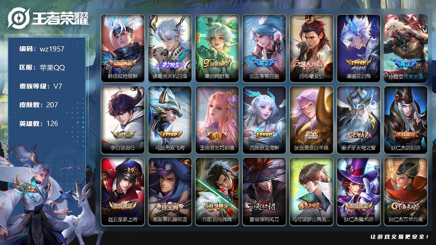 【游戏多多】 【可二次实名】【wz1957】苹果Q-V7-永恒钻石I段位-126英雄-207皮肤-1典藏-0珍品无双-1无双-0珍品传说-10传说-55史诗 【英雄全皮】:蒙恬全皮 【荣耀典藏】:韩信弑枪猎影 【无双皮肤】:诸葛亮天机白泽 【传说皮肤】:桑启鸣野蒿,亚连落雪白狼,吕布曦玄引,澜逐花归海,孙悟空齐天大圣,李白诗剑行,马超无双飞将,王昭君乞巧织情,西施游龙清影,张良黄金白羊座 【限定皮肤】:姜子牙天穹之誓,狄仁杰阴阳师,赵云皇家上将,高渐离玩趣恶龙,元歌云间偶戏,夏侯惇朔风刀,马可波罗山海玄木吟,狄仁杰魔术师,狄仁杰万华元夜,达摩沙漠行僧,项羽海滩派对,老夫子醍醐杖,程咬金演武夺筹,兰陵王金庭之子,孙悟空至尊宝,孙悟空齐天大圣,后羿圣弓游侠,钟馗神迹守卫,钟馗驱傩正仪,干将莫邪胡桃夹子,鬼谷子原初探秘者,苏烈千军破阵,百里玄策原初追逐者,弈星混沌棋,明世隐疑决卦,裴擒虎李小龙,裴擒虎擒涛扼浪,云中君纤云弄巧,盾山御銮,上官婉儿梁祝,嫦娥拒霜思,西施玲珑珍味,鲁班大师探海日志,桑启海盐诗旅,艾琳流音漫舞,司空震地狱燃心,阿古朵江河有灵,张良古海寻踪,蒙犽百解令,蒙恬荣光圣徽,鬼谷子天穹祈灯,吕布曦玄引,百里玄策超元猎域,亚连落雪白狼,沈梦溪龙舞盛年,刘邦剑破天穹,程咬金群星魔术团,关羽决胜骁骑,镜青焰无极,项羽苍威无极,周瑜熔金海岸 【年限皮肤】:马可波罗山海玄木吟 【赛季限定】:夏侯惇朔风刀,狄仁杰万华元夜,达摩沙漠行僧,老夫子醍醐杖,程咬金演武夺筹,兰陵王金庭之子,张良古海寻踪,钟馗驱傩正仪,鬼谷子原初探秘者,苏烈千军破阵,百里玄策原初追逐者,弈星混沌棋,明世隐疑决卦,裴擒虎擒涛扼浪,盾山御銮,鲁班大师探海日志,桑启海盐诗旅,鬼谷子天穹祈灯,蒙恬荣光圣徽,刘邦剑破天穹,姜子牙天穹之誓 【战令限定】:元歌云间偶戏,艾琳流音漫舞,后羿圣弓游侠,钟馗神迹守卫,西施玲珑珍味,司空震地狱燃心,镜青焰无极,项羽苍威无极 【史诗皮肤】:项羽苍穹之光,露娜紫霞仙子,赵云皇家上将,赵云未来纪元,貂蝉圣诞恋歌,甄姬冰雪圆舞曲,狄仁杰魔术师,廉颇地狱岩魂,宫本武藏鬼剑武藏,孙尚香水果甜心,嬴政摇滚巨星,妲己魅力维加斯,妲己女仆咖啡,墨子金属风暴,吕布圣诞狂欢,刘禅绅士熊喵,曹操幽灵船长,李白千年之狐,吕布末日机甲,孙悟空至尊宝,刘邦德古拉伯爵,夏侯惇乘风破浪,兰陵王暗隐猎兽者,李元芳逐浪之夏,程咬金功夫厨神,白起星夜王子,阿轲节奏热浪,孙策猫狗日记,狄仁杰鹰眼统帅,上官婉儿梁祝,娜可露露晚萤,不知火舞魅语,百里玄策原初追逐者,裴擒虎李小龙,云中君纤云弄巧,元歌云间偶戏,杨戬天秀启明,嫦娥拒霜思,马可波罗山海玄木吟,刘禅电玩爆裂旋风,司空震地狱燃心,阿古朵江河有灵,蒙犽百解令,蒙恬荣光圣徽,百里玄策超元猎域,镜青焰无极,关羽决胜骁骑,黄忠怒海争锋,阿轲化蝶舞,刘禅鸭鸭历险记,狂铁龙之律动,后羿石田雨龙,周瑜百相守梦,黄忠百相守梦,西施织梦人 【其他皮肤】:项羽海滩派对,韩信教廷特使,韩信街头霸王,露娜哥特玫瑰,阿轲爱心护理,达摩大发明家,赵云白执事,赵云忍炎影,芈月红桃皇后,程咬金星际陆战队,白起白色死神,牛魔西部大镖客,武则天东方不败,扁鹊化身博士,安琪拉玩偶对对碰,孙膑天使之翼,妲己少女阿狸,典韦黄金武士,亚瑟死亡骑士,达摩拳王,花木兰兔女郎,张飞五福同心,刘备万事如意,宫本武藏万象初新,狄仁杰阴阳师,刘备纽约教父,刘备汉昭烈帝,关羽龙腾万里,钟无艳海滩丽影,宫本武藏霸王丸,狂铁命运角斗场,老夫子功夫老勺,孙尚香沉稳之力,诸葛亮掌控之力,鬼谷子幻乐之宴,苏烈坚韧之力,明世隐虹云星官,小乔丁香结,钟馗神迹守卫,盾山御銮,孙膑归虚梦演,高渐离玩趣恶龙,沈梦溪鲨炮海盗猫,姜子牙炽热元素使,夏侯惇朔风刀,弈星混沌棋,哪吒次元突破,明世隐疑决卦,盾山圆桌骑士,老夫子醍醐杖,狂铁特工战影,鬼谷子原初探秘者,狄仁杰万华元夜,刘禅秘密基地,杨戬次元傲视,程咬金演武夺筹,钟馗驱傩正仪,鲁班大师乓乓大师,苏烈千军破阵,后羿圣弓游侠,典韦铁甲之心,干将莫邪胡桃夹子,达摩沙漠行僧,程咬金无双福将,兰陵王金庭之子,蒙恬蔚蓝守将,桑启海盐诗旅,猪八戒潮玩探月行,赵怀真太极少年,裴擒虎擒涛扼浪,太乙真人劲辣红锅,鲁班大师探海日志,西施玲珑珍味,姬小满零食大作战,李元芳妄想特派,哪吒热血海滩,艾琳流音漫舞,张良古海寻踪,钟无艳聚星闪耀,亚连破局者,曹操决胜大满贯,鬼谷子天穹祈灯,海诺时空谍影,廉颇功夫炙烤,亚瑟鸿运当头,沈梦溪龙舞盛年,刘邦剑破天穹,盘古经纬探寻者,程咬金群星魔术团,项羽苍威无极,大司命暗都幽影,姜子牙天穹之誓,周瑜熔金海岸,米莱狄怪诞之夜,太乙真人谧流熔炉,姜子牙星梦巡礼,明世隐景韶洛都,戈娅玫蓝誓约,刘备浪漫序章,钟馗虚灵犬护,沈梦溪鸭鸭历险记,苏烈春野闲踪,张良灵野