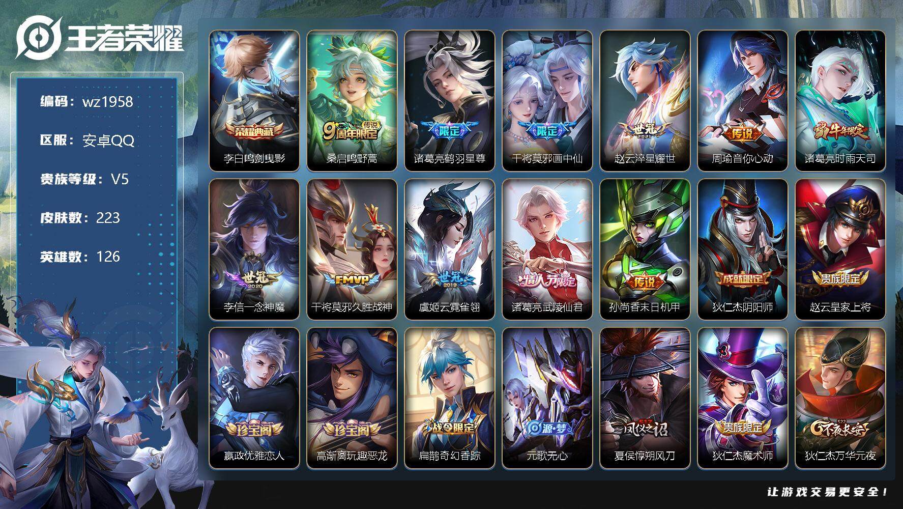 【游戏多多】 【可二次实名】【wz1958】安卓Q-V5-永恒钻石IV段位-126英雄-223皮肤-1典藏-0珍品无双-0无双-0珍品传说-11传说-65史诗 【英雄全皮】:空空儿全皮 【荣耀典藏】:李白鸣剑曳影 【传说皮肤】:桑启鸣野蒿,诸葛亮鹤羽星尊,干将莫邪画中仙,赵云淬星耀世,周瑜音你心动,诸葛亮时雨天司,李信一念神魔,干将莫邪久胜战神,虞姬云霓雀翎,诸葛亮武陵仙君,孙尚香末日机甲 【限定皮肤】:狄仁杰阴阳师,赵云皇家上将,嬴政优雅恋人,高渐离玩趣恶龙,扁鹊奇幻香踪,元歌无心,夏侯惇朔风刀,狄仁杰魔术师,狄仁杰万华元夜,达摩沙漠行僧,项羽海滩派对,老夫子醍醐杖,程咬金演武夺筹,韩信傲雪梅枪,兰陵王金庭之子,孙悟空至尊宝,牛魔御旌,李元芳云中旅人,钟馗驱傩正仪,杨戬潮玩骑兵,干将莫邪胡桃夹子,干将莫邪画中仙,雅典娜单词大作战,蔡文姬繁星吟游,鬼谷子原初探秘者,鬼谷子五谷丰年,诸葛亮武陵仙君,诸葛亮时雨天司,诸葛亮鹤羽星尊,苏烈千军破阵,百里守约朱雀志,弈星混沌棋,梦奇顽趣,沈梦溪大漠名商,明世隐疑决卦,裴擒虎李小龙,裴擒虎擒涛扼浪,云中君纤云弄巧,上官婉儿梁祝,上官婉儿神器万象笔,嫦娥拒霜思,嫦娥暖冬兔眠,鲁班大师探海日志,桑启海盐诗旅,暃星界游侠,艾琳流音漫舞,司空震地狱燃心,阿古朵江河有灵,张良古海寻踪,蒙犽百解令,蒙恬荣光圣徽,高渐离燃音魔法,妲己灵卜魔法,鬼谷子天穹祈灯,伽罗琥珀纪元,鲁班七号蔬乡物语,刘邦剑破天穹,程咬金群星魔术团,周瑜熔金海岸 【年限皮肤】:百里守约朱雀志,诸葛亮时雨天司 【赛季限定】:夏侯惇朔风刀,狄仁杰万华元夜,达摩沙漠行僧,老夫子醍醐杖,程咬金演武夺筹,兰陵王金庭之子,张良古海寻踪,牛魔御旌,李元芳云中旅人,钟馗驱傩正仪,鬼谷子原初探秘者,苏烈千军破阵,弈星混沌棋,梦奇顽趣,沈梦溪大漠名商,明世隐疑决卦,裴擒虎擒涛扼浪,鲁班大师探海日志,桑启海盐诗旅,鬼谷子天穹祈灯,蒙恬荣光圣徽,刘邦剑破天穹 【战令限定】:扁鹊奇幻香踪,艾琳流音漫舞,杨戬潮玩骑兵,雅典娜单词大作战,嫦娥暖冬兔眠,司空震地狱燃心,暃星界游侠,高渐离燃音魔法,妲己灵卜魔法,鲁班七号蔬乡物语 【史诗皮肤】:鲁班七号电玩小子,赵云皇家上将,赵云未来纪元,貂蝉圣诞恋歌,甄姬冰雪圆舞曲,王昭君偶像歌手,狄仁杰魔术师,廉颇地狱岩魂,宫本武藏鬼剑武藏,孙尚香水果甜心,嬴政优雅恋人,嬴政暗夜贵公子,妲己魅力维加斯,妲己女仆咖啡,墨子金属风暴,吕布圣诞狂欢,李白千年之狐,韩信白龙吟,孙悟空至尊宝,花木兰水晶猎龙者,刘邦德古拉伯爵,夏侯惇乘风破浪,小乔缤纷独角兽,兰陵王暗隐猎兽者,诸葛亮黄金分割率,亚瑟心灵战警,百里守约特工魅影,铠曙光守护者,李元芳逐浪之夏,程咬金功夫厨神,白起星夜王子,阿轲节奏热浪,孙策猫狗日记,百里守约朱雀志,狄仁杰鹰眼统帅,上官婉儿梁祝,蔡文姬繁星吟游,不知火舞魅语,裴擒虎李小龙,云中君纤云弄巧,百里玄策热力回旋,司马懿暗渊魔法,嫦娥拒霜思,韩信傲雪梅枪,夏洛特永昼,张良千筹问战,鬼谷子五谷丰年,上官婉儿神器万象笔,元歌无心,梦奇顽趣,暃星界游侠,扁鹊奇幻香踪,海月浮梦罗烟,司空震地狱燃心,阿古朵江河有灵,蒙犽百解令,妲己灵卜魔法,高渐离燃音魔法,蒙恬荣光圣徽,伽罗琥珀纪元,鲁班七号蔬乡物语,黄忠怒海争锋,孙膑茶境仙,阿轲化蝶舞,刘禅鸭鸭历险记,狂铁龙之律动 【其他皮肤】:项羽海滩派对,韩信教廷特使,韩信街头霸王,露娜哥特玫瑰,达摩大发明家,赵云忍炎影,扁鹊化身博士,宫本武藏未来纪元,妲己少女阿狸,典韦黄金武士,亚瑟死亡骑士,达摩拳王,花木兰兔女郎,张飞五福同心,甄姬花好人间,刘备万事如意,宫本武藏万象初新,狄仁杰阴阳师,墨子进击墨子号,钟无艳海滩丽影,宫本武藏霸王丸,王昭君幻想奇妙夜,狂铁命运角斗场,老夫子功夫老勺,诸葛亮掌控之力,鬼谷子幻乐之宴,苏烈坚韧之力,大乔守护之力,明世隐虹云星官,庄周奇妙博物学,牛魔御旌,吕布野性能量,孙膑归虚梦演,高渐离玩趣恶龙,沈梦溪鲨炮海盗猫,姜子牙炽热元素使,夏侯惇朔风刀,弈星混沌棋,哪吒次元突破,明世隐疑决卦,盾山圆桌骑士,老夫子醍醐杖,狂铁特工战影,鬼谷子原初探秘者,雅典娜单词大作战,狄仁杰万华元夜,刘禅秘密基地,杨戬次元傲视,程咬金演武夺筹,张良缤纷绘卷,盘古重装意志,钟馗驱傩正仪,鲁班大师乓乓大师,苏烈千军破阵,妲己紫罗兰之誓,干将莫邪胡桃夹子,马可波罗潮玩牛仔,达摩沙漠行僧,程咬金无双福将,刘邦虎啸剑宗,兰陵王金庭之子,刘禅唤灵魔甲,米莱狄契约魔法,沈梦溪大漠名商,蒙犽胡桃狂想曲,蒙恬蔚蓝守将,李元芳云中旅人,刘备潮玩造梦师,桑启海盐诗旅,嫦娥暖冬兔眠,海月幻泉雾影,猪八戒潮玩探月行,牛魔牛运亨通,白起乐园追猎者,赵怀真太极少年,裴擒虎擒涛扼浪,杨戬潮玩骑兵,太乙真人劲辣红锅,鲁班大师探海日志