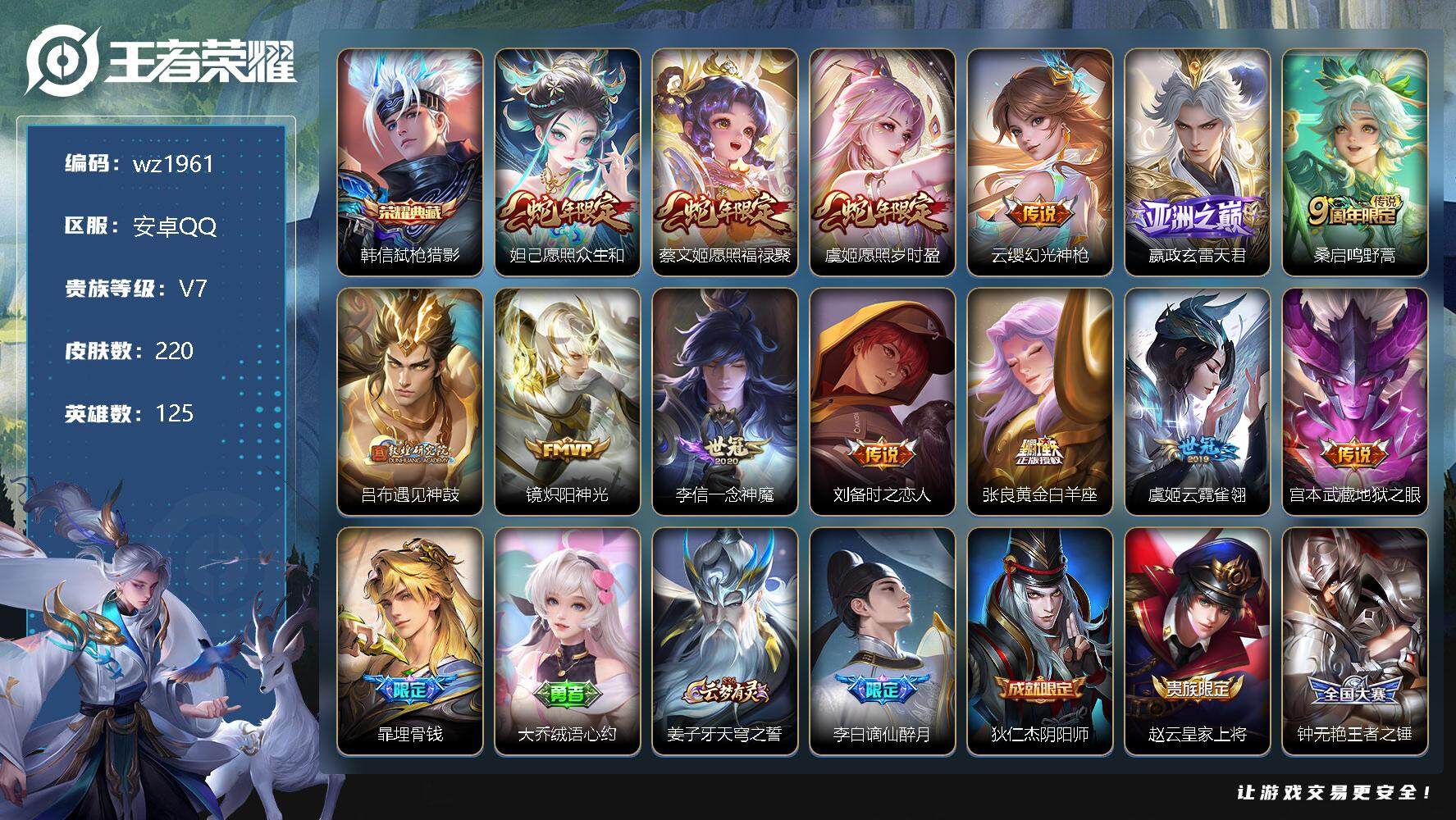 【游戏多多】 【可二次实名】【wz1961】安卓Q-V7-荣耀黄金II段位-125英雄-220皮肤-1典藏-0珍品无双-0无双-0珍品传说-13传说-66史诗 【英雄全皮】:蒙恬全皮,影全皮 【荣耀典藏】:韩信弑枪猎影 【传说皮肤】:妲己愿照众生和,蔡文姬愿照福禄聚,虞姬愿照岁时盈,云缨幻光神枪,嬴政玄雷天君,桑启鸣野蒿,吕布遇见神鼓,镜炽阳神光,李信一念神魔,刘备时之恋人,张良黄金白羊座,虞姬云霓雀翎,宫本武藏地狱之眼 【限定皮肤】:暃埋骨钱,大乔绒语心约,姜子牙天穹之誓,李白谪仙醉月,狄仁杰阴阳师,赵云皇家上将,钟无艳王者之锤,扁鹊奇幻香踪,吕布遇见神鼓,典韦蓝屏警告,狄仁杰魔术师,狄仁杰万华元夜,项羽海滩派对,老夫子航海奇遇记,孙悟空美猴王,孙悟空孙行者,李元芳银河之约,李元芳云中旅人,钟馗驱傩正仪,杨戬潮玩骑兵,鬼谷子原初探秘者,苏烈千军破阵,沈梦溪大漠名商,沈梦溪匿光破解者,裴擒虎李小龙,裴擒虎擒涛扼浪,云中君纤云弄巧,嫦娥拒霜思,嫦娥暖冬兔眠,西施玲珑珍味,鲁班大师探海日志,桑启海盐诗旅,暃星界游侠,戈娅驭风魔法,艾琳流音漫舞,司空震地狱燃心,阿古朵江河有灵,张良古海寻踪,蒙犽百解令,蒙恬荣光圣徽,高渐离燃音魔法,妲己灵卜魔法,鬼谷子天穹祈灯,伽罗琥珀纪元,姬小满妄想食味,沈梦溪龙舞盛年,鲁班七号蔬乡物语,李元芳蔬乡物语,刘邦剑破天穹,程咬金群星魔术团,关羽决胜骁骑,镜青焰无极,项羽苍威无极,周瑜熔金海岸 【年限皮肤】:孙悟空美猴王 【赛季限定】:狄仁杰万华元夜,张良古海寻踪,李元芳云中旅人,钟馗驱傩正仪,鬼谷子原初探秘者,苏烈千军破阵,沈梦溪大漠名商,裴擒虎擒涛扼浪,鲁班大师探海日志,桑启海盐诗旅,鬼谷子天穹祈灯,蒙恬荣光圣徽,刘邦剑破天穹,姜子牙天穹之誓 【战令限定】:扁鹊奇幻香踪,典韦蓝屏警告,老夫子航海奇遇记,艾琳流音漫舞,李元芳银河之约,杨戬潮玩骑兵,嫦娥暖冬兔眠,西施玲珑珍味,司空震地狱燃心,暃星界游侠,戈娅驭风魔法,高渐离燃音魔法,妲己灵卜魔法,鲁班七号蔬乡物语,李元芳蔬乡物语,镜青焰无极,项羽苍威无极 【史诗皮肤】:露娜紫霞仙子,钟无艳王者之锤,赵云皇家上将,貂蝉圣诞恋歌,甄姬冰雪圆舞曲,王昭君偶像歌手,狄仁杰魔术师,廉颇地狱岩魂,宫本武藏鬼剑武藏,孙尚香水果甜心,嬴政摇滚巨星,妲己魅力维加斯,妲己女仆咖啡,墨子金属风暴,吕布圣诞狂欢,曹操幽灵船长,李白千年之狐,吕布末日机甲,花木兰水晶猎龙者,刘邦德古拉伯爵,夏侯惇乘风破浪,小乔缤纷独角兽,兰陵王暗隐猎兽者,百里守约特工魅影,铠曙光守护者,刘禅天才门将,程咬金功夫厨神,白起星夜王子,阿轲节奏热浪,孙策猫狗日记,典韦蓝屏警告,狄仁杰鹰眼统帅,李元芳银河之约,娜可露露晚萤,裴擒虎李小龙,云中君纤云弄巧,老夫子航海奇遇记,杨戬天秀启明,孙悟空孙行者,嫦娥拒霜思,暃星界游侠,扁鹊奇幻香踪,沈梦溪匿光破解者,刘禅电玩爆裂旋风,戈娅驭风魔法,司空震地狱燃心,阿古朵江河有灵,蒙犽百解令,妲己灵卜魔法,高渐离燃音魔法,蒙恬荣光圣徽,伽罗琥珀纪元,姬小满妄想食味,鲁班七号蔬乡物语,镜青焰无极,关羽决胜骁骑,暃埋骨钱,姬小满战舞者,亚连破空之剑,马可波罗星界特工,李白谪仙醉月,艾琳陌上桑,孙膑茶境仙,白起苍鳞隐世,赵怀真器灵浮梦炉,阿轲化蝶舞,公孙离涂山容容 【其他皮肤】:项羽海滩派对,韩信教廷特使,韩信街头霸王,达摩大发明家,赵云白执事,赵云忍炎影,芈月红桃皇后,白起白色死神,牛魔西部大镖客,妲己少女阿狸,典韦黄金武士,亚瑟死亡骑士,达摩拳王,孙悟空美猴王,张飞五福同心,甄姬花好人间,刘备万事如意,宫本武藏万象初新,狄仁杰阴阳师,刘备汉昭烈帝,钟无艳海滩丽影,王昭君幻想奇妙夜,老夫子功夫老勺,孙尚香沉稳之力,诸葛亮掌控之力,鬼谷子幻乐之宴,大乔守护之力,明世隐虹云星官,小乔丁香结,吕布野性能量,姜子牙炽热元素使,哪吒次元突破,鲁班七号黑桃队长,盾山圆桌骑士,狂铁特工战影,鬼谷子原初探秘者,狄仁杰万华元夜,刘禅秘密基地,露娜瓷语鉴心,钟馗驱傩正仪,苏烈千军破阵,刘禅唤灵魔甲,米莱狄契约魔法,沈梦溪大漠名商,蒙恬蔚蓝守将,李元芳云中旅人,戈娅危途狂花,桑启海盐诗旅,嫦娥暖冬兔眠,猪八戒潮玩探月行,白起乐园追猎者,赵怀真太极少年,裴擒虎擒涛扼浪,杨戬潮玩骑兵,太乙真人劲辣红锅,莱西奥西部游侠,鲁班大师探海日志,西施玲珑珍味,姬小满零食大作战,李元芳妄想特派,哪吒热血海滩,艾琳流音漫舞,张良古海寻踪,钟无艳聚星闪耀,海月王牌新星,亚连破局者,兰陵王幻夜行动,后羿完美运算,程咬金暖冬絮语,鬼谷子天穹祈灯,妲己灵卜魔法,海诺时空谍影,嫦娥漠中幻影,朵莉亚金色潮汐,廉颇功夫炙烤,亚瑟鸿运当头,沈梦溪龙舞盛年,钟无艳春野之旅,李元芳蔬乡物语,刘邦剑破天穹,盘古经纬探寻者,程咬金群星魔术团,项羽苍威无极,姜