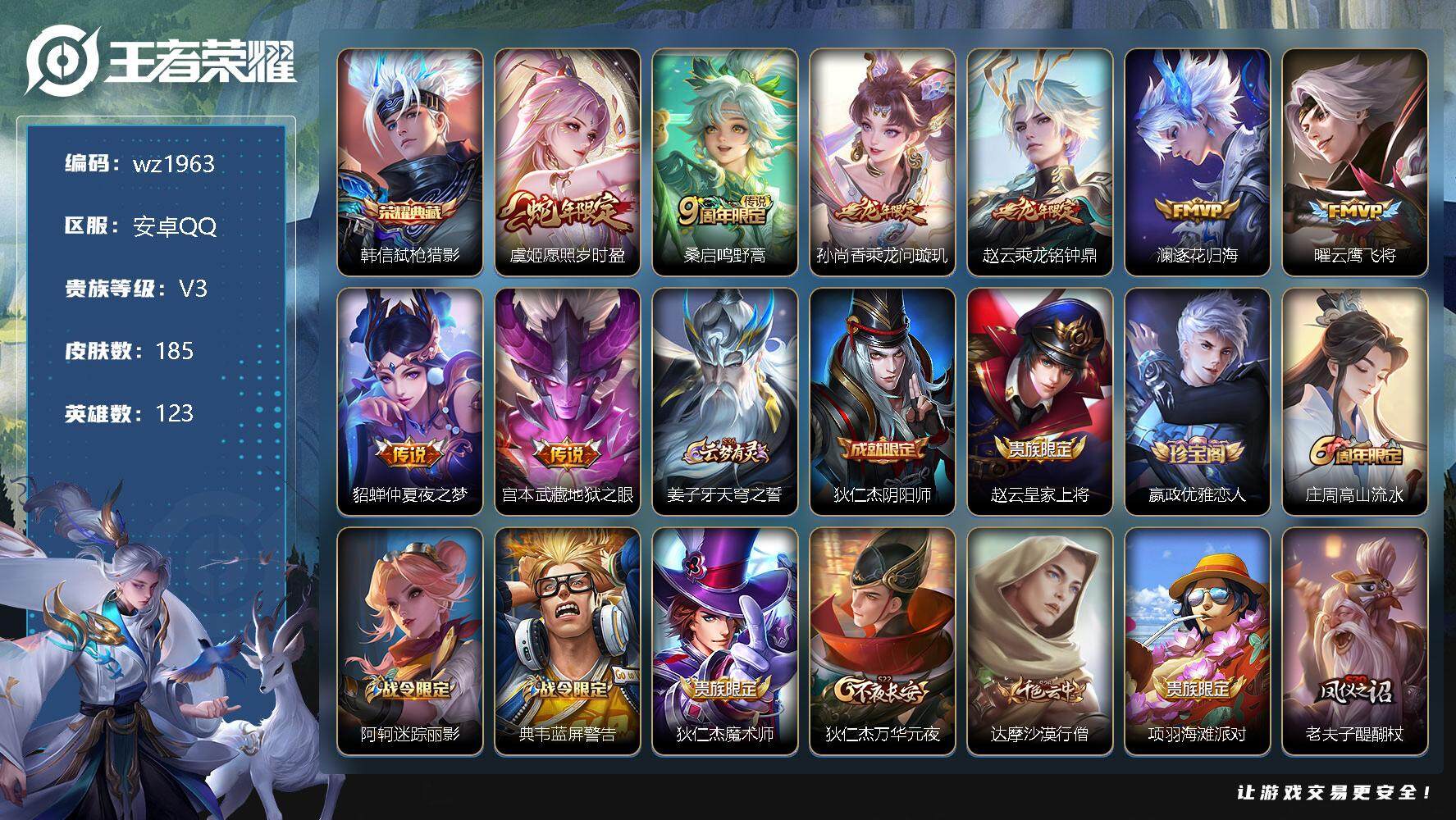 【游戏多多】 【可二次实名】【wz1963】安卓Q-V3-永恒钻石V段位-123英雄-185皮肤-1典藏-0珍品无双-0无双-0珍品传说-8传说-48史诗 【荣耀典藏】:韩信弑枪猎影 【传说皮肤】:虞姬愿照岁时盈,桑启鸣野蒿,孙尚香乘龙问璇玑,赵云乘龙铭钟鼎,澜逐花归海,曜云鹰飞将,貂蝉仲夏夜之梦,宫本武藏地狱之眼 【限定皮肤】:姜子牙天穹之誓,狄仁杰阴阳师,赵云皇家上将,嬴政优雅恋人,庄周高山流水,阿轲迷踪丽影,典韦蓝屏警告,狄仁杰魔术师,狄仁杰万华元夜,达摩沙漠行僧,项羽海滩派对,老夫子醍醐杖,程咬金演武夺筹,刘邦夺宝奇兵,韩信傲雪梅枪,兰陵王金庭之子,孙悟空大圣娶亲,孙悟空孙行者,牛魔御旌,后羿圣弓游侠,李元芳云中旅人,钟馗驱傩正仪,干将莫邪真爱魔法,鬼谷子原初探秘者,鬼谷子五谷丰年,苏烈千军破阵,弈星混沌棋,明世隐疑决卦,裴擒虎李小龙,云中君纤云弄巧,鲁班大师探海日志,桑启海盐诗旅,张良古海寻踪,高渐离燃音魔法,妲己灵卜魔法,鬼谷子天穹祈灯,安琪拉乘龙聚宝船,孙尚香乘龙问璇玑,赵云乘龙铭钟鼎,百里玄策超元猎域,沈梦溪龙舞盛年,鲁班七号蔬乡物语,李元芳蔬乡物语,刘邦剑破天穹,周瑜熔金海岸 【年限皮肤】:安琪拉乘龙聚宝船,孙尚香乘龙问璇玑,赵云乘龙铭钟鼎 【赛季限定】:狄仁杰万华元夜,达摩沙漠行僧,老夫子醍醐杖,程咬金演武夺筹,兰陵王金庭之子,张良古海寻踪,牛魔御旌,李元芳云中旅人,钟馗驱傩正仪,鬼谷子原初探秘者,苏烈千军破阵,弈星混沌棋,明世隐疑决卦,鲁班大师探海日志,桑启海盐诗旅,鬼谷子天穹祈灯,刘邦剑破天穹,姜子牙天穹之誓 【战令限定】:阿轲迷踪丽影,典韦蓝屏警告,刘邦夺宝奇兵,后羿圣弓游侠,干将莫邪真爱魔法,高渐离燃音魔法,妲己灵卜魔法,鲁班七号蔬乡物语,李元芳蔬乡物语 【史诗皮肤】:鲁班七号电玩小子,赵云皇家上将,赵云未来纪元,貂蝉圣诞恋歌,甄姬冰雪圆舞曲,狄仁杰魔术师,廉颇地狱岩魂,宫本武藏鬼剑武藏,孙尚香水果甜心,嬴政优雅恋人,嬴政摇滚巨星,妲己魅力维加斯,妲己女仆咖啡,墨子金属风暴,吕布圣诞狂欢,李白千年之狐,张飞乱世虎臣,花木兰水晶猎龙者,刘邦德古拉伯爵,夏侯惇乘风破浪,小乔缤纷独角兽,兰陵王暗隐猎兽者,诸葛亮黄金分割率,百里守约特工魅影,蔡文姬舞动绿茵,刘禅天才门将,阿轲节奏热浪,孙策猫狗日记,孙悟空大圣娶亲,典韦蓝屏警告,狄仁杰鹰眼统帅,娜可露露晚萤,不知火舞魅语,阿轲迷踪丽影,橘右京修罗,裴擒虎李小龙,云中君纤云弄巧,干将莫邪真爱魔法,孙悟空孙行者,庄周高山流水,韩信傲雪梅枪,鬼谷子五谷丰年,妲己灵卜魔法,高渐离燃音魔法,百里玄策超元猎域,安琪拉乘龙聚宝船,鲁班七号蔬乡物语,阿轲化蝶舞,狂铁龙之律动 【其他皮肤】:项羽海滩派对,韩信教廷特使,韩信街头霸王,芈月红桃皇后,扁鹊化身博士,安琪拉玩偶对对碰,妲己少女阿狸,典韦黄金武士,亚瑟死亡骑士,甄姬花好人间,刘备万事如意,宫本武藏万象初新,狄仁杰阴阳师,刘备纽约教父,钟无艳海滩丽影,宫本武藏霸王丸,王昭君幻想奇妙夜,老夫子功夫老勺,孙尚香沉稳之力,诸葛亮掌控之力,李白敏锐之力,大乔守护之力,明世隐虹云星官,牛魔御旌,小乔丁香结,沈梦溪鲨炮海盗猫,姜子牙炽热元素使,弈星混沌棋,哪吒次元突破,明世隐疑决卦,刘邦夺宝奇兵,盾山圆桌骑士,老夫子醍醐杖,狂铁特工战影,鬼谷子原初探秘者,狄仁杰万华元夜,刘禅秘密基地,露娜瓷语鉴心,程咬金演武夺筹,钟馗驱傩正仪,鲁班大师乓乓大师,苏烈千军破阵,后羿圣弓游侠,达摩沙漠行僧,程咬金无双福将,兰陵王金庭之子,李元芳云中旅人,桑启海盐诗旅,海月幻泉雾影,猪八戒潮玩探月行,太乙真人劲辣红锅,莱西奥西部游侠,鲁班大师探海日志,张良古海寻踪,钟无艳聚星闪耀,亚连破局者,后羿完美运算,鬼谷子天穹祈灯,妲己灵卜魔法,朵莉亚金色潮汐,廉颇功夫炙烤,亚瑟鸿运当头,沈梦溪龙舞盛年,李元芳蔬乡物语,刘邦剑破天穹,大司命暗都幽影,姜子牙天穹之誓,周瑜熔金海岸,盘古敬我三分,东皇太一噬灭天穹,干将莫邪雾都夜雨,苍苍林狼骑,太乙真人谧流熔炉,西施雪境奇遇,姜子牙星梦巡礼,明世隐景韶洛都,刘备浪漫序章,钟馗虚灵犬护,苏烈春野闲踪,张良灵野札记,阿古朵布丁狗之约,鲁班七号福禄兄弟,高渐离金属狂潮,项羽帝国元帅,露娜绯红之刃,花木兰剑舞者,曹操超能战警,张良一千零一夜,小乔万圣前夜,孙悟空西部大镖客,后羿精灵王,刘禅英喵野望,兰陵王隐刃,李元芳特种部队,虞姬加勒比小姐,关羽天启骑士,夏侯惇战争骑士,马可波罗激情绿茵,苍维京掠夺者,杨戬埃及法老,哪吒三太子,诸葛亮星航指挥官,黄忠芝加哥教父,干将莫邪第七人偶,铠龙域领主,百里守约绝影神枪,百里玄策威尼斯狂欢,裴擒虎街头旋风,弈星踏雪寻梅,米莱狄精准探案法,元歌午夜歌剧院,司马懿魇语军师,盾山极冰防御线,伽罗花见巫女,沈梦溪棒球奇才