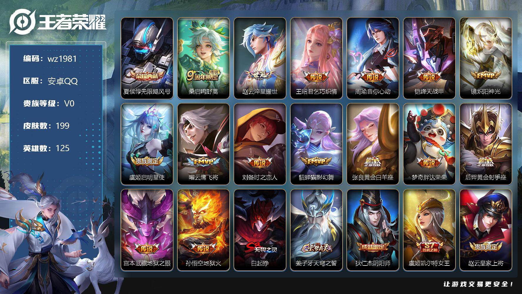 【游戏多多】 【可二次实名】【wz1981】安卓Q-V0-至尊星耀III段位-125英雄-199皮肤-1典藏-0珍品无双-0无双-0珍品传说-15传说-36史诗 【荣耀典藏】:夏侯惇无限飓风号 【传说皮肤】:桑启鸣野蒿,赵云淬星耀世,王昭君乞巧织情,周瑜音你心动,铠绛天战甲,镜炽阳神光,虞姬启明星使,曜云鹰飞将,刘备时之恋人,貂蝉猫影幻舞,张良黄金白羊座,梦奇胖达荣荣,后羿黄金射手座,宫本武藏地狱之眼,孙悟空地狱火 【限定皮肤】:白起狰,姜子牙天穹之誓,狄仁杰阴阳师,虞姬凯尔特女王,赵云皇家上将,孙尚香蔷薇恋人,庄周蜃楼王,孙膑妖精王,扁鹊炼金王,芈月重明,吕布御风骁将,元歌云间偶戏,夏侯惇朔风刀,曹操烛龙,典韦穷奇,狄仁杰魔术师,狄仁杰万华元夜,达摩沙漠行僧,项羽海滩派对,老夫子醍醐杖,程咬金演武夺筹,亚瑟潮玩骑士王,孙悟空至尊宝,牛魔奔雷神使,虞姬启明星使,钟馗驱傩正仪,太乙真人饕餮,鬼谷子原初探秘者,百里玄策原初追逐者,弈星混沌棋,明世隐疑决卦,裴擒虎擒涛扼浪,狂铁御狮,上官婉儿梁祝,鲁班大师探海日志,桑启海盐诗旅 【年限皮肤】:吕布御风骁将,牛魔奔雷神使 【赛季限定】:庄周蜃楼王,孙膑妖精王,扁鹊炼金王,白起狰,芈月重明,夏侯惇朔风刀,曹操烛龙,典韦穷奇,狄仁杰万华元夜,达摩沙漠行僧,老夫子醍醐杖,程咬金演武夺筹,虞姬凯尔特女王,钟馗驱傩正仪,太乙真人饕餮,鬼谷子原初探秘者,百里玄策原初追逐者,弈星混沌棋,明世隐疑决卦,裴擒虎擒涛扼浪,狂铁御狮,鲁班大师探海日志,桑启海盐诗旅,姜子牙天穹之誓 【战令限定】:元歌云间偶戏,亚瑟潮玩骑士王 【史诗皮肤】:鲁班七号电玩小子,露娜紫霞仙子,阿轲暗夜猫娘,赵云皇家上将,貂蝉圣诞恋歌,甄姬冰雪圆舞曲,王昭君偶像歌手,狄仁杰魔术师,廉颇地狱岩魂,宫本武藏鬼剑武藏,孙尚香蔷薇恋人,孙尚香水果甜心,嬴政摇滚巨星,刘禅绅士熊喵,曹操幽灵船长,吕布末日机甲,张飞乱世虎臣,孙悟空至尊宝,花木兰水晶猎龙者,刘邦德古拉伯爵,夏侯惇乘风破浪,兰陵王暗隐猎兽者,亚瑟心灵战警,百里守约特工魅影,李元芳逐浪之夏,程咬金功夫厨神,阿轲节奏热浪,孙策猫狗日记,狄仁杰鹰眼统帅,上官婉儿梁祝,百里玄策原初追逐者,元歌云间偶戏,牛魔奔雷神使,吕布御风骁将,黄忠百相守梦,公孙离涂山容容 【其他皮肤】:项羽海滩派对,韩信教廷特使,韩信街头霸王,阿轲爱心护理,达摩大发明家,赵云白执事,赵云忍炎影,芈月红桃皇后,程咬金星际陆战队,白起白色死神,牛魔西部大镖客,武则天东方不败,扁鹊化身博士,扁鹊救世之瞳,宫本武藏未来纪元,安琪拉玩偶对对碰,孙膑天使之翼,姜子牙时尚教父,妲己少女阿狸,典韦黄金武士,达摩拳王,花木兰兔女郎,刘备万事如意,宫本武藏万象初新,后羿阿尔法小队,狄仁杰阴阳师,庄周蜃楼王,孙膑妖精王,扁鹊炼金王,关羽龙腾万里,虞姬凯尔特女王,白起狰,钟无艳海滩丽影,太乙真人饕餮,宫本武藏霸王丸,曹操烛龙,王昭君幻想奇妙夜,芈月重明,狂铁命运角斗场,老夫子功夫老勺,孙尚香沉稳之力,典韦穷奇,诸葛亮掌控之力,李白敏锐之力,狂铁御狮,苏烈坚韧之力,大乔守护之力,明世隐虹云星官,小乔丁香结,吕布野性能量,沈梦溪鲨炮海盗猫,夏侯惇朔风刀,弈星混沌棋,哪吒次元突破,明世隐疑决卦,盾山圆桌骑士,老夫子醍醐杖,鬼谷子原初探秘者,狄仁杰万华元夜,亚瑟潮玩骑士王,刘禅秘密基地,程咬金演武夺筹,张良缤纷绘卷,钟馗驱傩正仪,达摩沙漠行僧,桑启海盐诗旅,赵怀真太极少年,裴擒虎擒涛扼浪,太乙真人劲辣红锅,莱西奥西部游侠,鲁班大师探海日志,姬小满零食大作战,李元芳妄想特派,姜子牙天穹之誓,盘古敬我三分,东皇太一噬灭天穹,干将莫邪雾都夜雨,苍苍林狼骑,太乙真人谧流熔炉,典韦铁骨偃魂,西施雪境奇遇,姜子牙星梦巡礼,戈娅玫蓝誓约,甄姬逆浪荇歌,莱西奥踏浪烽翎,鬼谷子克喵,鲁班七号木偶奇遇记,露娜绯红之刃,钟无艳生化警戒,貂蝉异域舞娘,花木兰剑舞者,老夫子潮流仙人,王昭君精灵公主,曹操死神来了,张良一千零一夜,小乔万圣前夜,孙悟空西部大镖客,周瑜海军大将,后羿精灵王,兰陵王隐刃,李白范海辛,钟馗地府判官,李元芳特种部队,刘邦圣殿之光,虞姬加勒比小姐,关羽天启骑士,夏侯惇战争骑士,雅典娜战争女神,杨戬埃及法老,哪吒三太子,诸葛亮星航指挥官,黄忠芝加哥教父,大乔伊势巫女,东皇太一东海龙王,鬼谷子阿摩司公爵,铠龙域领主,苏烈爱与和平,梦奇美梦成真,女娲尼罗河女神,明世隐占星师,弈星踏雪寻梅,米莱狄精准探案法,元歌午夜歌剧院,司马懿魇语军师,盾山极冰防御线,伽罗花见巫女,沈梦溪棒球奇才,李信灼热之刃,上官婉儿修竹墨客,嫦娥露花倒影,猪八戒年年有余,盘古创世神祝,瑶森,云中君荷鲁斯之眼,曜归虚梦演,马超幸存者,西施归虚梦演,鲁班大师归虚梦演,蒙犽归虚梦演,镜冰刃幻境,蒙恬秩序猎龙将,阿古朵熊