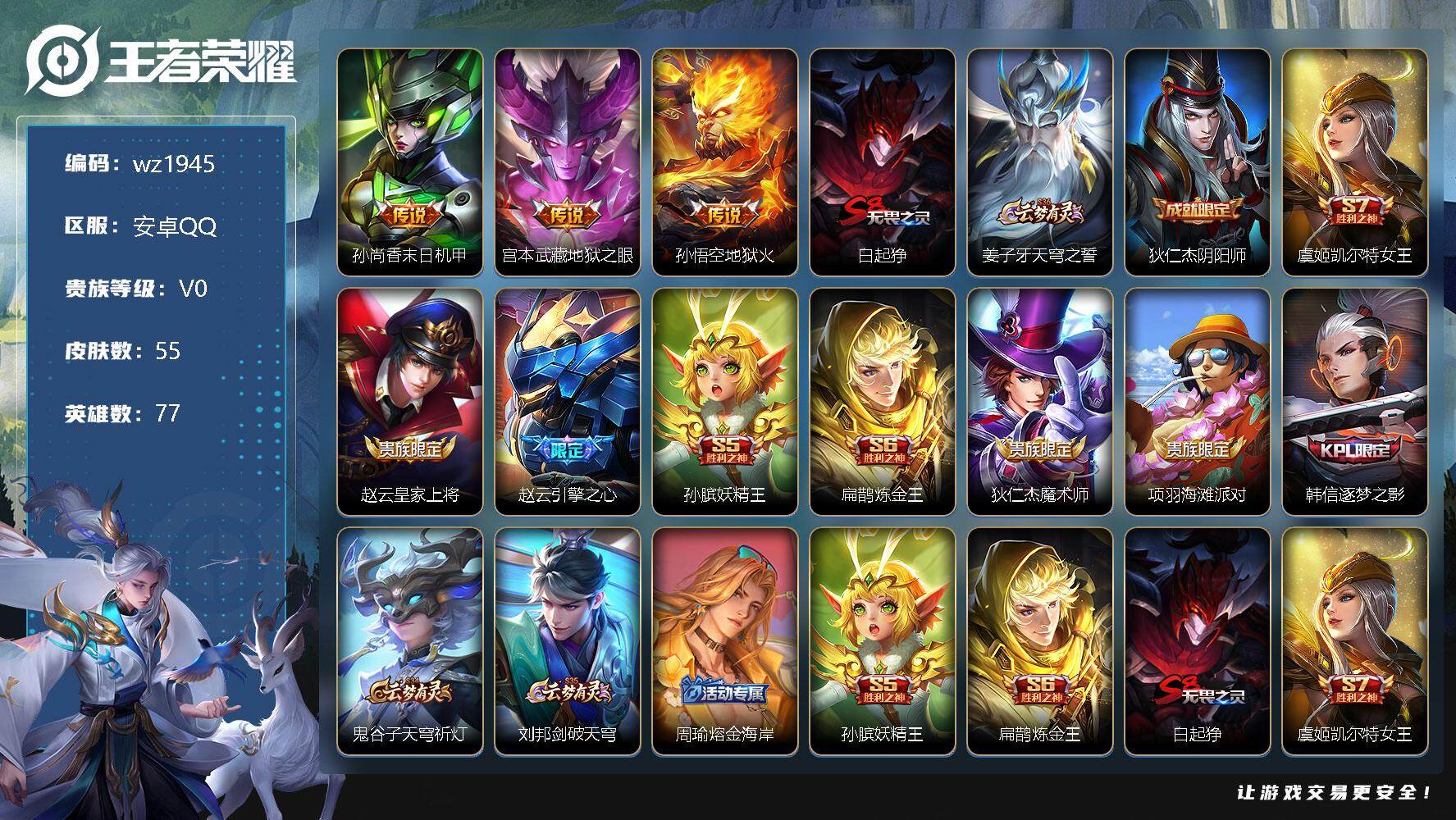 【游戏多多】 【可二次实名】【wz1945】安卓Q-V0-永恒钻石IV段位-77英雄-55皮肤-0典藏-0珍品无双-0无双-0珍品传说-3传说-13史诗 【传说皮肤】:孙尚香末日机甲,宫本武藏地狱之眼,孙悟空地狱火 【限定皮肤】:白起狰,姜子牙天穹之誓,狄仁杰阴阳师,虞姬凯尔特女王,赵云皇家上将,赵云引擎之心,孙膑妖精王,扁鹊炼金王,狄仁杰魔术师,项羽海滩派对,韩信逐梦之影,鬼谷子天穹祈灯,刘邦剑破天穹,周瑜熔金海岸 【赛季限定】:孙膑妖精王,扁鹊炼金王,白起狰,虞姬凯尔特女王,鬼谷子天穹祈灯,刘邦剑破天穹,姜子牙天穹之誓 【史诗皮肤】:鲁班七号电玩小子,露娜紫霞仙子,赵云皇家上将,貂蝉圣诞恋歌,狄仁杰魔术师,妲己魅力维加斯,曹操幽灵船长,李白千年之狐,韩信白龙吟,赵云引擎之心,花木兰水晶猎龙者,韩信逐梦之影,诸葛亮黄金分割率 【其他皮肤】:项羽海滩派对,韩信教廷特使,韩信街头霸王,露娜哥特玫瑰,阿轲爱心护理,赵云白执事,赵云忍炎影,芈月红桃皇后,扁鹊化身博士,妲己少女阿狸,亚瑟死亡骑士,狄仁杰阴阳师,孙膑妖精王,刘备汉昭烈帝,扁鹊炼金王,虞姬凯尔特女王,墨子进击墨子号,白起狰,钟无艳海滩丽影,沈梦溪鲨炮海盗猫,鬼谷子天穹祈灯,刘邦剑破天穹,姜子牙天穹之誓,周瑜熔金海岸,高渐离金属狂潮,露娜绯红之刃,王昭君精灵公主,狄仁杰锦衣卫,孙悟空西部大镖客,后羿精灵王,兰陵王隐刃,关羽天启骑士,马可波罗激情绿茵,哪吒三太子,诸葛亮星航指挥官,黄忠芝加哥教父,铠龙域领主,司空震启蛰,云缨赤焰之缨 【营地ID】:230769589