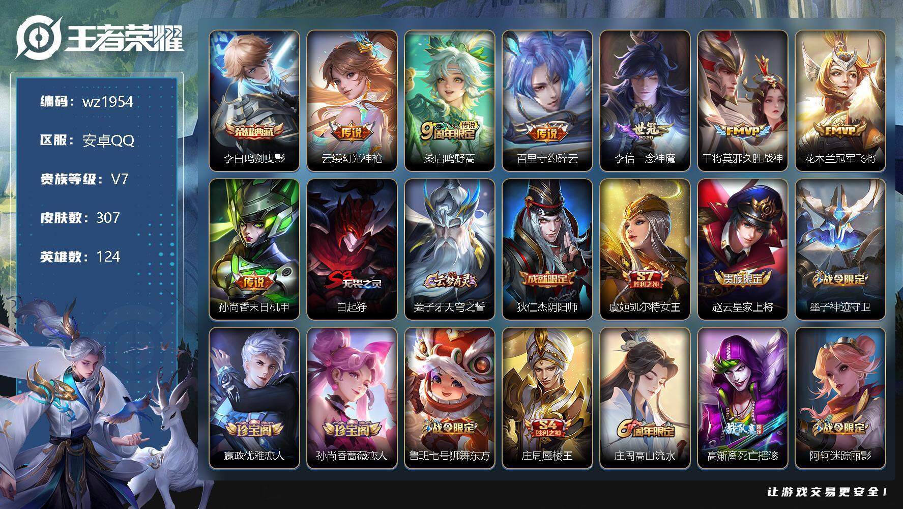 【游戏多多】 【可二次实名】【wz1954】安卓Q-V7-最强王者段位-124英雄-307皮肤-1典藏-0珍品无双-0无双-0珍品传说-7传说-89史诗 【英雄全皮】:太乙真人全皮,狂铁全皮,猪八戒全皮,蒙恬全皮 【荣耀典藏】:李白鸣剑曳影 【传说皮肤】:云缨幻光神枪,桑启鸣野蒿,百里守约碎云,李信一念神魔,干将莫邪久胜战神,花木兰冠军飞将,孙尚香末日机甲 【限定皮肤】:白起狰,姜子牙天穹之誓,狄仁杰阴阳师,虞姬凯尔特女王,赵云皇家上将,墨子神迹守卫,嬴政优雅恋人,孙尚香蔷薇恋人,鲁班七号狮舞东方,庄周蜃楼王,庄周高山流水,高渐离死亡摇滚,阿轲迷踪丽影,孙膑妖精王,扁鹊炼金王,芈月重明,芈月幻夜卜梦,周瑜赤莲之焰,元歌云间偶戏,元歌无心,夏侯惇朔风刀,甄姬游园惊梦,曹操烛龙,典韦穷奇,典韦蓝屏警告,马可波罗暗影游猎,狄仁杰魔术师,狄仁杰万华元夜,达摩星际陆战队,达摩沙漠行僧,项羽海滩派对,老夫子醍醐杖,老夫子航海奇遇记,程咬金演武夺筹,刘邦夺宝奇兵,韩信飞衡,王昭君午后时光,兰陵王驯魔猎人,兰陵王金庭之子,花木兰瑞麟志,花木兰默契交锋,亚瑟潮玩骑士王,孙悟空至尊宝,孙悟空大圣娶亲,牛魔御旌,后羿如梦令,后羿圣弓游侠,李元芳银河之约,李元芳云中旅人,钟馗神迹守卫,钟馗驱傩正仪,杨玉环遇见飞天,女娲朔望之晖,干将莫邪冰霜恋舞曲,干将莫邪胡桃夹子,干将莫邪真爱魔法,雅典娜单词大作战,雅典娜黎明之约,太乙真人饕餮,太乙真人华丽摇滚,鬼谷子原初探秘者,鬼谷子五谷丰年,黄忠火炮绅士,苏烈千军破阵,百里玄策原初追逐者,弈星混沌棋,梦奇顽趣,公孙离玉兔公主,沈梦溪星空之诺,沈梦溪大漠名商,明世隐疑决卦,裴擒虎李小龙,裴擒虎擒涛扼浪,狂铁御狮,狂铁电玩高手,米莱狄御霄,米莱狄胡桃异想国,云中君纤云弄巧,盾山御銮,猪八戒西部大镖客,猪八戒猪悟能,上官婉儿梁祝,嫦娥拒霜思,蒙犽狂想玩偶喵,鲁班大师探海日志,桑启海盐诗旅,阿古朵江河有灵,张良古海寻踪,蒙恬荣光圣徽,鬼谷子天穹祈灯,姬小满妄想食味,沈梦溪龙舞盛年,刘邦剑破天穹,程咬金群星魔术团,周瑜熔金海岸 【年限皮肤】:花木兰瑞麟志,韩信飞衡,马超神威 【赛季限定】:庄周蜃楼王,孙膑妖精王,扁鹊炼金王,白起狰,芈月重明,夏侯惇朔风刀,曹操烛龙,典韦穷奇,狄仁杰万华元夜,达摩沙漠行僧,老夫子醍醐杖,程咬金演武夺筹,兰陵王金庭之子,张良古海寻踪,牛魔御旌,李元芳云中旅人,虞姬凯尔特女王,钟馗驱傩正仪,雅典娜黎明之约,太乙真人饕餮,鬼谷子原初探秘者,苏烈千军破阵,百里玄策原初追逐者,弈星混沌棋,梦奇顽趣,沈梦溪大漠名商,明世隐疑决卦,裴擒虎擒涛扼浪,狂铁御狮,米莱狄御霄,盾山御銮,鲁班大师探海日志,桑启海盐诗旅,鬼谷子天穹祈灯,蒙恬荣光圣徽,刘邦剑破天穹,姜子牙天穹之誓 【战令限定】:墨子神迹守卫,鲁班七号狮舞东方,阿轲迷踪丽影,芈月幻夜卜梦,周瑜赤莲之焰,元歌云间偶戏,典韦蓝屏警告,马可波罗暗影游猎,达摩星际陆战队,老夫子航海奇遇记,刘邦夺宝奇兵,王昭君午后时光,兰陵王驯魔猎人,亚瑟潮玩骑士王,后羿圣弓游侠,李元芳银河之约,钟馗神迹守卫,女娲朔望之晖,干将莫邪真爱魔法,雅典娜单词大作战,黄忠火炮绅士,沈梦溪星空之诺,狂铁电玩高手,米莱狄胡桃异想国,猪八戒西部大镖客,蒙犽狂想玩偶喵 【史诗皮肤】:露娜紫霞仙子,阿轲暗夜猫娘,赵云皇家上将,赵云未来纪元,貂蝉圣诞恋歌,甄姬冰雪圆舞曲,王昭君偶像歌手,狄仁杰魔术师,廉颇地狱岩魂,宫本武藏鬼剑武藏,孙尚香蔷薇恋人,孙尚香水果甜心,嬴政优雅恋人,妲己魅力维加斯,妲己女仆咖啡,墨子龙骑士,墨子金属风暴,吕布圣诞狂欢,刘禅绅士熊喵,曹操幽灵船长,李白千年之狐,吕布末日机甲,孙悟空至尊宝,花木兰水晶猎龙者,刘邦德古拉伯爵,夏侯惇乘风破浪,小乔缤纷独角兽,兰陵王暗隐猎兽者,诸葛亮黄金分割率,甄姬游园惊梦,亚瑟心灵战警,雅典娜冰冠公主,安琪拉心灵骇客,百里守约特工魅影,铠曙光守护者,刘禅天才门将,李元芳逐浪之夏,程咬金功夫厨神,白起星夜王子,杨玉环遇见飞天,干将莫邪冰霜恋舞曲,孙悟空大圣娶亲,花木兰瑞麟志,典韦蓝屏警告,伽罗箭羽风息,鲁班七号狮舞东方,狄仁杰鹰眼统帅,公孙离无限星赏官,兰陵王驯魔猎人,上官婉儿梁祝,李元芳银河之约,娜可露露晚萤,韩信飞衡,后羿如梦令,不知火舞魅语,阿轲迷踪丽影,橘右京修罗,马超神威,马可波罗暗影游猎,蒙犽狂想玩偶喵,百里玄策原初追逐者,裴擒虎李小龙,云中君纤云弄巧,元歌云间偶戏,花木兰默契交锋,米莱狄胡桃异想国,老夫子航海奇遇记,干将莫邪真爱魔法,沈梦溪月团寄思,猪八戒猪悟能,庄周高山流水,嫦娥拒霜思,黄忠火炮绅士,雅典娜黎明之约,夏洛特永昼,公孙离玉兔公主,狂铁电玩高手,弈星滕王阁序,鬼谷子五谷丰年,元歌无心,梦奇顽趣,刘禅电玩爆裂旋风,阿古朵江河有灵,蒙恬荣光圣