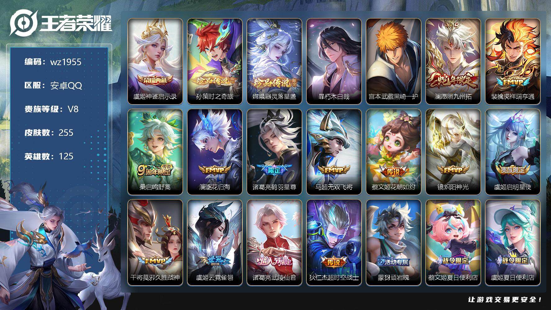 【游戏多多】 【可二次实名】【wz1955】安卓Q-V8-最强王者段位-125英雄-255皮肤-1典藏-0珍品无双-0无双-4珍品传说-13传说-70史诗 【英雄全皮】:蒙恬全皮,镜全皮,空空儿全皮,影全皮 【荣耀典藏】:虞姬神鉴启示录 【珍品传说】:孙策时之奇旅,嫦娥器灵落星盏,暃朽木白哉,宫本武藏黑崎一护 【传说皮肤】:澜愿照九州拓,裴擒虎祥瑞亨通,桑启鸣野蒿,澜逐花归海,诸葛亮鹤羽星尊,马超无双飞将,蔡文姬花朝如约,镜炽阳神光,虞姬启明星使,干将莫邪久胜战神,虞姬云霓雀翎,诸葛亮武陵仙君,狄仁杰超时空战士 【限定皮肤】:蒙犽顽岩魄,蔡文姬夏日便利店,虞姬夏日便利店,姜子牙天穹之誓,杨戬破阵退雄兵,狄仁杰阴阳师,赵云皇家上将,元歌云间偶戏,元歌无心,狄仁杰魔术师,项羽海滩派对,韩信傲雪梅枪,李元芳云中旅人,虞姬启明星使,干将莫邪胡桃夹子,诸葛亮武陵仙君,诸葛亮鹤羽星尊,梦奇顽趣,公孙离玉兔公主,沈梦溪大漠名商,裴擒虎李小龙,裴擒虎擒涛扼浪,云中君纤云弄巧,嫦娥拒霜思,嫦娥暖冬兔眠,西施玲珑珍味,蒙犽狂想玩偶喵,鲁班大师探海日志,镜匿光追影者,桑启海盐诗旅,艾琳流音漫舞,司空震地狱燃心,阿古朵江河有灵,张良古海寻踪,蒙犽百解令,蒙恬荣光圣徽,高渐离燃音魔法,妲己灵卜魔法,鬼谷子天穹祈灯,姬小满妄想食味,沈梦溪龙舞盛年,刘邦剑破天穹,程咬金群星魔术团,镜青焰无极,项羽苍威无极,刘备异域游侠,周瑜熔金海岸 【赛季限定】:张良古海寻踪,李元芳云中旅人,梦奇顽趣,沈梦溪大漠名商,裴擒虎擒涛扼浪,鲁班大师探海日志,桑启海盐诗旅,鬼谷子天穹祈灯,蒙恬荣光圣徽,刘邦剑破天穹,姜子牙天穹之誓 【战令限定】:蔡文姬夏日便利店,虞姬夏日便利店,元歌云间偶戏,艾琳流音漫舞,嫦娥暖冬兔眠,西施玲珑珍味,蒙犽狂想玩偶喵,司空震地狱燃心,高渐离燃音魔法,妲己灵卜魔法,镜青焰无极,项羽苍威无极 【史诗皮肤】:露娜紫霞仙子,阿轲暗夜猫娘,赵云皇家上将,貂蝉圣诞恋歌,甄姬冰雪圆舞曲,王昭君偶像歌手,狄仁杰魔术师,宫本武藏鬼剑武藏,孙尚香水果甜心,嬴政摇滚巨星,妲己魅力维加斯,妲己女仆咖啡,墨子金属风暴,吕布圣诞狂欢,曹操幽灵船长,吕布末日机甲,张飞乱世虎臣,花木兰水晶猎龙者,夏侯惇乘风破浪,小乔缤纷独角兽,兰陵王暗隐猎兽者,诸葛亮黄金分割率,铠曙光守护者,蔡文姬舞动绿茵,李元芳逐浪之夏,阿轲节奏热浪,孙策猫狗日记,伽罗箭羽风息,狄仁杰鹰眼统帅,公孙离无限星赏官,娜可露露晚萤,不知火舞魅语,橘右京修罗,蒙犽狂想玩偶喵,裴擒虎李小龙,云中君纤云弄巧,元歌云间偶戏,嫦娥拒霜思,镜匿光追影者,韩信傲雪梅枪,公孙离玉兔公主,澜赏金猎手,元歌无心,梦奇顽趣,镜玫瑰异探,海月浮梦罗烟,镜真我赫兹,司空震地狱燃心,阿古朵江河有灵,蒙犽百解令,妲己灵卜魔法,高渐离燃音魔法,蒙恬荣光圣徽,姬小满妄想食味,镜青焰无极,黄忠怒海争锋,蔡文姬夏日便利店,蒙犽顽岩魄,廉颇撼地雄心,亚连破空之剑,弈星炽弈燎原,马可波罗星界特工,百里守约百相守梦,牛魔星界战将,孙膑茶境仙,刘禅鸭鸭历险记,狂铁龙之律动,后羿石田雨龙,周瑜百相守梦,黄忠百相守梦,公孙离涂山容容 【其他皮肤】:项羽海滩派对,韩信教廷特使,韩信街头霸王,露娜哥特玫瑰,赵云白执事,芈月红桃皇后,牛魔西部大镖客,扁鹊化身博士,宫本武藏未来纪元,安琪拉玩偶对对碰,姜子牙时尚教父,妲己少女阿狸,亚瑟死亡骑士,花木兰兔女郎,张飞五福同心,甄姬花好人间,后羿阿尔法小队,狄仁杰阴阳师,刘备纽约教父,关羽龙腾万里,钟无艳海滩丽影,王昭君幻想奇妙夜,狂铁命运角斗场,老夫子功夫老勺,孙尚香沉稳之力,诸葛亮掌控之力,鬼谷子幻乐之宴,苏烈坚韧之力,大乔守护之力,明世隐虹云星官,张良幽兰居士,小乔丁香结,吕布野性能量,孙膑归虚梦演,沈梦溪鲨炮海盗猫,姜子牙炽热元素使,哪吒次元突破,盾山圆桌骑士,狂铁特工战影,廉颇无尽征程,刘禅秘密基地,盘古重装意志,鲁班大师乓乓大师,干将莫邪胡桃夹子,马可波罗潮玩牛仔,程咬金无双福将,米莱狄契约魔法,沈梦溪大漠名商,蒙犽胡桃狂想曲,蒙恬蔚蓝守将,李元芳云中旅人,戈娅危途狂花,桑启海盐诗旅,嫦娥暖冬兔眠,海月幻泉雾影,猪八戒潮玩探月行,牛魔牛运亨通,白起乐园追猎者,赵怀真太极少年,裴擒虎擒涛扼浪,太乙真人劲辣红锅,莱西奥西部游侠,鲁班大师探海日志,西施玲珑珍味,李元芳妄想特派,艾琳流音漫舞,张良古海寻踪,钟无艳聚星闪耀,海月王牌新星,后羿完美运算,程咬金暖冬絮语,鬼谷子天穹祈灯,妲己灵卜魔法,海诺时空谍影,嫦娥漠中幻影,朵莉亚金色潮汐,廉颇功夫炙烤,亚瑟鸿运当头,沈梦溪龙舞盛年,刘邦剑破天穹,程咬金群星魔术团,项羽苍威无极,大司命暗都幽影,刘备异域游侠,杨戬破阵退雄兵,貂蝉长夏之忆,姜子牙天穹之誓,周瑜熔金海岸,虞姬夏日便利店,孙悟空神迹守卫,盘