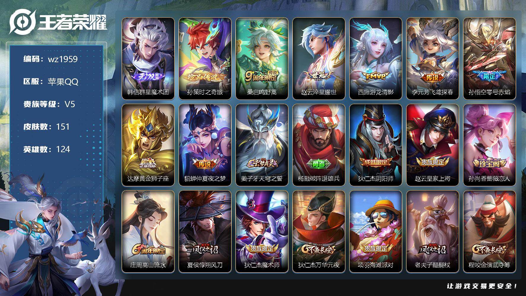 【游戏多多】 【可二次实名】【wz1959】苹果Q-V5-至尊星耀IV段位-124英雄-151皮肤-0典藏-0珍品无双-1无双-1珍品传说-7传说-40史诗 【无双皮肤】:韩信群星魔术团 【珍品传说】:孙策时之奇旅 【传说皮肤】:桑启鸣野蒿,赵云淬星耀世,西施游龙清影,李元芳飞鸢探春,孙悟空零号赤焰,达摩黄金狮子座,貂蝉仲夏夜之梦 【限定皮肤】:姜子牙天穹之誓,杨戬破阵退雄兵,狄仁杰阴阳师,赵云皇家上将,孙尚香蔷薇恋人,庄周高山流水,夏侯惇朔风刀,狄仁杰魔术师,狄仁杰万华元夜,项羽海滩派对,老夫子醍醐杖,程咬金演武夺筹,韩信飞衡,孙悟空大圣娶亲,孙悟空零号赤焰,孙悟空孙行者,李元芳匿光侦查者,钟馗驱傩正仪,干将莫邪冰霜恋舞曲,鬼谷子原初探秘者,弈星混沌棋,明世隐疑决卦,裴擒虎李小龙,鲁班大师探海日志,阿古朵江河有灵,张良古海寻踪,蒙犽百解令,鬼谷子天穹祈灯,沈梦溪龙舞盛年,刘邦剑破天穹,程咬金群星魔术团,韩信群星魔术团,关羽决胜骁骑,周瑜熔金海岸 【年限皮肤】:韩信飞衡,马超神威 【赛季限定】:夏侯惇朔风刀,狄仁杰万华元夜,老夫子醍醐杖,程咬金演武夺筹,张良古海寻踪,钟馗驱傩正仪,鬼谷子原初探秘者,弈星混沌棋,明世隐疑决卦,鲁班大师探海日志,鬼谷子天穹祈灯,刘邦剑破天穹,姜子牙天穹之誓 【史诗皮肤】:鲁班七号电玩小子,露娜紫霞仙子,阿轲暗夜猫娘,赵云皇家上将,赵云未来纪元,甄姬冰雪圆舞曲,狄仁杰魔术师,宫本武藏鬼剑武藏,孙尚香蔷薇恋人,孙尚香水果甜心,嬴政暗夜贵公子,嬴政摇滚巨星,妲己魅力维加斯,墨子金属风暴,吕布圣诞狂欢,花木兰水晶猎龙者,夏侯惇乘风破浪,小乔缤纷独角兽,雅典娜冰冠公主,百里守约特工魅影,铠曙光守护者,蔡文姬舞动绿茵,李元芳逐浪之夏,程咬金功夫厨神,白起星夜王子,干将莫邪冰霜恋舞曲,孙悟空大圣娶亲,狄仁杰鹰眼统帅,娜可露露晚萤,韩信飞衡,马超神威,裴擒虎李小龙,孙悟空孙行者,庄周高山流水,李元芳匿光侦查者,阿古朵江河有灵,蒙犽百解令,关羽决胜骁骑,牛魔星界战将,阿轲化蝶舞 【其他皮肤】:项羽海滩派对,韩信教廷特使,韩信街头霸王,达摩大发明家,赵云忍炎影,程咬金星际陆战队,武则天东方不败,扁鹊化身博士,妲己少女阿狸,典韦黄金武士,亚瑟死亡骑士,花木兰兔女郎,张飞五福同心,宫本武藏万象初新,后羿阿尔法小队,狄仁杰阴阳师,钟无艳海滩丽影,宫本武藏霸王丸,老夫子功夫老勺,小乔丁香结,吕布野性能量,沈梦溪鲨炮海盗猫,夏侯惇朔风刀,弈星混沌棋,哪吒次元突破,鲁班七号黑桃队长,明世隐疑决卦,盾山圆桌骑士,老夫子醍醐杖,狂铁特工战影,鬼谷子原初探秘者,狄仁杰万华元夜,刘禅秘密基地,露娜瓷语鉴心,程咬金演武夺筹,张良缤纷绘卷,钟馗驱傩正仪,鲁班大师乓乓大师,蒙恬蔚蓝守将,猪八戒潮玩探月行,鲁班大师探海日志,李元芳妄想特派,哪吒热血海滩,张良古海寻踪,钟无艳聚星闪耀,后羿完美运算,鬼谷子天穹祈灯,廉颇功夫炙烤,沈梦溪龙舞盛年,刘邦剑破天穹,程咬金群星魔术团,杨戬破阵退雄兵,姜子牙天穹之誓,周瑜熔金海岸,盘古敬我三分,东皇太一噬灭天穹,亚瑟动物派对,苍苍林狼骑,太乙真人谧流熔炉,典韦铁骨偃魂,西施雪境奇遇,姜子牙星梦巡礼,戈娅玫蓝誓约,刘备浪漫序章,苏烈春野闲踪,张良灵野札记,鲁班七号福禄兄弟,高渐离金属狂潮,项羽帝国元帅,露娜绯红之刃,钟无艳生化警戒,花木兰剑舞者,曹操超能战警,张良一千零一夜,小乔万圣前夜,孙悟空西部大镖客,刘禅英喵野望,李白范海辛,钟馗地府判官,李元芳特种部队,关羽天启骑士,马可波罗激情绿茵,苍维京掠夺者,杨戬埃及法老,哪吒三太子,鬼谷子阿摩司公爵,百里守约绝影神枪,百里玄策威尼斯狂欢,梦奇美梦成真,明世隐占星师,裴擒虎街头旋风,元歌午夜歌剧院,司马懿魇语军师,伽罗花见巫女,李信灼热之刃,盘古创世神祝,曜归虚梦演,马超幸存者,鲁班大师归虚梦演,镜冰刃幻境,金蝉前尘,暃碧珀绯影 【内测皮肤】:孙尚香蔷薇恋人,狂铁特工战影 【营地ID】:497849133