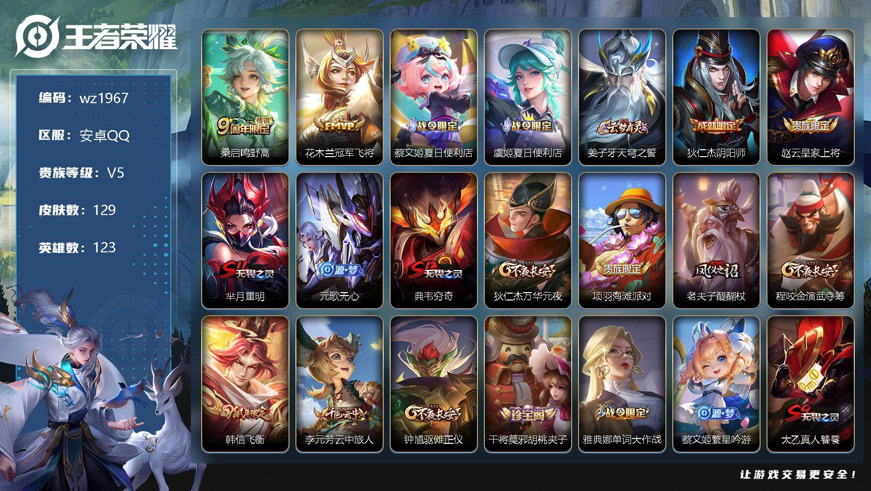 【游戏多多】 【可二次实名】【wz1967】安卓Q-V5-尊贵铂金IV段位-123英雄-129皮肤-0典藏-0珍品无双-0无双-0珍品传说-2传说-26史诗 【传说皮肤】:桑启鸣野蒿,花木兰冠军飞将 【限定皮肤】:蔡文姬夏日便利店,虞姬夏日便利店,姜子牙天穹之誓,狄仁杰阴阳师,赵云皇家上将,芈月重明,元歌无心,典韦穷奇,狄仁杰万华元夜,项羽海滩派对,老夫子醍醐杖,程咬金演武夺筹,韩信飞衡,李元芳云中旅人,钟馗驱傩正仪,干将莫邪胡桃夹子,雅典娜单词大作战,蔡文姬繁星吟游,太乙真人饕餮,鬼谷子原初探秘者,弈星混沌棋,沈梦溪大漠名商,明世隐疑决卦,裴擒虎李小龙,裴擒虎擒涛扼浪,云中君纤云弄巧,上官婉儿梁祝,嫦娥暖冬兔眠,蒙犽狂想玩偶喵,鲁班大师探海日志,桑启海盐诗旅,暃星界游侠,张良古海寻踪,鬼谷子天穹祈灯,沈梦溪龙舞盛年,周瑜熔金海岸 【年限皮肤】:韩信飞衡 【赛季限定】:芈月重明,典韦穷奇,狄仁杰万华元夜,老夫子醍醐杖,程咬金演武夺筹,张良古海寻踪,李元芳云中旅人,钟馗驱傩正仪,太乙真人饕餮,鬼谷子原初探秘者,弈星混沌棋,沈梦溪大漠名商,明世隐疑决卦,裴擒虎擒涛扼浪,鲁班大师探海日志,桑启海盐诗旅,鬼谷子天穹祈灯,姜子牙天穹之誓 【战令限定】:蔡文姬夏日便利店,虞姬夏日便利店,雅典娜单词大作战,嫦娥暖冬兔眠,蒙犽狂想玩偶喵,暃星界游侠 【史诗皮肤】:赵云皇家上将,赵云未来纪元,甄姬冰雪圆舞曲,孙尚香水果甜心,妲己女仆咖啡,刘禅绅士熊喵,曹操幽灵船长,李白千年之狐,吕布末日机甲,花木兰水晶猎龙者,夏侯惇乘风破浪,诸葛亮黄金分割率,雅典娜冰冠公主,蔡文姬舞动绿茵,李元芳逐浪之夏,程咬金功夫厨神,狄仁杰鹰眼统帅,上官婉儿梁祝,蔡文姬繁星吟游,韩信飞衡,蒙犽狂想玩偶喵,裴擒虎李小龙,云中君纤云弄巧,元歌无心,暃星界游侠,蔡文姬夏日便利店 【其他皮肤】:项羽海滩派对,韩信教廷特使,露娜哥特玫瑰,达摩大发明家,赵云忍炎影,白起白色死神,扁鹊化身博士,安琪拉玩偶对对碰,妲己少女阿狸,典韦黄金武士,达摩拳王,花木兰兔女郎,宫本武藏万象初新,狄仁杰阴阳师,刘备纽约教父,关羽龙腾万里,钟无艳海滩丽影,太乙真人饕餮,王昭君幻想奇妙夜,芈月重明,狂铁命运角斗场,老夫子功夫老勺,典韦穷奇,诸葛亮掌控之力,项羽科学大爆炸,明世隐虹云星官,小乔丁香结,沈梦溪鲨炮海盗猫,弈星混沌棋,哪吒次元突破,明世隐疑决卦,盾山圆桌骑士,老夫子醍醐杖,鬼谷子原初探秘者,雅典娜单词大作战,狄仁杰万华元夜,刘禅秘密基地,杨戬次元傲视,露娜瓷语鉴心,程咬金演武夺筹,钟馗驱傩正仪,鲁班大师乓乓大师,干将莫邪胡桃夹子,沈梦溪大漠名商,李元芳云中旅人,桑启海盐诗旅,嫦娥暖冬兔眠,赵怀真太极少年,裴擒虎擒涛扼浪,太乙真人劲辣红锅,莱西奥西部游侠,鲁班大师探海日志,姬小满零食大作战,李元芳妄想特派,张良古海寻踪,后羿完美运算,鬼谷子天穹祈灯,廉颇功夫炙烤,沈梦溪龙舞盛年,姜子牙天穹之誓,周瑜熔金海岸,虞姬夏日便利店,苍苍林狼骑,典韦铁骨偃魂,西施雪境奇遇,姜子牙星梦巡礼,钟馗虚灵犬护,苏烈春野闲踪,张良灵野札记,白起死霸装,鲁班七号木偶奇遇记,貂蝉异域舞娘,老夫子潮流仙人,狄仁杰锦衣卫,曹操超能战警,小乔万圣前夜,孙悟空西部大镖客,后羿精灵王,李白范海辛,虞姬加勒比小姐,夏侯惇战争骑士,马可波罗激情绿茵,太乙真人圆桌骑士,哪吒三太子,东皇太一东海龙王,鬼谷子阿摩司公爵,铠龙域领主,百里守约绝影神枪,裴擒虎街头旋风,元歌午夜歌剧院,盾山极冰防御线,伽罗花见巫女,李信灼热之刃,上官婉儿修竹墨客,马超幸存者,西施归虚梦演,镜冰刃幻境,蒙恬秩序猎龙将,澜孤猎,司空震启蛰,云缨赤焰之缨 【内测皮肤】:干将莫邪胡桃夹子 【营地ID】:402702861