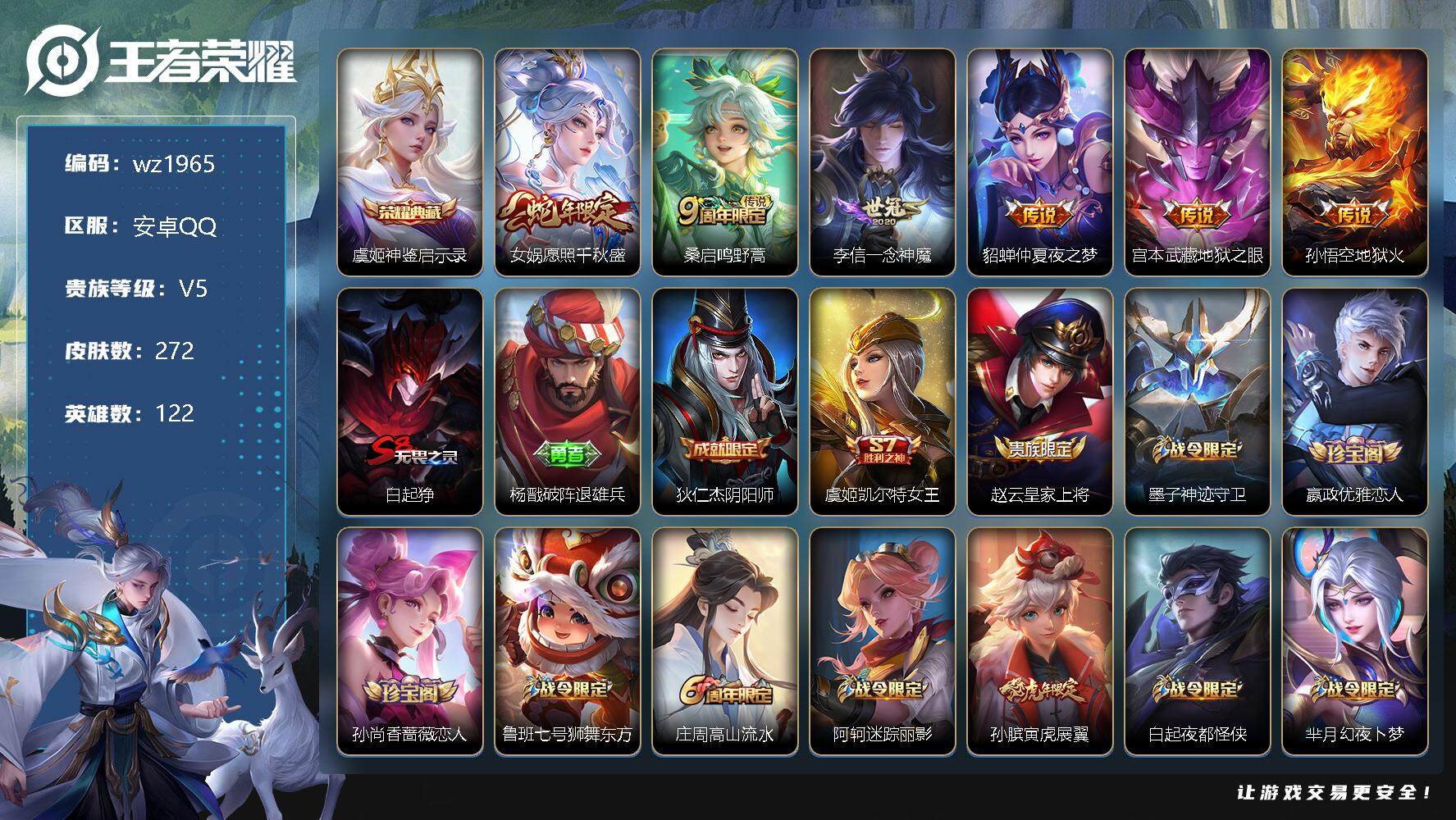 【游戏多多】 【可二次实名】【wz1965】安卓Q-V5-永恒钻石III段位-122英雄-272皮肤-1典藏-0珍品无双-0无双-0珍品传说-6传说-78史诗 【英雄全皮】:刘邦全皮,猪八戒全皮,蒙恬全皮,影全皮 【荣耀典藏】:虞姬神鉴启示录 【传说皮肤】:女娲愿照千秋盛,桑启鸣野蒿,李信一念神魔,貂蝉仲夏夜之梦,宫本武藏地狱之眼,孙悟空地狱火 【限定皮肤】:白起狰,杨戬破阵退雄兵,狄仁杰阴阳师,虞姬凯尔特女王,赵云皇家上将,墨子神迹守卫,嬴政优雅恋人,孙尚香蔷薇恋人,鲁班七号狮舞东方,庄周高山流水,阿轲迷踪丽影,孙膑寅虎展翼,白起夜都怪侠,芈月幻夜卜梦,吕布猎兽之王,元歌无心,夏侯惇朔风刀,曹操烛龙,典韦穷奇,典韦蓝屏警告,马可波罗暗影游猎,狄仁杰魔术师,狄仁杰万华元夜,达摩星际陆战队,达摩沙漠行僧,项羽海滩派对,老夫子醍醐杖,老夫子航海奇遇记,程咬金演武夺筹,刘邦夺宝奇兵,韩信傲雪梅枪,兰陵王金庭之子,牛魔御旌,后羿圣弓游侠,李元芳银河之约,李元芳云中旅人,钟馗神迹守卫,钟馗驱傩正仪,杨玉环遇见飞天,干将莫邪冰霜恋舞曲,干将莫邪真爱魔法,雅典娜黎明之约,蔡文姬繁星吟游,太乙真人饕餮,鬼谷子原初探秘者,鬼谷子五谷丰年,黄忠火炮绅士,苏烈千军破阵,百里玄策原初追逐者,弈星混沌棋,梦奇顽趣,沈梦溪星空之诺,沈梦溪大漠名商,明世隐疑决卦,明世隐吟游魔法,裴擒虎李小龙,裴擒虎擒涛扼浪,米莱狄胡桃异想国,云中君纤云弄巧,盾山御銮,猪八戒西部大镖客,猪八戒猪悟能,上官婉儿梁祝,嫦娥拒霜思,鲁班大师探海日志,桑启海盐诗旅,艾琳女武神,阿古朵江河有灵,张良古海寻踪,蒙犽百解令,蒙恬荣光圣徽,高渐离燃音魔法,妲己灵卜魔法,鬼谷子天穹祈灯,沈梦溪龙舞盛年,鲁班七号蔬乡物语,李元芳蔬乡物语,刘邦剑破天穹,程咬金群星魔术团,周瑜熔金海岸 【年限皮肤】:孙膑寅虎展翼 【赛季限定】:白起狰,夏侯惇朔风刀,曹操烛龙,典韦穷奇,狄仁杰万华元夜,达摩沙漠行僧,老夫子醍醐杖,程咬金演武夺筹,兰陵王金庭之子,张良古海寻踪,牛魔御旌,李元芳云中旅人,虞姬凯尔特女王,钟馗驱傩正仪,雅典娜黎明之约,太乙真人饕餮,鬼谷子原初探秘者,苏烈千军破阵,百里玄策原初追逐者,弈星混沌棋,梦奇顽趣,沈梦溪大漠名商,明世隐疑决卦,裴擒虎擒涛扼浪,盾山御銮,鲁班大师探海日志,桑启海盐诗旅,鬼谷子天穹祈灯,蒙恬荣光圣徽,刘邦剑破天穹 【战令限定】:墨子神迹守卫,鲁班七号狮舞东方,阿轲迷踪丽影,白起夜都怪侠,芈月幻夜卜梦,吕布猎兽之王,典韦蓝屏警告,马可波罗暗影游猎,达摩星际陆战队,老夫子航海奇遇记,刘邦夺宝奇兵,后羿圣弓游侠,李元芳银河之约,钟馗神迹守卫,干将莫邪真爱魔法,黄忠火炮绅士,沈梦溪星空之诺,明世隐吟游魔法,米莱狄胡桃异想国,猪八戒西部大镖客,高渐离燃音魔法,妲己灵卜魔法,鲁班七号蔬乡物语,李元芳蔬乡物语 【史诗皮肤】:露娜紫霞仙子,阿轲暗夜猫娘,赵云皇家上将,貂蝉圣诞恋歌,甄姬冰雪圆舞曲,王昭君偶像歌手,狄仁杰魔术师,廉颇地狱岩魂,宫本武藏鬼剑武藏,孙尚香蔷薇恋人,孙尚香水果甜心,嬴政优雅恋人,嬴政暗夜贵公子,妲己魅力维加斯,妲己女仆咖啡,墨子龙骑士,墨子金属风暴,刘禅绅士熊喵,曹操幽灵船长,李白千年之狐,吕布末日机甲,张飞乱世虎臣,花木兰水晶猎龙者,刘邦德古拉伯爵,夏侯惇乘风破浪,小乔缤纷独角兽,兰陵王暗隐猎兽者,亚瑟心灵战警,雅典娜冰冠公主,安琪拉心灵骇客,百里守约特工魅影,铠曙光守护者,蔡文姬舞动绿茵,刘禅天才门将,李元芳逐浪之夏,程咬金功夫厨神,阿轲节奏热浪,杨玉环遇见飞天,孙策猫狗日记,干将莫邪冰霜恋舞曲,典韦蓝屏警告,伽罗箭羽风息,鲁班七号狮舞东方,狄仁杰鹰眼统帅,公孙离无限星赏官,上官婉儿梁祝,蔡文姬繁星吟游,李元芳银河之约,娜可露露晚萤,阿轲迷踪丽影,孙尚香时之恋人,马可波罗暗影游猎,百里玄策原初追逐者,裴擒虎李小龙,云中君纤云弄巧,米莱狄胡桃异想国,老夫子航海奇遇记,干将莫邪真爱魔法,猪八戒猪悟能,庄周高山流水,嫦娥拒霜思,黄忠火炮绅士,雅典娜黎明之约,韩信傲雪梅枪,孙膑寅虎展翼,澜赏金猎手,明世隐吟游魔法,鬼谷子五谷丰年,元歌无心,梦奇顽趣,刘禅电玩爆裂旋风,阿古朵江河有灵,蒙犽百解令,周瑜雪夜绮愿,妲己灵卜魔法,高渐离燃音魔法,蒙恬荣光圣徽,鲁班七号蔬乡物语,赵怀真器灵浮梦炉 【其他皮肤】:项羽海滩派对,韩信教廷特使,韩信街头霸王,露娜哥特玫瑰,阿轲爱心护理,达摩大发明家,赵云白执事,赵云忍炎影,艾琳女武神,白起白色死神,牛魔西部大镖客,扁鹊化身博士,宫本武藏未来纪元,安琪拉玩偶对对碰,孙膑天使之翼,姜子牙时尚教父,妲己少女阿狸,典韦黄金武士,亚瑟死亡骑士,达摩拳王,花木兰兔女郎,张飞五福同心,甄姬花好人间,宫本武藏万象初新,后羿阿尔法小队,狄仁杰阴阳师,刘备纽约教父,刘备汉昭