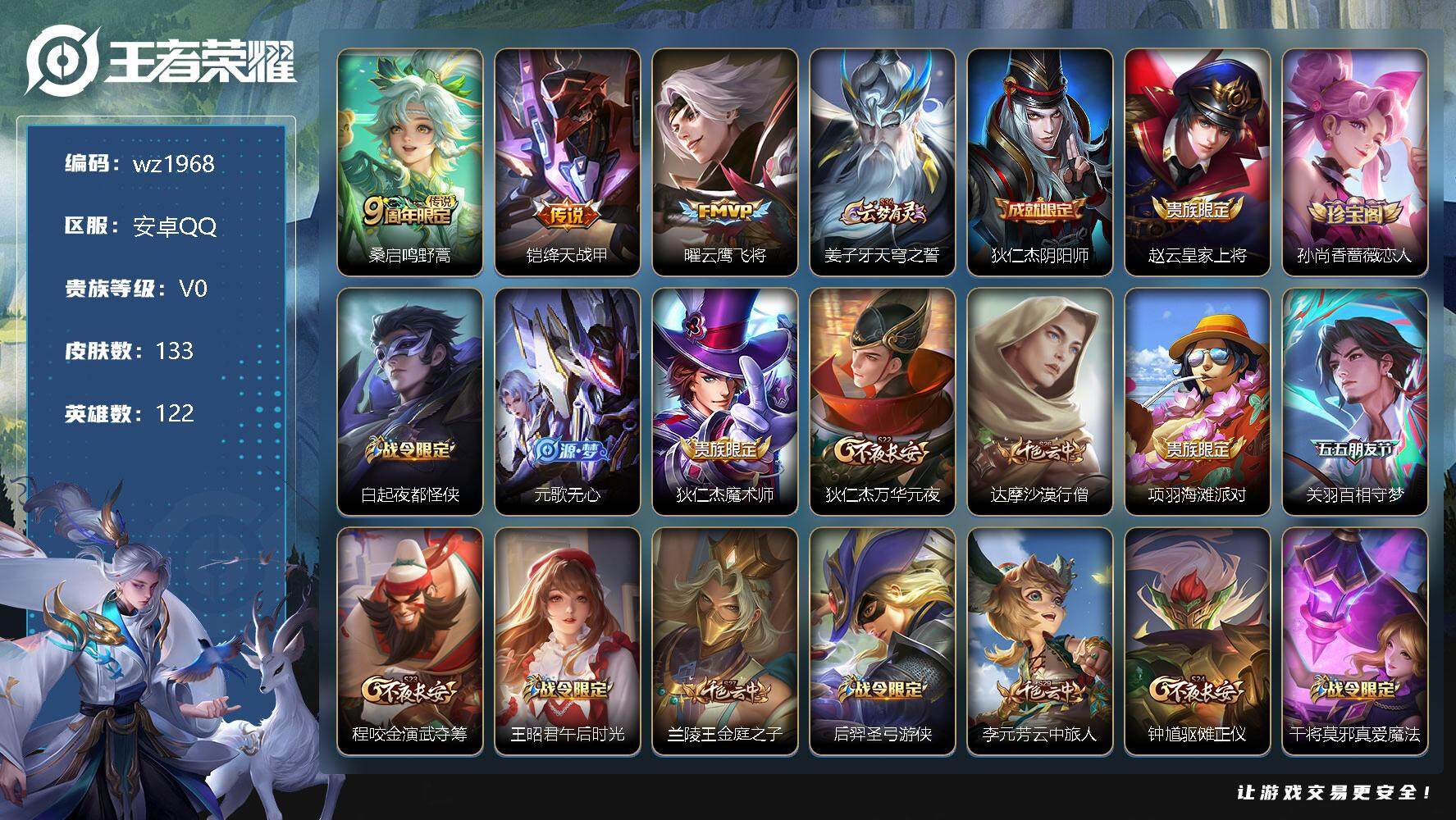 【游戏多多】 【可二次实名】【wz1968】安卓Q-V0-荣耀黄金IV段位-122英雄-133皮肤-0典藏-0珍品无双-0无双-0珍品传说-3传说-21史诗 【传说皮肤】:桑启鸣野蒿,铠绛天战甲,曜云鹰飞将 【限定皮肤】:姜子牙天穹之誓,狄仁杰阴阳师,赵云皇家上将,孙尚香蔷薇恋人,白起夜都怪侠,元歌无心,狄仁杰魔术师,狄仁杰万华元夜,达摩沙漠行僧,项羽海滩派对,关羽百相守梦,程咬金演武夺筹,王昭君午后时光,兰陵王金庭之子,后羿圣弓游侠,李元芳云中旅人,钟馗驱傩正仪,干将莫邪真爱魔法,鬼谷子五谷丰年,苏烈千军破阵,沈梦溪大漠名商,明世隐吟游魔法,裴擒虎李小龙,裴擒虎擒涛扼浪,狂铁电玩高手,嫦娥拒霜思,鲁班大师探海日志,桑启海盐诗旅,阿古朵江河有灵,张良古海寻踪,鬼谷子天穹祈灯,姬小满妄想食味,沈梦溪龙舞盛年,刘邦剑破天穹,程咬金群星魔术团,周瑜熔金海岸 【赛季限定】:狄仁杰万华元夜,达摩沙漠行僧,程咬金演武夺筹,兰陵王金庭之子,张良古海寻踪,李元芳云中旅人,钟馗驱傩正仪,苏烈千军破阵,沈梦溪大漠名商,裴擒虎擒涛扼浪,鲁班大师探海日志,桑启海盐诗旅,鬼谷子天穹祈灯,刘邦剑破天穹,姜子牙天穹之誓 【战令限定】:白起夜都怪侠,王昭君午后时光,后羿圣弓游侠,干将莫邪真爱魔法,明世隐吟游魔法,狂铁电玩高手 【史诗皮肤】:赵云皇家上将,甄姬冰雪圆舞曲,狄仁杰魔术师,宫本武藏鬼剑武藏,孙尚香蔷薇恋人,孙尚香水果甜心,妲己魅力维加斯,墨子金属风暴,孙策猫狗日记,狄仁杰鹰眼统帅,裴擒虎李小龙,干将莫邪真爱魔法,嫦娥拒霜思,明世隐吟游魔法,狂铁电玩高手,鬼谷子五谷丰年,元歌无心,关羽百相守梦,刘禅电玩爆裂旋风,阿古朵江河有灵,姬小满妄想食味 【其他皮肤】:项羽海滩派对,韩信教廷特使,韩信街头霸王,达摩大发明家,赵云白执事,赵云忍炎影,芈月红桃皇后,白起白色死神,牛魔西部大镖客,扁鹊化身博士,宫本武藏未来纪元,安琪拉玩偶对对碰,妲己少女阿狸,亚瑟死亡骑士,花木兰兔女郎,张飞五福同心,甄姬花好人间,刘备万事如意,狄仁杰阴阳师,墨子进击墨子号,钟无艳海滩丽影,狂铁命运角斗场,老夫子功夫老勺,孙尚香沉稳之力,诸葛亮掌控之力,鬼谷子幻乐之宴,苏烈坚韧之力,明世隐虹云星官,吕布野性能量,沈梦溪鲨炮海盗猫,姜子牙炽热元素使,哪吒次元突破,狂铁特工战影,狄仁杰万华元夜,刘禅秘密基地,程咬金演武夺筹,张良缤纷绘卷,钟馗驱傩正仪,鲁班大师乓乓大师,苏烈千军破阵,后羿圣弓游侠,典韦铁甲之心,马可波罗潮玩牛仔,达摩沙漠行僧,程咬金无双福将,白起夜都怪侠,兰陵王金庭之子,米莱狄契约魔法,王昭君午后时光,沈梦溪大漠名商,蒙犽胡桃狂想曲,蒙恬蔚蓝守将,李元芳云中旅人,戈娅危途狂花,桑启海盐诗旅,海月幻泉雾影,猪八戒潮玩探月行,赵怀真太极少年,裴擒虎擒涛扼浪,太乙真人劲辣红锅,莱西奥西部游侠,鲁班大师探海日志,李元芳妄想特派,张良古海寻踪,钟无艳聚星闪耀,曹操决胜大满贯,后羿完美运算,鬼谷子天穹祈灯,廉颇功夫炙烤,沈梦溪龙舞盛年,钟无艳春野之旅,刘邦剑破天穹,程咬金群星魔术团,姜子牙天穹之誓,周瑜熔金海岸,苍苍林狼骑,典韦铁骨偃魂,鲁班七号木偶奇遇记,露娜绯红之刃,貂蝉异域舞娘,老夫子潮流仙人,曹操超能战警,张良一千零一夜,小乔万圣前夜,孙膑未来旅行,孙悟空西部大镖客,李白范海辛,钟馗地府判官,刘邦圣殿之光,夏侯惇战争骑士,诸葛亮星航指挥官,黄忠芝加哥教父,铠龙域领主,百里守约绝影神枪,百里玄策威尼斯狂欢,苏烈爱与和平,明世隐占星师,公孙离花间舞,裴擒虎街头旋风,弈星踏雪寻梅,米莱狄精准探案法,伽罗花见巫女,李信灼热之刃,上官婉儿修竹墨客,曜归虚梦演,西施归虚梦演,澜孤猎,云缨赤焰之缨,桑启画中游 【内测皮肤】:孙尚香蔷薇恋人,狂铁特工战影 【营地ID】:1835465282