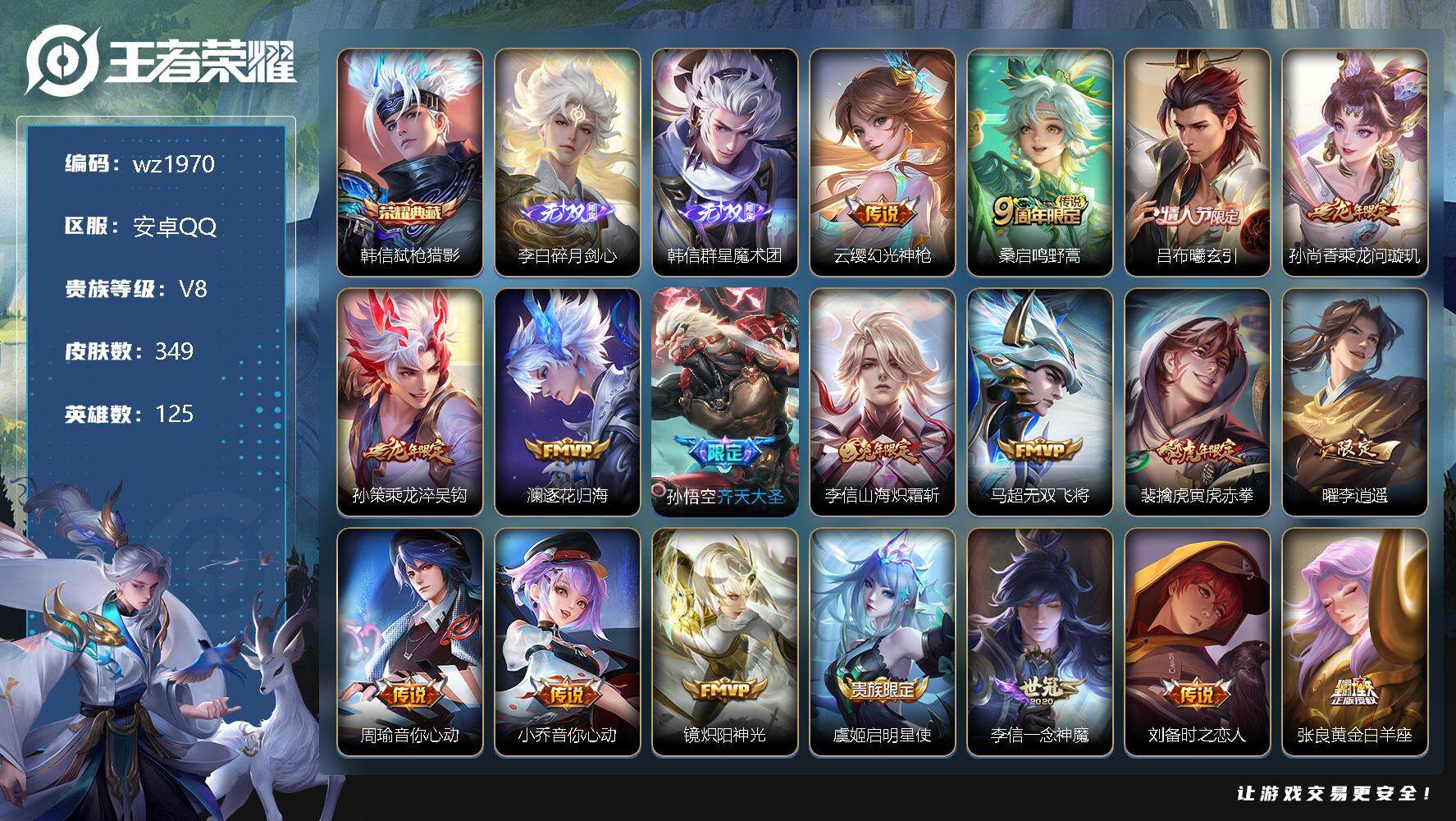 【游戏多多】 【可二次实名】【wz1970】安卓Q-V8-最强王者段位-125英雄-349皮肤-1典藏-0珍品无双-2无双-0珍品传说-21传说-100史诗 【英雄全皮】:韩信全皮,钟馗全皮,鬼谷子全皮,狂铁全皮,李信全皮,蒙恬全皮,空空儿全皮,影全皮 【荣耀典藏】:韩信弑枪猎影 【无双皮肤】:李白碎月剑心,韩信群星魔术团 【传说皮肤】:云缨幻光神枪,桑启鸣野蒿,吕布曦玄引,孙尚香乘龙问璇玑,孙策乘龙淬吴钩,澜逐花归海,孙悟空齐天大圣,李信山海炽霜斩,马超无双飞将,裴擒虎寅虎赤拳,曜李逍遥 ,周瑜音你心动,小乔音你心动,镜炽阳神光,虞姬启明星使,李信一念神魔,刘备时之恋人,张良黄金白羊座,百里玄策白虎志,貂蝉仲夏夜之梦,宫本武藏地狱之眼 【限定皮肤】:白起狰,大乔绒语心约,姜子牙天穹之誓,李白谪仙醉月,狄仁杰阴阳师,虞姬凯尔特女王,赵云皇家上将,嬴政白昼王子,孙尚香蔷薇恋人,鲁班七号狮舞东方,高渐离玩趣恶龙,芈月重明,吕布猎兽之王,夏侯惇朔风刀,曹操烛龙,典韦穷奇,典韦蓝屏警告,马可波罗暗影游猎,马可波罗山海玄木吟,狄仁杰魔术师,狄仁杰万华元夜,达摩沙漠行僧,项羽海滩派对,老夫子醍醐杖,程咬金演武夺筹,韩信逐梦之影,韩信飞衡,韩信傲雪梅枪,王昭君午后时光,兰陵王金庭之子,孙悟空齐天大圣,牛魔御旌,后羿辉光之辰,李元芳云中旅人,虞姬启明星使,钟馗神迹守卫,钟馗驱傩正仪,女娲朔望之晖,干将莫邪冰霜恋舞曲,雅典娜黎明之约,蔡文姬繁星吟游,太乙真人饕餮,太乙真人华丽摇滚,鬼谷子原初探秘者,鬼谷子五谷丰年,铠青龙志,百里玄策白虎志,百里玄策原初追逐者,弈星混沌棋,梦奇顽趣,沈梦溪大漠名商,明世隐疑决卦,裴擒虎天狼狩猎者,裴擒虎寅虎赤拳,裴擒虎擒涛扼浪,狂铁御狮,狂铁电玩高手,米莱狄御霄,云中君纤云弄巧,李信山海炽霜斩,盾山御銮,猪八戒西部大镖客,上官婉儿梁祝,嫦娥拒霜思,嫦娥暖冬兔眠,曜李逍遥 ,蒙犽狂想玩偶喵,鲁班大师探海日志,桑启海盐诗旅,暃星界游侠,艾琳流音漫舞,司空震地狱燃心,张良古海寻踪,蒙犽百解令,蒙恬荣光圣徽,高渐离燃音魔法,妲己灵卜魔法,鬼谷子天穹祈灯,李白碎月剑心,伽罗琥珀纪元,孙尚香乘龙问璇玑,孙策乘龙淬吴钩,吕布曦玄引,沈梦溪龙舞盛年,鲁班七号蔬乡物语,李元芳蔬乡物语,刘邦剑破天穹,程咬金群星魔术团,韩信群星魔术团,关羽决胜骁骑,镜青焰无极,项羽苍威无极,刘备异域游侠,周瑜熔金海岸 【年限皮肤】:百里玄策白虎志,铠青龙志,裴擒虎寅虎赤拳,后羿辉光之辰,韩信飞衡,马超神威,马可波罗山海玄木吟,李信山海炽霜斩,孙尚香乘龙问璇玑,孙策乘龙淬吴钩 【赛季限定】:白起狰,芈月重明,夏侯惇朔风刀,曹操烛龙,典韦穷奇,狄仁杰万华元夜,达摩沙漠行僧,老夫子醍醐杖,程咬金演武夺筹,兰陵王金庭之子,张良古海寻踪,牛魔御旌,李元芳云中旅人,虞姬凯尔特女王,钟馗驱傩正仪,雅典娜黎明之约,太乙真人饕餮,鬼谷子原初探秘者,百里玄策原初追逐者,弈星混沌棋,梦奇顽趣,沈梦溪大漠名商,明世隐疑决卦,裴擒虎擒涛扼浪,狂铁御狮,米莱狄御霄,盾山御銮,鲁班大师探海日志,桑启海盐诗旅,鬼谷子天穹祈灯,蒙恬荣光圣徽,刘邦剑破天穹,姜子牙天穹之誓 【战令限定】:嬴政白昼王子,鲁班七号狮舞东方,吕布猎兽之王,典韦蓝屏警告,马可波罗暗影游猎,王昭君午后时光,艾琳流音漫舞,钟馗神迹守卫,女娲朔望之晖,狂铁电玩高手,猪八戒西部大镖客,嫦娥暖冬兔眠,蒙犽狂想玩偶喵,司空震地狱燃心,暃星界游侠,高渐离燃音魔法,妲己灵卜魔法,鲁班七号蔬乡物语,李元芳蔬乡物语,镜青焰无极,项羽苍威无极 【史诗皮肤】:鲁班七号电玩小子,项羽苍穹之光,露娜紫霞仙子,赵云皇家上将,赵云未来纪元,貂蝉圣诞恋歌,甄姬冰雪圆舞曲,王昭君偶像歌手,狄仁杰魔术师,廉颇地狱岩魂,宫本武藏鬼剑武藏,孙尚香蔷薇恋人,孙尚香水果甜心,嬴政暗夜贵公子,嬴政摇滚巨星,妲己魅力维加斯,妲己女仆咖啡,墨子龙骑士,墨子金属风暴,吕布圣诞狂欢,刘禅绅士熊喵,曹操幽灵船长,李白千年之狐,吕布末日机甲,张飞乱世虎臣,韩信白龙吟,花木兰水晶猎龙者,刘邦德古拉伯爵,韩信逐梦之影,夏侯惇乘风破浪,小乔缤纷独角兽,兰陵王暗隐猎兽者,诸葛亮黄金分割率,亚瑟心灵战警,雅典娜冰冠公主,安琪拉心灵骇客,后羿辉光之辰,百里守约特工魅影,铠曙光守护者,蔡文姬舞动绿茵,刘禅天才门将,李元芳逐浪之夏,程咬金功夫厨神,白起星夜王子,阿轲节奏热浪,嬴政白昼王子,孙策猫狗日记,大乔猫狗日记,铠青龙志,干将莫邪冰霜恋舞曲,典韦蓝屏警告,伽罗箭羽风息,裴擒虎天狼狩猎者,鲁班七号狮舞东方,狄仁杰鹰眼统帅,公孙离无限星赏官,上官婉儿梁祝,蔡文姬繁星吟游,娜可露露晚萤,韩信飞衡,小乔青蛇,不知火舞魅语,橘右京修罗,马超神威,马可波罗暗影游猎,蒙犽狂想玩偶喵,百里玄策原初追逐者,云中君纤云弄巧,