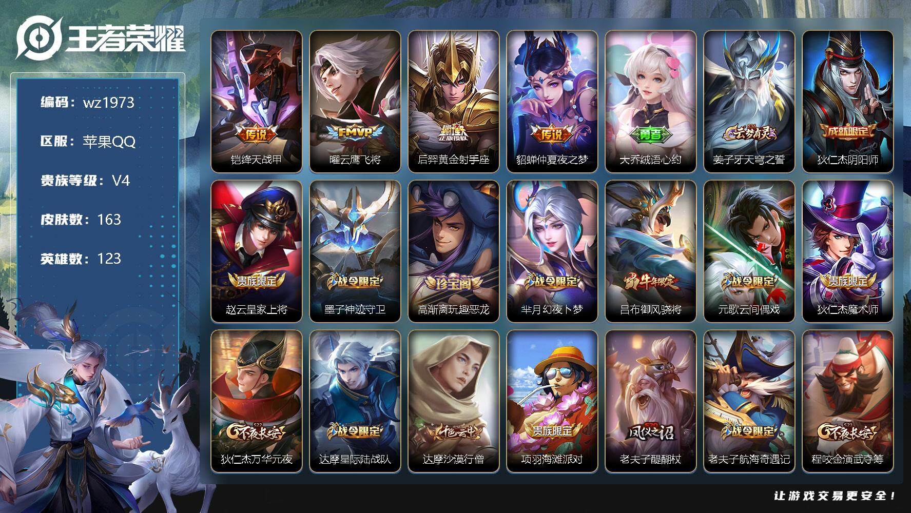 【游戏多多】 【可二次实名】【wz1973】苹果Q-V4-永恒钻石II段位-123英雄-163皮肤-0典藏-0珍品无双-0无双-0珍品传说-4传说-42史诗 【传说皮肤】:铠绛天战甲,曜云鹰飞将,后羿黄金射手座,貂蝉仲夏夜之梦 【限定皮肤】:大乔绒语心约,姜子牙天穹之誓,狄仁杰阴阳师,赵云皇家上将,墨子神迹守卫,高渐离玩趣恶龙,芈月幻夜卜梦,吕布御风骁将,元歌云间偶戏,狄仁杰魔术师,狄仁杰万华元夜,达摩星际陆战队,达摩沙漠行僧,项羽海滩派对,老夫子醍醐杖,老夫子航海奇遇记,程咬金演武夺筹,韩信逐梦之影,韩信飞衡,兰陵王金庭之子,花木兰默契交锋,亚瑟潮玩骑士王,孙悟空至尊宝,李元芳云中旅人,钟馗驱傩正仪,鬼谷子原初探秘者,苏烈千军破阵,沈梦溪大漠名商,裴擒虎李小龙,裴擒虎擒涛扼浪,米莱狄胡桃异想国,云中君纤云弄巧,伽罗天狼溯光者,上官婉儿梁祝,鲁班大师探海日志,桑启海盐诗旅,艾琳女武神,张良古海寻踪,鬼谷子天穹祈灯,伽罗琥珀纪元,百里玄策超元猎域,刘邦剑破天穹,程咬金群星魔术团,镜青焰无极,项羽苍威无极,周瑜熔金海岸 【年限皮肤】:吕布御风骁将,韩信飞衡 【赛季限定】:狄仁杰万华元夜,达摩沙漠行僧,老夫子醍醐杖,程咬金演武夺筹,兰陵王金庭之子,张良古海寻踪,李元芳云中旅人,钟馗驱傩正仪,鬼谷子原初探秘者,苏烈千军破阵,沈梦溪大漠名商,裴擒虎擒涛扼浪,鲁班大师探海日志,桑启海盐诗旅,鬼谷子天穹祈灯,刘邦剑破天穹,姜子牙天穹之誓 【战令限定】:墨子神迹守卫,芈月幻夜卜梦,元歌云间偶戏,达摩星际陆战队,老夫子航海奇遇记,亚瑟潮玩骑士王,米莱狄胡桃异想国,镜青焰无极,项羽苍威无极 【史诗皮肤】:赵云皇家上将,赵云未来纪元,甄姬冰雪圆舞曲,狄仁杰魔术师,宫本武藏鬼剑武藏,孙尚香水果甜心,嬴政暗夜贵公子,嬴政摇滚巨星,墨子金属风暴,张飞乱世虎臣,韩信白龙吟,孙悟空至尊宝,花木兰水晶猎龙者,韩信逐梦之影,夏侯惇乘风破浪,小乔缤纷独角兽,雅典娜冰冠公主,安琪拉心灵骇客,百里守约特工魅影,蔡文姬舞动绿茵,李元芳逐浪之夏,白起星夜王子,阿轲节奏热浪,孙策猫狗日记,大乔猫狗日记,狄仁杰鹰眼统帅,上官婉儿梁祝,韩信飞衡,橘右京修罗,裴擒虎李小龙,云中君纤云弄巧,元歌云间偶戏,吕布御风骁将,花木兰默契交锋,米莱狄胡桃异想国,老夫子航海奇遇记,伽罗天狼溯光者,夏洛特永昼,伽罗琥珀纪元,百里玄策超元猎域,镜青焰无极,狂铁龙之律动 【其他皮肤】:项羽海滩派对,韩信教廷特使,韩信街头霸王,露娜哥特玫瑰,阿轲爱心护理,达摩大发明家,赵云白执事,赵云忍炎影,艾琳女武神,白起白色死神,扁鹊救世之瞳,宫本武藏未来纪元,孙膑天使之翼,妲己少女阿狸,典韦黄金武士,达摩拳王,花木兰兔女郎,张飞五福同心,刘备万事如意,狄仁杰阴阳师,刘备纽约教父,刘备汉昭烈帝,关羽龙腾万里,钟无艳海滩丽影,宫本武藏霸王丸,狂铁命运角斗场,老夫子功夫老勺,孙尚香沉稳之力,诸葛亮掌控之力,李白敏锐之力,鬼谷子幻乐之宴,苏烈坚韧之力,明世隐虹云星官,庄周奇妙博物学,小乔丁香结,吕布野性能量,高渐离玩趣恶龙,沈梦溪鲨炮海盗猫,哪吒次元突破,老夫子醍醐杖,狂铁特工战影,鬼谷子原初探秘者,狄仁杰万华元夜,亚瑟潮玩骑士王,刘禅秘密基地,杨戬次元傲视,露娜瓷语鉴心,达摩星际陆战队,程咬金演武夺筹,张良缤纷绘卷,盘古重装意志,钟馗驱傩正仪,墨子神迹守卫,鲁班大师乓乓大师,苏烈千军破阵,妲己紫罗兰之誓,达摩沙漠行僧,芈月幻夜卜梦,程咬金无双福将,刘邦虎啸剑宗,兰陵王金庭之子,沈梦溪大漠名商,李元芳云中旅人,刘备潮玩造梦师,桑启海盐诗旅,猪八戒潮玩探月行,裴擒虎擒涛扼浪,鲁班大师探海日志,李元芳妄想特派,张良古海寻踪,后羿完美运算,鬼谷子天穹祈灯,廉颇功夫炙烤,刘邦剑破天穹,程咬金群星魔术团,项羽苍威无极,大司命暗都幽影,貂蝉长夏之忆,姜子牙天穹之誓,周瑜熔金海岸,大乔绒语心约,东皇太一噬灭天穹,干将莫邪雾都夜雨,姜子牙星梦巡礼,明世隐景韶洛都,钟馗虚灵犬护,白起死霸装,甄姬逆浪荇歌,庄周锦麟游梦,莱西奥踏浪烽翎,鲁班七号木偶奇遇记,花木兰剑舞者,狄仁杰锦衣卫,曹操超能战警,小乔万圣前夜,后羿精灵王,刘禅英喵野望,夏侯惇战争骑士,雅典娜战争女神,马可波罗激情绿茵,黄忠芝加哥教父,东皇太一东海龙王,铠龙域领主,女娲尼罗河女神,公孙离花间舞,弈星踏雪寻梅,盾山极冰防御线,伽罗花见巫女,李信灼热之刃,瑶森,云中君荷鲁斯之眼,西施归虚梦演,澜孤猎,司空震启蛰,云缨赤焰之缨,金蝉前尘,桑启画中游 【内测皮肤】:艾琳女武神,高渐离玩趣恶龙,狂铁特工战影 【营地ID】:1864920419