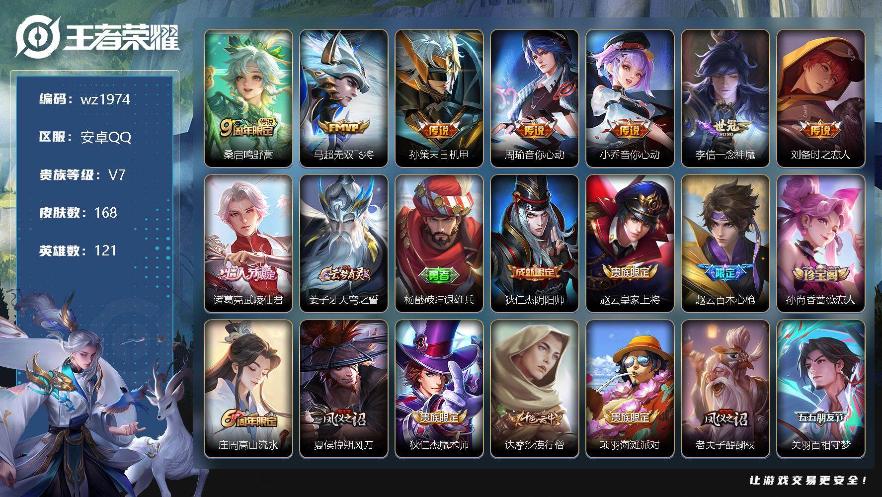 【游戏多多】 【可二次实名】【wz1974】安卓Q-V7-至尊星耀II段位-121英雄-168皮肤-0典藏-0珍品无双-0无双-0珍品传说-8传说-45史诗 【英雄全皮】:影全皮 【传说皮肤】:桑启鸣野蒿,马超无双飞将,孙策末日机甲,周瑜音你心动,小乔音你心动,李信一念神魔,刘备时之恋人,诸葛亮武陵仙君 【限定皮肤】:姜子牙天穹之誓,杨戬破阵退雄兵,狄仁杰阴阳师,赵云皇家上将,赵云百木心枪,孙尚香蔷薇恋人,庄周高山流水,夏侯惇朔风刀,狄仁杰魔术师,达摩沙漠行僧,项羽海滩派对,老夫子醍醐杖,关羽百相守梦,韩信飞衡,韩信傲雪梅枪,兰陵王金庭之子,花木兰瑞麟志,孙悟空至尊宝,李元芳银河之约,李元芳云中旅人,杨玉环遇见飞天,蔡文姬繁星吟游,鬼谷子原初探秘者,鬼谷子五谷丰年,诸葛亮武陵仙君,铠青龙志,苏烈千军破阵,百里玄策原初追逐者,弈星混沌棋,沈梦溪星空之诺,沈梦溪大漠名商,明世隐疑决卦,裴擒虎李小龙,裴擒虎擒涛扼浪,云中君纤云弄巧,猪八戒猪悟能,鲁班大师探海日志,桑启海盐诗旅,阿古朵江河有灵,张良古海寻踪,蒙恬荣光圣徽,鬼谷子天穹祈灯,姬小满妄想食味,刘邦剑破天穹,芈月浮光幕影,周瑜熔金海岸 【年限皮肤】:花木兰瑞麟志,铠青龙志,韩信飞衡 【赛季限定】:夏侯惇朔风刀,达摩沙漠行僧,老夫子醍醐杖,兰陵王金庭之子,张良古海寻踪,李元芳云中旅人,鬼谷子原初探秘者,苏烈千军破阵,百里玄策原初追逐者,弈星混沌棋,沈梦溪大漠名商,明世隐疑决卦,裴擒虎擒涛扼浪,鲁班大师探海日志,桑启海盐诗旅,鬼谷子天穹祈灯,蒙恬荣光圣徽,刘邦剑破天穹,姜子牙天穹之誓 【战令限定】:李元芳银河之约,沈梦溪星空之诺 【史诗皮肤】:赵云皇家上将,赵云未来纪元,貂蝉圣诞恋歌,甄姬冰雪圆舞曲,狄仁杰魔术师,廉颇地狱岩魂,宫本武藏鬼剑武藏,孙尚香蔷薇恋人,孙尚香水果甜心,墨子金属风暴,吕布圣诞狂欢,韩信白龙吟,孙悟空至尊宝,花木兰水晶猎龙者,小乔缤纷独角兽,兰陵王暗隐猎兽者,百里守约特工魅影,蔡文姬舞动绿茵,程咬金功夫厨神,白起星夜王子,杨玉环遇见飞天,铠青龙志,花木兰瑞麟志,狄仁杰鹰眼统帅,蔡文姬繁星吟游,李元芳银河之约,韩信飞衡,百里玄策原初追逐者,裴擒虎李小龙,云中君纤云弄巧,杨戬天秀启明,猪八戒猪悟能,庄周高山流水,韩信傲雪梅枪,赵云百木心枪,澜赏金猎手,鬼谷子五谷丰年,关羽百相守梦,阿古朵江河有灵,蒙恬荣光圣徽,姬小满妄想食味,芈月浮光幕影,牛魔星界战将,狂铁龙之律动,黄忠百相守梦 【其他皮肤】:项羽海滩派对,韩信教廷特使,韩信街头霸王,露娜哥特玫瑰,阿轲爱心护理,达摩大发明家,赵云忍炎影,芈月红桃皇后,白起白色死神,牛魔西部大镖客,武则天东方不败,扁鹊化身博士,扁鹊救世之瞳,宫本武藏未来纪元,孙膑天使之翼,妲己少女阿狸,典韦黄金武士,亚瑟死亡骑士,达摩拳王,张飞五福同心,甄姬花好人间,刘备万事如意,宫本武藏万象初新,后羿阿尔法小队,狄仁杰阴阳师,刘备纽约教父,刘备汉昭烈帝,关羽龙腾万里,墨子进击墨子号,狂铁命运角斗场,老夫子功夫老勺,牛魔制霸全明星,孙尚香沉稳之力,诸葛亮掌控之力,李白敏锐之力,苏烈坚韧之力,大乔守护之力,吕布野性能量,夏侯惇朔风刀,沈梦溪星空之诺,弈星混沌棋,哪吒次元突破,明世隐疑决卦,盾山圆桌骑士,老夫子醍醐杖,鬼谷子原初探秘者,刘禅秘密基地,苏烈千军破阵,达摩沙漠行僧,兰陵王金庭之子,米莱狄契约魔法,沈梦溪大漠名商,蒙犽胡桃狂想曲,蒙恬蔚蓝守将,李元芳云中旅人,桑启海盐诗旅,猪八戒潮玩探月行,裴擒虎擒涛扼浪,太乙真人劲辣红锅,鲁班大师探海日志,李元芳妄想特派,张良古海寻踪,后羿完美运算,鬼谷子天穹祈灯,嫦娥漠中幻影,廉颇功夫炙烤,刘邦剑破天穹,杨戬破阵退雄兵,姜子牙天穹之誓,周瑜熔金海岸,东皇太一噬灭天穹,干将莫邪雾都夜雨,苍苍林狼骑,太乙真人谧流熔炉,典韦铁骨偃魂,影魅影绮裳,西施雪境奇遇,姜子牙星梦巡礼,钟馗虚灵犬护,甄姬逆浪荇歌,莱西奥踏浪烽翎,哪吒罗小黑战记,鲁班七号福禄兄弟,鲁班七号木偶奇遇记,钟无艳生化警戒,王昭君精灵公主,曹操超能战警,张良一千零一夜,孙悟空西部大镖客,后羿精灵王,刘禅英喵野望,夏侯惇战争骑士,马可波罗激情绿茵,哪吒三太子,诸葛亮星航指挥官,黄忠芝加哥教父,大乔伊势巫女,干将莫邪第七人偶,鬼谷子阿摩司公爵,铠龙域领主,百里守约绝影神枪,百里玄策威尼斯狂欢,苏烈爱与和平,女娲尼罗河女神,明世隐占星师,裴擒虎街头旋风,孙策海之征途,司马懿魇语军师,李信灼热之刃,嫦娥露花倒影,马超幸存者,澜孤猎,司空震启蛰,暃碧珀绯影,桑启画中游 【内测皮肤】:孙尚香蔷薇恋人 【营地ID】:2129659727