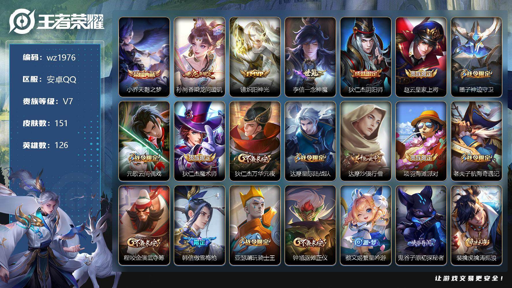 【游戏多多】 【可二次实名】【wz1976】安卓Q-V7-永恒钻石V段位-126英雄-151皮肤-1典藏-0珍品无双-0无双-0珍品传说-3传说-43史诗 【英雄全皮】:空空儿全皮 【荣耀典藏】:小乔天鹅之梦 【传说皮肤】:孙尚香乘龙问璇玑,镜炽阳神光,李信一念神魔 【限定皮肤】:狄仁杰阴阳师,赵云皇家上将,墨子神迹守卫,元歌云间偶戏,狄仁杰魔术师,狄仁杰万华元夜,达摩星际陆战队,达摩沙漠行僧,项羽海滩派对,老夫子航海奇遇记,程咬金演武夺筹,韩信傲雪梅枪,亚瑟潮玩骑士王,钟馗驱傩正仪,蔡文姬繁星吟游,鬼谷子原初探秘者,裴擒虎擒涛扼浪,米莱狄胡桃异想国,云中君纤云弄巧,上官婉儿梁祝,嫦娥拒霜思,西施玲珑珍味,鲁班大师探海日志,桑启海盐诗旅,戈娅驭风魔法,艾琳流音漫舞,司空震地狱燃心,阿古朵江河有灵,张良古海寻踪,蒙犽百解令,高渐离燃音魔法,妲己灵卜魔法,鬼谷子天穹祈灯,姬小满妄想食味,孙尚香乘龙问璇玑,沈梦溪龙舞盛年,鲁班七号蔬乡物语,李元芳蔬乡物语,项羽苍威无极 【年限皮肤】:孙尚香乘龙问璇玑 【赛季限定】:狄仁杰万华元夜,达摩沙漠行僧,程咬金演武夺筹,张良古海寻踪,钟馗驱傩正仪,鬼谷子原初探秘者,裴擒虎擒涛扼浪,鲁班大师探海日志,桑启海盐诗旅,鬼谷子天穹祈灯 【战令限定】:墨子神迹守卫,元歌云间偶戏,达摩星际陆战队,老夫子航海奇遇记,艾琳流音漫舞,亚瑟潮玩骑士王,米莱狄胡桃异想国,西施玲珑珍味,司空震地狱燃心,戈娅驭风魔法,高渐离燃音魔法,妲己灵卜魔法,鲁班七号蔬乡物语,李元芳蔬乡物语,项羽苍威无极 【史诗皮肤】:赵云皇家上将,貂蝉圣诞恋歌,甄姬冰雪圆舞曲,狄仁杰魔术师,宫本武藏鬼剑武藏,孙尚香水果甜心,妲己女仆咖啡,墨子金属风暴,吕布圣诞狂欢,刘禅绅士熊喵,曹操幽灵船长,花木兰水晶猎龙者,刘邦德古拉伯爵,夏侯惇乘风破浪,小乔缤纷独角兽,诸葛亮黄金分割率,百里守约特工魅影,铠曙光守护者,李元芳逐浪之夏,程咬金功夫厨神,白起星夜王子,伽罗箭羽风息,狄仁杰鹰眼统帅,上官婉儿梁祝,蔡文姬繁星吟游,不知火舞魅语,橘右京修罗,云中君纤云弄巧,元歌云间偶戏,米莱狄胡桃异想国,老夫子航海奇遇记,安琪拉时之奇旅,嫦娥拒霜思,韩信傲雪梅枪,戈娅驭风魔法,司空震地狱燃心,阿古朵江河有灵,蒙犽百解令,妲己灵卜魔法,高渐离燃音魔法,姬小满妄想食味,鲁班七号蔬乡物语,周瑜百相守梦,公孙离涂山容容 【其他皮肤】:项羽海滩派对,韩信街头霸王,阿轲爱心护理,赵云忍炎影,芈月红桃皇后,白起白色死神,扁鹊化身博士,安琪拉玩偶对对碰,孙膑天使之翼,姜子牙时尚教父,妲己少女阿狸,花木兰兔女郎,张飞五福同心,甄姬花好人间,刘备万事如意,狄仁杰阴阳师,刘备汉昭烈帝,关羽龙腾万里,王昭君幻想奇妙夜,孙尚香沉稳之力,诸葛亮掌控之力,苏烈坚韧之力,明世隐虹云星官,庄周奇妙博物学,孙膑归虚梦演,姜子牙炽热元素使,盾山圆桌骑士,狂铁特工战影,鬼谷子原初探秘者,狄仁杰万华元夜,亚瑟潮玩骑士王,露娜瓷语鉴心,达摩星际陆战队,程咬金演武夺筹,张良缤纷绘卷,钟馗驱傩正仪,墨子神迹守卫,鲁班大师乓乓大师,妲己紫罗兰之誓,达摩沙漠行僧,蒙恬蔚蓝守将,桑启海盐诗旅,猪八戒潮玩探月行,裴擒虎擒涛扼浪,太乙真人劲辣红锅,莱西奥西部游侠,鲁班大师探海日志,西施玲珑珍味,姬小满零食大作战,李元芳妄想特派,哪吒热血海滩,艾琳流音漫舞,张良古海寻踪,钟无艳聚星闪耀,海月王牌新星,亚连破局者,兰陵王幻夜行动,曹操决胜大满贯,后羿完美运算,程咬金暖冬絮语,鬼谷子天穹祈灯,妲己灵卜魔法,海诺时空谍影,朵莉亚金色潮汐,亚瑟鸿运当头,沈梦溪龙舞盛年,钟无艳春野之旅,李元芳蔬乡物语,扁鹊无尽旅途,盘古经纬探寻者,项羽苍威无极,钟馗虚灵犬护,甄姬逆浪荇歌,孙策百相守梦,空空儿戏梦巡演,莱西奥踏浪烽翎,鬼谷子克喵,哪吒罗小黑战记,高渐离金属狂潮,项羽帝国元帅,貂蝉异域舞娘,花木兰剑舞者,曹操超能战警,孙悟空西部大镖客,兰陵王隐刃,李元芳特种部队,刘邦圣殿之光,马可波罗激情绿茵,百里守约绝影神枪,百里玄策威尼斯狂欢,裴擒虎街头旋风,弈星踏雪寻梅,米莱狄精准探案法,元歌午夜歌剧院,沈梦溪棒球奇才,李信灼热之刃,盘古创世神祝,瑶森,曜归虚梦演,马超幸存者,镜冰刃幻境,澜孤猎,司空震启蛰,云缨赤焰之缨 【内测皮肤】:狂铁特工战影 【营地ID】:1857478013