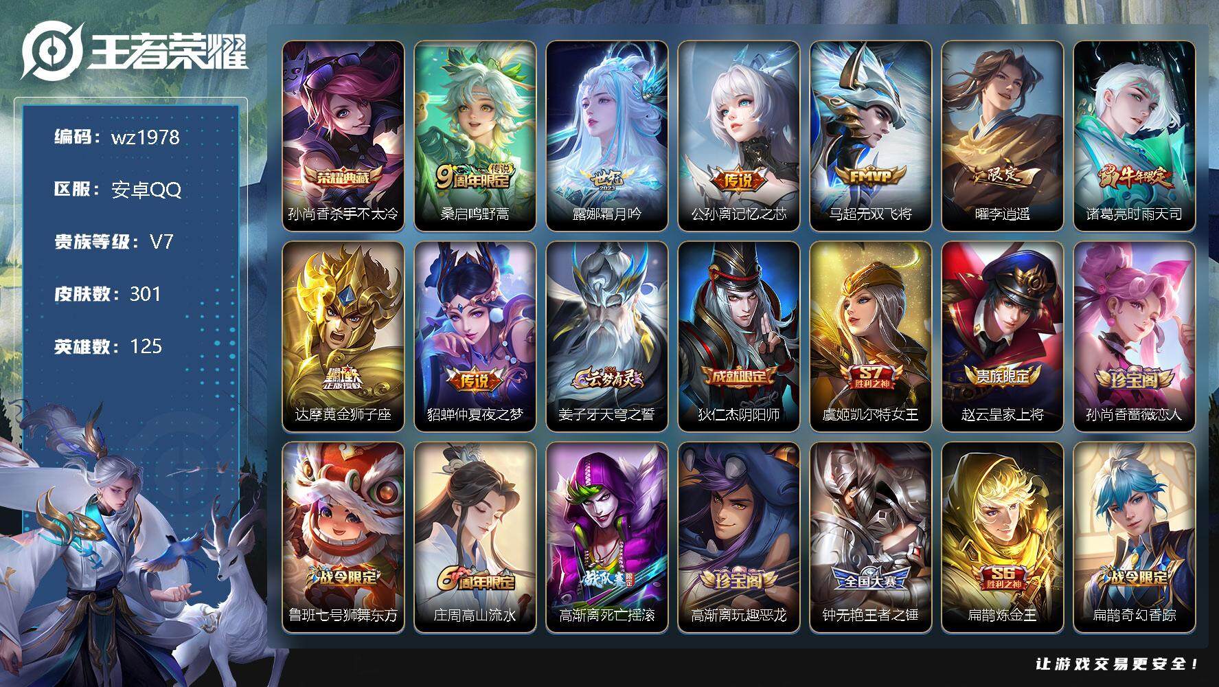 【游戏多多】 【可二次实名】【wz1978】安卓Q-V7-最强王者段位-125英雄-301皮肤-1典藏-0珍品无双-0无双-0珍品传说-8传说-77史诗 【英雄全皮】:钟馗全皮,鬼谷子全皮,蒙恬全皮 【荣耀典藏】:孙尚香杀手不太冷 【传说皮肤】:桑启鸣野蒿,露娜霜月吟,公孙离记忆之芯,马超无双飞将,曜李逍遥 ,诸葛亮时雨天司,达摩黄金狮子座,貂蝉仲夏夜之梦 【限定皮肤】:姜子牙天穹之誓,狄仁杰阴阳师,虞姬凯尔特女王,赵云皇家上将,孙尚香蔷薇恋人,鲁班七号狮舞东方,庄周高山流水,高渐离死亡摇滚,高渐离玩趣恶龙,钟无艳王者之锤,扁鹊炼金王,扁鹊奇幻香踪,白起夜都怪侠,芈月重明,芈月幻夜卜梦,吕布御风骁将,元歌云间偶戏,夏侯惇朔风刀,甄姬游园惊梦,曹操烛龙,典韦穷奇,马可波罗山海玄木吟,狄仁杰魔术师,狄仁杰万华元夜,达摩沙漠行僧,项羽海滩派对,老夫子醍醐杖,程咬金演武夺筹,韩信逐梦之影,韩信飞衡,韩信傲雪梅枪,兰陵王金庭之子,亚瑟潮玩骑士王,孙悟空至尊宝,孙悟空大圣娶亲,牛魔御旌,后羿圣弓游侠,李元芳银河之约,李元芳云中旅人,钟馗神迹守卫,钟馗驱傩正仪,杨玉环遇见飞天,杨戬潮玩骑兵,干将莫邪冰霜恋舞曲,干将莫邪真爱魔法,雅典娜单词大作战,蔡文姬繁星吟游,鬼谷子原初探秘者,鬼谷子五谷丰年,诸葛亮时雨天司,黄忠火炮绅士,铠青龙志,苏烈千军破阵,百里守约朱雀志,弈星混沌棋,沈梦溪星空之诺,沈梦溪大漠名商,明世隐疑决卦,明世隐吟游魔法,裴擒虎李小龙,裴擒虎擒涛扼浪,狂铁御狮,米莱狄御霄,云中君纤云弄巧,盾山御銮,上官婉儿梁祝,上官婉儿天狼绘梦者,嫦娥拒霜思,嫦娥暖冬兔眠,曜李逍遥 ,蒙犽狂想玩偶喵,鲁班大师探海日志,桑启海盐诗旅,暃星界游侠,艾琳女武神,阿古朵江河有灵,张良古海寻踪,蒙犽百解令,蒙恬荣光圣徽,鬼谷子天穹祈灯,沈梦溪龙舞盛年,鲁班七号蔬乡物语,刘邦剑破天穹,程咬金群星魔术团 【年限皮肤】:百里守约朱雀志,铠青龙志,吕布御风骁将,诸葛亮时雨天司,韩信飞衡,马可波罗山海玄木吟 【赛季限定】:扁鹊炼金王,芈月重明,夏侯惇朔风刀,曹操烛龙,典韦穷奇,狄仁杰万华元夜,达摩沙漠行僧,老夫子醍醐杖,程咬金演武夺筹,兰陵王金庭之子,张良古海寻踪,牛魔御旌,李元芳云中旅人,虞姬凯尔特女王,钟馗驱傩正仪,鬼谷子原初探秘者,苏烈千军破阵,弈星混沌棋,沈梦溪大漠名商,明世隐疑决卦,裴擒虎擒涛扼浪,狂铁御狮,米莱狄御霄,盾山御銮,鲁班大师探海日志,桑启海盐诗旅,鬼谷子天穹祈灯,蒙恬荣光圣徽,刘邦剑破天穹,姜子牙天穹之誓 【战令限定】:鲁班七号狮舞东方,扁鹊奇幻香踪,白起夜都怪侠,芈月幻夜卜梦,元歌云间偶戏,亚瑟潮玩骑士王,后羿圣弓游侠,李元芳银河之约,钟馗神迹守卫,杨戬潮玩骑兵,干将莫邪真爱魔法,雅典娜单词大作战,黄忠火炮绅士,沈梦溪星空之诺,明世隐吟游魔法,嫦娥暖冬兔眠,蒙犽狂想玩偶喵,暃星界游侠,鲁班七号蔬乡物语 【史诗皮肤】:鲁班七号电玩小子,露娜紫霞仙子,钟无艳王者之锤,赵云皇家上将,甄姬冰雪圆舞曲,王昭君偶像歌手,狄仁杰魔术师,宫本武藏鬼剑武藏,孙尚香蔷薇恋人,孙尚香水果甜心,嬴政摇滚巨星,妲己魅力维加斯,妲己女仆咖啡,墨子龙骑士,墨子金属风暴,吕布圣诞狂欢,李白千年之狐,张飞乱世虎臣,韩信白龙吟,孙悟空至尊宝,花木兰水晶猎龙者,刘邦德古拉伯爵,韩信逐梦之影,夏侯惇乘风破浪,小乔缤纷独角兽,兰陵王暗隐猎兽者,甄姬游园惊梦,亚瑟心灵战警,雅典娜冰冠公主,安琪拉心灵骇客,李元芳逐浪之夏,程咬金功夫厨神,阿轲节奏热浪,杨玉环遇见飞天,铠青龙志,百里守约朱雀志,干将莫邪冰霜恋舞曲,孙悟空大圣娶亲,伽罗箭羽风息,鲁班七号狮舞东方,狄仁杰鹰眼统帅,上官婉儿梁祝,蔡文姬繁星吟游,李元芳银河之约,韩信飞衡,不知火舞魅语,橘右京修罗,上官婉儿天狼绘梦者,蒙犽狂想玩偶喵,裴擒虎李小龙,云中君纤云弄巧,元歌云间偶戏,吕布御风骁将,干将莫邪真爱魔法,钟馗乐园奇幻夜,庄周高山流水,嫦娥拒霜思,黄忠火炮绅士,韩信傲雪梅枪,澜赏金猎手,明世隐吟游魔法,鬼谷子五谷丰年,暃星界游侠,马可波罗山海玄木吟,扁鹊奇幻香踪,刘禅电玩爆裂旋风,阿古朵江河有灵,蒙犽百解令,蒙恬荣光圣徽,鲁班七号蔬乡物语,亚连破空之剑,刘禅鸭鸭历险记,狂铁龙之律动,后羿石田雨龙,周瑜百相守梦,黄忠百相守梦,公孙离涂山容容 【其他皮肤】:项羽海滩派对,韩信教廷特使,韩信街头霸王,露娜哥特玫瑰,阿轲致命风华,阿轲爱心护理,达摩大发明家,赵云白执事,赵云忍炎影,芈月红桃皇后,艾琳女武神,白起白色死神,牛魔西部大镖客,武则天东方不败,扁鹊化身博士,扁鹊救世之瞳,宫本武藏未来纪元,安琪拉玩偶对对碰,孙膑天使之翼,姜子牙时尚教父,妲己少女阿狸,典韦黄金武士,亚瑟死亡骑士,达摩拳王,花木兰兔女郎,张飞五福同心,甄姬花好人间,刘备万事如意,宫本