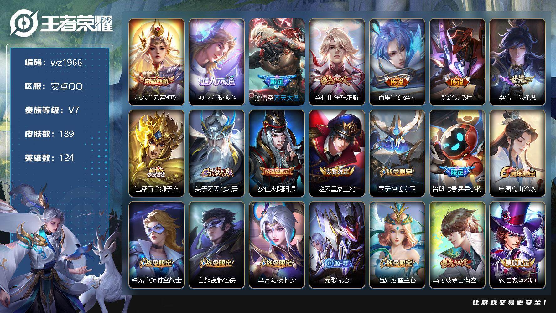 【游戏多多】 【可二次实名】【wz1966】安卓Q-V7-最强王者段位-124英雄-189皮肤-1典藏-0珍品无双-0无双-0珍品传说-7传说-52史诗 【英雄全皮】:李信全皮,蒙恬全皮,戈娅全皮 【荣耀典藏】:花木兰九霄神辉 【传说皮肤】:项羽无限倾心,孙悟空齐天大圣,李信山海炽霜斩,百里守约碎云,铠绛天战甲,李信一念神魔,达摩黄金狮子座 【限定皮肤】:姜子牙天穹之誓,狄仁杰阴阳师,赵云皇家上将,墨子神迹守卫,鲁班七号乒乒小将,庄周高山流水,钟无艳超时空战士,白起夜都怪侠,芈月幻夜卜梦,元歌无心,甄姬落雪兰心,马可波罗山海玄木吟,狄仁杰魔术师,狄仁杰万华元夜,达摩沙漠行僧,项羽海滩派对,项羽无限倾心,老夫子醍醐杖,老夫子航海奇遇记,王昭君午后时光,兰陵王金庭之子,孙悟空齐天大圣,后羿圣弓游侠,李元芳云中旅人,钟馗驱傩正仪,杨玉环遇见飞天,干将莫邪真爱魔法,雅典娜黎明之约,鬼谷子原初探秘者,鬼谷子五谷丰年,黄忠火炮绅士,苏烈千军破阵,百里玄策原初追逐者,梦奇顽趣,沈梦溪大漠名商,明世隐吟游魔法,裴擒虎李小龙,裴擒虎擒涛扼浪,狂铁电玩高手,李信山海炽霜斩,上官婉儿梁祝,嫦娥暖冬兔眠,西施玲珑珍味,鲁班大师探海日志,桑启海盐诗旅,暃星界游侠,戈娅驭风魔法,艾琳女武神,张良古海寻踪,蒙恬荣光圣徽,鬼谷子天穹祈灯,姬小满妄想食味,刘邦剑破天穹,程咬金群星魔术团 【年限皮肤】:马超神威,马可波罗山海玄木吟,李信山海炽霜斩 【赛季限定】:狄仁杰万华元夜,达摩沙漠行僧,老夫子醍醐杖,兰陵王金庭之子,张良古海寻踪,李元芳云中旅人,钟馗驱傩正仪,雅典娜黎明之约,鬼谷子原初探秘者,苏烈千军破阵,百里玄策原初追逐者,梦奇顽趣,沈梦溪大漠名商,裴擒虎擒涛扼浪,鲁班大师探海日志,桑启海盐诗旅,鬼谷子天穹祈灯,蒙恬荣光圣徽,刘邦剑破天穹,姜子牙天穹之誓 【战令限定】:墨子神迹守卫,钟无艳超时空战士,白起夜都怪侠,芈月幻夜卜梦,甄姬落雪兰心,老夫子航海奇遇记,王昭君午后时光,后羿圣弓游侠,干将莫邪真爱魔法,黄忠火炮绅士,明世隐吟游魔法,狂铁电玩高手,嫦娥暖冬兔眠,西施玲珑珍味,暃星界游侠,戈娅驭风魔法 【史诗皮肤】:项羽苍穹之光,赵云皇家上将,赵云未来纪元,甄姬冰雪圆舞曲,狄仁杰魔术师,廉颇地狱岩魂,宫本武藏鬼剑武藏,孙尚香水果甜心,嬴政摇滚巨星,妲己女仆咖啡,墨子金属风暴,曹操幽灵船长,李白千年之狐,吕布末日机甲,花木兰水晶猎龙者,刘邦德古拉伯爵,夏侯惇乘风破浪,小乔缤纷独角兽,诸葛亮黄金分割率,雅典娜冰冠公主,百里守约特工魅影,刘禅天才门将,李元芳逐浪之夏,程咬金功夫厨神,白起星夜王子,杨玉环遇见飞天,狄仁杰鹰眼统帅,上官婉儿梁祝,橘右京修罗,马超神威,百里玄策原初追逐者,裴擒虎李小龙,老夫子航海奇遇记,鲁班七号乒乒小将,干将莫邪真爱魔法,安琪拉时之奇旅,庄周高山流水,黄忠火炮绅士,雅典娜黎明之约,明世隐吟游魔法,狂铁电玩高手,钟无艳超时空战士,鬼谷子五谷丰年,元歌无心,梦奇顽趣,暃星界游侠,马可波罗山海玄木吟,戈娅驭风魔法,周瑜雪夜绮愿,蒙恬荣光圣徽,姬小满妄想食味,阿轲化蝶舞 【其他皮肤】:项羽海滩派对,韩信教廷特使,韩信街头霸王,露娜哥特玫瑰,达摩大发明家,赵云忍炎影,芈月红桃皇后,艾琳女武神,白起白色死神,牛魔西部大镖客,安琪拉玩偶对对碰,妲己少女阿狸,花木兰兔女郎,张飞五福同心,甄姬花好人间,刘备万事如意,宫本武藏万象初新,后羿阿尔法小队,狄仁杰阴阳师,刘备纽约教父,刘备汉昭烈帝,关羽龙腾万里,钟无艳海滩丽影,宫本武藏霸王丸,王昭君幻想奇妙夜,老夫子功夫老勺,孙尚香沉稳之力,诸葛亮掌控之力,李白敏锐之力,鬼谷子幻乐之宴,大乔守护之力,明世隐虹云星官,小乔丁香结,吕布野性能量,孙膑归虚梦演,沈梦溪鲨炮海盗猫,哪吒次元突破,盾山圆桌骑士,老夫子醍醐杖,狂铁特工战影,鬼谷子原初探秘者,狄仁杰万华元夜,刘禅秘密基地,杨戬次元傲视,钟馗驱傩正仪,墨子神迹守卫,鲁班大师乓乓大师,苏烈千军破阵,后羿圣弓游侠,马可波罗潮玩牛仔,达摩沙漠行僧,芈月幻夜卜梦,程咬金无双福将,白起夜都怪侠,兰陵王金庭之子,刘禅唤灵魔甲,王昭君午后时光,沈梦溪大漠名商,蒙恬蔚蓝守将,甄姬落雪兰心,李元芳云中旅人,戈娅危途狂花,桑启海盐诗旅,嫦娥暖冬兔眠,猪八戒潮玩探月行,牛魔牛运亨通,赵怀真太极少年,裴擒虎擒涛扼浪,太乙真人劲辣红锅,鲁班大师探海日志,西施玲珑珍味,姬小满零食大作战,李元芳妄想特派,哪吒热血海滩,张良古海寻踪,后羿完美运算,鬼谷子天穹祈灯,廉颇功夫炙烤,刘邦剑破天穹,程咬金群星魔术团,姜子牙天穹之誓,苍苍林狼骑,太乙真人谧流熔炉,西施雪境奇遇,姜子牙星梦巡礼,东皇太一金福满堂,少司缘灵卦秘语,戈娅玫蓝誓约,钟馗虚灵犬护,露娜命运加冕,甄姬逆浪荇歌,鲁班七号福禄兄弟,高渐离金属狂潮,露娜绯红