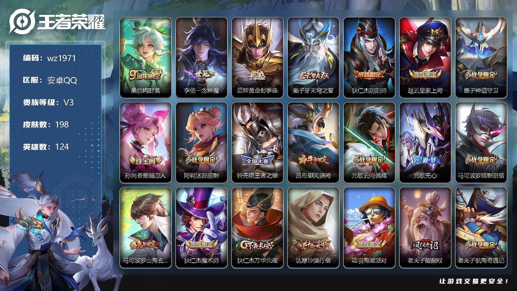【游戏多多】 【可二次实名】【wz1971】安卓Q-V3-至尊星耀V段位-124英雄-198皮肤-0典藏-0珍品无双-0无双-0珍品传说-3传说-63史诗 【传说皮肤】:桑启鸣野蒿,李信一念神魔,后羿黄金射手座 【限定皮肤】:姜子牙天穹之誓,狄仁杰阴阳师,赵云皇家上将,墨子神迹守卫,孙尚香蔷薇恋人,阿轲迷踪丽影,钟无艳王者之锤,吕布御风骁将,元歌云间偶戏,元歌无心,马可波罗暗影游猎,马可波罗山海玄木吟,狄仁杰魔术师,狄仁杰万华元夜,达摩沙漠行僧,项羽海滩派对,老夫子醍醐杖,老夫子航海奇遇记,程咬金演武夺筹,刘邦夺宝奇兵,韩信逐梦之影,兰陵王金庭之子,亚瑟潮玩骑士王,后羿圣弓游侠,李元芳银河之约,李元芳云中旅人,钟馗驱傩正仪,干将莫邪冰霜恋舞曲,干将莫邪胡桃夹子,雅典娜单词大作战,雅典娜黎明之约,鬼谷子原初探秘者,鬼谷子五谷丰年,黄忠烈魂,苏烈千军破阵,百里玄策原初追逐者,百里守约朱雀志,弈星混沌棋,梦奇顽趣,公孙离蜜橘之夏,沈梦溪星空之诺,沈梦溪大漠名商,明世隐疑决卦,裴擒虎李小龙,裴擒虎擒涛扼浪,云中君纤云弄巧,猪八戒西部大镖客,上官婉儿天狼绘梦者,蒙犽狂想玩偶喵,鲁班大师探海日志,桑启海盐诗旅,张良古海寻踪,蒙恬荣光圣徽,鬼谷子天穹祈灯,伽罗琥珀纪元,刘邦剑破天穹 【年限皮肤】:百里守约朱雀志,吕布御风骁将,马超神威,黄忠烈魂,马可波罗山海玄木吟 【赛季限定】:狄仁杰万华元夜,达摩沙漠行僧,老夫子醍醐杖,程咬金演武夺筹,兰陵王金庭之子,张良古海寻踪,李元芳云中旅人,钟馗驱傩正仪,雅典娜黎明之约,鬼谷子原初探秘者,苏烈千军破阵,百里玄策原初追逐者,弈星混沌棋,梦奇顽趣,沈梦溪大漠名商,明世隐疑决卦,裴擒虎擒涛扼浪,鲁班大师探海日志,桑启海盐诗旅,鬼谷子天穹祈灯,蒙恬荣光圣徽,刘邦剑破天穹,姜子牙天穹之誓 【战令限定】:墨子神迹守卫,阿轲迷踪丽影,元歌云间偶戏,马可波罗暗影游猎,老夫子航海奇遇记,刘邦夺宝奇兵,亚瑟潮玩骑士王,后羿圣弓游侠,李元芳银河之约,雅典娜单词大作战,沈梦溪星空之诺,猪八戒西部大镖客,蒙犽狂想玩偶喵 【史诗皮肤】:露娜紫霞仙子,钟无艳王者之锤,赵云皇家上将,甄姬冰雪圆舞曲,王昭君偶像歌手,狄仁杰魔术师,廉颇地狱岩魂,宫本武藏鬼剑武藏,孙尚香蔷薇恋人,孙尚香水果甜心,嬴政摇滚巨星,妲己魅力维加斯,墨子金属风暴,吕布圣诞狂欢,曹操幽灵船长,吕布末日机甲,张飞乱世虎臣,韩信白龙吟,花木兰水晶猎龙者,刘邦德古拉伯爵,韩信逐梦之影,小乔缤纷独角兽,兰陵王暗隐猎兽者,诸葛亮黄金分割率,亚瑟心灵战警,雅典娜冰冠公主,安琪拉心灵骇客,百里守约特工魅影,铠曙光守护者,公孙离蜜橘之夏,李元芳逐浪之夏,程咬金功夫厨神,白起星夜王子,阿轲节奏热浪,孙策猫狗日记,百里守约朱雀志,干将莫邪冰霜恋舞曲,伽罗箭羽风息,狄仁杰鹰眼统帅,公孙离无限星赏官,李元芳银河之约,不知火舞魅语,阿轲迷踪丽影,橘右京修罗,马超神威,黄忠烈魂,上官婉儿天狼绘梦者,马可波罗暗影游猎,蒙犽狂想玩偶喵,百里玄策原初追逐者,裴擒虎李小龙,云中君纤云弄巧,元歌云间偶戏,吕布御风骁将,老夫子航海奇遇记,雅典娜黎明之约,鬼谷子五谷丰年,元歌无心,梦奇顽趣,马可波罗山海玄木吟,蒙恬荣光圣徽,伽罗琥珀纪元,牛魔星界战将 【其他皮肤】:项羽海滩派对,韩信教廷特使,韩信街头霸王,露娜哥特玫瑰,阿轲爱心护理,赵云忍炎影,芈月红桃皇后,白起白色死神,武则天东方不败,扁鹊化身博士,扁鹊救世之瞳,宫本武藏未来纪元,孙膑天使之翼,妲己少女阿狸,典韦黄金武士,亚瑟死亡骑士,达摩拳王,花木兰兔女郎,刘备万事如意,宫本武藏万象初新,后羿阿尔法小队,狄仁杰阴阳师,刘备纽约教父,刘备汉昭烈帝,关羽龙腾万里,钟无艳海滩丽影,狂铁命运角斗场,老夫子功夫老勺,孙尚香沉稳之力,诸葛亮掌控之力,鬼谷子幻乐之宴,苏烈坚韧之力,大乔守护之力,项羽科学大爆炸,明世隐虹云星官,孙膑归虚梦演,沈梦溪鲨炮海盗猫,姜子牙炽热元素使,沈梦溪星空之诺,弈星混沌棋,哪吒次元突破,明世隐疑决卦,刘邦夺宝奇兵,盾山圆桌骑士,老夫子醍醐杖,猪八戒西部大镖客,鬼谷子原初探秘者,雅典娜单词大作战,狄仁杰万华元夜,亚瑟潮玩骑士王,刘禅秘密基地,杨戬次元傲视,露娜瓷语鉴心,程咬金演武夺筹,张良缤纷绘卷,盘古重装意志,钟馗驱傩正仪,墨子神迹守卫,鲁班大师乓乓大师,苏烈千军破阵,后羿圣弓游侠,典韦铁甲之心,干将莫邪胡桃夹子,达摩沙漠行僧,程咬金无双福将,刘邦虎啸剑宗,兰陵王金庭之子,刘禅唤灵魔甲,沈梦溪大漠名商,蒙恬蔚蓝守将,李元芳云中旅人,桑启海盐诗旅,猪八戒潮玩探月行,裴擒虎擒涛扼浪,莱西奥西部游侠,鲁班大师探海日志,张良古海寻踪,钟无艳聚星闪耀,鬼谷子天穹祈灯,嫦娥漠中幻影,廉颇功夫炙烤,刘邦剑破天穹,姜子牙天穹之誓,东皇太一噬灭天穹,苍苍林狼骑,太乙真人谧流