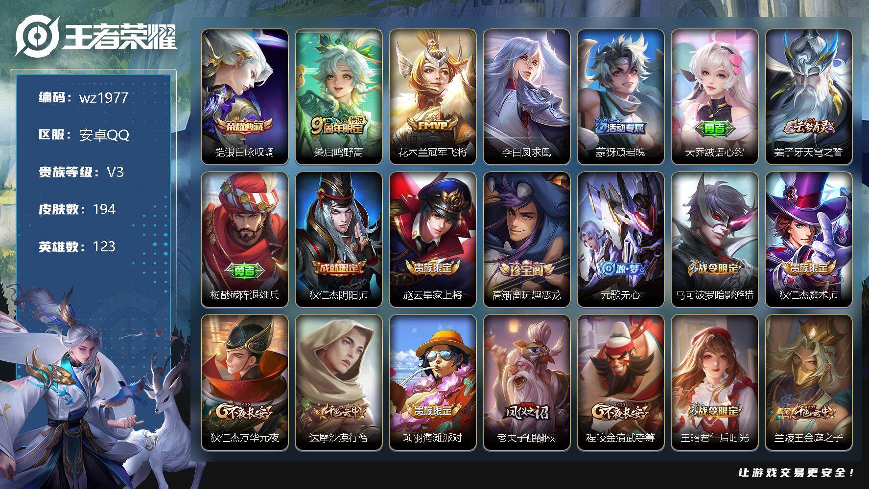 【游戏多多】 【可二次实名】【wz1977】安卓Q-V3-永恒钻石I段位-123英雄-194皮肤-1典藏-0珍品无双-0无双-0珍品传说-3传说-45史诗 【英雄全皮】:鬼谷子全皮,影全皮 【荣耀典藏】:铠银白咏叹调 【传说皮肤】:桑启鸣野蒿,花木兰冠军飞将,李白凤求凰 【限定皮肤】:蒙犽顽岩魄,大乔绒语心约,姜子牙天穹之誓,杨戬破阵退雄兵,狄仁杰阴阳师,赵云皇家上将,高渐离玩趣恶龙,元歌无心,马可波罗暗影游猎,狄仁杰魔术师,狄仁杰万华元夜,达摩沙漠行僧,项羽海滩派对,老夫子醍醐杖,程咬金演武夺筹,王昭君午后时光,兰陵王金庭之子,孙悟空大圣娶亲,牛魔御旌,后羿如梦令,李元芳银河之约,李元芳云中旅人,钟馗驱傩正仪,雅典娜黎明之约,鬼谷子原初探秘者,鬼谷子五谷丰年,苏烈千军破阵,百里玄策原初追逐者,弈星混沌棋,沈梦溪星空之诺,沈梦溪大漠名商,明世隐疑决卦,裴擒虎李小龙,裴擒虎擒涛扼浪,狂铁电玩高手,米莱狄御霄,盾山御銮,鲁班大师探海日志,桑启海盐诗旅,艾琳女武神,张良古海寻踪,鬼谷子天穹祈灯,沈梦溪龙舞盛年,刘邦剑破天穹,程咬金群星魔术团,周瑜熔金海岸 【年限皮肤】:李白凤求凰 【赛季限定】:狄仁杰万华元夜,达摩沙漠行僧,老夫子醍醐杖,程咬金演武夺筹,兰陵王金庭之子,张良古海寻踪,牛魔御旌,李元芳云中旅人,钟馗驱傩正仪,雅典娜黎明之约,鬼谷子原初探秘者,苏烈千军破阵,百里玄策原初追逐者,弈星混沌棋,沈梦溪大漠名商,明世隐疑决卦,裴擒虎擒涛扼浪,米莱狄御霄,盾山御銮,鲁班大师探海日志,桑启海盐诗旅,鬼谷子天穹祈灯,刘邦剑破天穹,姜子牙天穹之誓 【战令限定】:马可波罗暗影游猎,王昭君午后时光,李元芳银河之约,沈梦溪星空之诺,狂铁电玩高手 【史诗皮肤】:赵云皇家上将,赵云未来纪元,貂蝉圣诞恋歌,甄姬冰雪圆舞曲,王昭君偶像歌手,狄仁杰魔术师,廉颇地狱岩魂,宫本武藏鬼剑武藏,孙尚香水果甜心,嬴政摇滚巨星,妲己魅力维加斯,妲己女仆咖啡,曹操幽灵船长,吕布末日机甲,张飞乱世虎臣,韩信白龙吟,诸葛亮黄金分割率,百里守约特工魅影,蔡文姬舞动绿茵,刘禅天才门将,李元芳逐浪之夏,白起星夜王子,阿轲节奏热浪,孙策猫狗日记,孙悟空大圣娶亲,狄仁杰鹰眼统帅,李元芳银河之约,后羿如梦令,马可波罗暗影游猎,百里玄策原初追逐者,裴擒虎李小龙,沈梦溪月团寄思,雅典娜黎明之约,狂铁电玩高手,弈星滕王阁序,鬼谷子五谷丰年,元歌无心,蒙犽顽岩魄,孙膑茶境仙,阿轲化蝶舞,狂铁龙之律动,后羿石田雨龙,黄忠百相守梦,西施织梦人,公孙离涂山容容 【其他皮肤】:项羽海滩派对,韩信教廷特使,阿轲爱心护理,赵云忍炎影,艾琳女武神,白起白色死神,扁鹊救世之瞳,宫本武藏未来纪元,安琪拉玩偶对对碰,妲己少女阿狸,典韦黄金武士,亚瑟死亡骑士,花木兰兔女郎,张飞五福同心,甄姬花好人间,宫本武藏万象初新,狄仁杰阴阳师,关羽龙腾万里,钟无艳海滩丽影,宫本武藏霸王丸,王昭君幻想奇妙夜,狂铁命运角斗场,老夫子功夫老勺,李白敏锐之力,鬼谷子幻乐之宴,苏烈坚韧之力,米莱狄御霄,张良幽兰居士,牛魔御旌,小乔丁香结,盾山御銮,高渐离玩趣恶龙,沈梦溪鲨炮海盗猫,沈梦溪星空之诺,弈星混沌棋,哪吒次元突破,鲁班七号黑桃队长,明世隐疑决卦,老夫子醍醐杖,鬼谷子原初探秘者,狄仁杰万华元夜,刘禅秘密基地,杨戬次元傲视,程咬金演武夺筹,张良缤纷绘卷,盘古重装意志,钟馗驱傩正仪,鲁班大师乓乓大师,苏烈千军破阵,达摩沙漠行僧,程咬金无双福将,刘邦虎啸剑宗,兰陵王金庭之子,王昭君午后时光,沈梦溪大漠名商,蒙犽胡桃狂想曲,李元芳云中旅人,桑启海盐诗旅,猪八戒潮玩探月行,赵怀真太极少年,裴擒虎擒涛扼浪,鲁班大师探海日志,张良古海寻踪,钟无艳聚星闪耀,海月王牌新星,亚连破局者,鬼谷子天穹祈灯,海诺时空谍影,廉颇功夫炙烤,沈梦溪龙舞盛年,刘邦剑破天穹,程咬金群星魔术团,大司命暗都幽影,杨戬破阵退雄兵,姜子牙天穹之誓,周瑜熔金海岸,大乔绒语心约,盘古敬我三分,东皇太一噬灭天穹,苍苍林狼骑,太乙真人谧流熔炉,典韦铁骨偃魂,马超访茗客,影魅影绮裳,西施雪境奇遇,姜子牙星梦巡礼,明世隐景韶洛都,戈娅玫蓝誓约,刘备浪漫序章,钟馗虚灵犬护,苏烈春野闲踪,小乔秘证寻踪,张良灵野札记,阿古朵布丁狗之约,露娜命运加冕,姬小满小满鸭,白起死霸装,甄姬逆浪荇歌,云中君云械蓝图,莱西奥踏浪烽翎,鬼谷子克喵,鲁班七号福禄兄弟,露娜绯红之刃,钟无艳生化警戒,貂蝉异域舞娘,花木兰剑舞者,张良一千零一夜,孙膑未来旅行,孙悟空西部大镖客,刘禅英喵野望,李元芳特种部队,夏侯惇战争骑士,马可波罗激情绿茵,苍维京掠夺者,哪吒三太子,诸葛亮星航指挥官,黄忠芝加哥教父,干将莫邪第七人偶,鬼谷子阿摩司公爵,铠龙域领主,百里守约绝影神枪,女娲尼罗河女神,明世隐占星师,公孙离花间舞,裴擒虎街头旋风,弈星踏雪寻梅