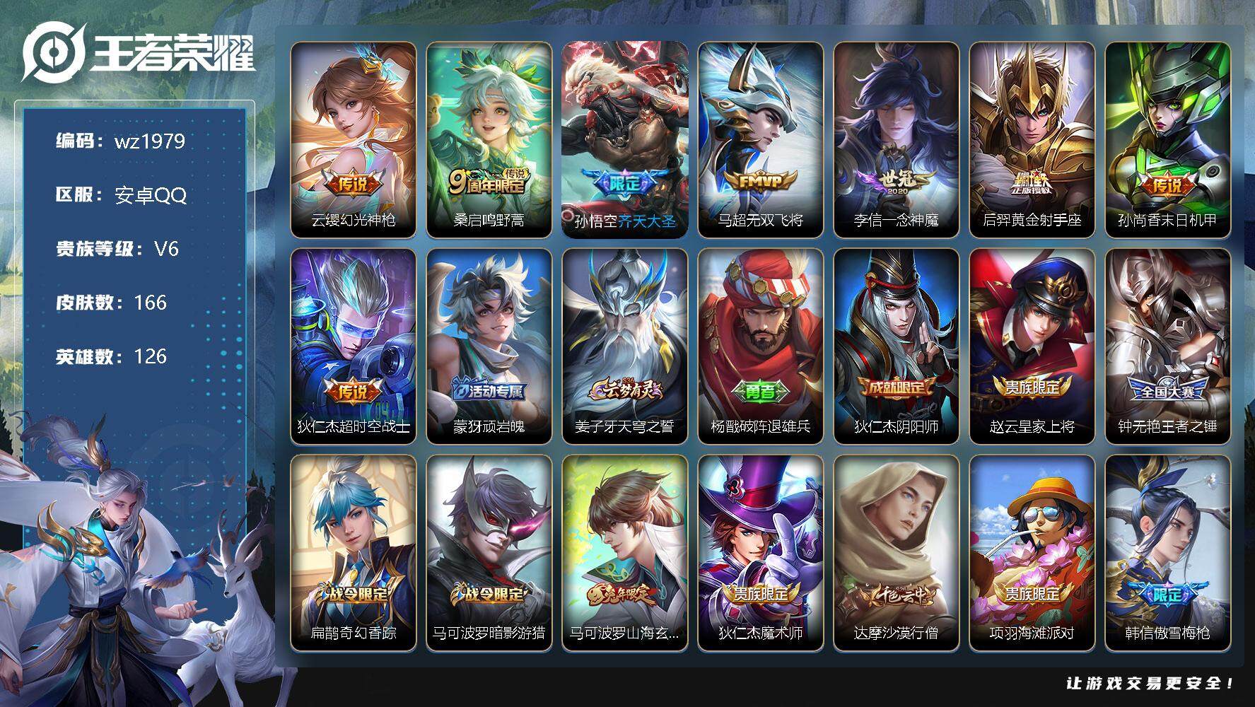 【游戏多多】 【可二次实名】【wz1979】安卓Q-V6-至尊星耀V段位-126英雄-166皮肤-0典藏-0珍品无双-0无双-0珍品传说-8传说-48史诗 【传说皮肤】:云缨幻光神枪,桑启鸣野蒿,孙悟空齐天大圣,马超无双飞将,李信一念神魔,后羿黄金射手座,孙尚香末日机甲,狄仁杰超时空战士 【限定皮肤】:蒙犽顽岩魄,姜子牙天穹之誓,杨戬破阵退雄兵,狄仁杰阴阳师,赵云皇家上将,钟无艳王者之锤,扁鹊奇幻香踪,马可波罗暗影游猎,马可波罗山海玄木吟,狄仁杰魔术师,达摩沙漠行僧,项羽海滩派对,韩信傲雪梅枪,兰陵王金庭之子,孙悟空孙行者,孙悟空齐天大圣,李元芳云中旅人,杨戬潮玩骑兵,鬼谷子五谷丰年,黄忠烈魂,百里玄策原初追逐者,沈梦溪大漠名商,裴擒虎擒涛扼浪,嫦娥暖冬兔眠,鲁班大师探海日志,桑启海盐诗旅,暃星界游侠,鬼谷子天穹祈灯,姬小满妄想食味,沈梦溪龙舞盛年,刘邦剑破天穹,程咬金群星魔术团,镜青焰无极,项羽苍威无极,周瑜熔金海岸 【年限皮肤】:黄忠烈魂,马可波罗山海玄木吟 【赛季限定】:达摩沙漠行僧,兰陵王金庭之子,李元芳云中旅人,百里玄策原初追逐者,沈梦溪大漠名商,裴擒虎擒涛扼浪,鲁班大师探海日志,桑启海盐诗旅,鬼谷子天穹祈灯,刘邦剑破天穹,姜子牙天穹之誓 【战令限定】:扁鹊奇幻香踪,马可波罗暗影游猎,杨戬潮玩骑兵,嫦娥暖冬兔眠,暃星界游侠,镜青焰无极,项羽苍威无极 【史诗皮肤】:露娜紫霞仙子,钟无艳王者之锤,赵云皇家上将,貂蝉圣诞恋歌,狄仁杰魔术师,宫本武藏鬼剑武藏,孙尚香水果甜心,妲己魅力维加斯,妲己女仆咖啡,墨子金属风暴,曹操幽灵船长,李白千年之狐,吕布末日机甲,张飞乱世虎臣,花木兰水晶猎龙者,夏侯惇乘风破浪,小乔缤纷独角兽,诸葛亮黄金分割率,亚瑟心灵战警,安琪拉心灵骇客,百里守约特工魅影,蔡文姬舞动绿茵,李元芳逐浪之夏,阿轲节奏热浪,狄仁杰鹰眼统帅,娜可露露晚萤,黄忠烈魂,马可波罗暗影游猎,百里玄策原初追逐者,百里玄策热力回旋,杨戬天秀启明,孙悟空孙行者,韩信傲雪梅枪,鬼谷子五谷丰年,暃星界游侠,马可波罗山海玄木吟,扁鹊奇幻香踪,刘禅电玩爆裂旋风,姬小满妄想食味,镜青焰无极,蒙犽顽岩魄,百里守约百相守梦,牛魔星界战将,孙膑茶境仙,阿轲化蝶舞,狂铁龙之律动,后羿石田雨龙,黄忠百相守梦 【其他皮肤】:项羽海滩派对,韩信教廷特使,韩信街头霸王,露娜哥特玫瑰,赵云忍炎影,白起白色死神,武则天东方不败,宫本武藏未来纪元,安琪拉玩偶对对碰,孙膑天使之翼,妲己少女阿狸,典韦黄金武士,亚瑟死亡骑士,达摩拳王,花木兰兔女郎,甄姬花好人间,刘备万事如意,宫本武藏万象初新,后羿阿尔法小队,狄仁杰阴阳师,刘备汉昭烈帝,关羽龙腾万里,钟无艳海滩丽影,狂铁命运角斗场,老夫子功夫老勺,孙尚香沉稳之力,鬼谷子幻乐之宴,明世隐虹云星官,小乔丁香结,沈梦溪鲨炮海盗猫,哪吒次元突破,狂铁特工战影,刘禅秘密基地,鲁班大师乓乓大师,达摩沙漠行僧,程咬金无双福将,兰陵王金庭之子,沈梦溪大漠名商,蒙恬蔚蓝守将,李元芳云中旅人,桑启海盐诗旅,嫦娥暖冬兔眠,海月幻泉雾影,猪八戒潮玩探月行,白起乐园追猎者,赵怀真太极少年,裴擒虎擒涛扼浪,杨戬潮玩骑兵,太乙真人劲辣红锅,莱西奥西部游侠,鲁班大师探海日志,鬼谷子天穹祈灯,廉颇功夫炙烤,沈梦溪龙舞盛年,钟无艳春野之旅,刘邦剑破天穹,程咬金群星魔术团,项羽苍威无极,杨戬破阵退雄兵,姜子牙天穹之誓,周瑜熔金海岸,盘古敬我三分,东皇太一噬灭天穹,老夫子百相守梦,干将莫邪雾都夜雨,苍苍林狼骑,太乙真人谧流熔炉,典韦铁骨偃魂,马超访茗客,西施雪境奇遇,姜子牙星梦巡礼,明世隐景韶洛都,戈娅玫蓝誓约,刘备浪漫序章,钟馗虚灵犬护,苏烈春野闲踪,张良灵野札记,阿古朵布丁狗之约,露娜命运加冕,姬小满小满鸭,白起死霸装,甄姬逆浪荇歌,庄周锦麟游梦,莱西奥踏浪烽翎,项羽帝国元帅,钟无艳生化警戒,王昭君精灵公主,曹操超能战警,孙悟空西部大镖客,周瑜海军大将,钟馗地府判官,李元芳特种部队,马可波罗激情绿茵,百里守约绝影神枪,百里玄策威尼斯狂欢,梦奇美梦成真,女娲尼罗河女神,明世隐占星师,裴擒虎街头旋风,米莱狄精准探案法,元歌午夜歌剧院,李信灼热之刃,云中君荷鲁斯之眼,镜冰刃幻境,蒙恬秩序猎龙将,澜孤猎,司空震启蛰,云缨赤焰之缨,金蝉前尘,暃碧珀绯影 【内测皮肤】:狂铁特工战影 【营地ID】:1762290740