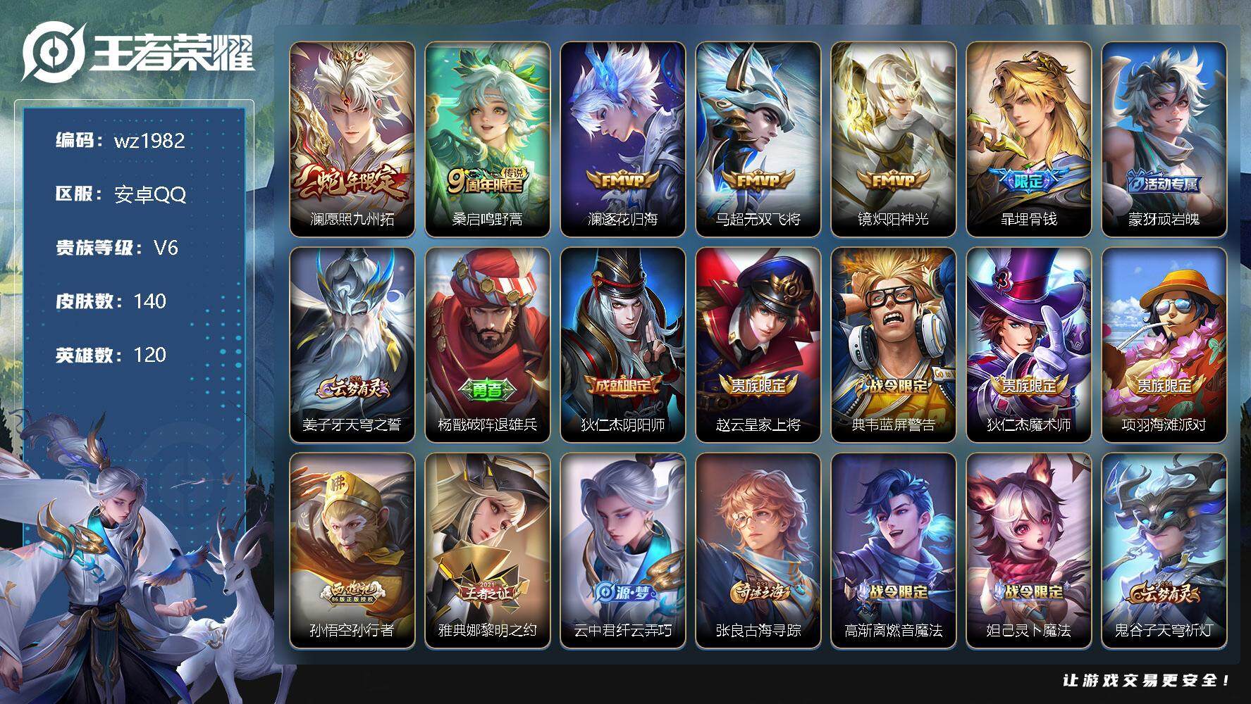 【游戏多多】 【可二次实名】【wz1982】安卓Q-V6-至尊星耀II段位-120英雄-140皮肤-0典藏-0珍品无双-0无双-0珍品传说-5传说-41史诗 【英雄全皮】:影全皮 【传说皮肤】:澜愿照九州拓,桑启鸣野蒿,澜逐花归海,马超无双飞将,镜炽阳神光 【限定皮肤】:暃埋骨钱,蒙犽顽岩魄,姜子牙天穹之誓,杨戬破阵退雄兵,狄仁杰阴阳师,赵云皇家上将,典韦蓝屏警告,狄仁杰魔术师,项羽海滩派对,孙悟空孙行者,雅典娜黎明之约,云中君纤云弄巧,张良古海寻踪,高渐离燃音魔法,妲己灵卜魔法,鬼谷子天穹祈灯,姬小满妄想食味,沈梦溪龙舞盛年,鲁班七号蔬乡物语,李元芳蔬乡物语,刘邦剑破天穹,程咬金群星魔术团,镜青焰无极,周瑜熔金海岸 【赛季限定】:张良古海寻踪,雅典娜黎明之约,鬼谷子天穹祈灯,刘邦剑破天穹,姜子牙天穹之誓 【战令限定】:典韦蓝屏警告,高渐离燃音魔法,妲己灵卜魔法,鲁班七号蔬乡物语,李元芳蔬乡物语,镜青焰无极 【史诗皮肤】:露娜紫霞仙子,赵云皇家上将,甄姬冰雪圆舞曲,狄仁杰魔术师,廉颇地狱岩魂,宫本武藏鬼剑武藏,孙尚香水果甜心,妲己女仆咖啡,曹操幽灵船长,李白千年之狐,花木兰水晶猎龙者,夏侯惇乘风破浪,雅典娜冰冠公主,百里守约特工魅影,铠曙光守护者,蔡文姬舞动绿茵,刘禅天才门将,程咬金功夫厨神,白起星夜王子,阿轲节奏热浪,典韦蓝屏警告,狄仁杰鹰眼统帅,云中君纤云弄巧,沈梦溪月团寄思,孙悟空孙行者,雅典娜黎明之约,澜赏金猎手,妲己灵卜魔法,高渐离燃音魔法,姬小满妄想食味,鲁班七号蔬乡物语,镜青焰无极,蒙犽顽岩魄,暃埋骨钱,姬小满战舞者,亚连破空之剑,牛魔星界战将,狂铁龙之律动,后羿石田雨龙,周瑜百相守梦,黄忠百相守梦,公孙离涂山容容 【其他皮肤】:项羽海滩派对,韩信教廷特使,韩信街头霸王,赵云白执事,赵云忍炎影,典韦黄金武士,亚瑟死亡骑士,张飞五福同心,甄姬花好人间,宫本武藏万象初新,后羿阿尔法小队,狄仁杰阴阳师,关羽龙腾万里,钟无艳海滩丽影,王昭君幻想奇妙夜,老夫子功夫老勺,大乔守护之力,明世隐虹云星官,张良幽兰居士,小乔丁香结,姜子牙炽热元素使,哪吒次元突破,狂铁特工战影,刘禅秘密基地,露娜瓷语鉴心,盘古重装意志,鲁班大师乓乓大师,刘邦虎啸剑宗,米莱狄契约魔法,蒙恬蔚蓝守将,刘备潮玩造梦师,猪八戒潮玩探月行,赵怀真太极少年,莱西奥西部游侠,李元芳妄想特派,张良古海寻踪,曹操决胜大满贯,后羿完美运算,鬼谷子天穹祈灯,妲己灵卜魔法,嫦娥漠中幻影,朵莉亚金色潮汐,亚瑟鸿运当头,沈梦溪龙舞盛年,钟无艳春野之旅,李元芳蔬乡物语,扁鹊无尽旅途,刘邦剑破天穹,盘古经纬探寻者,程咬金群星魔术团,杨戬破阵退雄兵,姜子牙天穹之誓,周瑜熔金海岸,孙悟空神迹守卫,盘古敬我三分,东皇太一噬灭天穹,吕布逐霄战戟,苍苍林狼骑,太乙真人谧流熔炉,典韦铁骨偃魂,影魅影绮裳,西施雪境奇遇,钟馗虚灵犬护,张良灵野札记,阿古朵布丁狗之约,露娜命运加冕,姬小满小满鸭,白起死霸装,甄姬逆浪荇歌,孙策百相守梦,庄周锦麟游梦,莱西奥踏浪烽翎,鬼谷子克喵,哪吒罗小黑战记,兰陵王隐刃,苍维京掠夺者,杨戬埃及法老,太乙真人圆桌骑士,黄忠芝加哥教父,铠龙域领主,百里守约绝影神枪,公孙离花间舞,弈星踏雪寻梅,元歌午夜歌剧院,孙策海之征途,盘古创世神祝,云中君荷鲁斯之眼,马超幸存者,镜冰刃幻境,蒙恬秩序猎龙将,澜孤猎,司空震启蛰,云缨赤焰之缨,暃碧珀绯影 【内测皮肤】:狂铁特工战影 【营地ID】:1679132937