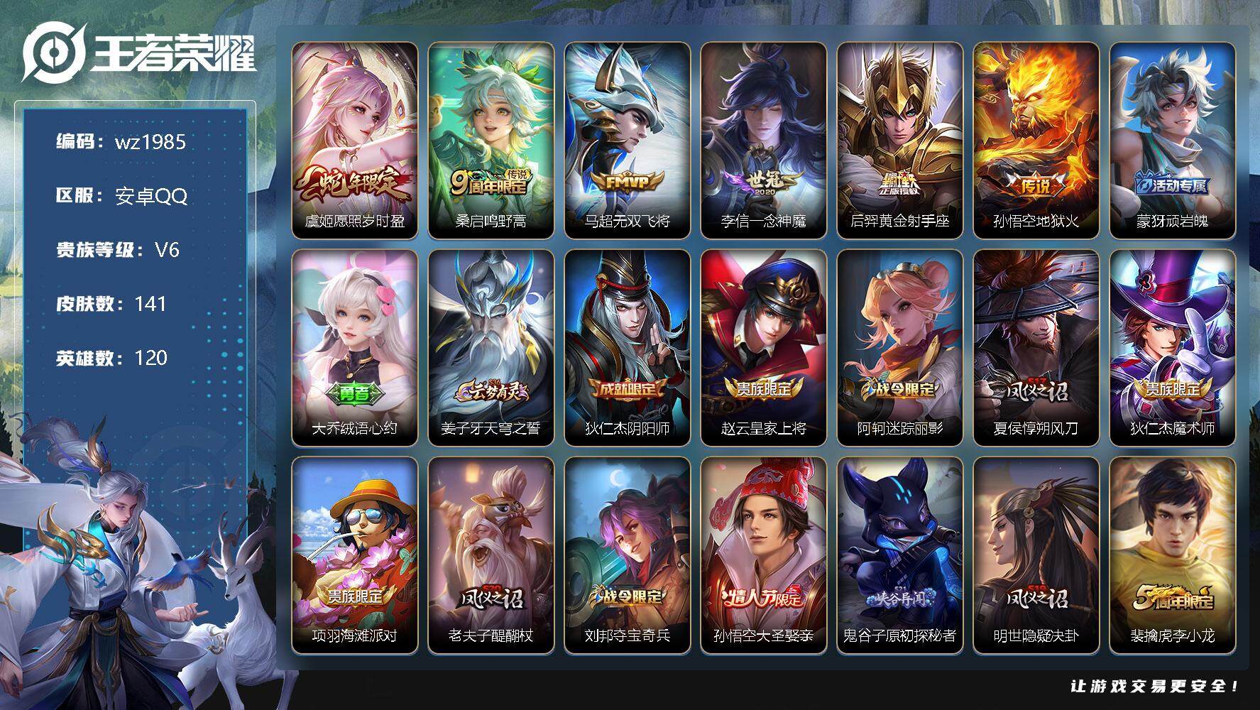 【游戏多多】 【可二次实名】【wz1985】安卓Q-V6-永恒钻石III段位-120英雄-141皮肤-0典藏-0珍品无双-0无双-0珍品传说-6传说-39史诗 【英雄全皮】:影全皮 【传说皮肤】:虞姬愿照岁时盈,桑启鸣野蒿,马超无双飞将,李信一念神魔,后羿黄金射手座,孙悟空地狱火 【限定皮肤】:蒙犽顽岩魄,大乔绒语心约,姜子牙天穹之誓,狄仁杰阴阳师,赵云皇家上将,阿轲迷踪丽影,夏侯惇朔风刀,狄仁杰魔术师,项羽海滩派对,老夫子醍醐杖,刘邦夺宝奇兵,孙悟空大圣娶亲,鬼谷子原初探秘者,明世隐疑决卦,裴擒虎李小龙,裴擒虎擒涛扼浪,云中君纤云弄巧,盾山御銮,上官婉儿梁祝,嫦娥拒霜思,鲁班大师探海日志,桑启海盐诗旅,张良古海寻踪,蒙犽百解令,鬼谷子天穹祈灯,姬小满妄想食味,沈梦溪龙舞盛年,刘邦剑破天穹,程咬金群星魔术团,刘备异域游侠,周瑜熔金海岸 【赛季限定】:夏侯惇朔风刀,老夫子醍醐杖,张良古海寻踪,鬼谷子原初探秘者,明世隐疑决卦,裴擒虎擒涛扼浪,盾山御銮,鲁班大师探海日志,桑启海盐诗旅,鬼谷子天穹祈灯,刘邦剑破天穹,姜子牙天穹之誓 【战令限定】:阿轲迷踪丽影,刘邦夺宝奇兵 【史诗皮肤】:鲁班七号电玩小子,赵云皇家上将,赵云未来纪元,貂蝉圣诞恋歌,甄姬冰雪圆舞曲,狄仁杰魔术师,宫本武藏鬼剑武藏,孙尚香水果甜心,妲己魅力维加斯,墨子金属风暴,刘禅绅士熊喵,曹操幽灵船长,张飞乱世虎臣,刘邦德古拉伯爵,夏侯惇乘风破浪,兰陵王暗隐猎兽者,诸葛亮黄金分割率,安琪拉心灵骇客,百里守约特工魅影,铠曙光守护者,刘禅天才门将,阿轲节奏热浪,孙悟空大圣娶亲,狄仁杰鹰眼统帅,公孙离无限星赏官,上官婉儿梁祝,不知火舞魅语,阿轲迷踪丽影,裴擒虎李小龙,云中君纤云弄巧,嫦娥拒霜思,蒙犽百解令,姬小满妄想食味,黄忠怒海争锋,蒙犽顽岩魄,狂铁龙之律动,黄忠百相守梦,西施织梦人,公孙离涂山容容 【其他皮肤】:项羽海滩派对,韩信教廷特使,韩信街头霸王,赵云忍炎影,白起白色死神,牛魔西部大镖客,武则天东方不败,扁鹊救世之瞳,孙膑天使之翼,姜子牙时尚教父,妲己少女阿狸,典韦黄金武士,亚瑟死亡骑士,达摩拳王,花木兰兔女郎,张飞五福同心,甄姬花好人间,刘备万事如意,狄仁杰阴阳师,关羽龙腾万里,钟无艳海滩丽影,孙尚香沉稳之力,小乔丁香结,吕布野性能量,盾山御銮,夏侯惇朔风刀,哪吒次元突破,明世隐疑决卦,刘邦夺宝奇兵,盾山圆桌骑士,老夫子醍醐杖,狂铁特工战影,鬼谷子原初探秘者,刘禅秘密基地,露娜瓷语鉴心,鲁班大师乓乓大师,刘备潮玩造梦师,桑启海盐诗旅,海月幻泉雾影,猪八戒潮玩探月行,裴擒虎擒涛扼浪,鲁班大师探海日志,姬小满零食大作战,李元芳妄想特派,张良古海寻踪,后羿完美运算,鬼谷子天穹祈灯,廉颇功夫炙烤,沈梦溪龙舞盛年,钟无艳春野之旅,扁鹊无尽旅途,刘邦剑破天穹,程咬金群星魔术团,大司命暗都幽影,刘备异域游侠,姜子牙天穹之誓,周瑜熔金海岸,大乔绒语心约,干将莫邪雾都夜雨,苍苍林狼骑,典韦铁骨偃魂,影魅影绮裳,西施雪境奇遇,明世隐景韶洛都,戈娅玫蓝誓约,刘备浪漫序章,钟馗虚灵犬护,张良灵野札记,阿古朵布丁狗之约,露娜命运加冕,姬小满小满鸭,白起死霸装,甄姬逆浪荇歌,庄周锦麟游梦,莱西奥踏浪烽翎,鬼谷子克喵,桑启青衿临川,哪吒罗小黑战记,兰陵王隐刃,刘邦圣殿之光,关羽天启骑士,马可波罗激情绿茵,杨戬埃及法老,大乔伊势巫女,铠龙域领主,百里守约绝影神枪,女娲尼罗河女神,司马懿魇语军师,伽罗花见巫女,李信灼热之刃,云中君荷鲁斯之眼,马超幸存者,蒙犽归虚梦演,蒙恬秩序猎龙将,云缨赤焰之缨,金蝉前尘 【内测皮肤】:狂铁特工战影 【营地ID】:1755392975