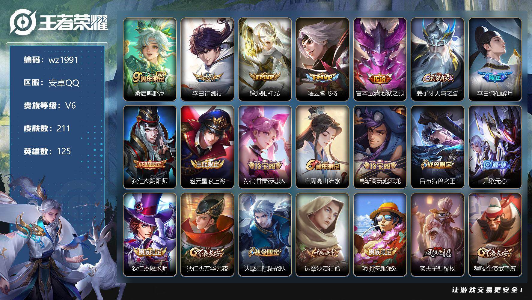 【游戏多多】 【可二次实名】【wz1991】安卓Q-V6-至尊星耀III段位-125英雄-211皮肤-0典藏-0珍品无双-0无双-0珍品传说-5传说-55史诗 【传说皮肤】:桑启鸣野蒿,李白诗剑行,镜炽阳神光,曜云鹰飞将,宫本武藏地狱之眼 【限定皮肤】:姜子牙天穹之誓,李白谪仙醉月,狄仁杰阴阳师,赵云皇家上将,孙尚香蔷薇恋人,庄周高山流水,高渐离玩趣恶龙,吕布猎兽之王,元歌无心,狄仁杰魔术师,狄仁杰万华元夜,达摩星际陆战队,达摩沙漠行僧,项羽海滩派对,老夫子醍醐杖,程咬金演武夺筹,兰陵王金庭之子,后羿圣弓游侠,李元芳云中旅人,钟馗驱傩正仪,杨玉环遇见飞天,干将莫邪真爱魔法,太乙真人华丽摇滚,鬼谷子原初探秘者,鬼谷子五谷丰年,苏烈千军破阵,沈梦溪大漠名商,裴擒虎李小龙,裴擒虎擒涛扼浪,米莱狄胡桃异想国,云中君纤云弄巧,上官婉儿梁祝,鲁班大师探海日志,桑启海盐诗旅,艾琳流音漫舞,司空震地狱燃心,阿古朵江河有灵,张良古海寻踪,蒙犽百解令,高渐离燃音魔法,妲己灵卜魔法,鬼谷子天穹祈灯,伽罗琥珀纪元,沈梦溪龙舞盛年,鲁班七号蔬乡物语,李元芳蔬乡物语,刘邦剑破天穹,程咬金群星魔术团,周瑜熔金海岸 【年限皮肤】:马超神威 【赛季限定】:狄仁杰万华元夜,达摩沙漠行僧,老夫子醍醐杖,程咬金演武夺筹,兰陵王金庭之子,张良古海寻踪,李元芳云中旅人,钟馗驱傩正仪,鬼谷子原初探秘者,苏烈千军破阵,沈梦溪大漠名商,裴擒虎擒涛扼浪,鲁班大师探海日志,桑启海盐诗旅,鬼谷子天穹祈灯,刘邦剑破天穹,姜子牙天穹之誓 【战令限定】:吕布猎兽之王,达摩星际陆战队,艾琳流音漫舞,后羿圣弓游侠,干将莫邪真爱魔法,米莱狄胡桃异想国,司空震地狱燃心,高渐离燃音魔法,妲己灵卜魔法,鲁班七号蔬乡物语,李元芳蔬乡物语 【史诗皮肤】:鲁班七号电玩小子,露娜紫霞仙子,赵云皇家上将,赵云未来纪元,甄姬冰雪圆舞曲,狄仁杰魔术师,廉颇地狱岩魂,宫本武藏鬼剑武藏,孙尚香蔷薇恋人,孙尚香水果甜心,嬴政摇滚巨星,妲己女仆咖啡,墨子金属风暴,刘禅绅士熊喵,李白千年之狐,吕布末日机甲,花木兰水晶猎龙者,小乔缤纷独角兽,兰陵王暗隐猎兽者,诸葛亮黄金分割率,雅典娜冰冠公主,安琪拉心灵骇客,百里守约特工魅影,铠曙光守护者,刘禅天才门将,李元芳逐浪之夏,程咬金功夫厨神,白起星夜王子,阿轲节奏热浪,杨玉环遇见飞天,大乔猫狗日记,狄仁杰鹰眼统帅,上官婉儿梁祝,橘右京修罗,马超神威,裴擒虎李小龙,云中君纤云弄巧,米莱狄胡桃异想国,百里玄策热力回旋,干将莫邪真爱魔法,庄周高山流水,司马懿暗渊魔法,鬼谷子五谷丰年,元歌无心,司空震地狱燃心,阿古朵江河有灵,蒙犽百解令,妲己灵卜魔法,高渐离燃音魔法,伽罗琥珀纪元,鲁班七号蔬乡物语,亚连破空之剑,李白谪仙醉月,牛魔星界战将,弈星万物之道,公孙离涂山容容 【其他皮肤】:项羽海滩派对,韩信教廷特使,韩信街头霸王,露娜哥特玫瑰,达摩大发明家,赵云白执事,赵云忍炎影,白起白色死神,扁鹊化身博士,宫本武藏未来纪元,孙膑天使之翼,妲己少女阿狸,典韦黄金武士,达摩拳王,花木兰兔女郎,张飞五福同心,甄姬花好人间,宫本武藏万象初新,后羿阿尔法小队,狄仁杰阴阳师,刘备纽约教父,刘备汉昭烈帝,关羽龙腾万里,钟无艳海滩丽影,王昭君幻想奇妙夜,老夫子功夫老勺,孙尚香沉稳之力,诸葛亮掌控之力,李白敏锐之力,鬼谷子幻乐之宴,太乙真人华丽摇滚,吕布猎兽之王,明世隐虹云星官,吕布野性能量,孙膑归虚梦演,高渐离玩趣恶龙,沈梦溪鲨炮海盗猫,姜子牙炽热元素使,哪吒次元突破,盾山圆桌骑士,老夫子醍醐杖,狂铁特工战影,鬼谷子原初探秘者,狄仁杰万华元夜,刘禅秘密基地,杨戬次元傲视,达摩星际陆战队,程咬金演武夺筹,张良缤纷绘卷,钟馗驱傩正仪,鲁班大师乓乓大师,苏烈千军破阵,后羿圣弓游侠,典韦铁甲之心,达摩沙漠行僧,程咬金无双福将,兰陵王金庭之子,米莱狄契约魔法,沈梦溪大漠名商,蒙恬蔚蓝守将,李元芳云中旅人,刘备潮玩造梦师,桑启海盐诗旅,猪八戒潮玩探月行,裴擒虎擒涛扼浪,太乙真人劲辣红锅,莱西奥西部游侠,鲁班大师探海日志,李元芳妄想特派,哪吒热血海滩,艾琳流音漫舞,张良古海寻踪,钟无艳聚星闪耀,曹操决胜大满贯,后羿完美运算,鬼谷子天穹祈灯,妲己灵卜魔法,海诺时空谍影,嫦娥漠中幻影,朵莉亚金色潮汐,廉颇功夫炙烤,亚瑟鸿运当头,沈梦溪龙舞盛年,钟无艳春野之旅,李元芳蔬乡物语,刘邦剑破天穹,程咬金群星魔术团,大司命暗都幽影,姜子牙天穹之誓,周瑜熔金海岸,孙悟空神迹守卫,盘古敬我三分,东皇太一噬灭天穹,干将莫邪雾都夜雨,太乙真人谧流熔炉,西施雪境奇遇,姜子牙星梦巡礼,明世隐景韶洛都,戈娅玫蓝誓约,钟馗虚灵犬护,苏烈春野闲踪,张良灵野札记,阿古朵布丁狗之约,露娜命运加冕,姬小满小满鸭,甄姬逆浪荇歌,桑启青衿临川,哪吒罗小黑战记,鲁班七号福禄兄弟,鲁班七号木