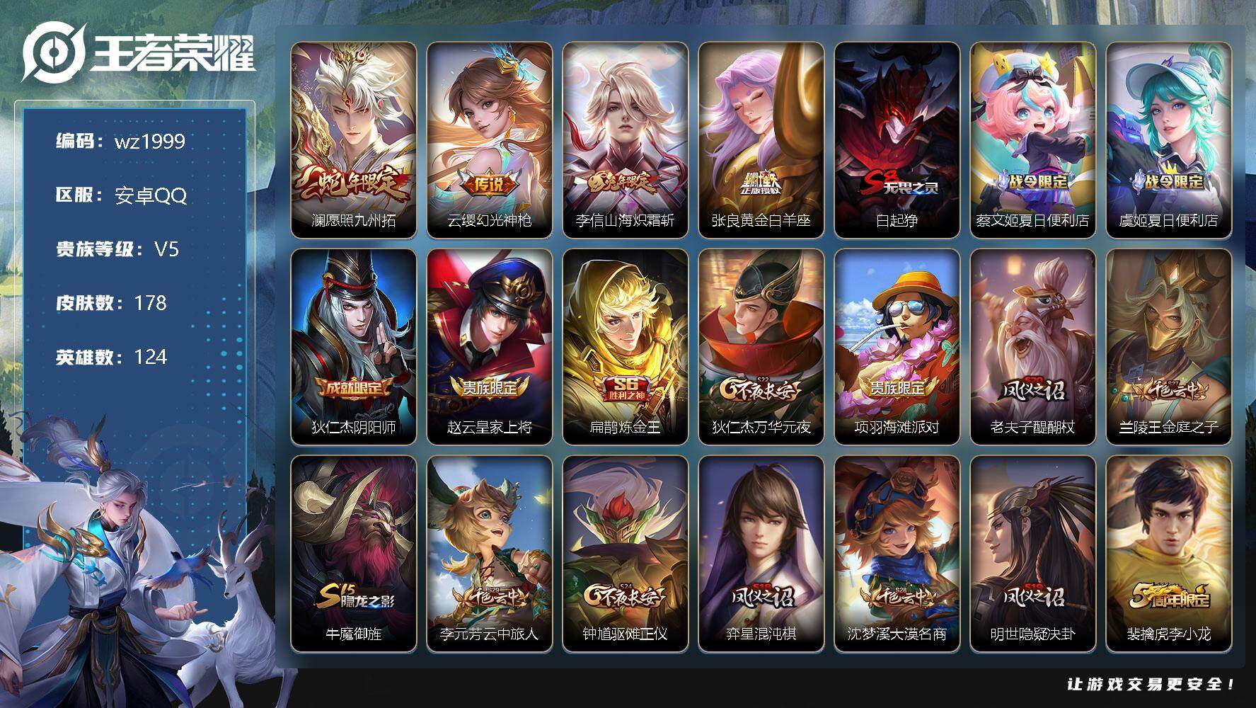 【游戏多多】 【可二次实名】【wz1999】安卓Q-V5-至尊星耀V段位-124英雄-178皮肤-0典藏-0珍品无双-0无双-0珍品传说-4传说-40史诗 【英雄全皮】:影全皮 【传说皮肤】:澜愿照九州拓,云缨幻光神枪,李信山海炽霜斩,张良黄金白羊座 【限定皮肤】:白起狰,蔡文姬夏日便利店,虞姬夏日便利店,狄仁杰阴阳师,赵云皇家上将,扁鹊炼金王,狄仁杰万华元夜,项羽海滩派对,老夫子醍醐杖,兰陵王金庭之子,牛魔御旌,李元芳云中旅人,钟馗驱傩正仪,弈星混沌棋,沈梦溪大漠名商,明世隐疑决卦,裴擒虎李小龙,裴擒虎擒涛扼浪,李信山海炽霜斩,嫦娥暖冬兔眠,西施玲珑珍味,鲁班大师探海日志,桑启海盐诗旅,暃星界游侠,戈娅驭风魔法,艾琳女武神,阿古朵江河有灵,张良古海寻踪,高渐离燃音魔法,妲己灵卜魔法,鬼谷子天穹祈灯,姬小满妄想食味,沈梦溪龙舞盛年,刘邦剑破天穹,程咬金群星魔术团,镜青焰无极,项羽苍威无极,刘备异域游侠,周瑜熔金海岸 【年限皮肤】:李信山海炽霜斩 【赛季限定】:扁鹊炼金王,白起狰,狄仁杰万华元夜,老夫子醍醐杖,兰陵王金庭之子,张良古海寻踪,牛魔御旌,李元芳云中旅人,钟馗驱傩正仪,弈星混沌棋,沈梦溪大漠名商,明世隐疑决卦,裴擒虎擒涛扼浪,鲁班大师探海日志,桑启海盐诗旅,鬼谷子天穹祈灯,刘邦剑破天穹 【战令限定】:蔡文姬夏日便利店,虞姬夏日便利店,嫦娥暖冬兔眠,西施玲珑珍味,暃星界游侠,戈娅驭风魔法,高渐离燃音魔法,妲己灵卜魔法,镜青焰无极,项羽苍威无极 【史诗皮肤】:露娜紫霞仙子,阿轲暗夜猫娘,赵云皇家上将,赵云未来纪元,甄姬冰雪圆舞曲,宫本武藏鬼剑武藏,孙尚香水果甜心,嬴政摇滚巨星,妲己魅力维加斯,墨子金属风暴,张飞乱世虎臣,花木兰水晶猎龙者,夏侯惇乘风破浪,小乔缤纷独角兽,兰陵王暗隐猎兽者,诸葛亮黄金分割率,亚瑟心灵战警,铠曙光守护者,李元芳逐浪之夏,白起星夜王子,阿轲节奏热浪,孙策猫狗日记,狄仁杰鹰眼统帅,橘右京修罗,裴擒虎李小龙,杨戬天秀启明,暃星界游侠,戈娅驭风魔法,阿古朵江河有灵,妲己灵卜魔法,高渐离燃音魔法,姬小满妄想食味,镜青焰无极,蔡文姬夏日便利店,牛魔星界战将,赵怀真器灵浮梦炉,阿轲化蝶舞,刘禅鸭鸭历险记,狂铁龙之律动,黄忠百相守梦,公孙离涂山容容 【其他皮肤】:项羽海滩派对,韩信教廷特使,韩信街头霸王,露娜哥特玫瑰,赵云忍炎影,芈月红桃皇后,艾琳女武神,白起白色死神,牛魔西部大镖客,安琪拉玩偶对对碰,孙膑天使之翼,姜子牙时尚教父,妲己少女阿狸,典韦黄金武士,亚瑟死亡骑士,花木兰兔女郎,甄姬花好人间,刘备万事如意,后羿阿尔法小队,狄仁杰阴阳师,刘备纽约教父,刘备汉昭烈帝,扁鹊炼金王,关羽龙腾万里,白起狰,钟无艳海滩丽影,狂铁命运角斗场,老夫子功夫老勺,孙尚香沉稳之力,诸葛亮掌控之力,李白敏锐之力,鬼谷子幻乐之宴,大乔守护之力,牛魔御旌,小乔丁香结,姜子牙炽热元素使,弈星混沌棋,哪吒次元突破,明世隐疑决卦,老夫子醍醐杖,狂铁特工战影,狄仁杰万华元夜,刘禅秘密基地,杨戬次元傲视,盘古重装意志,钟馗驱傩正仪,鲁班大师乓乓大师,程咬金无双福将,兰陵王金庭之子,刘禅唤灵魔甲,沈梦溪大漠名商,蒙恬蔚蓝守将,李元芳云中旅人,刘备潮玩造梦师,桑启海盐诗旅,嫦娥暖冬兔眠,海月幻泉雾影,猪八戒潮玩探月行,裴擒虎擒涛扼浪,太乙真人劲辣红锅,鲁班大师探海日志,西施玲珑珍味,李元芳妄想特派,哪吒热血海滩,张良古海寻踪,曹操决胜大满贯,后羿完美运算,鬼谷子天穹祈灯,妲己灵卜魔法,嫦娥漠中幻影,廉颇功夫炙烤,亚瑟鸿运当头,沈梦溪龙舞盛年,扁鹊无尽旅途,刘邦剑破天穹,盘古经纬探寻者,程咬金群星魔术团,项羽苍威无极,大司命暗都幽影,刘备异域游侠,貂蝉长夏之忆,周瑜熔金海岸,虞姬夏日便利店,东皇太一噬灭天穹,干将莫邪雾都夜雨,苍苍林狼骑,太乙真人谧流熔炉,典韦铁骨偃魂,影魅影绮裳,西施雪境奇遇,姜子牙星梦巡礼,明世隐景韶洛都,戈娅玫蓝誓约,钟馗虚灵犬护,沈梦溪鸭鸭历险记,张良灵野札记,阿古朵布丁狗之约,露娜命运加冕,雅典娜潮玩士官长,白起死霸装,甄姬逆浪荇歌,云中君云械蓝图,庄周锦麟游梦,莱西奥踏浪烽翎,鬼谷子克喵,哪吒罗小黑战记,亚瑟荣光之誓,鲁班七号木偶奇遇记,露娜绯红之刃,王昭君精灵公主,孙悟空西部大镖客,后羿精灵王,虞姬加勒比小姐,马可波罗激情绿茵,苍维京掠夺者,黄忠芝加哥教父,铠龙域领主,百里守约绝影神枪,百里玄策威尼斯狂欢,裴擒虎街头旋风,弈星踏雪寻梅,元歌午夜歌剧院,司马懿魇语军师,李信灼热之刃,瑶森,云中君荷鲁斯之眼,曜归虚梦演,马超幸存者,蒙犽归虚梦演,蒙恬秩序猎龙将,澜孤猎,司空震启蛰,云缨赤焰之缨,金蝉前尘 【内测皮肤】:艾琳女武神,狂铁特工战影 【营地ID】:1732672983