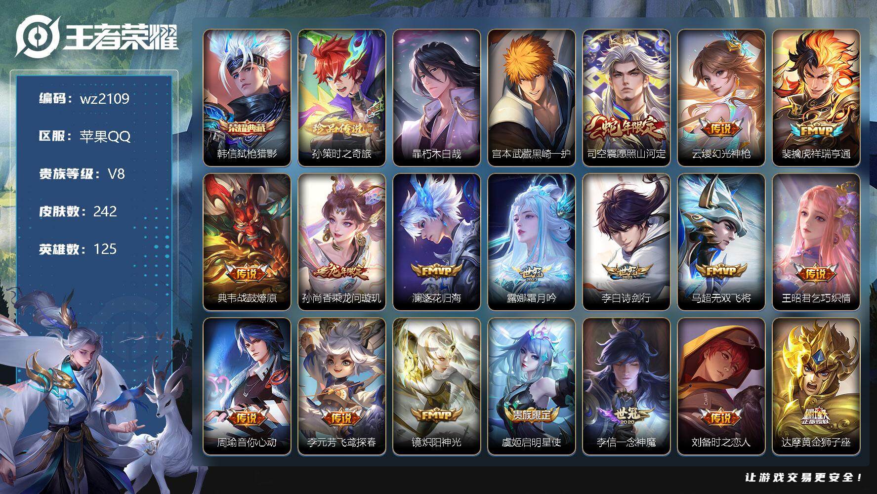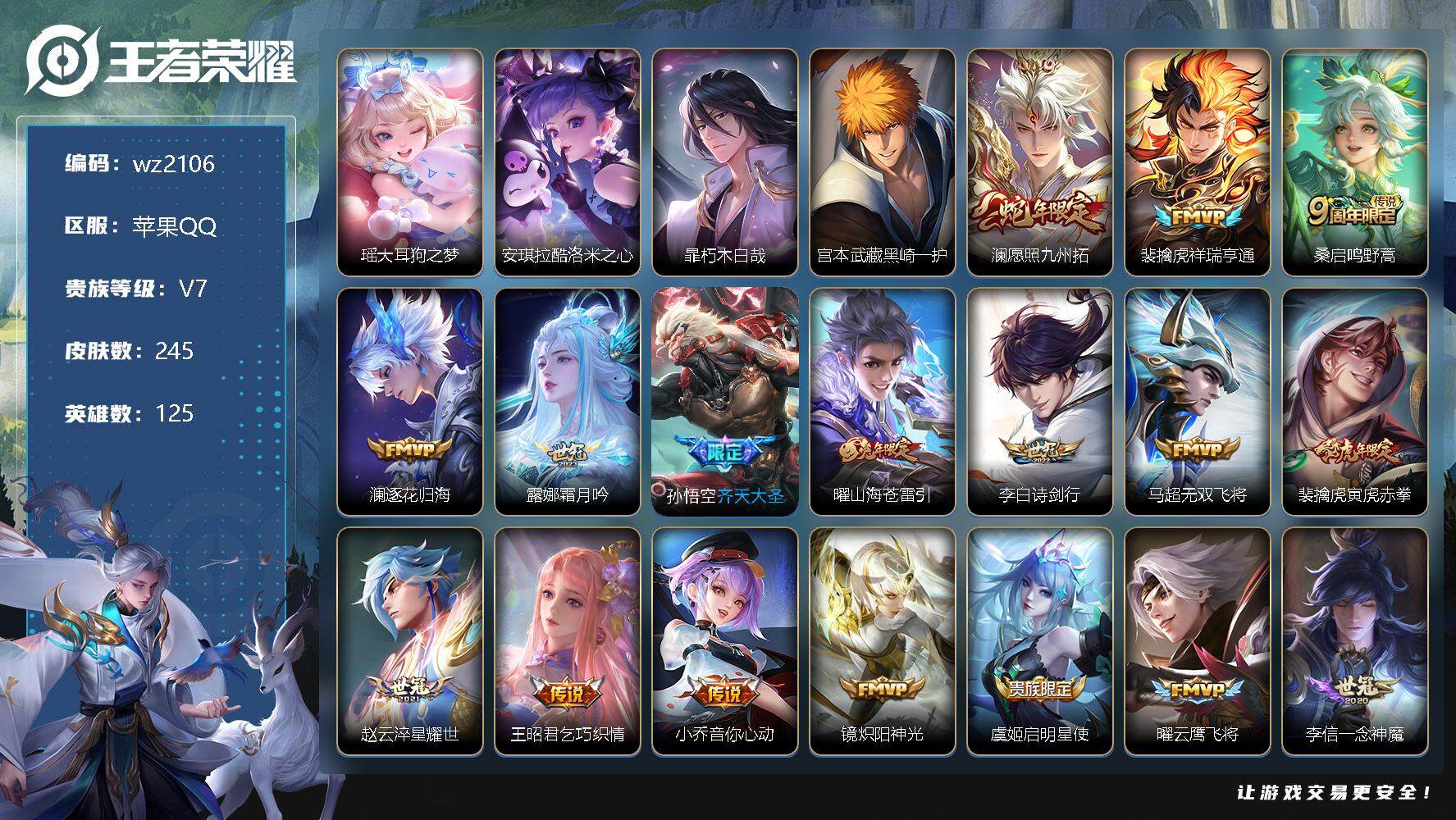 【游戏多多】 【可二次实名】【wz2109】苹果Q-V8-至尊星耀II段位-125英雄-242皮肤-1典藏-0珍品无双-0无双-3珍品传说-20传说-79史诗 【英雄全皮】:苍全皮,蒙恬全皮,司空震全皮,空空儿全皮,影全皮 【荣耀典藏】:韩信弑枪猎影 【珍品传说】:孙策时之奇旅,暃朽木白哉,宫本武藏黑崎一护 【传说皮肤】:司空震愿照山河定,云缨幻光神枪,裴擒虎祥瑞亨通,典韦战鼓燎原,孙尚香乘龙问璇玑,澜逐花归海,露娜霜月吟,李白诗剑行,马超无双飞将,王昭君乞巧织情,周瑜音你心动,李元芳飞鸢探春,镜炽阳神光,虞姬启明星使,李信一念神魔,刘备时之恋人,达摩黄金狮子座,貂蝉仲夏夜之梦,孙尚香末日机甲,狄仁杰超时空战士 【限定皮肤】:狄仁杰阴阳师,赵云皇家上将,墨子降魔,钟无艳超时空战士,扁鹊奇幻香踪,芈月白晶晶,元歌无心,甄姬落雪兰心,马可波罗山海玄木吟,狄仁杰魔术师,项羽海滩派对,亚瑟潮玩骑士王,孙悟空孙行者,李元芳云中旅人,虞姬启明星使,杨戬潮玩骑兵,鬼谷子五谷丰年,公孙离玉兔公主,裴擒虎擒涛扼浪,云中君纤云弄巧,嫦娥拒霜思,嫦娥暖冬兔眠,西施玲珑珍味,鲁班大师探海日志,桑启海盐诗旅,暃星界游侠,戈娅驭风魔法,艾琳女武神,艾琳流音漫舞,司空震地狱燃心,阿古朵江河有灵,张良古海寻踪,蒙犽百解令,蒙恬荣光圣徽,高渐离燃音魔法,妲己灵卜魔法,鬼谷子天穹祈灯,伽罗琥珀纪元,孙尚香乘龙问璇玑,沈梦溪龙舞盛年,鲁班七号蔬乡物语,李元芳蔬乡物语,刘邦剑破天穹 【年限皮肤】:马可波罗山海玄木吟,孙尚香乘龙问璇玑 【赛季限定】:张良古海寻踪,李元芳云中旅人,裴擒虎擒涛扼浪,鲁班大师探海日志,桑启海盐诗旅,鬼谷子天穹祈灯,蒙恬荣光圣徽,刘邦剑破天穹 【战令限定】:钟无艳超时空战士,扁鹊奇幻香踪,甄姬落雪兰心,艾琳流音漫舞,亚瑟潮玩骑士王,杨戬潮玩骑兵,嫦娥暖冬兔眠,西施玲珑珍味,司空震地狱燃心,暃星界游侠,戈娅驭风魔法,高渐离燃音魔法,妲己灵卜魔法,鲁班七号蔬乡物语,李元芳蔬乡物语 【史诗皮肤】:露娜紫霞仙子,赵云皇家上将,赵云未来纪元,貂蝉圣诞恋歌,王昭君偶像歌手,狄仁杰魔术师,廉颇地狱岩魂,宫本武藏鬼剑武藏,孙尚香水果甜心,嬴政暗夜贵公子,嬴政摇滚巨星,妲己魅力维加斯,妲己女仆咖啡,墨子金属风暴,刘禅绅士熊喵,曹操幽灵船长,吕布末日机甲,张飞乱世虎臣,花木兰水晶猎龙者,刘邦德古拉伯爵,夏侯惇乘风破浪,小乔缤纷独角兽,兰陵王暗隐猎兽者,诸葛亮黄金分割率,雅典娜冰冠公主,安琪拉心灵骇客,百里守约特工魅影,铠曙光守护者,李元芳逐浪之夏,白起星夜王子,阿轲节奏热浪,伽罗箭羽风息,狄仁杰鹰眼统帅,大乔白蛇,不知火舞魅语,橘右京修罗,孙尚香时之恋人,云中君纤云弄巧,芈月白晶晶,百里玄策热力回旋,杨戬天秀启明,沈梦溪月团寄思,钟馗乐园奇幻夜,孙悟空孙行者,司马懿暗渊魔法,嫦娥拒霜思,夏洛特永昼,公孙离玉兔公主,澜赏金猎手,钟无艳超时空战士,鬼谷子五谷丰年,元歌无心,墨子降魔,暃星界游侠,马可波罗山海玄木吟,扁鹊奇幻香踪,刘禅电玩爆裂旋风,戈娅驭风魔法,莱西奥末日机甲,司空震地狱燃心,阿古朵江河有灵,蒙犽百解令,妲己灵卜魔法,高渐离燃音魔法,蒙恬荣光圣徽,伽罗琥珀纪元,鲁班七号蔬乡物语,马可波罗星界特工,百里守约百相守梦,孙膑茶境仙,白起苍鳞隐世,赵怀真器灵浮梦炉,亚连糖绘人间,苍狼魂孤将,狂铁龙之律动,后羿石田雨龙,周瑜百相守梦,云缨赞萌露比,黄忠百相守梦,莱西奥光弋星穹 【其他皮肤】:项羽海滩派对,韩信街头霸王,露娜哥特玫瑰,达摩大发明家,赵云忍炎影,艾琳女武神,程咬金星际陆战队,牛魔西部大镖客,宫本武藏未来纪元,孙膑天使之翼,亚瑟死亡骑士,张飞五福同心,甄姬花好人间,刘备万事如意,后羿阿尔法小队,狄仁杰阴阳师,刘备汉昭烈帝,关羽龙腾万里,钟无艳海滩丽影,王昭君幻想奇妙夜,狂铁命运角斗场,老夫子功夫老勺,李白敏锐之力,苏烈坚韧之力,大乔守护之力,明世隐虹云星官,吕布野性能量,姜子牙炽热元素使,哪吒次元突破,盾山圆桌骑士,狂铁特工战影,廉颇无尽征程,亚瑟潮玩骑士王,刘禅秘密基地,盘古重装意志,蒙犽胡桃狂想曲,蒙恬蔚蓝守将,甄姬落雪兰心,李元芳云中旅人,戈娅危途狂花,桑启海盐诗旅,嫦娥暖冬兔眠,猪八戒潮玩探月行,赵怀真太极少年,裴擒虎擒涛扼浪,杨戬潮玩骑兵,太乙真人劲辣红锅,鲁班大师探海日志,西施玲珑珍味,李元芳妄想特派,艾琳流音漫舞,张良古海寻踪,钟无艳聚星闪耀,亚连破局者,曹操决胜大满贯,后羿完美运算,程咬金暖冬絮语,鬼谷子天穹祈灯,妲己灵卜魔法,海诺时空谍影,嫦娥漠中幻影,朵莉亚金色潮汐,亚瑟鸿运当头,沈梦溪龙舞盛年,钟无艳春野之旅,李元芳蔬乡物语,刘邦剑破天穹,大司命暗都幽影,东皇太一噬灭天穹,老夫子百相守梦,苍苍林狼骑,太乙真人谧流熔炉,典韦铁骨偃魂,马超访茗客,影魅影绮裳