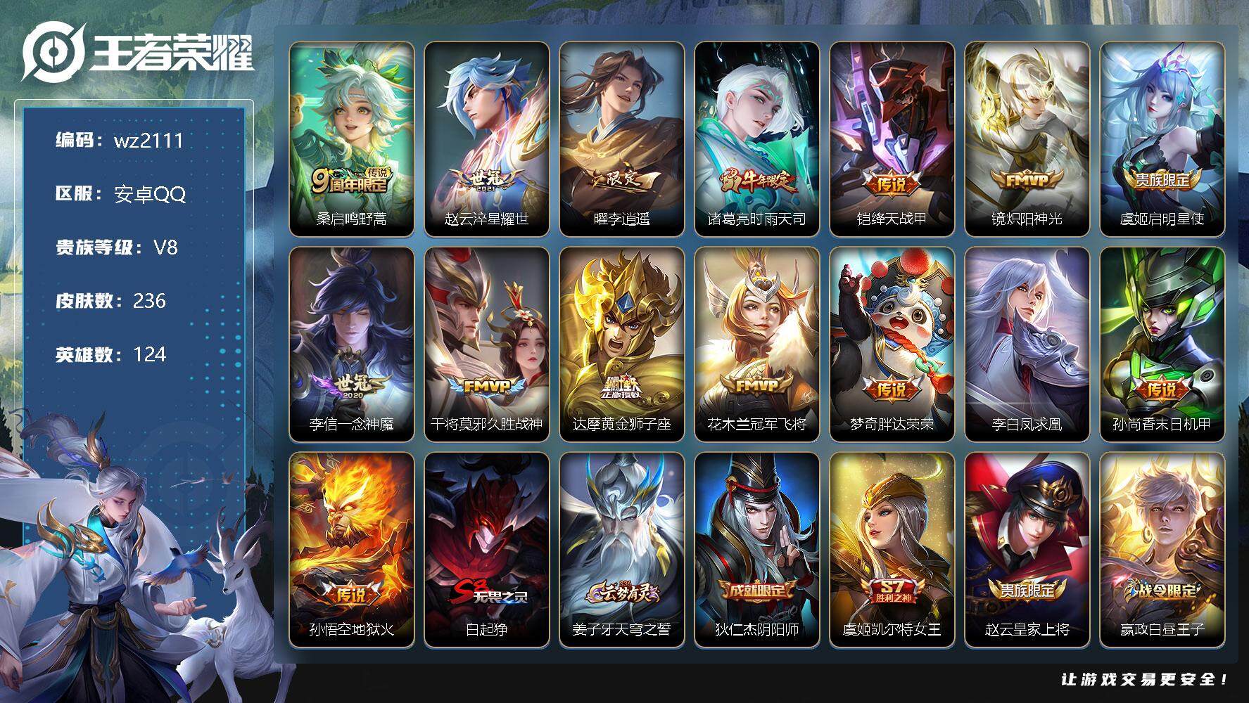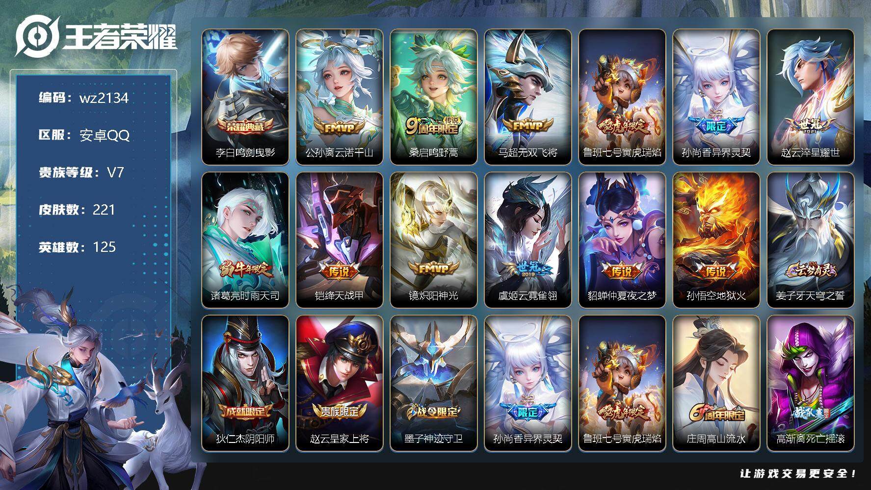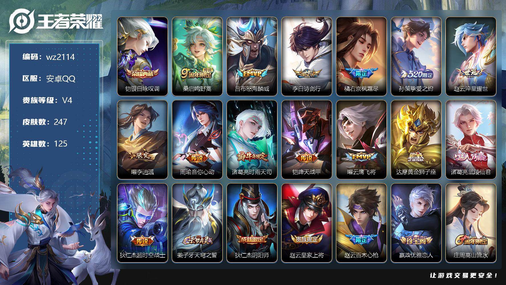 【游戏多多】 【可二次实名】【wz2114】安卓Q-V4-至尊星耀II段位-125英雄-247皮肤-1典藏-0珍品无双-0无双-0珍品传说-14传说-70史诗 【英雄全皮】:橘右京全皮,蒙恬全皮 【荣耀典藏】:铠银白咏叹调 【传说皮肤】:桑启鸣野蒿,吕布怒海麟威,李白诗剑行,橘右京枫霜尽,孙策挚爱之约,赵云淬星耀世,曜李逍遥 ,周瑜音你心动,诸葛亮时雨天司,铠绛天战甲,曜云鹰飞将,达摩黄金狮子座,诸葛亮武陵仙君,狄仁杰超时空战士 【限定皮肤】:姜子牙天穹之誓,狄仁杰阴阳师,赵云皇家上将,赵云百木心枪,嬴政优雅恋人,庄周高山流水,高渐离死亡摇滚,高渐离玩趣恶龙,钟无艳王者之锤,钟无艳超时空战士,元歌云间偶戏,夏侯惇朔风刀,夏侯惇匿光决锋者,甄姬落雪兰心,马可波罗暗影游猎,狄仁杰魔术师,狄仁杰万华元夜,达摩星际陆战队,达摩沙漠行僧,项羽海滩派对,老夫子醍醐杖,关羽冰锋战神,程咬金演武夺筹,王昭君午后时光,兰陵王金庭之子,橘右京枫霜尽,亚瑟潮玩骑士王,后羿圣弓游侠,李元芳云中旅人,钟馗驱傩正仪,杨玉环遇见飞天,干将莫邪真爱魔法,雅典娜黎明之约,鬼谷子原初探秘者,鬼谷子五谷丰年,诸葛亮武陵仙君,诸葛亮时雨天司,铠青龙志,苏烈千军破阵,百里玄策原初追逐者,弈星混沌棋,梦奇顽趣,沈梦溪大漠名商,明世隐疑决卦,裴擒虎李小龙,裴擒虎擒涛扼浪,狂铁电玩高手,米莱狄胡桃异想国,云中君纤云弄巧,盾山御銮,孙策挚爱之约,猪八戒西部大镖客,猪八戒猪悟能,上官婉儿梁祝,曜李逍遥 ,鲁班大师探海日志,桑启海盐诗旅,阿古朵江河有灵,张良古海寻踪,蒙恬荣光圣徽,鬼谷子天穹祈灯,周瑜熔金海岸 【年限皮肤】:铠青龙志,诸葛亮时雨天司 【赛季限定】:夏侯惇朔风刀,狄仁杰万华元夜,达摩沙漠行僧,老夫子醍醐杖,程咬金演武夺筹,兰陵王金庭之子,张良古海寻踪,李元芳云中旅人,钟馗驱傩正仪,雅典娜黎明之约,鬼谷子原初探秘者,苏烈千军破阵,百里玄策原初追逐者,弈星混沌棋,梦奇顽趣,沈梦溪大漠名商,明世隐疑决卦,裴擒虎擒涛扼浪,盾山御銮,鲁班大师探海日志,桑启海盐诗旅,鬼谷子天穹祈灯,蒙恬荣光圣徽,姜子牙天穹之誓 【战令限定】:钟无艳超时空战士,元歌云间偶戏,甄姬落雪兰心,马可波罗暗影游猎,达摩星际陆战队,王昭君午后时光,亚瑟潮玩骑士王,后羿圣弓游侠,干将莫邪真爱魔法,狂铁电玩高手,米莱狄胡桃异想国,猪八戒西部大镖客 【史诗皮肤】:项羽苍穹之光,钟无艳王者之锤,赵云皇家上将,赵云未来纪元,甄姬冰雪圆舞曲,王昭君偶像歌手,狄仁杰魔术师,廉颇地狱岩魂,宫本武藏鬼剑武藏,孙尚香水果甜心,嬴政优雅恋人,嬴政暗夜贵公子,嬴政摇滚巨星,妲己魅力维加斯,妲己女仆咖啡,墨子金属风暴,吕布圣诞狂欢,刘禅绅士熊喵,曹操幽灵船长,李白千年之狐,吕布末日机甲,关羽冰锋战神,花木兰水晶猎龙者,刘邦德古拉伯爵,夏侯惇乘风破浪,小乔缤纷独角兽,兰陵王暗隐猎兽者,诸葛亮黄金分割率,亚瑟心灵战警,雅典娜冰冠公主,安琪拉心灵骇客,百里守约特工魅影,铠曙光守护者,蔡文姬舞动绿茵,李元芳逐浪之夏,程咬金功夫厨神,白起星夜王子,阿轲节奏热浪,杨玉环遇见飞天,铠青龙志,伽罗箭羽风息,狄仁杰鹰眼统帅,上官婉儿梁祝,橘右京修罗,马可波罗暗影游猎,百里玄策原初追逐者,裴擒虎李小龙,云中君纤云弄巧,元歌云间偶戏,米莱狄胡桃异想国,杨戬天秀启明,干将莫邪真爱魔法,猪八戒猪悟能,庄周高山流水,司马懿暗渊魔法,雅典娜黎明之约,赵云百木心枪,夏侯惇匿光决锋者,狂铁电玩高手,钟无艳超时空战士,鬼谷子五谷丰年,梦奇顽趣,阿古朵江河有灵,周瑜雪夜绮愿,蒙恬荣光圣徽,刘禅鸭鸭历险记,狂铁龙之律动,黄忠百相守梦,西施织梦人,公孙离涂山容容 【其他皮肤】:项羽海滩派对,韩信教廷特使,韩信街头霸王,达摩大发明家,赵云白执事,赵云忍炎影,芈月红桃皇后,白起白色死神,牛魔西部大镖客,武则天东方不败,扁鹊化身博士,宫本武藏未来纪元,安琪拉玩偶对对碰,孙膑天使之翼,姜子牙时尚教父,妲己少女阿狸,典韦黄金武士,亚瑟死亡骑士,达摩拳王,花木兰兔女郎,甄姬花好人间,刘备万事如意,宫本武藏万象初新,后羿阿尔法小队,狄仁杰阴阳师,刘备纽约教父,高渐离死亡摇滚,刘备汉昭烈帝,关羽龙腾万里,钟无艳海滩丽影,宫本武藏霸王丸,王昭君幻想奇妙夜,狂铁命运角斗场,老夫子功夫老勺,牛魔制霸全明星,孙尚香沉稳之力,诸葛亮掌控之力,李白敏锐之力,鬼谷子幻乐之宴,苏烈坚韧之力,大乔守护之力,明世隐虹云星官,吕布野性能量,盾山御銮,孙膑归虚梦演,高渐离玩趣恶龙,沈梦溪鲨炮海盗猫,姜子牙炽热元素使,夏侯惇朔风刀,弈星混沌棋,哪吒次元突破,明世隐疑决卦,盾山圆桌骑士,老夫子醍醐杖,猪八戒西部大镖客,狂铁特工战影,鬼谷子原初探秘者,狄仁杰万华元夜,亚瑟潮玩骑士王,刘禅秘密基地,杨戬次元傲视,达摩星际陆战队,程咬金演武夺筹