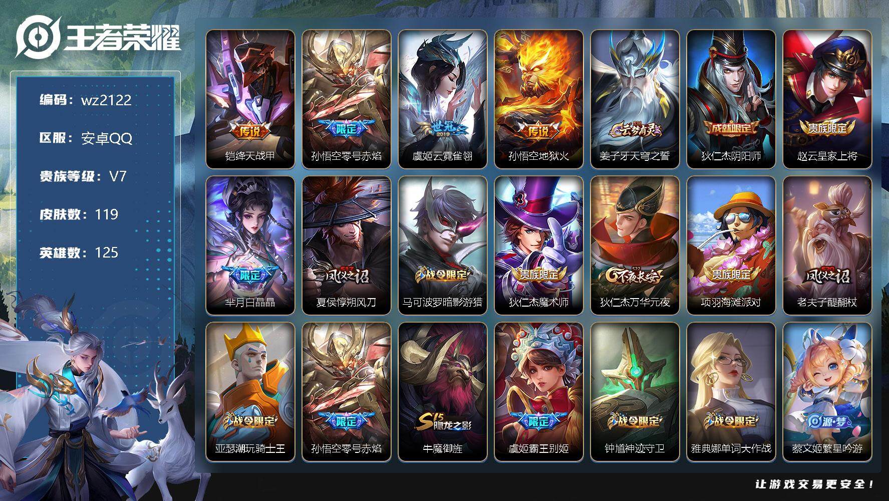 【游戏多多】 【可二次实名】【wz2122】安卓Q-V7-至尊星耀III段位-125英雄-119皮肤-0典藏-0珍品无双-0无双-0珍品传说-4传说-31史诗 【传说皮肤】:铠绛天战甲,孙悟空零号赤焰,虞姬云霓雀翎,孙悟空地狱火 【限定皮肤】:姜子牙天穹之誓,狄仁杰阴阳师,赵云皇家上将,芈月白晶晶,夏侯惇朔风刀,马可波罗暗影游猎,狄仁杰魔术师,狄仁杰万华元夜,项羽海滩派对,老夫子醍醐杖,亚瑟潮玩骑士王,孙悟空零号赤焰,牛魔御旌,虞姬霸王别姬,钟馗神迹守卫,雅典娜单词大作战,蔡文姬繁星吟游,鬼谷子原初探秘者,弈星混沌棋,明世隐疑决卦,裴擒虎李小龙,云中君纤云弄巧,盾山御銮,猪八戒西部大镖客,蒙犽狂想玩偶喵,鬼谷子天穹祈灯,刘邦剑破天穹,周瑜熔金海岸 【赛季限定】:夏侯惇朔风刀,狄仁杰万华元夜,老夫子醍醐杖,牛魔御旌,鬼谷子原初探秘者,弈星混沌棋,明世隐疑决卦,盾山御銮,鬼谷子天穹祈灯,刘邦剑破天穹,姜子牙天穹之誓 【战令限定】:马可波罗暗影游猎,亚瑟潮玩骑士王,钟馗神迹守卫,雅典娜单词大作战,猪八戒西部大镖客,蒙犽狂想玩偶喵 【史诗皮肤】:赵云皇家上将,赵云未来纪元,王昭君偶像歌手,狄仁杰魔术师,宫本武藏鬼剑武藏,孙尚香水果甜心,妲己魅力维加斯,妲己女仆咖啡,刘禅绅士熊喵,曹操幽灵船长,虞姬霸王别姬,小乔缤纷独角兽,雅典娜冰冠公主,安琪拉心灵骇客,李元芳逐浪之夏,阿轲节奏热浪,伽罗箭羽风息,狄仁杰鹰眼统帅,公孙离无限星赏官,蔡文姬繁星吟游,橘右京修罗,孙尚香时之恋人,马可波罗暗影游猎,蒙犽狂想玩偶喵,裴擒虎李小龙,云中君纤云弄巧,芈月白晶晶,狂铁龙之律动,周瑜百相守梦,黄忠百相守梦,公孙离涂山容容 【其他皮肤】:项羽海滩派对,韩信教廷特使,韩信街头霸王,阿轲爱心护理,赵云忍炎影,宫本武藏未来纪元,妲己少女阿狸,亚瑟死亡骑士,花木兰兔女郎,甄姬花好人间,狄仁杰阴阳师,关羽龙腾万里,钟无艳海滩丽影,王昭君幻想奇妙夜,狂铁命运角斗场,老夫子功夫老勺,诸葛亮掌控之力,鬼谷子幻乐之宴,苏烈坚韧之力,大乔守护之力,项羽科学大爆炸,牛魔御旌,吕布野性能量,钟馗神迹守卫,盾山御銮,夏侯惇朔风刀,弈星混沌棋,鲁班七号黑桃队长,明世隐疑决卦,老夫子醍醐杖,猪八戒西部大镖客,廉颇无尽征程,鬼谷子原初探秘者,雅典娜单词大作战,狄仁杰万华元夜,亚瑟潮玩骑士王,刘禅秘密基地,杨戬次元傲视,鲁班大师乓乓大师,典韦铁甲之心,海月幻泉雾影,猪八戒潮玩探月行,鬼谷子天穹祈灯,海诺时空谍影,刘邦剑破天穹,姜子牙天穹之誓,周瑜熔金海岸,太乙真人谧流熔炉,姜子牙星梦巡礼,戈娅玫蓝誓约,刘备浪漫序章,甄姬逆浪荇歌,云中君云械蓝图,孙策百相守梦,莱西奥踏浪烽翎,鬼谷子克喵,哪吒罗小黑战记,亚瑟荣光之誓,鲁班七号福禄兄弟,鲁班七号木偶奇遇记,貂蝉异域舞娘,曹操死神来了,曹操超能战警,张良一千零一夜,小乔万圣前夜,孙悟空西部大镖客,后羿精灵王,兰陵王隐刃,李元芳特种部队,虞姬加勒比小姐,蔡文姬蔷薇王座,太乙真人圆桌骑士,哪吒三太子,公孙离花间舞,裴擒虎街头旋风,元歌午夜歌剧院,伽罗花见巫女,李信灼热之刃,盘古创世神祝,瑶森,云中君荷鲁斯之眼,马超幸存者,鲁班大师归虚梦演,司空震启蛰 【营地ID】:2113403962