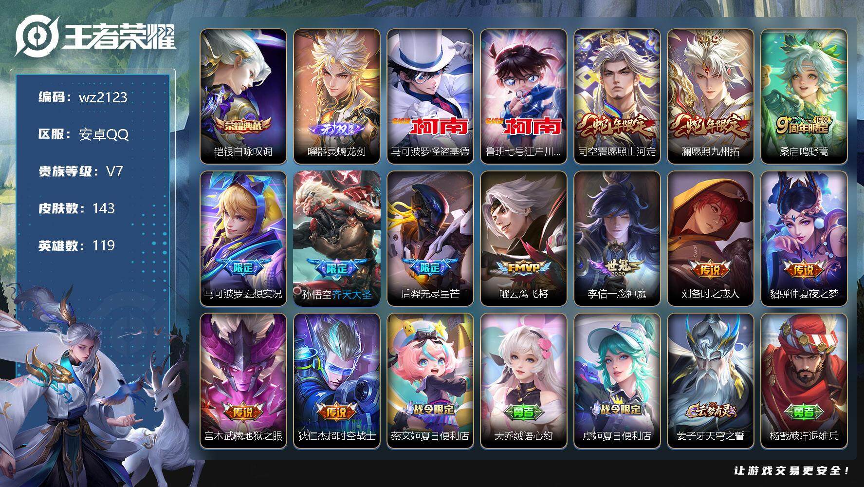 【游戏多多】 【可二次实名】【wz2123】安卓Q-V7-至尊星耀V段位-119英雄-143皮肤-1典藏-0珍品无双-1无双-2珍品传说-12传说-36史诗 【英雄全皮】:空空儿全皮 【荣耀典藏】:铠银白咏叹调 【无双皮肤】:曜器灵螭龙剑 【珍品传说】:马可波罗怪盗基德,鲁班七号江户川柯南 【传说皮肤】:司空震愿照山河定,澜愿照九州拓,桑启鸣野蒿,马可波罗妄想实况,孙悟空齐天大圣,后羿无尽星芒,曜云鹰飞将,李信一念神魔,刘备时之恋人,貂蝉仲夏夜之梦,宫本武藏地狱之眼,狄仁杰超时空战士 【限定皮肤】:蔡文姬夏日便利店,大乔绒语心约,虞姬夏日便利店,姜子牙天穹之誓,杨戬破阵退雄兵,狄仁杰阴阳师,赵云皇家上将,孙尚香蔷薇恋人,马可波罗山海玄木吟,马可波罗妄想实况,狄仁杰魔术师,项羽海滩派对,孙悟空齐天大圣,后羿无尽星芒,李元芳云中旅人,裴擒虎李小龙,裴擒虎擒涛扼浪,瑶山海碧波行,云中君纤云弄巧,鲁班大师探海日志,桑启海盐诗旅,阿古朵江河有灵,张良古海寻踪,鬼谷子天穹祈灯,伽罗琥珀纪元,沈梦溪龙舞盛年,刘邦剑破天穹,程咬金群星魔术团,刘备异域游侠,周瑜熔金海岸 【年限皮肤】:瑶山海碧波行,马可波罗山海玄木吟 【赛季限定】:张良古海寻踪,李元芳云中旅人,裴擒虎擒涛扼浪,鲁班大师探海日志,桑启海盐诗旅,鬼谷子天穹祈灯,刘邦剑破天穹,姜子牙天穹之誓 【战令限定】:蔡文姬夏日便利店,虞姬夏日便利店 【史诗皮肤】:赵云皇家上将,貂蝉圣诞恋歌,甄姬冰雪圆舞曲,狄仁杰魔术师,宫本武藏鬼剑武藏,孙尚香蔷薇恋人,孙尚香水果甜心,妲己魅力维加斯,墨子金属风暴,吕布圣诞狂欢,李白千年之狐,吕布末日机甲,花木兰水晶猎龙者,小乔缤纷独角兽,兰陵王暗隐猎兽者,雅典娜冰冠公主,安琪拉心灵骇客,百里守约特工魅影,蔡文姬舞动绿茵,阿轲节奏热浪,大乔猫狗日记,狄仁杰鹰眼统帅,瑶遇见神鹿,裴擒虎李小龙,云中君纤云弄巧,西施诗语江南,马可波罗山海玄木吟,瑶山海碧波行,阿古朵江河有灵,伽罗琥珀纪元,蔡文姬夏日便利店,大司命东方月初,赵怀真器灵浮梦炉,狂铁龙之律动,黄忠百相守梦,西施织梦人 【其他皮肤】:项羽海滩派对,韩信教廷特使,韩信街头霸王,芈月红桃皇后,白起白色死神,扁鹊化身博士,宫本武藏未来纪元,典韦黄金武士,亚瑟死亡骑士,花木兰兔女郎,狄仁杰阴阳师,刘备纽约教父,刘备汉昭烈帝,关羽龙腾万里,老夫子功夫老勺,孙尚香沉稳之力,诸葛亮掌控之力,李白敏锐之力,鬼谷子幻乐之宴,明世隐虹云星官,小乔丁香结,沈梦溪鲨炮海盗猫,哪吒次元突破,狂铁特工战影,鲁班大师乓乓大师,李元芳云中旅人,刘备潮玩造梦师,桑启海盐诗旅,裴擒虎擒涛扼浪,太乙真人劲辣红锅,鲁班大师探海日志,李元芳妄想特派,张良古海寻踪,鬼谷子天穹祈灯,海诺时空谍影,嫦娥漠中幻影,沈梦溪龙舞盛年,钟无艳春野之旅,刘邦剑破天穹,程咬金群星魔术团,刘备异域游侠,杨戬破阵退雄兵,貂蝉长夏之忆,姜子牙天穹之誓,周瑜熔金海岸,虞姬夏日便利店,大乔绒语心约,东皇太一噬灭天穹,米莱狄怪诞之夜,干将莫邪雾都夜雨,吕布逐霄战戟,苍苍林狼骑,太乙真人谧流熔炉,典韦铁骨偃魂,西施雪境奇遇,姜子牙星梦巡礼,东皇太一金福满堂,少司缘灵卦秘语,明世隐景韶洛都,戈娅玫蓝誓约,钟馗虚灵犬护,张良灵野札记,阿古朵布丁狗之约,白起死霸装,甄姬逆浪荇歌,庄周锦麟游梦,空空儿戏梦巡演,莱西奥踏浪烽翎,鬼谷子克喵,项羽帝国元帅,曹操超能战警,孙悟空西部大镖客,刘邦圣殿之光,马可波罗激情绿茵,苍维京掠夺者,哪吒三太子,诸葛亮星航指挥官,黄忠芝加哥教父,铠龙域领主,公孙离花间舞,元歌午夜歌剧院,孙策海之征途,李信灼热之刃,瑶森,云中君荷鲁斯之眼,曜归虚梦演,西施归虚梦演,澜孤猎,司空震启蛰,金蝉前尘,暃碧珀绯影 【内测皮肤】:孙尚香蔷薇恋人,狂铁特工战影 【营地ID】:1701130349