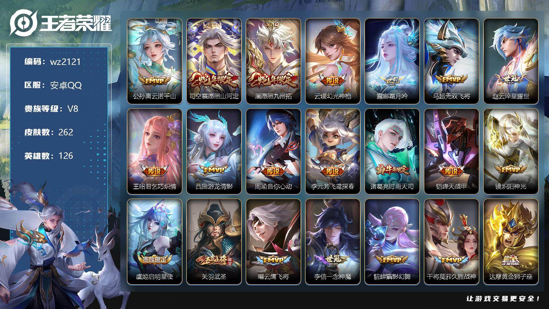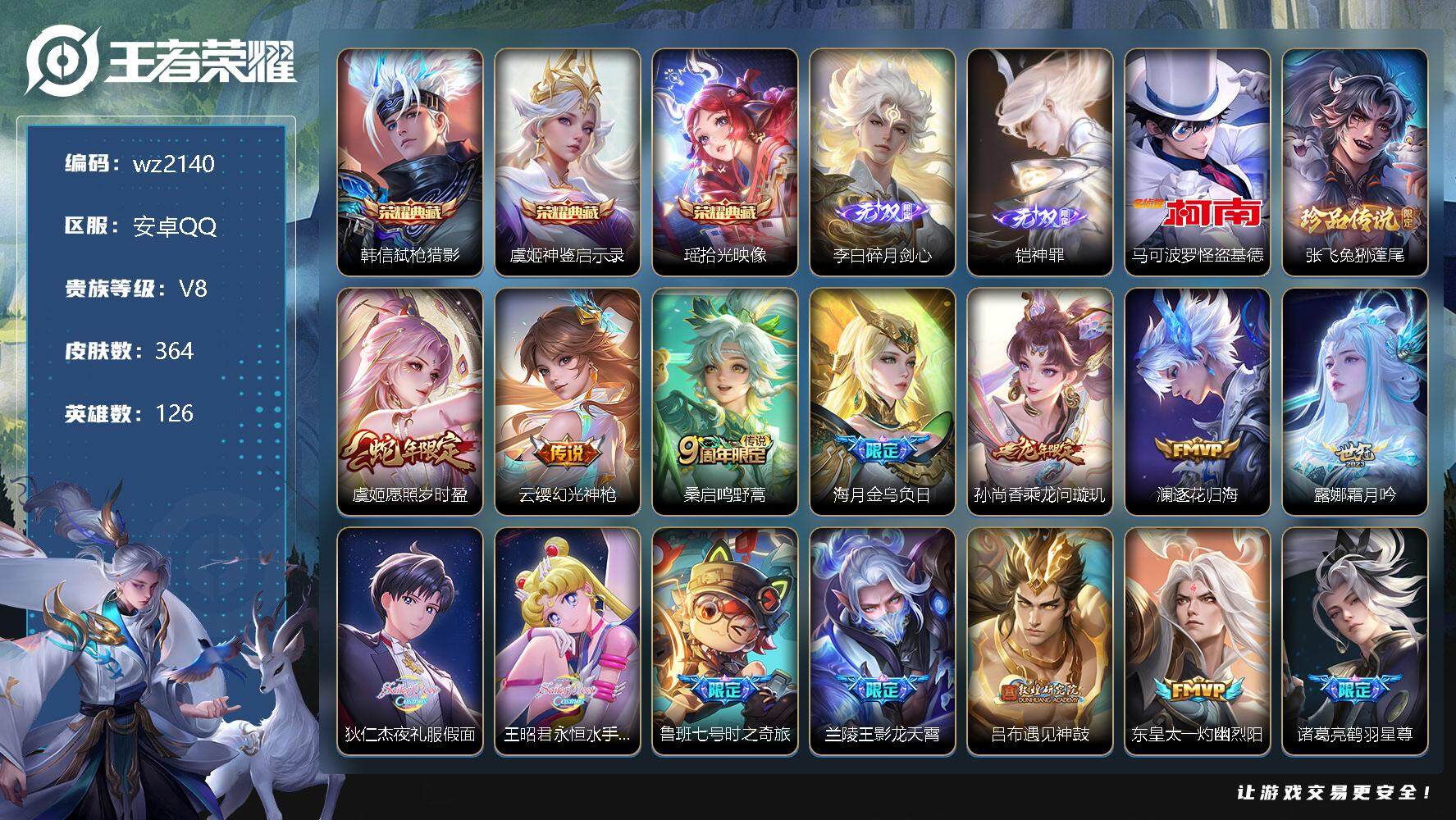 【游戏多多】 【可二次实名】【wz2140】安卓Q-V8-至尊星耀III段位-126英雄-364皮肤-3典藏-0珍品无双-2无双-2珍品传说-27传说-103史诗 【英雄全皮】:刘禅全皮,狄仁杰全皮,钟馗全皮,鬼谷子全皮,蒙恬全皮,戈娅全皮,空空儿全皮,影全皮 【荣耀典藏】:韩信弑枪猎影,虞姬神鉴启示录,瑶拾光映像 【无双皮肤】:李白碎月剑心,铠神罪 【珍品传说】:马可波罗怪盗基德,张飞兔狲蓬尾 【传说皮肤】:虞姬愿照岁时盈,云缨幻光神枪,桑启鸣野蒿,海月金乌负日,孙尚香乘龙问璇玑,澜逐花归海,露娜霜月吟,狄仁杰夜礼服假面,王昭君永恒水手月亮,鲁班七号时之奇旅,兰陵王影龙天霄,吕布遇见神鼓,东皇太一灼幽烈阳,诸葛亮鹤羽星尊,亚瑟追逃游戏,安琪拉追逃游戏,张飞百相守梦,虞姬无限倾心,狄仁杰神器狴犴令,马可波罗深海之息,赵云淬星耀世,虞姬启明星使,干将莫邪久胜战神,虞姬云霓雀翎,后羿黄金射手座,孙尚香末日机甲,狄仁杰超时空战士 【限定皮肤】:蔡文姬夏日便利店,大乔绒语心约,虞姬夏日便利店,姜子牙天穹之誓,狄仁杰阴阳师,赵云皇家上将,墨子神迹守卫,孙尚香蔷薇恋人,鲁班七号乒乒小将,鲁班七号时之奇旅,庄周高山流水,钟无艳超时空战士,扁鹊奇幻香踪,白起夜都怪侠,芈月幻夜卜梦,吕布遇见神鼓,元歌无心,甄姬落雪兰心,马可波罗深海之息,马可波罗山海玄木吟,狄仁杰魔术师,狄仁杰万华元夜,狄仁杰神器狴犴令,达摩星际陆战队,达摩沙漠行僧,项羽海滩派对,老夫子醍醐杖,老夫子航海奇遇记,安琪拉追逃游戏,程咬金演武夺筹,王昭君午后时光,兰陵王影龙天霄,兰陵王金庭之子,亚瑟追逃游戏,孙悟空孙行者,后羿圣弓游侠,张飞百相守梦,李元芳匿光侦查者,李元芳云中旅人,虞姬启明星使,虞姬无限倾心,钟馗神迹守卫,钟馗驱傩正仪,杨玉环遇见飞天,杨戬潮玩骑兵,干将莫邪真爱魔法,鬼谷子原初探秘者,鬼谷子五谷丰年,诸葛亮鹤羽星尊,黄忠火炮绅士,铠青龙志,苏烈千军破阵,沈梦溪大漠名商,明世隐吟游魔法,裴擒虎李小龙,裴擒虎擒涛扼浪,狂铁电玩高手,米莱狄胡桃异想国,云中君纤云弄巧,猪八戒西部大镖客,上官婉儿梁祝,嫦娥拒霜思,嫦娥暖冬兔眠,西施玲珑珍味,鲁班大师探海日志,桑启海盐诗旅,暃星界游侠,戈娅驭风魔法,艾琳女武神,艾琳流音漫舞,司空震地狱燃心,阿古朵江河有灵,张良古海寻踪,王昭君永恒水手月亮,狄仁杰夜礼服假面,蒙犽百解令,蒙恬荣光圣徽,高渐离燃音魔法,妲己灵卜魔法,鬼谷子天穹祈灯,李白碎月剑心,伽罗琥珀纪元,姬小满妄想食味,孙尚香乘龙问璇玑,沈梦溪龙舞盛年,鲁班七号蔬乡物语,李元芳蔬乡物语,海月金乌负日,刘邦剑破天穹,程咬金群星魔术团,镜青焰无极,项羽苍威无极,刘备异域游侠,周瑜熔金海岸 【年限皮肤】:铠青龙志,马可波罗山海玄木吟,孙尚香乘龙问璇玑 【赛季限定】:狄仁杰万华元夜,达摩沙漠行僧,老夫子醍醐杖,程咬金演武夺筹,兰陵王金庭之子,张良古海寻踪,李元芳云中旅人,钟馗驱傩正仪,鬼谷子原初探秘者,苏烈千军破阵,沈梦溪大漠名商,裴擒虎擒涛扼浪,鲁班大师探海日志,桑启海盐诗旅,鬼谷子天穹祈灯,蒙恬荣光圣徽,刘邦剑破天穹,姜子牙天穹之誓 【战令限定】:墨子神迹守卫,蔡文姬夏日便利店,虞姬夏日便利店,钟无艳超时空战士,扁鹊奇幻香踪,白起夜都怪侠,芈月幻夜卜梦,甄姬落雪兰心,达摩星际陆战队,老夫子航海奇遇记,王昭君午后时光,艾琳流音漫舞,后羿圣弓游侠,钟馗神迹守卫,杨戬潮玩骑兵,干将莫邪真爱魔法,黄忠火炮绅士,明世隐吟游魔法,狂铁电玩高手,米莱狄胡桃异想国,猪八戒西部大镖客,嫦娥暖冬兔眠,西施玲珑珍味,司空震地狱燃心,暃星界游侠,戈娅驭风魔法,高渐离燃音魔法,妲己灵卜魔法,鲁班七号蔬乡物语,李元芳蔬乡物语,镜青焰无极,项羽苍威无极 【史诗皮肤】:鲁班七号电玩小子,项羽苍穹之光,露娜紫霞仙子,阿轲暗夜猫娘,赵云皇家上将,赵云未来纪元,貂蝉圣诞恋歌,甄姬冰雪圆舞曲,王昭君偶像歌手,狄仁杰魔术师,廉颇地狱岩魂,宫本武藏鬼剑武藏,孙尚香蔷薇恋人,孙尚香水果甜心,嬴政摇滚巨星,妲己魅力维加斯,妲己女仆咖啡,墨子龙骑士,墨子金属风暴,吕布圣诞狂欢,刘禅绅士熊喵,曹操幽灵船长,李白千年之狐,吕布末日机甲,张飞乱世虎臣,花木兰水晶猎龙者,刘邦德古拉伯爵,夏侯惇乘风破浪,小乔缤纷独角兽,兰陵王暗隐猎兽者,亚瑟心灵战警,雅典娜冰冠公主,安琪拉心灵骇客,百里守约特工魅影,铠曙光守护者,蔡文姬舞动绿茵,刘禅天才门将,李元芳逐浪之夏,程咬金功夫厨神,白起星夜王子,阿轲节奏热浪,杨玉环遇见飞天,孙策猫狗日记,大乔猫狗日记,铠青龙志,伽罗箭羽风息,狄仁杰鹰眼统帅,公孙离无限星赏官,上官婉儿梁祝,不知火舞魅语,橘右京修罗,瑶遇见神鹿,裴擒虎李小龙,云中君纤云弄巧,米莱狄胡桃异想国,老夫子航海奇遇记,鲁班七号乒乒小将,杨戬天秀启明,干将莫邪真