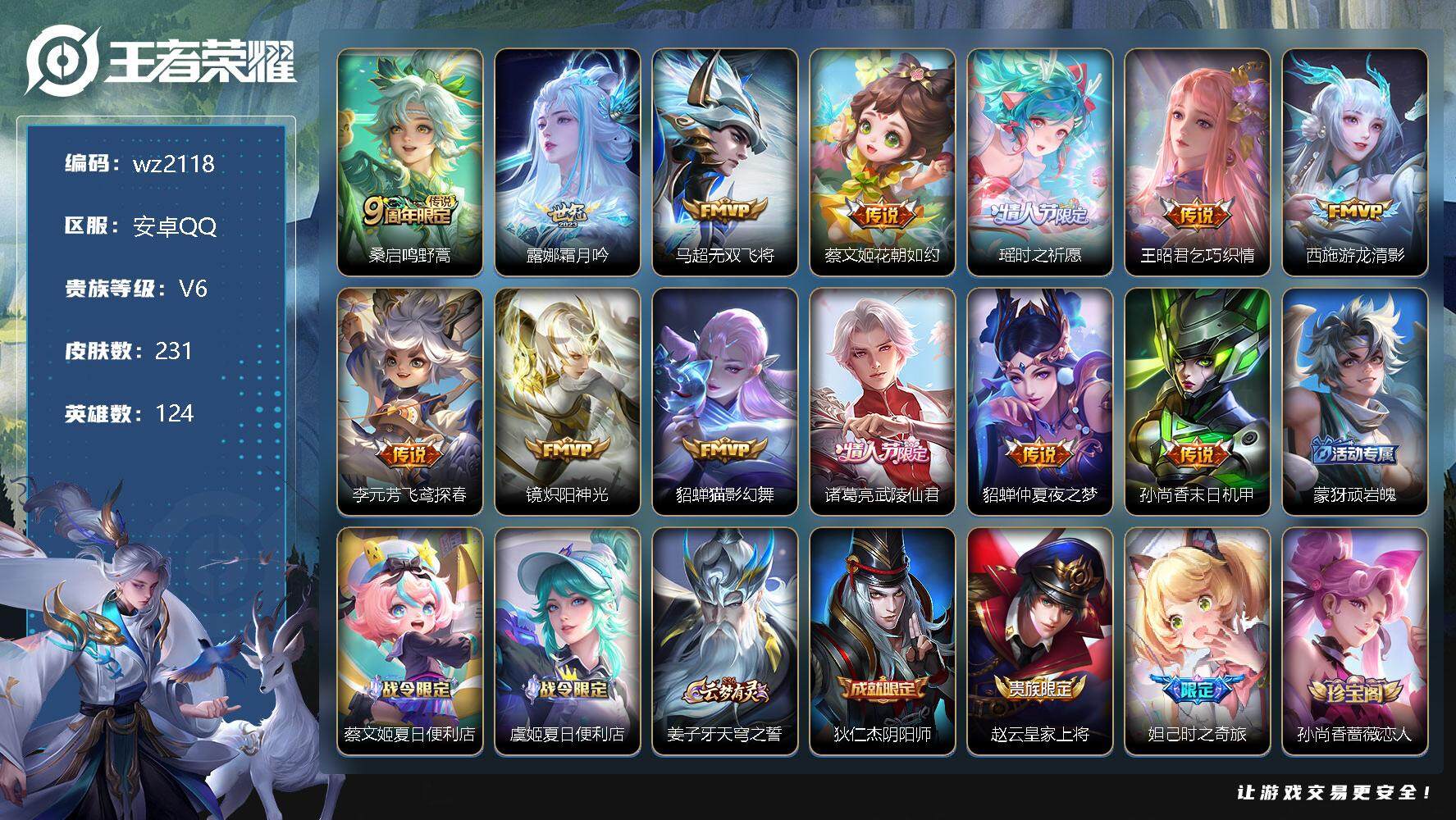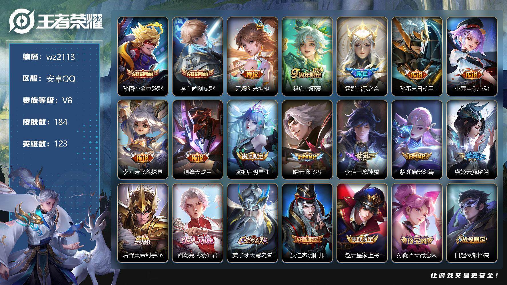 【游戏多多】 【可二次实名】【wz2118】安卓Q-V6-至尊星耀II段位-124英雄-231皮肤-0典藏-0珍品无双-0无双-0珍品传说-13传说-66史诗 【英雄全皮】:鬼谷子全皮,影全皮 【传说皮肤】:桑启鸣野蒿,露娜霜月吟,马超无双飞将,蔡文姬花朝如约,瑶时之祈愿,王昭君乞巧织情,西施游龙清影,李元芳飞鸢探春,镜炽阳神光,貂蝉猫影幻舞,诸葛亮武陵仙君,貂蝉仲夏夜之梦,孙尚香末日机甲 【限定皮肤】:蒙犽顽岩魄,蔡文姬夏日便利店,虞姬夏日便利店,姜子牙天穹之誓,狄仁杰阴阳师,赵云皇家上将,妲己时之奇旅,孙尚香蔷薇恋人,庄周高山流水,阿轲迷踪丽影,元歌无心,狄仁杰魔术师,狄仁杰万华元夜,达摩沙漠行僧,项羽海滩派对,老夫子醍醐杖,程咬金演武夺筹,兰陵王金庭之子,李元芳云中旅人,钟馗驱傩正仪,杨玉环寅虎心曲,雅典娜黎明之约,鬼谷子原初探秘者,鬼谷子五谷丰年,诸葛亮武陵仙君,苏烈千军破阵,百里玄策原初追逐者,弈星混沌棋,梦奇顽趣,公孙离蜜橘之夏,公孙离玉兔公主,沈梦溪大漠名商,明世隐疑决卦,裴擒虎李小龙,裴擒虎擒涛扼浪,瑶时之祈愿,云中君纤云弄巧,上官婉儿梁祝,上官婉儿神器万象笔,嫦娥拒霜思,鲁班大师探海日志,桑启海盐诗旅,艾琳女武神,张良古海寻踪,蒙恬荣光圣徽,鬼谷子天穹祈灯,沈梦溪龙舞盛年,鲁班七号蔬乡物语,刘邦剑破天穹,程咬金群星魔术团,周瑜熔金海岸 【年限皮肤】:杨玉环寅虎心曲 【赛季限定】:狄仁杰万华元夜,达摩沙漠行僧,老夫子醍醐杖,程咬金演武夺筹,兰陵王金庭之子,张良古海寻踪,李元芳云中旅人,钟馗驱傩正仪,雅典娜黎明之约,鬼谷子原初探秘者,苏烈千军破阵,百里玄策原初追逐者,弈星混沌棋,梦奇顽趣,沈梦溪大漠名商,明世隐疑决卦,裴擒虎擒涛扼浪,鲁班大师探海日志,桑启海盐诗旅,鬼谷子天穹祈灯,蒙恬荣光圣徽,刘邦剑破天穹,姜子牙天穹之誓 【战令限定】:蔡文姬夏日便利店,虞姬夏日便利店,阿轲迷踪丽影,鲁班七号蔬乡物语 【史诗皮肤】:露娜紫霞仙子,赵云皇家上将,貂蝉圣诞恋歌,甄姬冰雪圆舞曲,狄仁杰魔术师,宫本武藏鬼剑武藏,孙尚香蔷薇恋人,孙尚香水果甜心,嬴政摇滚巨星,妲己魅力维加斯,妲己女仆咖啡,墨子金属风暴,吕布圣诞狂欢,李白千年之狐,张飞乱世虎臣,花木兰水晶猎龙者,刘邦德古拉伯爵,小乔缤纷独角兽,亚瑟心灵战警,安琪拉心灵骇客,百里守约特工魅影,铠曙光守护者,公孙离蜜橘之夏,李元芳逐浪之夏,程咬金功夫厨神,阿轲节奏热浪,孙策猫狗日记,狄仁杰鹰眼统帅,上官婉儿梁祝,娜可露露晚萤,大乔白蛇,小乔青蛇,不知火舞魅语,阿轲迷踪丽影,橘右京修罗,瑶遇见神鹿,百里玄策原初追逐者,裴擒虎李小龙,云中君纤云弄巧,杨戬天秀启明,钟馗乐园奇幻夜,庄周高山流水,司马懿暗渊魔法,嫦娥拒霜思,雅典娜黎明之约,杨玉环寅虎心曲,公孙离玉兔公主,妲己时之奇旅,鬼谷子五谷丰年,上官婉儿神器万象笔,元歌无心,梦奇顽趣,蒙恬荣光圣徽,鲁班七号蔬乡物语,桑启奇遇星旅,蔡文姬夏日便利店,蒙犽顽岩魄,亚连破空之剑,百里守约百相守梦,牛魔星界战将,孙膑茶境仙,刘禅鸭鸭历险记,后羿石田雨龙,黄忠百相守梦,朵莉亚幻珠鲛人,公孙离涂山容容 【其他皮肤】:项羽海滩派对,韩信教廷特使,韩信街头霸王,露娜哥特玫瑰,赵云白执事,赵云忍炎影,艾琳女武神,白起白色死神,牛魔西部大镖客,扁鹊化身博士,宫本武藏未来纪元,安琪拉玩偶对对碰,孙膑天使之翼,姜子牙时尚教父,妲己少女阿狸,典韦黄金武士,亚瑟死亡骑士,花木兰兔女郎,张飞五福同心,甄姬花好人间,宫本武藏万象初新,狄仁杰阴阳师,关羽龙腾万里,钟无艳海滩丽影,狂铁命运角斗场,老夫子功夫老勺,孙尚香沉稳之力,诸葛亮掌控之力,李白敏锐之力,鬼谷子幻乐之宴,苏烈坚韧之力,大乔守护之力,明世隐虹云星官,小乔丁香结,吕布野性能量,孙膑归虚梦演,沈梦溪鲨炮海盗猫,姜子牙炽热元素使,弈星混沌棋,哪吒次元突破,明世隐疑决卦,盾山圆桌骑士,老夫子醍醐杖,狂铁特工战影,鬼谷子原初探秘者,狄仁杰万华元夜,刘禅秘密基地,露娜瓷语鉴心,程咬金演武夺筹,张良缤纷绘卷,钟馗驱傩正仪,鲁班大师乓乓大师,苏烈千军破阵,妲己紫罗兰之誓,马可波罗潮玩牛仔,达摩沙漠行僧,程咬金无双福将,兰陵王金庭之子,刘禅唤灵魔甲,沈梦溪大漠名商,李元芳云中旅人,桑启海盐诗旅,海月幻泉雾影,猪八戒潮玩探月行,赵怀真太极少年,裴擒虎擒涛扼浪,太乙真人劲辣红锅,莱西奥西部游侠,鲁班大师探海日志,李元芳妄想特派,哪吒热血海滩,张良古海寻踪,后羿完美运算,鬼谷子天穹祈灯,海诺时空谍影,朵莉亚金色潮汐,廉颇功夫炙烤,沈梦溪龙舞盛年,刘邦剑破天穹,程咬金群星魔术团,大司命暗都幽影,姜子牙天穹之誓,周瑜熔金海岸,虞姬夏日便利店,孙悟空神迹守卫,盘古敬我三分,东皇太一噬灭天穹,老夫子百相守梦,干将莫邪雾都夜雨,苍苍林狼骑,太乙真人谧流熔炉